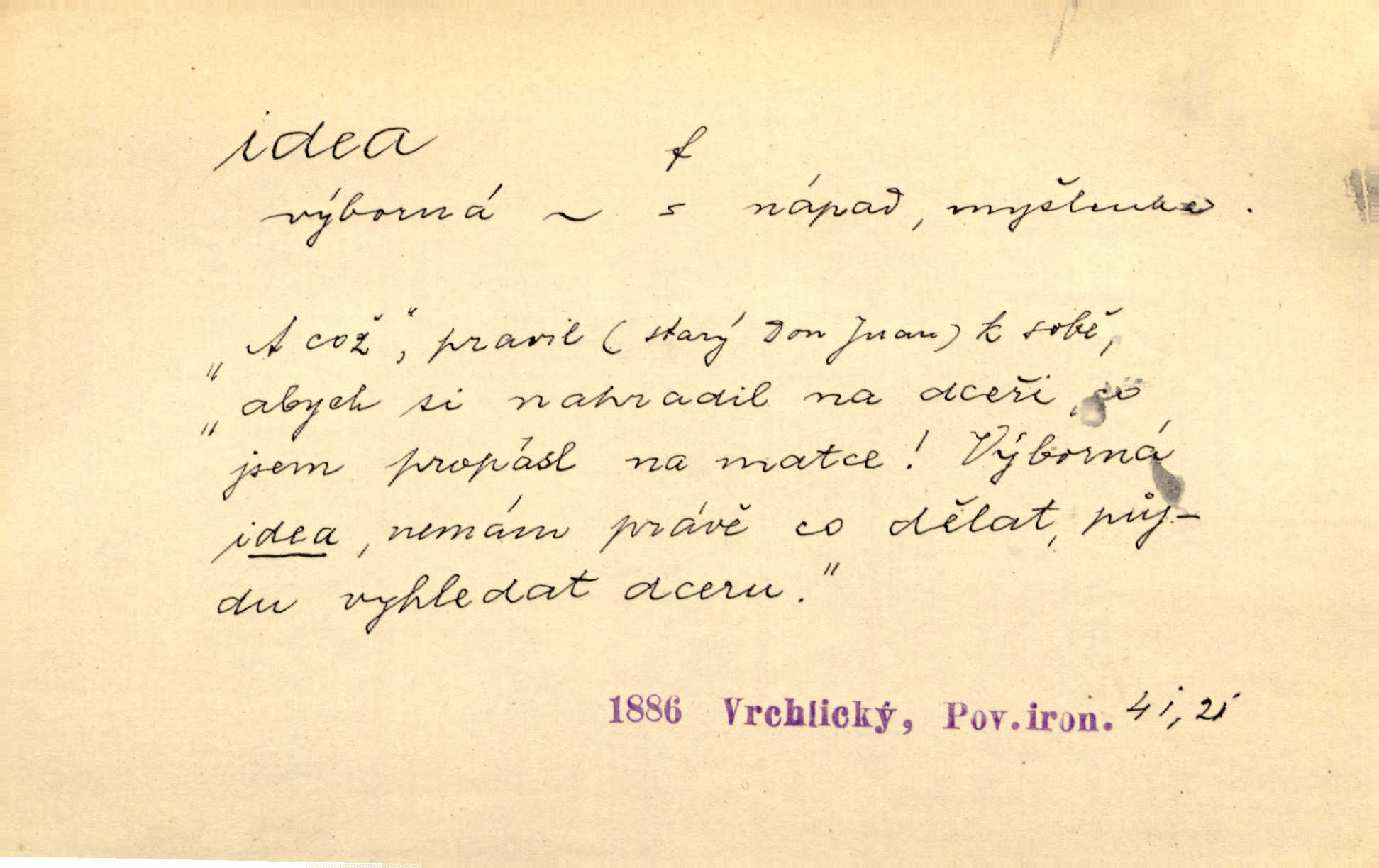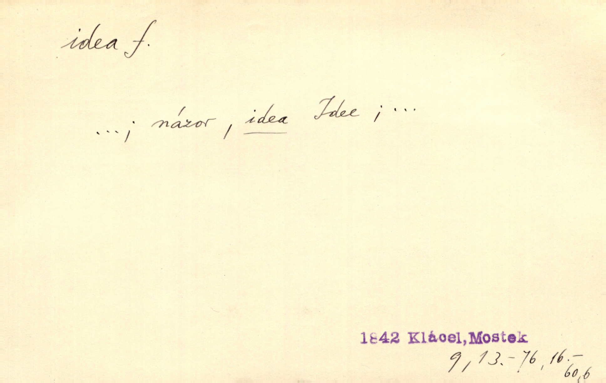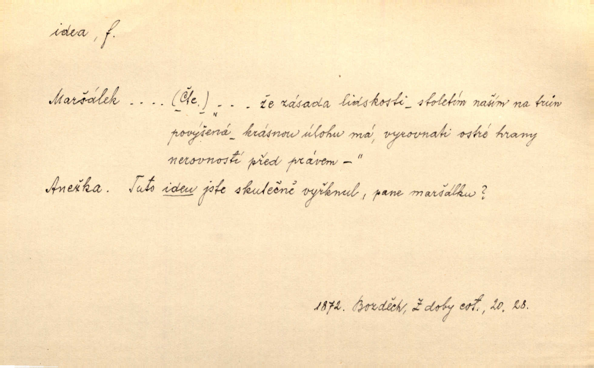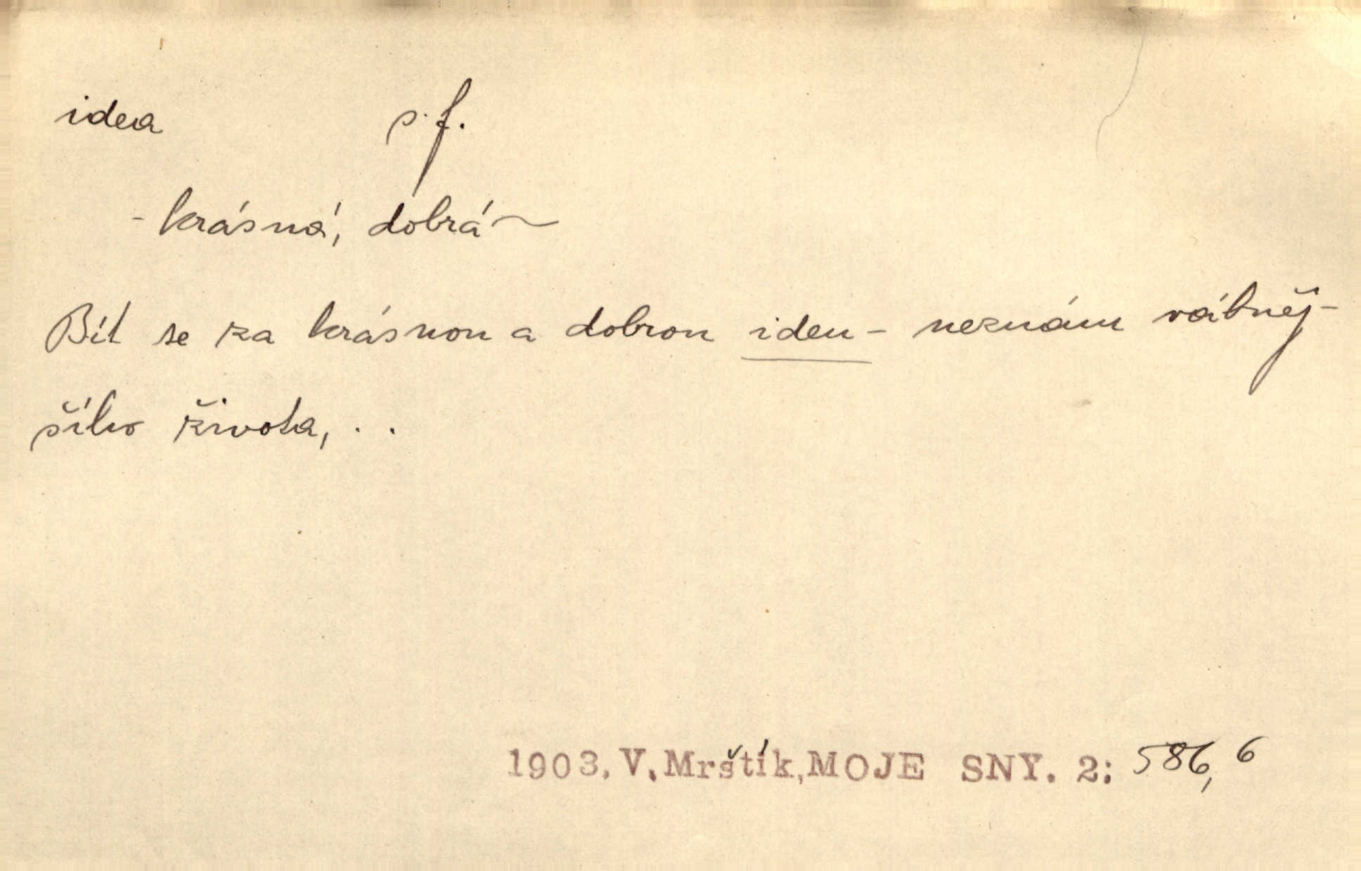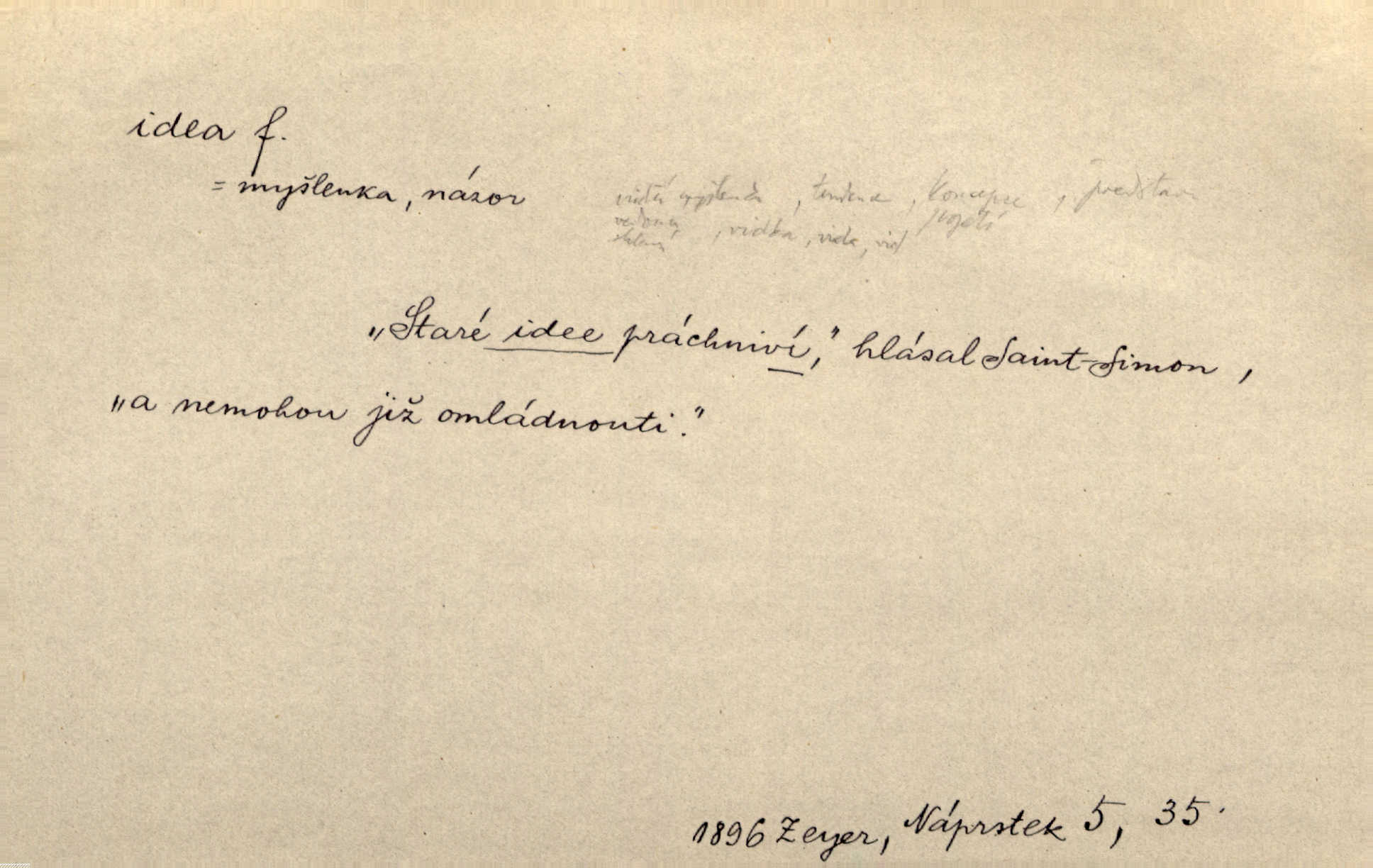 - idea, idey n. ideje f. (sg. dat. a lok. idei, ideji, ak. ideu, ideji, instr. ideou, idejí; pl. nom. ak. idey n. ideje, gen. ideí, idejí, dat. ideám, idejím atd.) základní, vůdčí myšlenka. Bít se za krásnou a dobrou ideu — neznám vábnějšího života. V. Mrš. Ideje francouzské revoluce měly u nás mnoho vyznavačův. Jir. Vondrejc býval vždycky jen theoretikem, hlasatelem ideí, ale když došlo k propagandě činu, selhal. Čap. Ch. Chiliasmus také na světlo vynesl mnohé idee politické i sociální. Goll. Juž tenkrát pučela v hlavě Jacintově idea jeho básně o Atlantidě. Vrch. D Filos. pojmová podstata poznaného předmětu v lidském duchu, nepodmíněný pojem. Idea pravdy, dobra, krásy. D myšlenka, nápad. Výborná idea, nemám právě co dělat, půjdu vyhledat dceru. Vrch. Byla to náhlá úzkost, že se nemoc vrátí, anebo že se ulomená klika stane mou fixní ideou utkvělou myšlenkou. Čap. Ch.