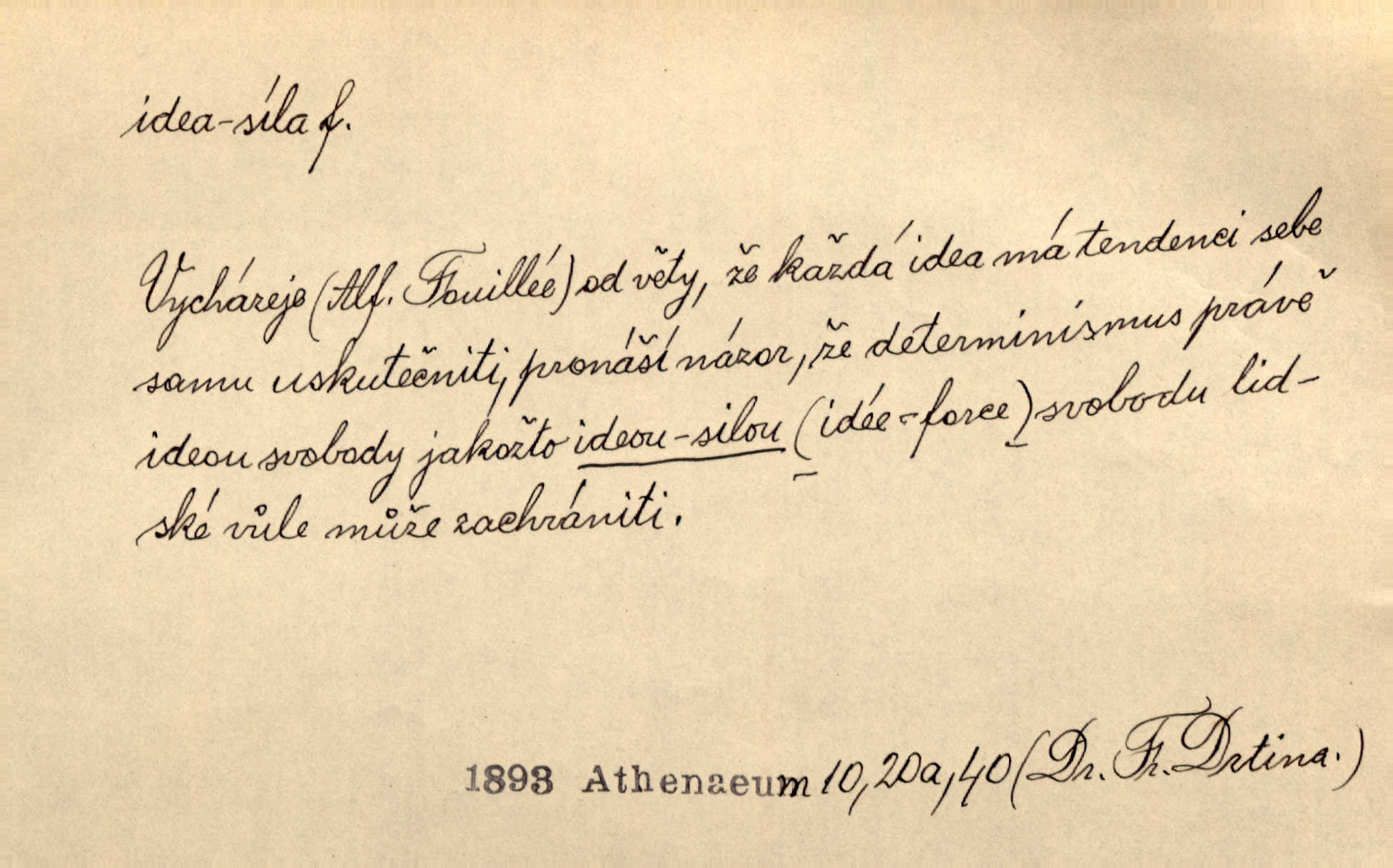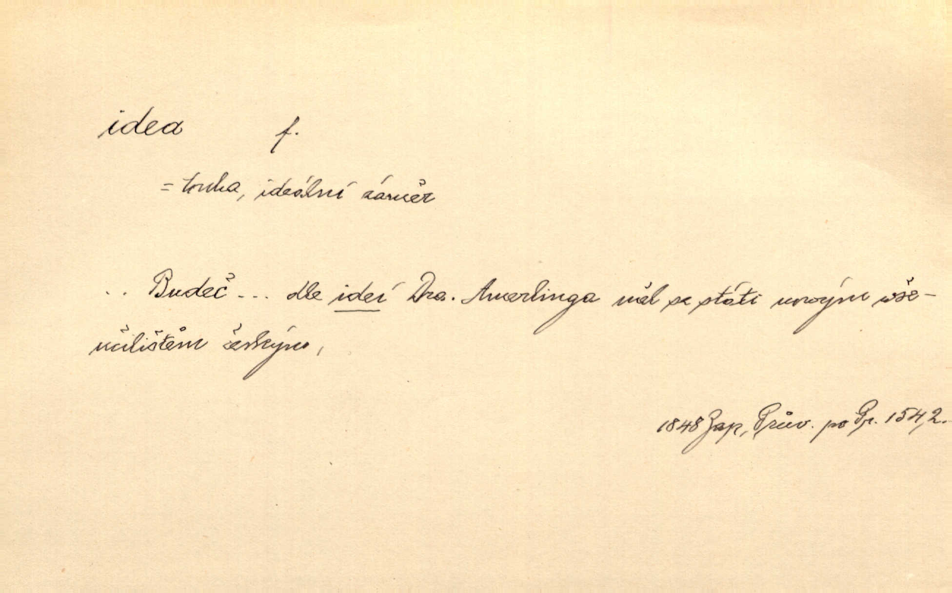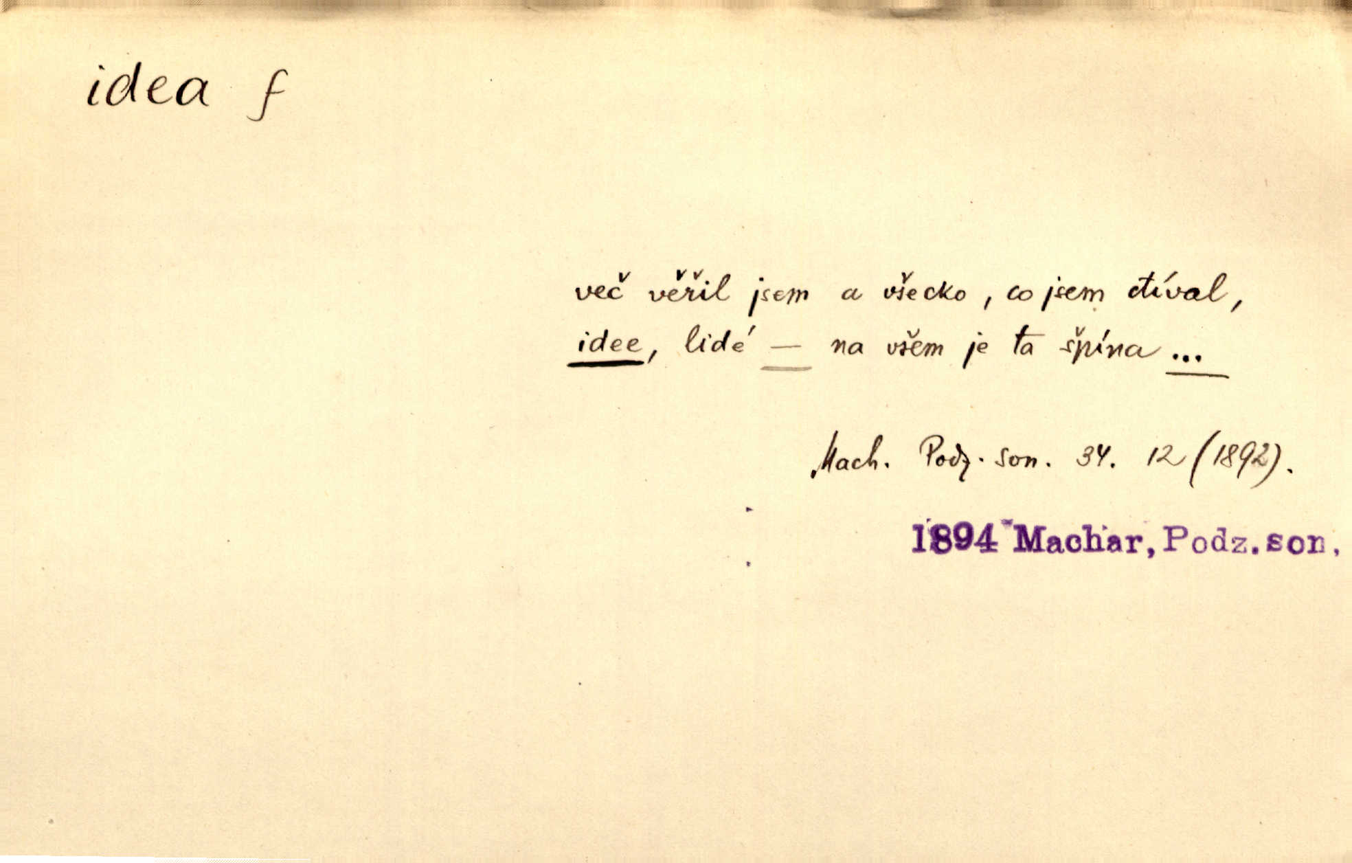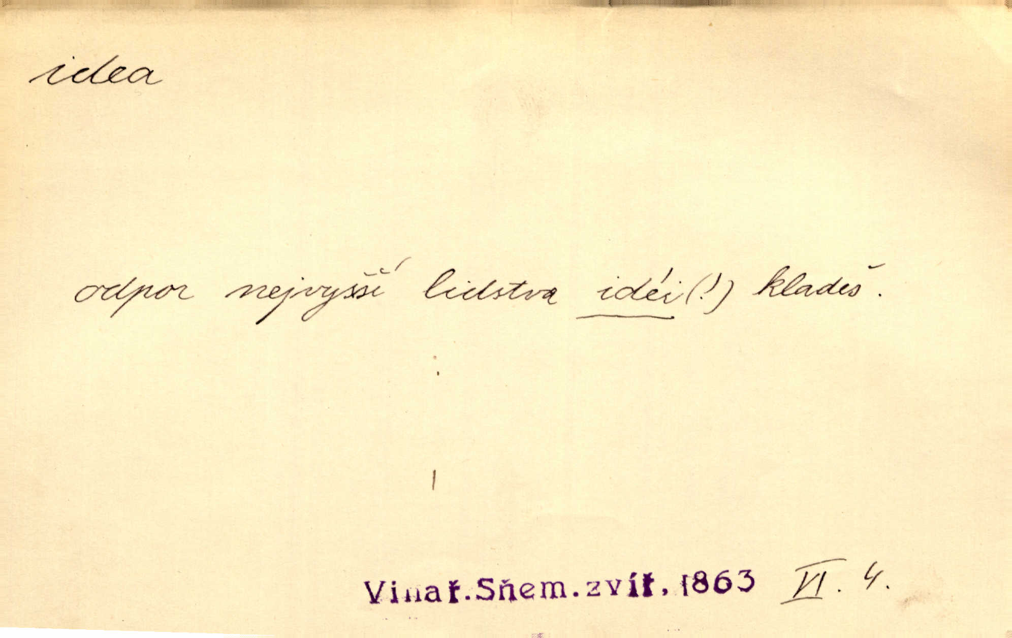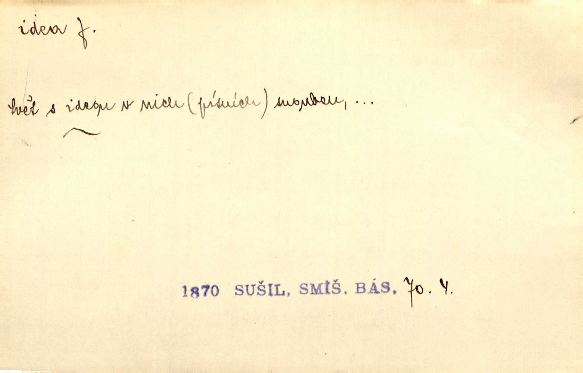- idea, idey n. ideje f. (sg. dat. a lok. idei, ideji, ak. ideu, ideji, instr. ideou, idejí; pl. nom. ak. idey n. ideje, gen. ideí, idejí, dat. ideám, idejím atd.) základní, vůdčí myšlenka. Bít se za krásnou a dobrou ideu — neznám vábnějšího života. V. Mrš. Ideje francouzské revoluce měly u nás mnoho vyznavačův. Jir. Vondrejc býval vždycky jen theoretikem, hlasatelem ideí, ale když došlo k propagandě činu, selhal. Čap. Ch. Chiliasmus také na světlo vynesl mnohé idee politické i sociální. Goll. Juž tenkrát pučela v hlavě Jacintově idea jeho básně o Atlantidě. Vrch. D Filos. pojmová podstata poznaného předmětu v lidském duchu, nepodmíněný pojem. Idea pravdy, dobra, krásy. D myšlenka, nápad. Výborná idea, nemám právě co dělat, půjdu vyhledat dceru. Vrch. Byla to náhlá úzkost, že se nemoc vrátí, anebo že se ulomená klika stane mou fixní ideou utkvělou myšlenkou. Čap. Ch.