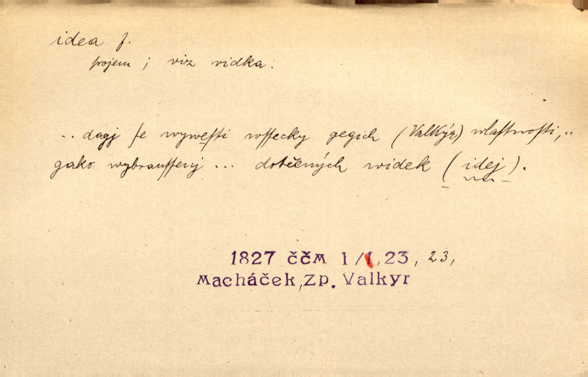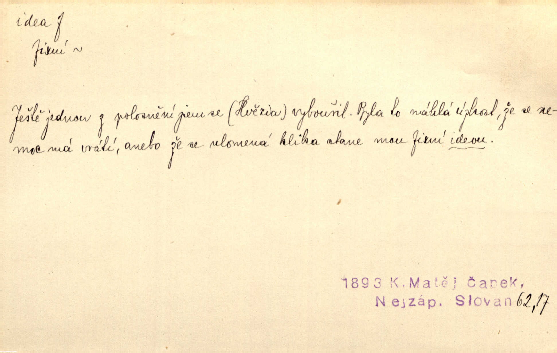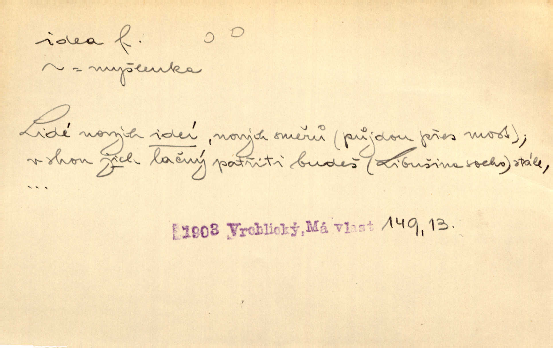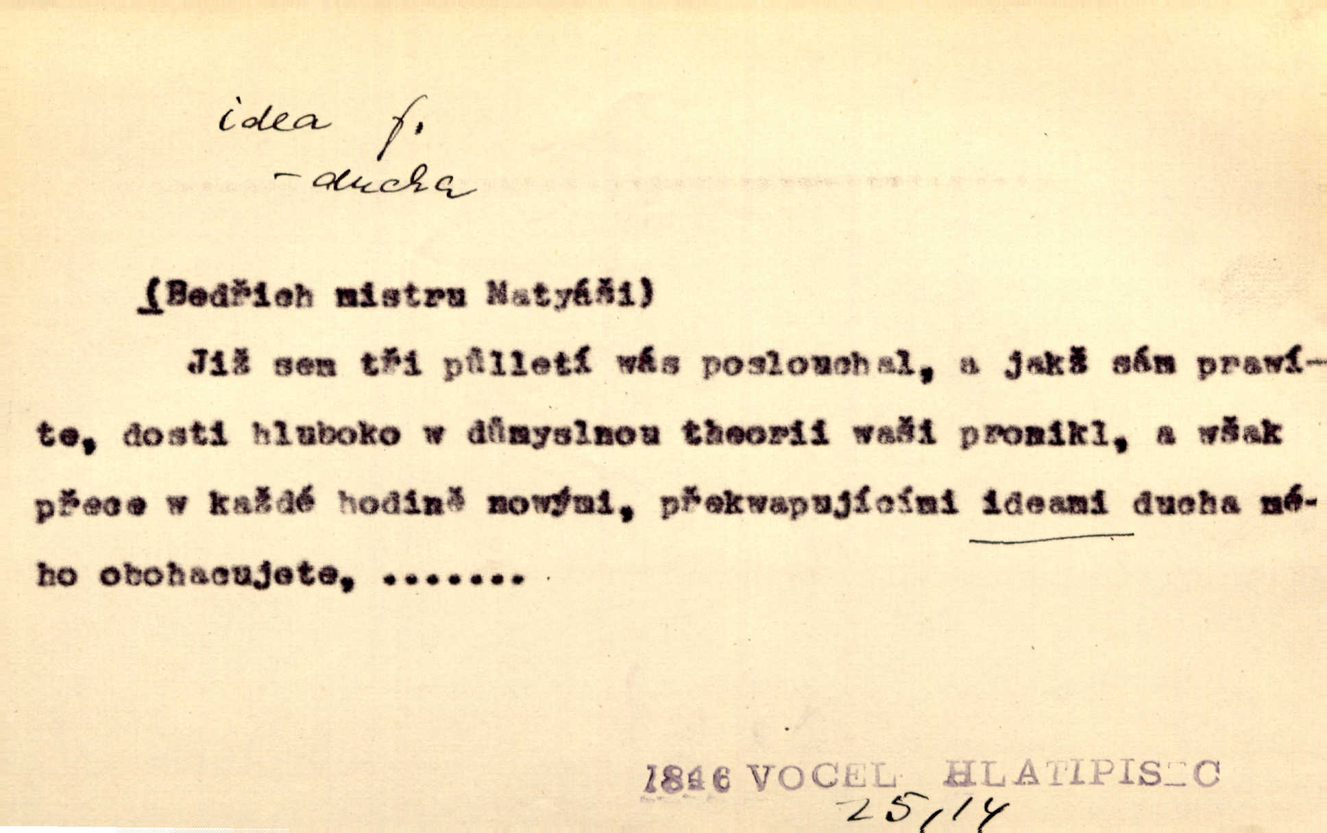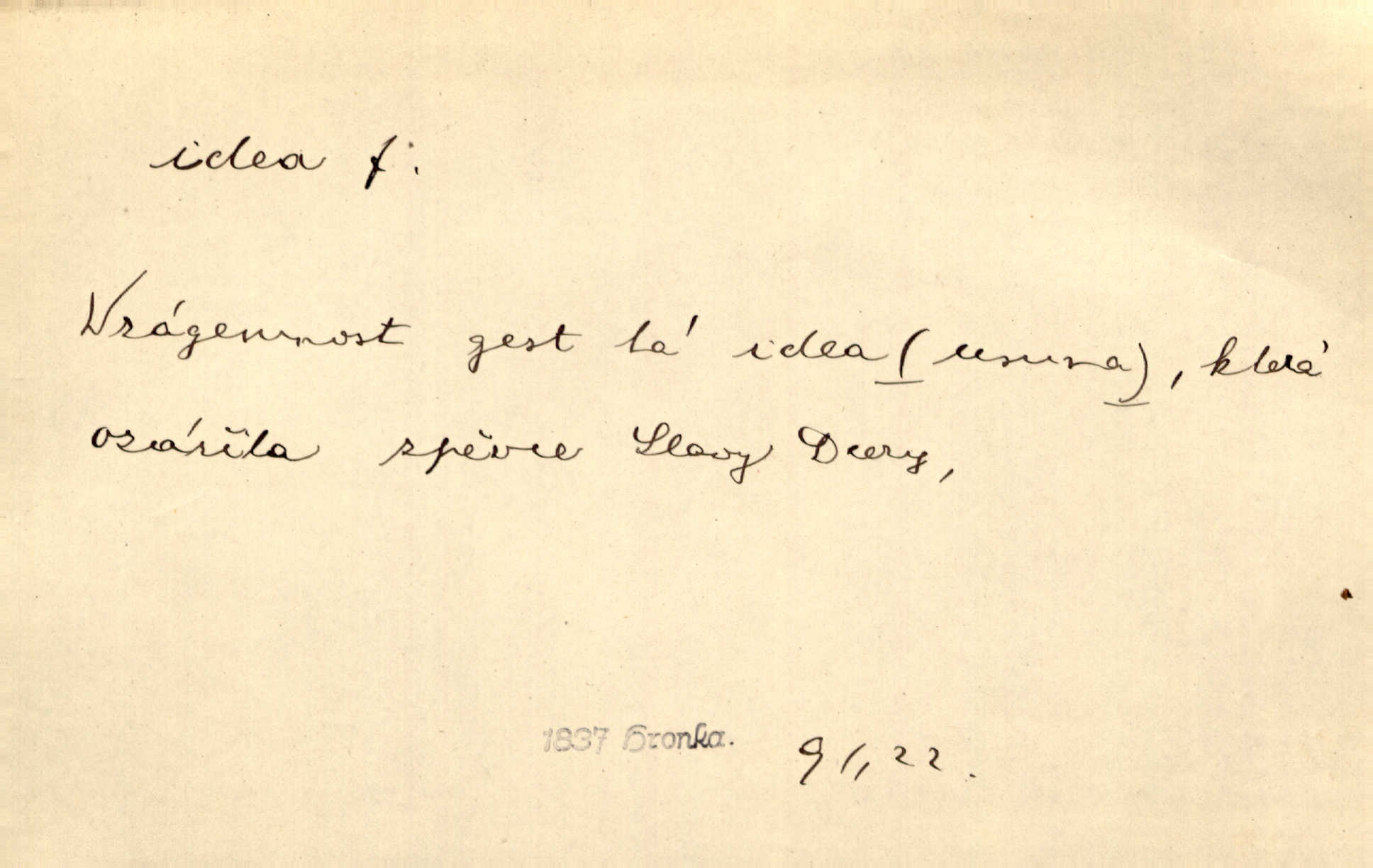 - idea, idey n. ideje f. (sg. dat. a lok. idei, ideji, ak. ideu, ideji, instr. ideou, idejí; pl. nom. ak. idey n. ideje, gen. ideí, idejí, dat. ideám, idejím atd.) základní, vůdčí myšlenka. Bít se za krásnou a dobrou ideu — neznám vábnějšího života. V. Mrš. Ideje francouzské revoluce měly u nás mnoho vyznavačův. Jir. Vondrejc býval vždycky jen theoretikem, hlasatelem ideí, ale když došlo k propagandě činu, selhal. Čap. Ch. Chiliasmus také na světlo vynesl mnohé idee politické i sociální. Goll. Juž tenkrát pučela v hlavě Jacintově idea jeho básně o Atlantidě. Vrch. D Filos. pojmová podstata poznaného předmětu v lidském duchu, nepodmíněný pojem. Idea pravdy, dobra, krásy. D myšlenka, nápad. Výborná idea, nemám právě co dělat, půjdu vyhledat dceru. Vrch. Byla to náhlá úzkost, že se nemoc vrátí, anebo že se ulomená klika stane mou fixní ideou utkvělou myšlenkou. Čap. Ch.