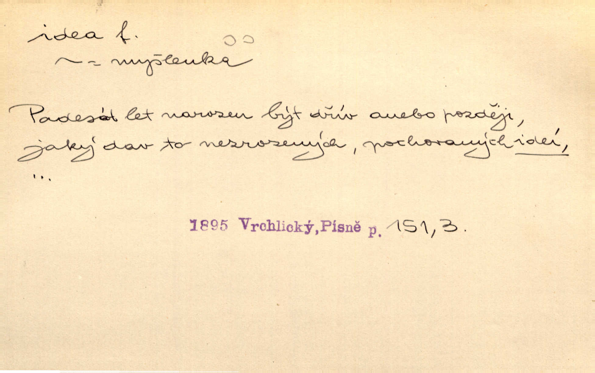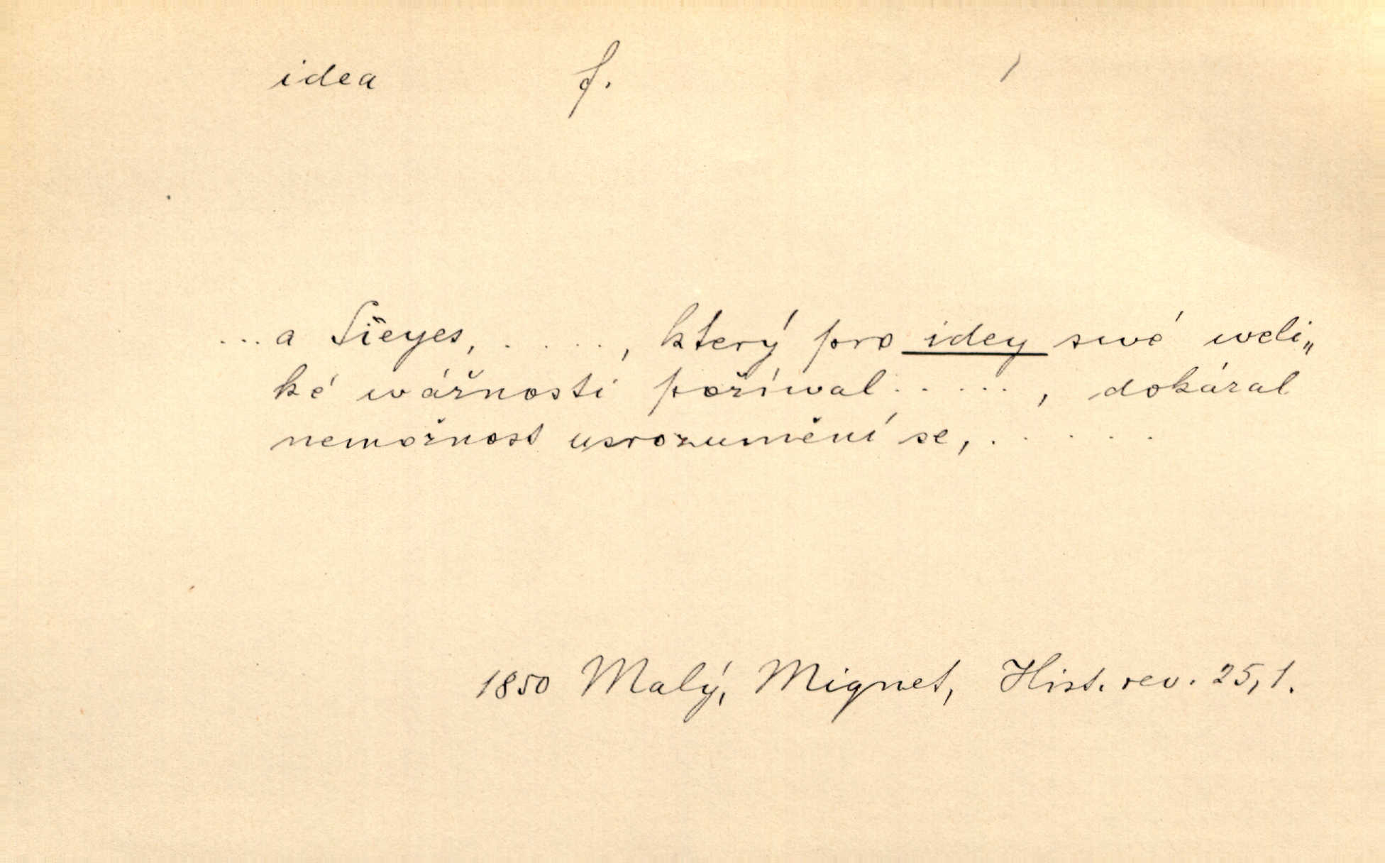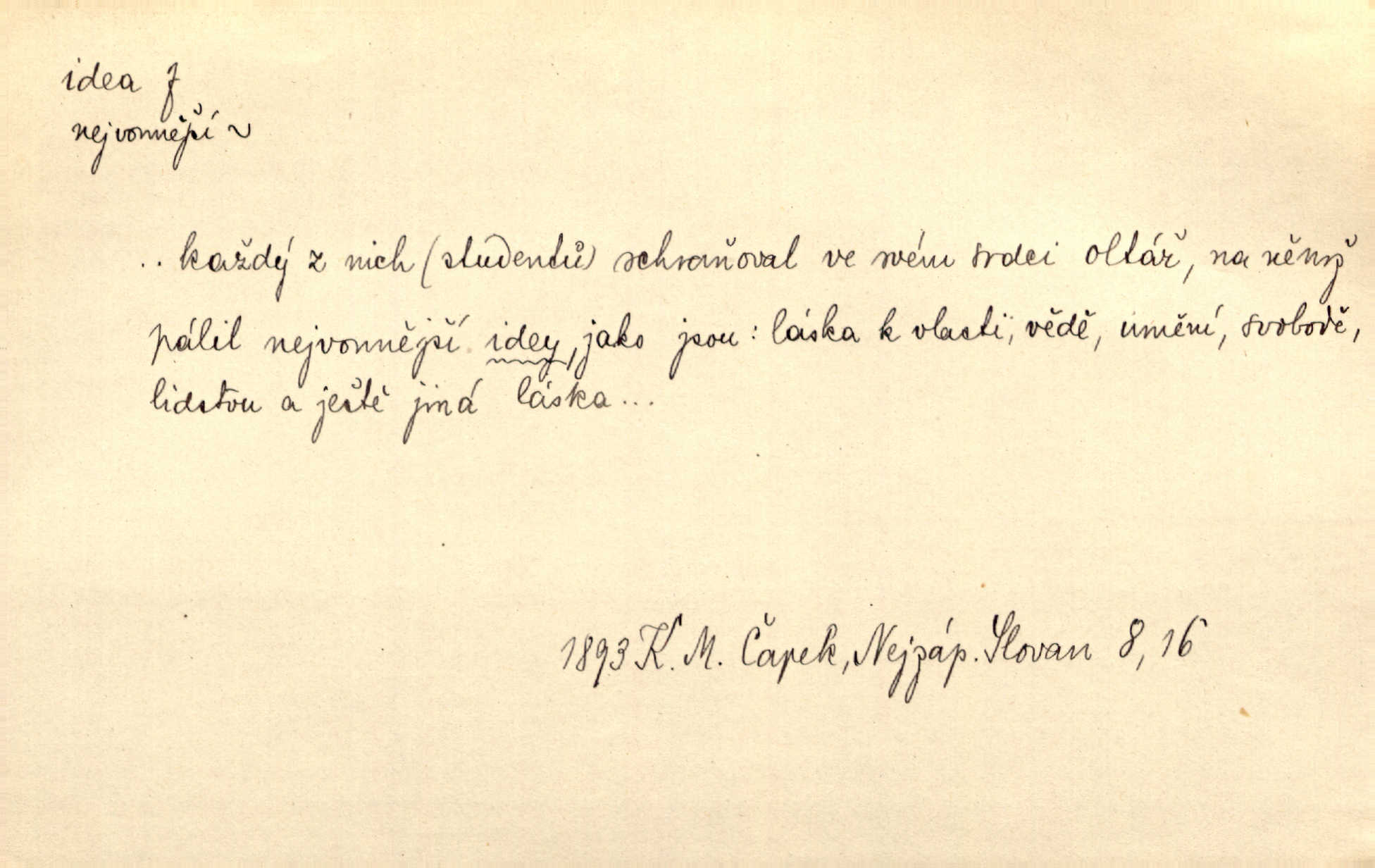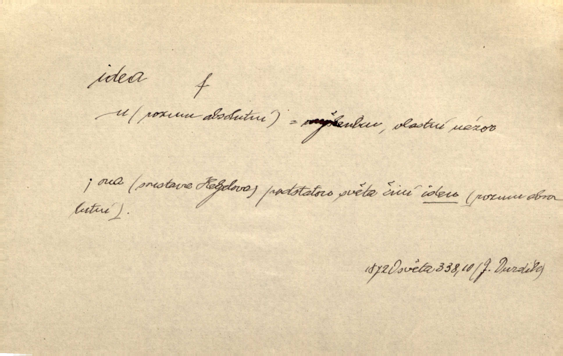 - idea, idey n. ideje f. (sg. dat. a lok. idei, ideji, ak. ideu, ideji, instr. ideou, idejí; pl. nom. ak. idey n. ideje, gen. ideí, idejí, dat. ideám, idejím atd.) základní, vůdčí myšlenka. Bít se za krásnou a dobrou ideu — neznám vábnějšího života. V. Mrš. Ideje francouzské revoluce měly u nás mnoho vyznavačův. Jir. Vondrejc býval vždycky jen theoretikem, hlasatelem ideí, ale když došlo k propagandě činu, selhal. Čap. Ch. Chiliasmus také na světlo vynesl mnohé idee politické i sociální. Goll. Juž tenkrát pučela v hlavě Jacintově idea jeho básně o Atlantidě. Vrch. D Filos. pojmová podstata poznaného předmětu v lidském duchu, nepodmíněný pojem. Idea pravdy, dobra, krásy. D myšlenka, nápad. Výborná idea, nemám právě co dělat, půjdu vyhledat dceru. Vrch. Byla to náhlá úzkost, že se nemoc vrátí, anebo že se ulomená klika stane mou fixní ideou utkvělou myšlenkou. Čap. Ch.