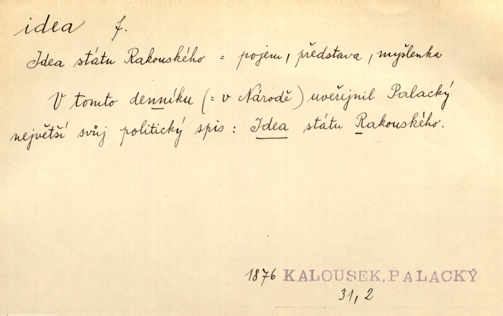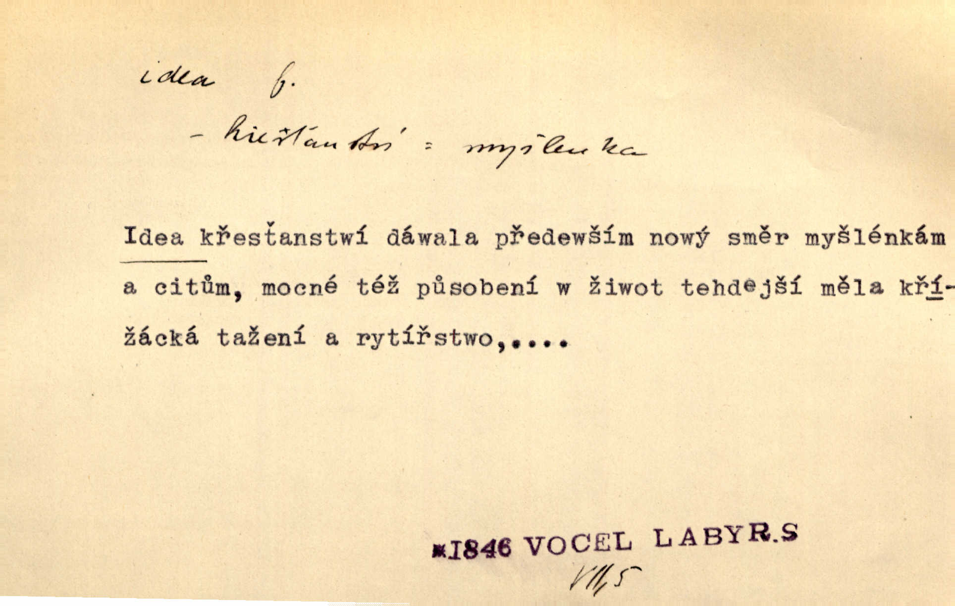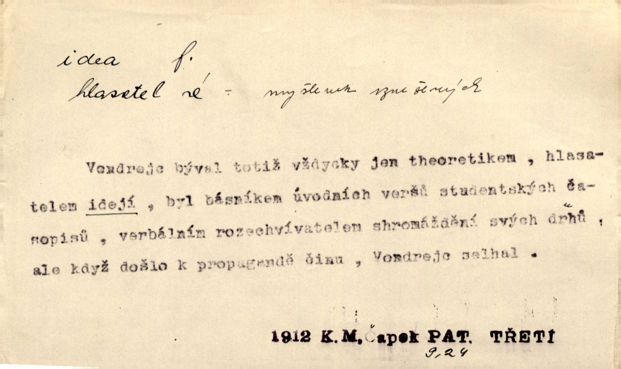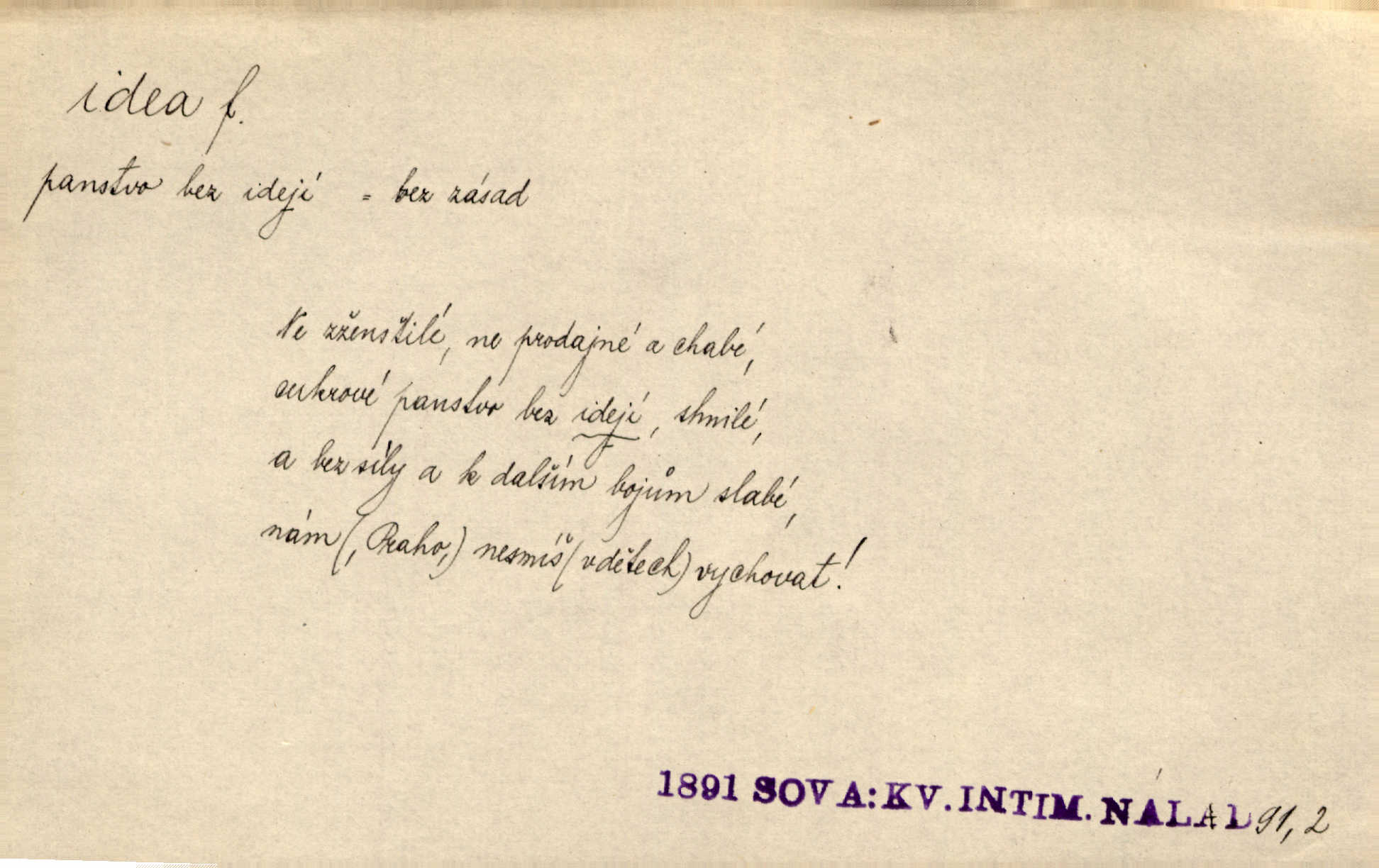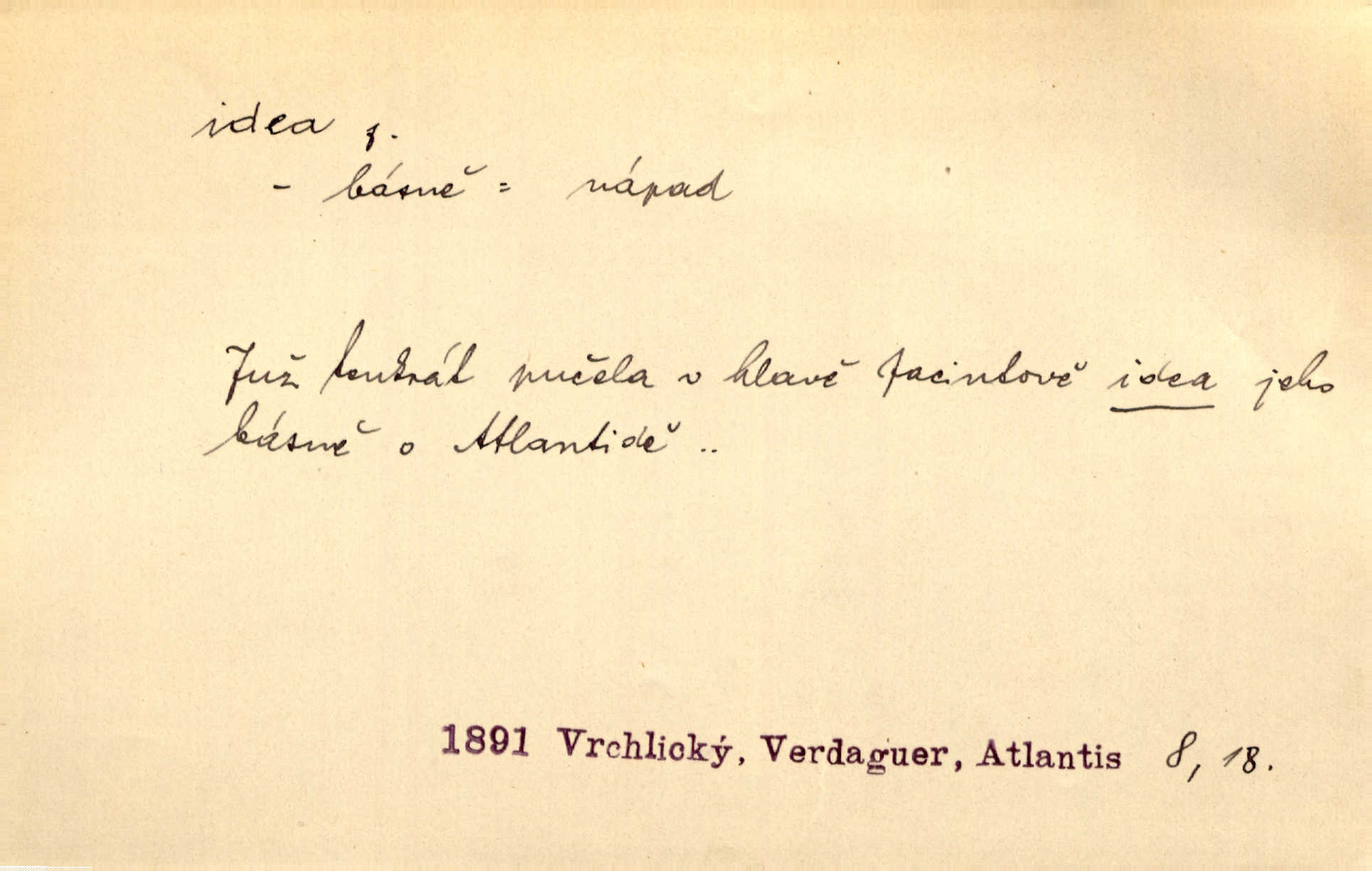 - idea, idey n. ideje f. (sg. dat. a lok. idei, ideji, ak. ideu, ideji, instr. ideou, idejí; pl. nom. ak. idey n. ideje, gen. ideí, idejí, dat. ideám, idejím atd.) základní, vůdčí myšlenka. Bít se za krásnou a dobrou ideu — neznám vábnějšího života. V. Mrš. Ideje francouzské revoluce měly u nás mnoho vyznavačův. Jir. Vondrejc býval vždycky jen theoretikem, hlasatelem ideí, ale když došlo k propagandě činu, selhal. Čap. Ch. Chiliasmus také na světlo vynesl mnohé idee politické i sociální. Goll. Juž tenkrát pučela v hlavě Jacintově idea jeho básně o Atlantidě. Vrch. D Filos. pojmová podstata poznaného předmětu v lidském duchu, nepodmíněný pojem. Idea pravdy, dobra, krásy. D myšlenka, nápad. Výborná idea, nemám právě co dělat, půjdu vyhledat dceru. Vrch. Byla to náhlá úzkost, že se nemoc vrátí, anebo že se ulomená klika stane mou fixní ideou utkvělou myšlenkou. Čap. Ch.