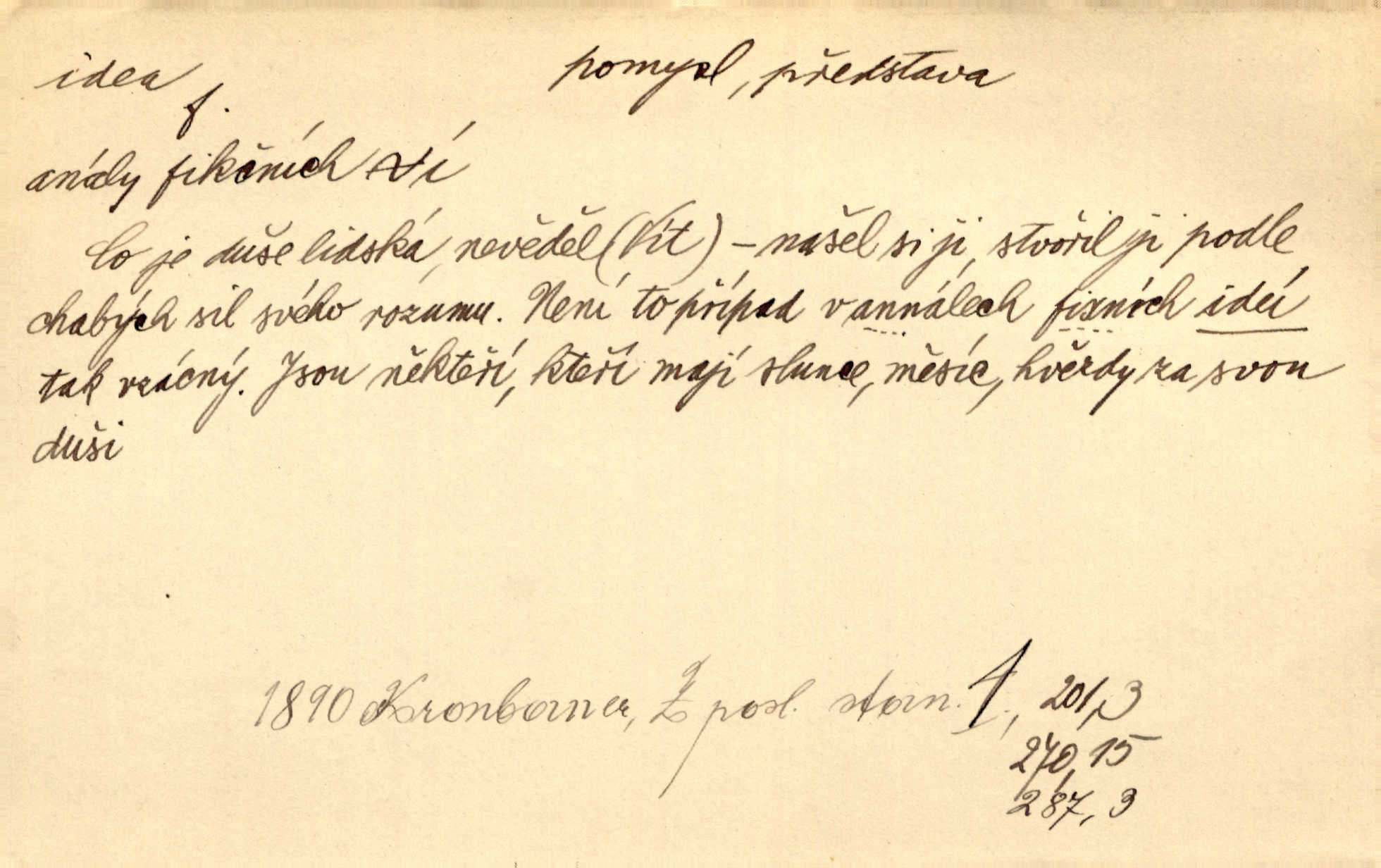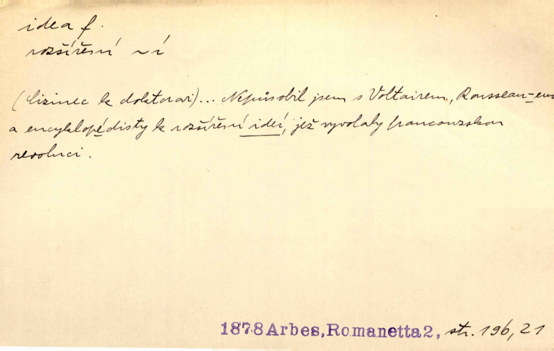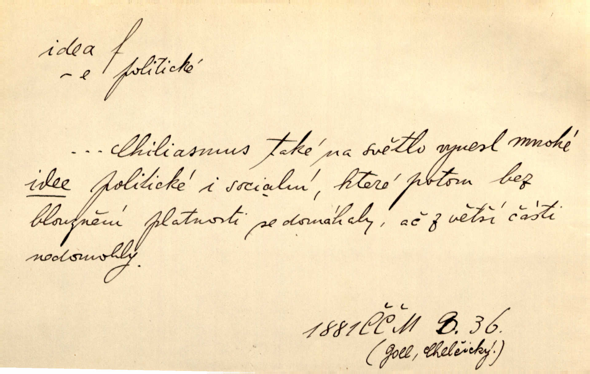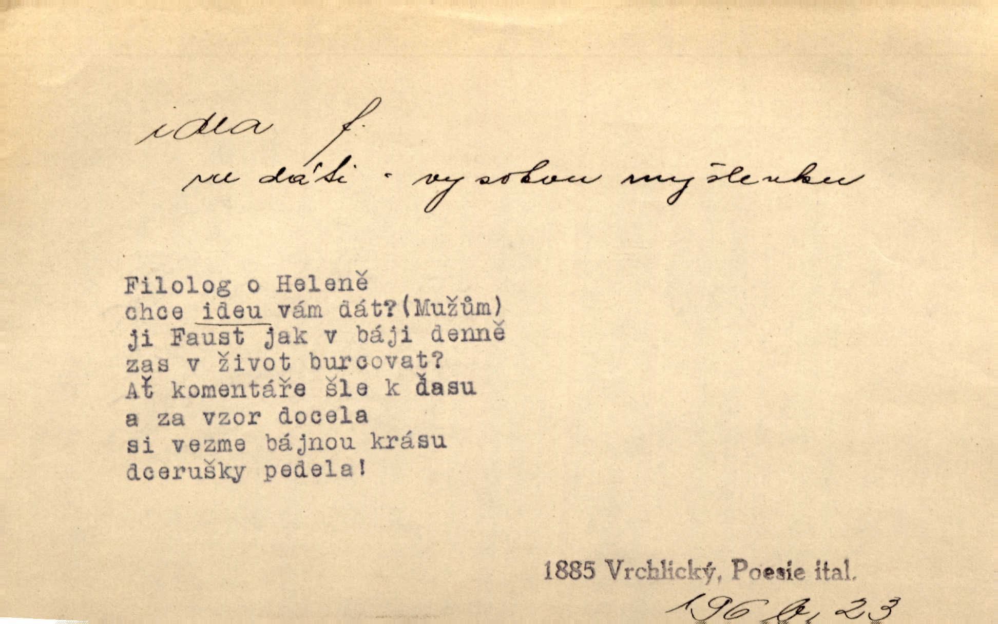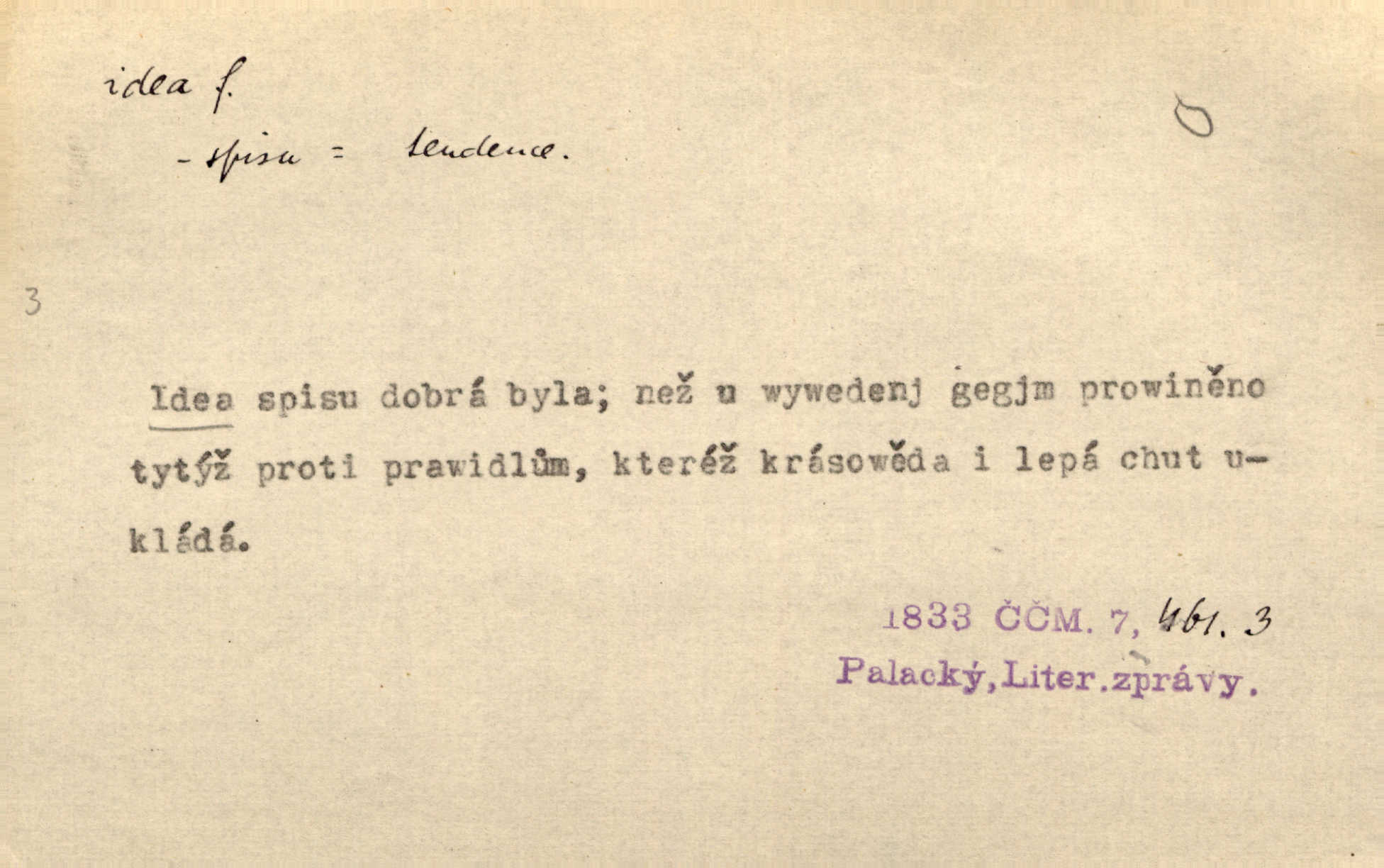 - idea, idey n. ideje f. (sg. dat. a lok. idei, ideji, ak. ideu, ideji, instr. ideou, idejí; pl. nom. ak. idey n. ideje, gen. ideí, idejí, dat. ideám, idejím atd.) základní, vůdčí myšlenka. Bít se za krásnou a dobrou ideu — neznám vábnějšího života. V. Mrš. Ideje francouzské revoluce měly u nás mnoho vyznavačův. Jir. Vondrejc býval vždycky jen theoretikem, hlasatelem ideí, ale když došlo k propagandě činu, selhal. Čap. Ch. Chiliasmus také na světlo vynesl mnohé idee politické i sociální. Goll. Juž tenkrát pučela v hlavě Jacintově idea jeho básně o Atlantidě. Vrch. D Filos. pojmová podstata poznaného předmětu v lidském duchu, nepodmíněný pojem. Idea pravdy, dobra, krásy. D myšlenka, nápad. Výborná idea, nemám právě co dělat, půjdu vyhledat dceru. Vrch. Byla to náhlá úzkost, že se nemoc vrátí, anebo že se ulomená klika stane mou fixní ideou utkvělou myšlenkou. Čap. Ch.