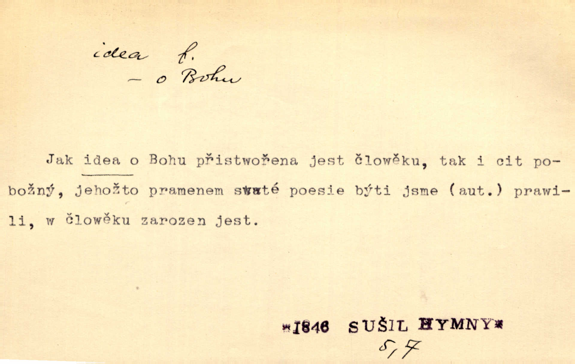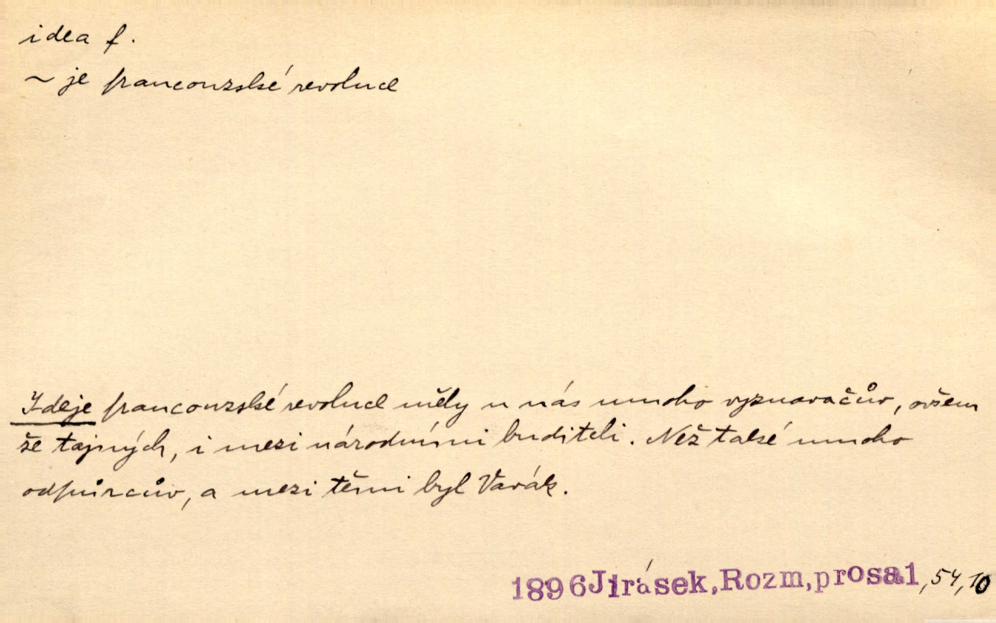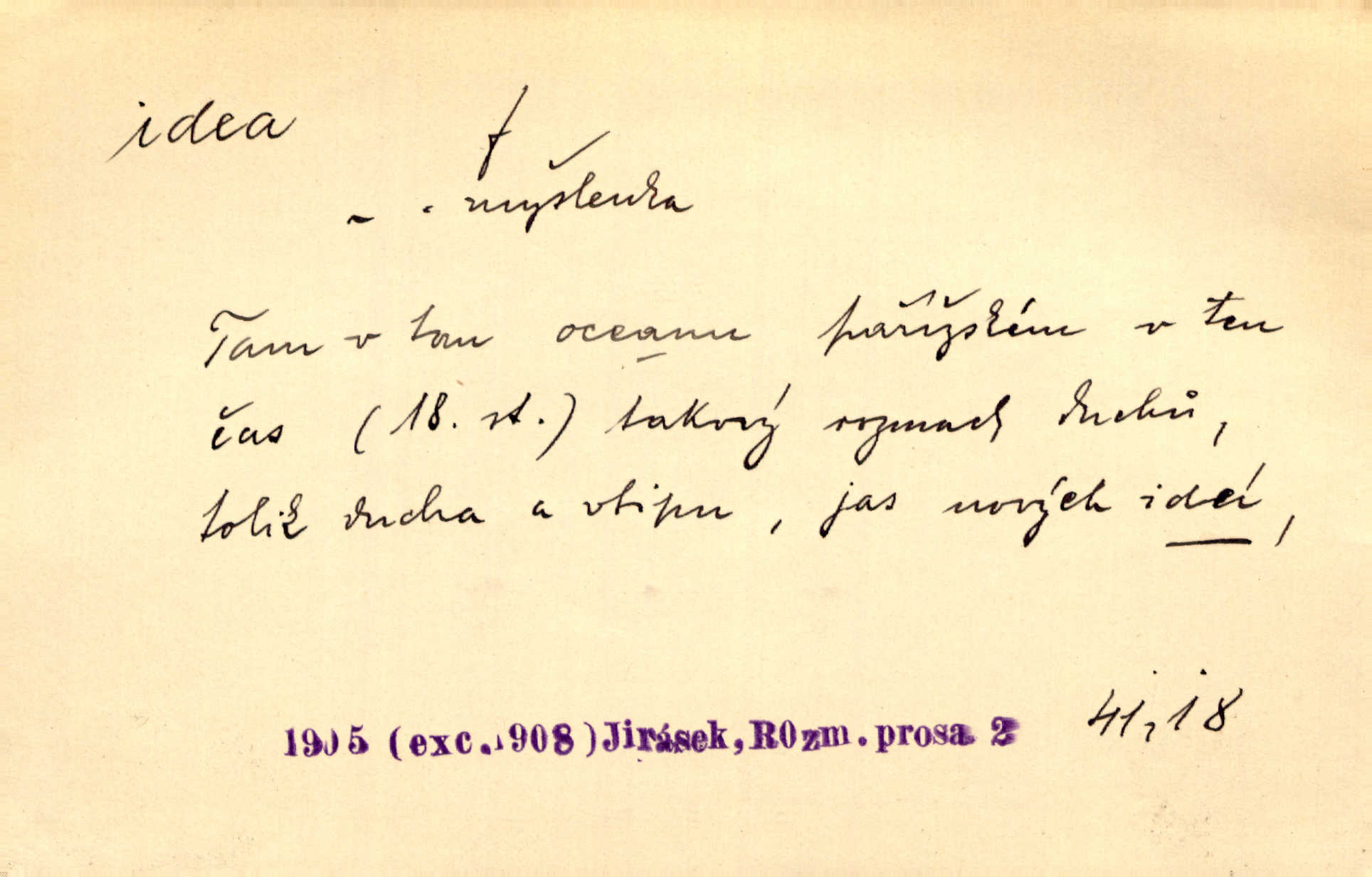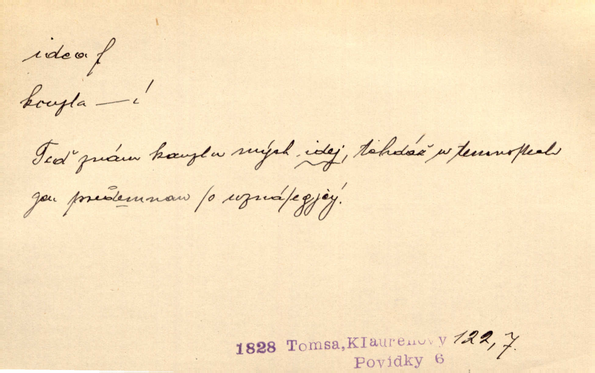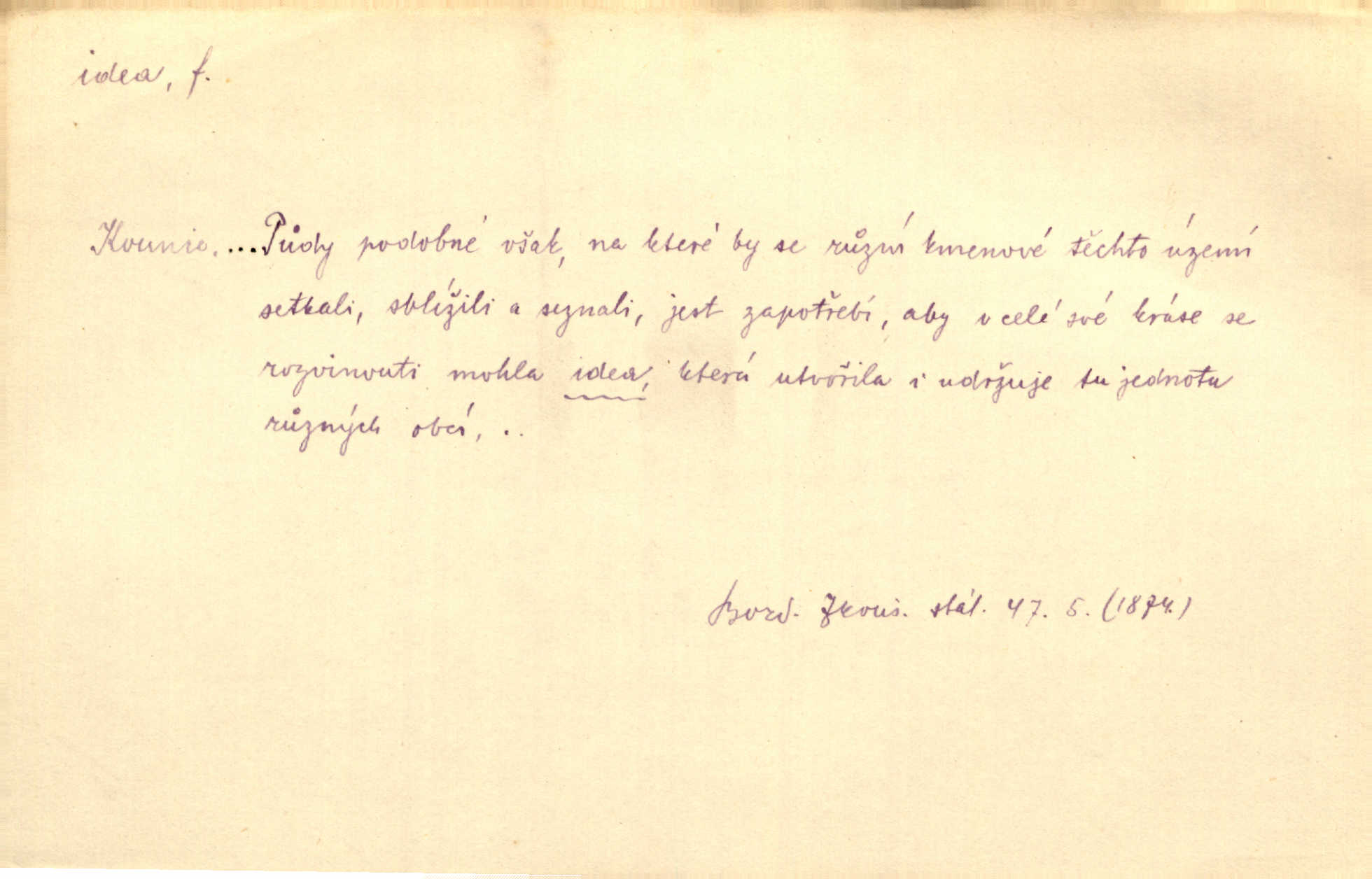 - idea, idey n. ideje f. (sg. dat. a lok. idei, ideji, ak. ideu, ideji, instr. ideou, idejí; pl. nom. ak. idey n. ideje, gen. ideí, idejí, dat. ideám, idejím atd.) základní, vůdčí myšlenka. Bít se za krásnou a dobrou ideu — neznám vábnějšího života. V. Mrš. Ideje francouzské revoluce měly u nás mnoho vyznavačův. Jir. Vondrejc býval vždycky jen theoretikem, hlasatelem ideí, ale když došlo k propagandě činu, selhal. Čap. Ch. Chiliasmus také na světlo vynesl mnohé idee politické i sociální. Goll. Juž tenkrát pučela v hlavě Jacintově idea jeho básně o Atlantidě. Vrch. D Filos. pojmová podstata poznaného předmětu v lidském duchu, nepodmíněný pojem. Idea pravdy, dobra, krásy. D myšlenka, nápad. Výborná idea, nemám právě co dělat, půjdu vyhledat dceru. Vrch. Byla to náhlá úzkost, že se nemoc vrátí, anebo že se ulomená klika stane mou fixní ideou utkvělou myšlenkou. Čap. Ch.
