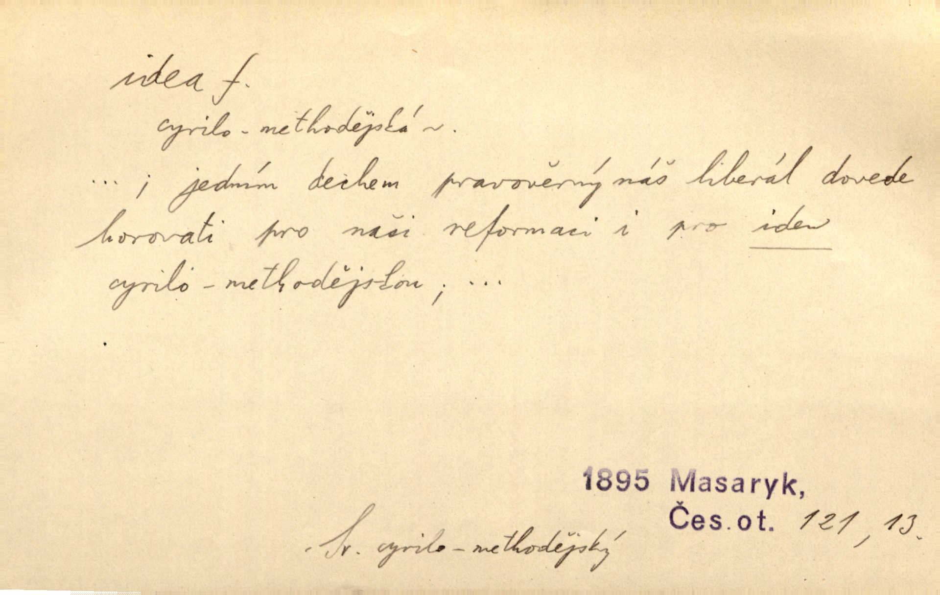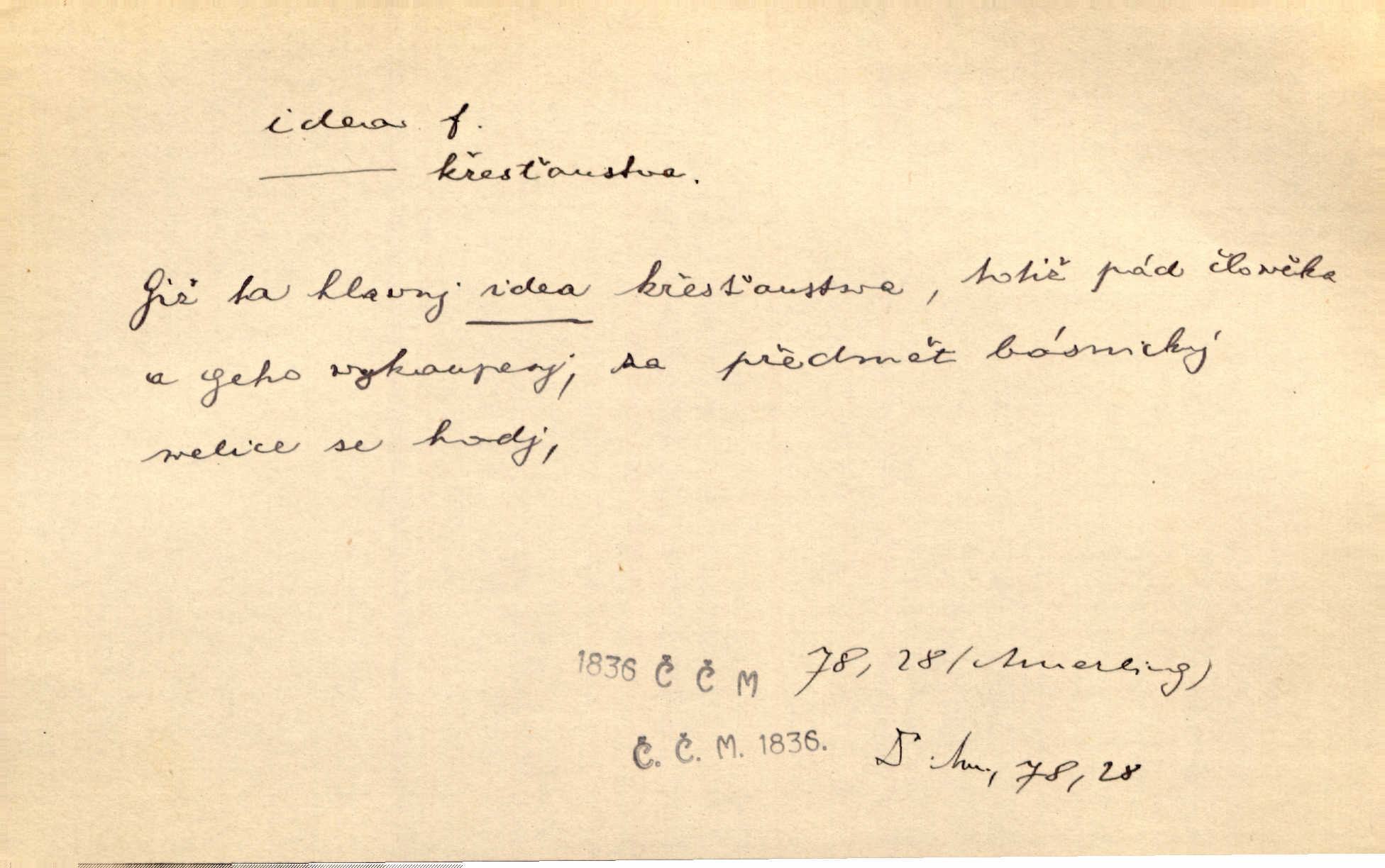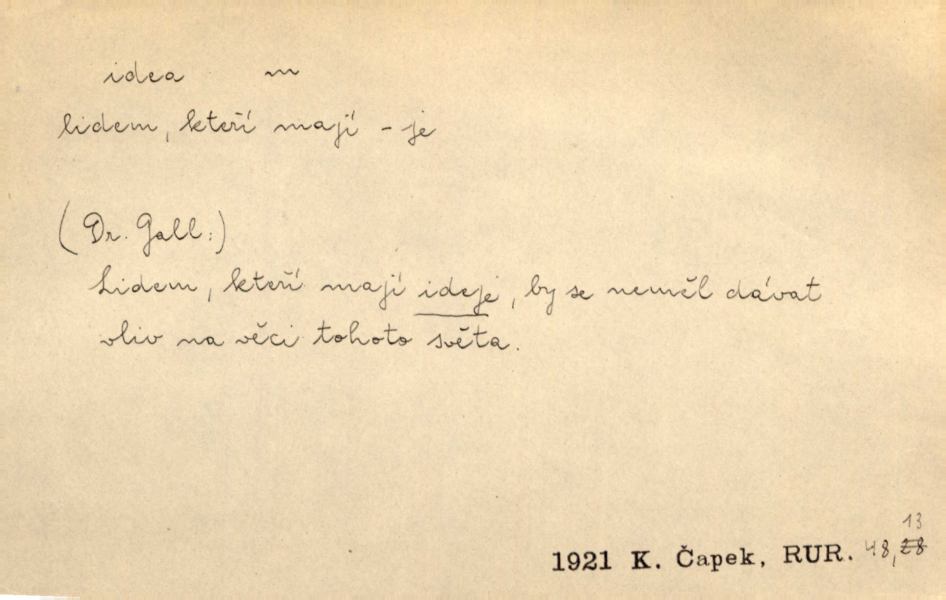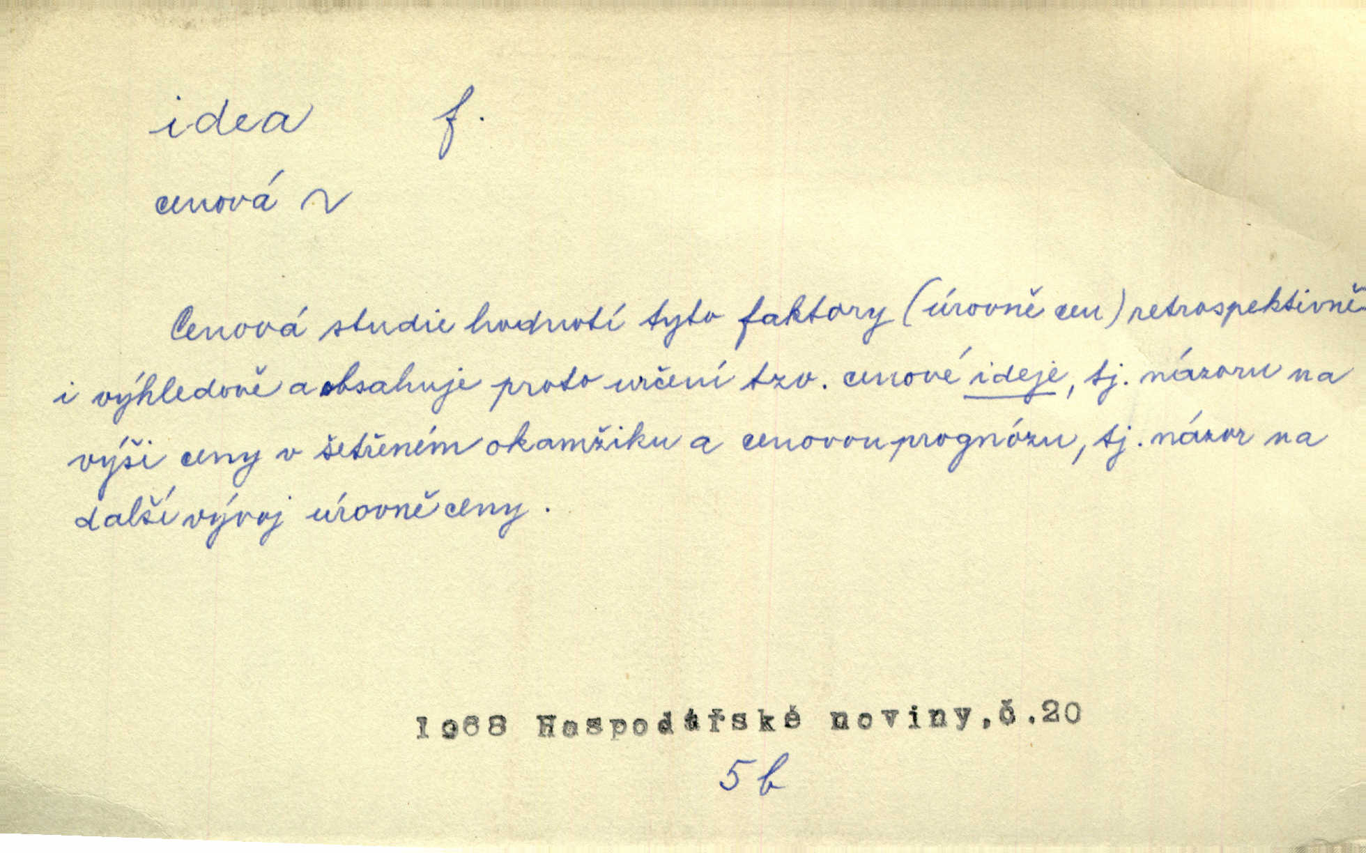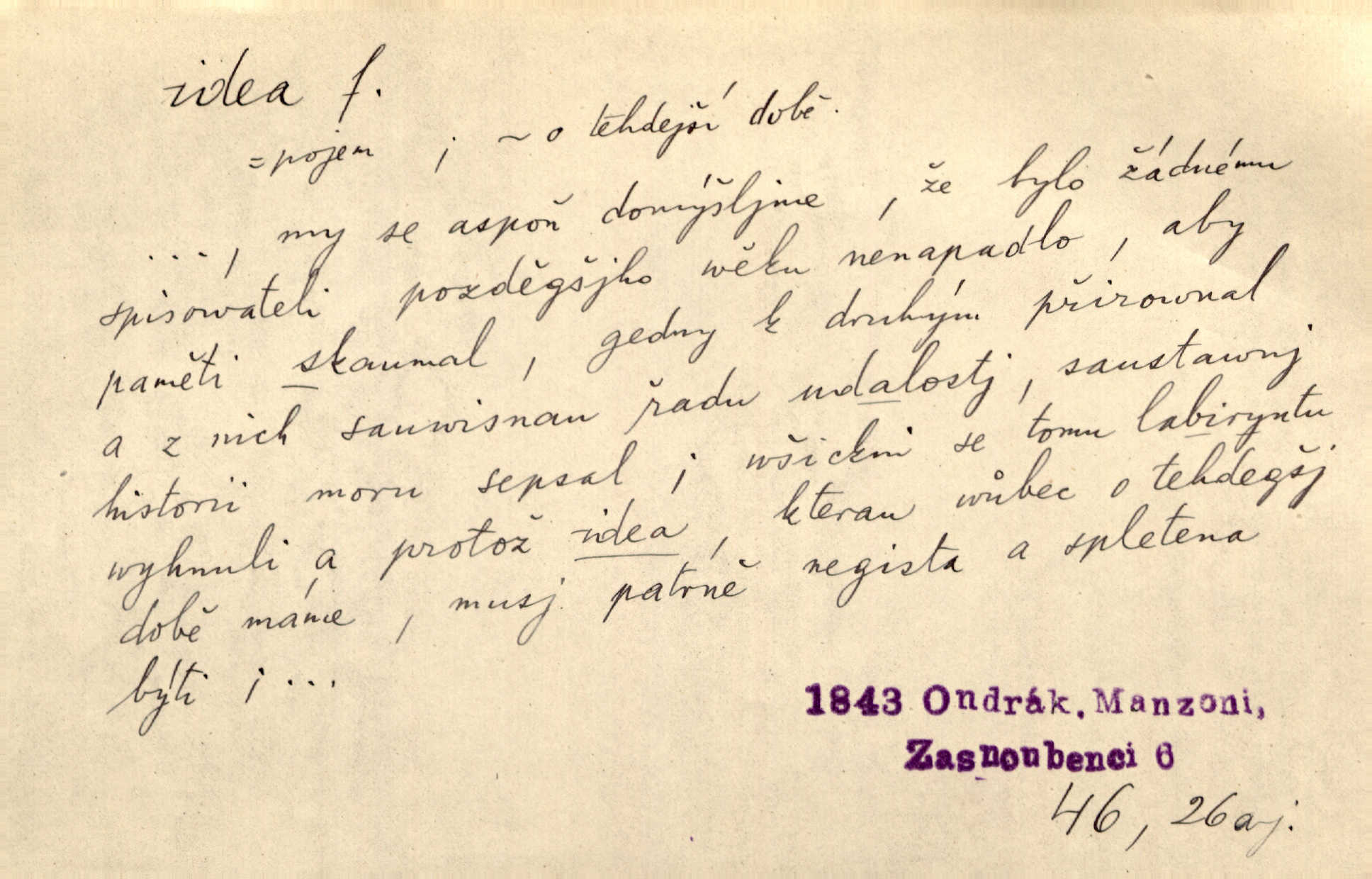 - idea, idey n. ideje f. (sg. dat. a lok. idei, ideji, ak. ideu, ideji, instr. ideou, idejí; pl. nom. ak. idey n. ideje, gen. ideí, idejí, dat. ideám, idejím atd.) základní, vůdčí myšlenka. Bít se za krásnou a dobrou ideu — neznám vábnějšího života. V. Mrš. Ideje francouzské revoluce měly u nás mnoho vyznavačův. Jir. Vondrejc býval vždycky jen theoretikem, hlasatelem ideí, ale když došlo k propagandě činu, selhal. Čap. Ch. Chiliasmus také na světlo vynesl mnohé idee politické i sociální. Goll. Juž tenkrát pučela v hlavě Jacintově idea jeho básně o Atlantidě. Vrch. D Filos. pojmová podstata poznaného předmětu v lidském duchu, nepodmíněný pojem. Idea pravdy, dobra, krásy. D myšlenka, nápad. Výborná idea, nemám právě co dělat, půjdu vyhledat dceru. Vrch. Byla to náhlá úzkost, že se nemoc vrátí, anebo že se ulomená klika stane mou fixní ideou utkvělou myšlenkou. Čap. Ch.