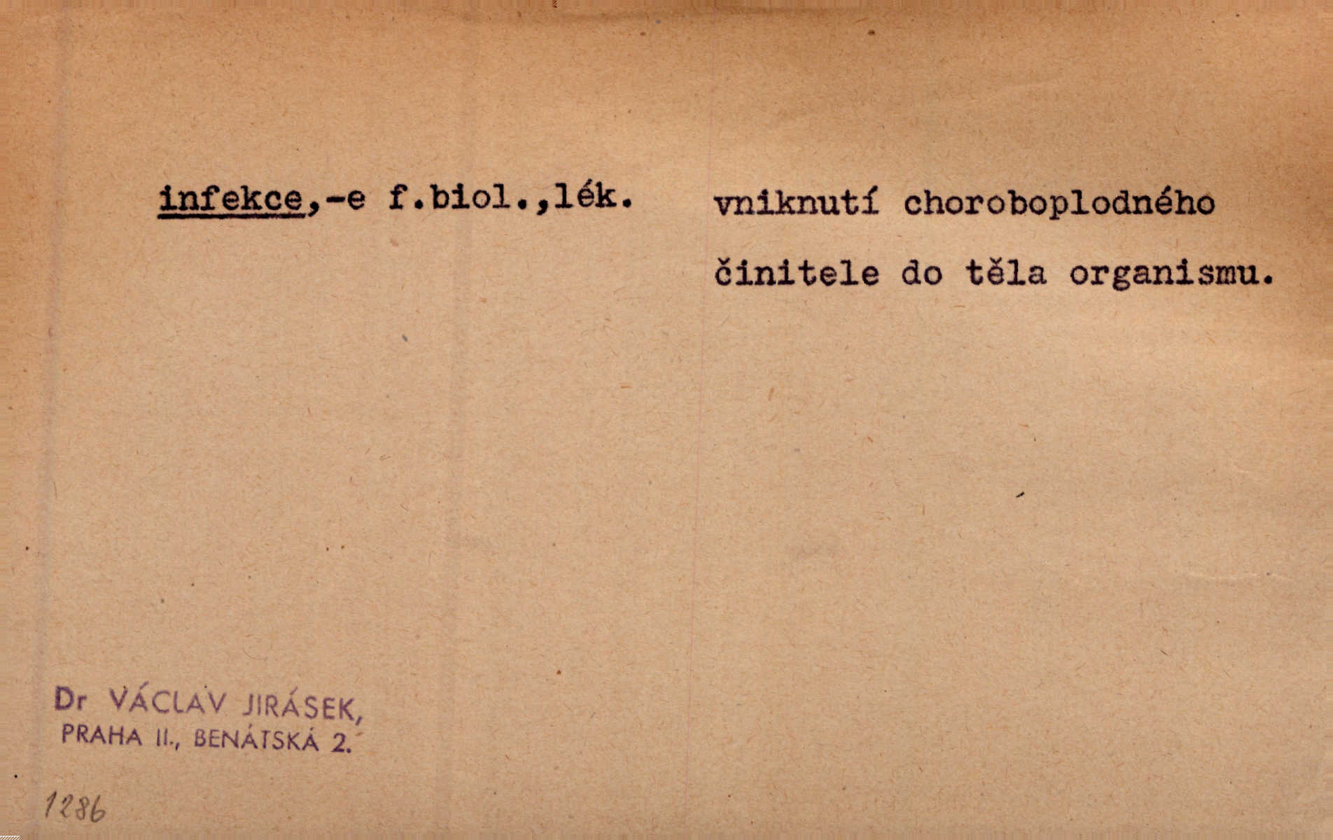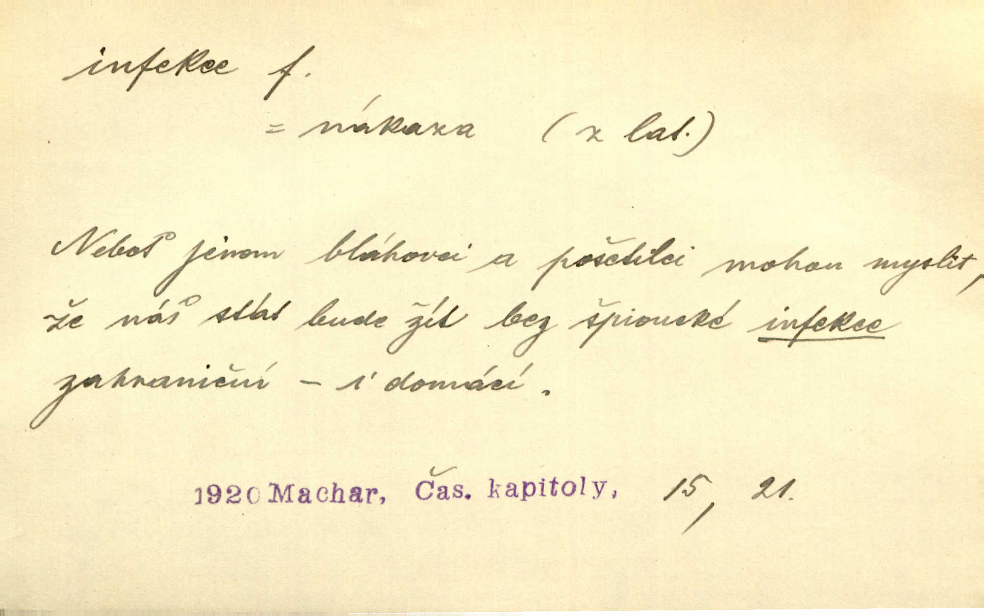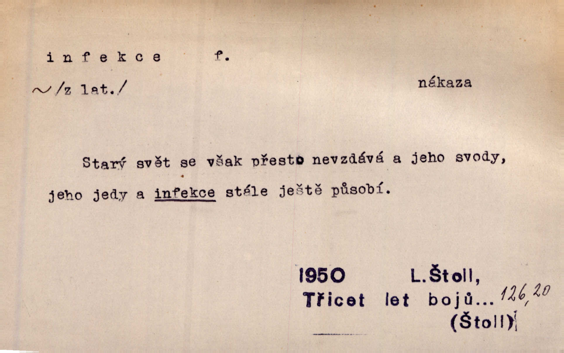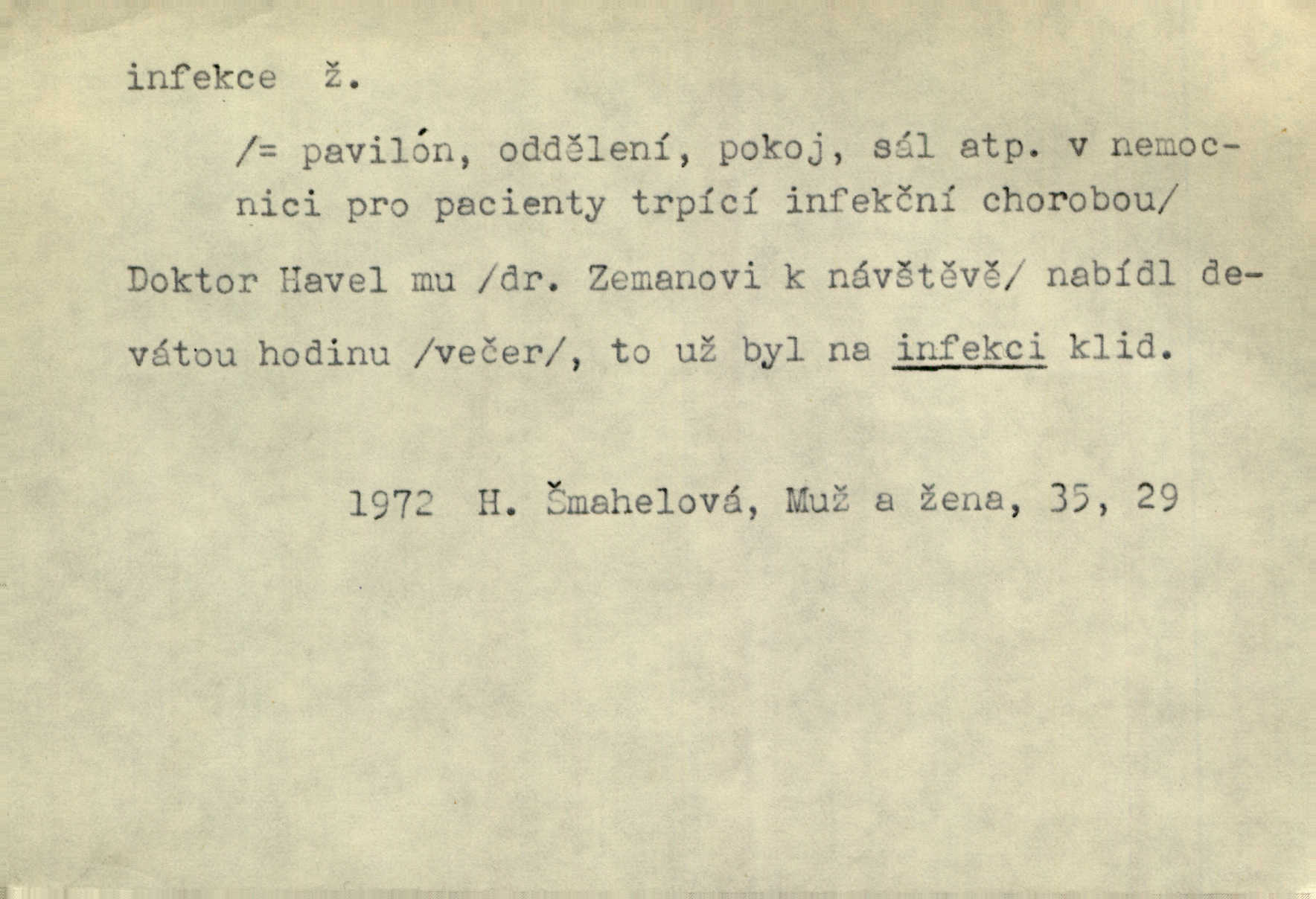 - infekce, -e f. lék. nákaza. Infekce se budou společnou chodbou [malé nemocnice] plížit do sousedních místností. Sez. Přen. Jenom bláhovci mohou myslit, že náš stát bude žít bez špionské infekce zahraniční — i domácí. Mach.