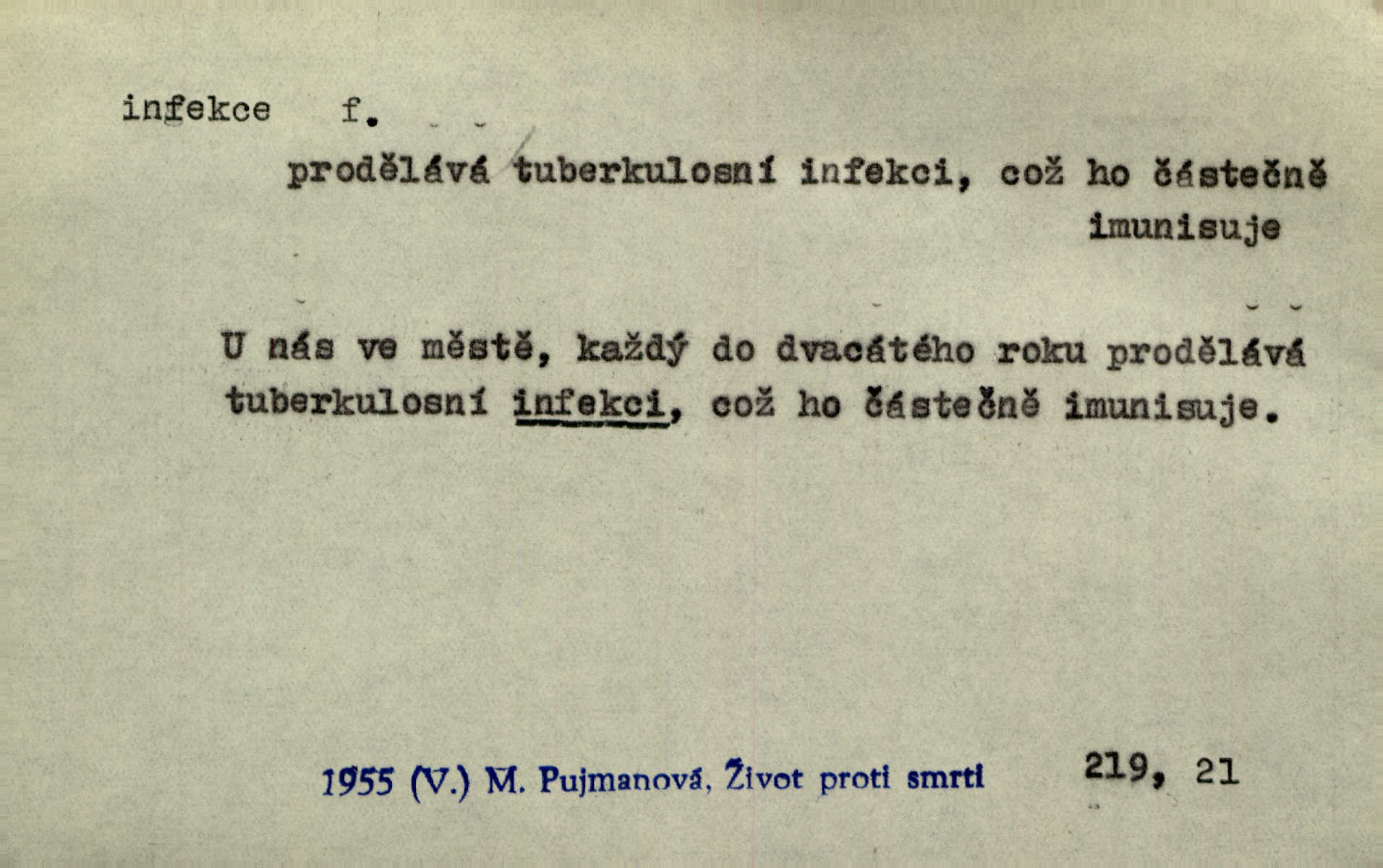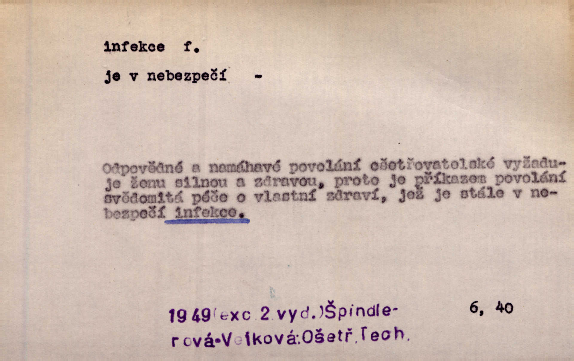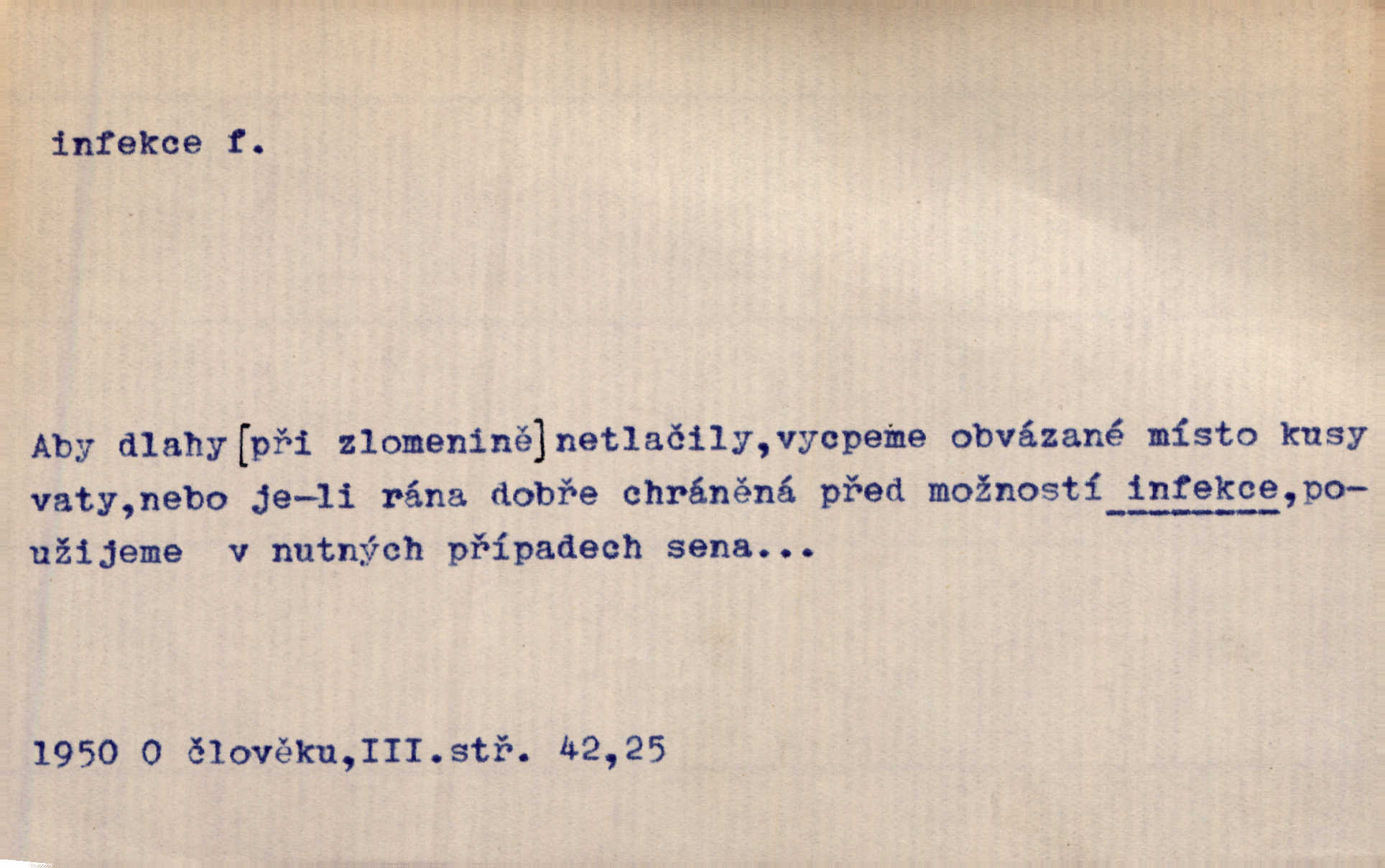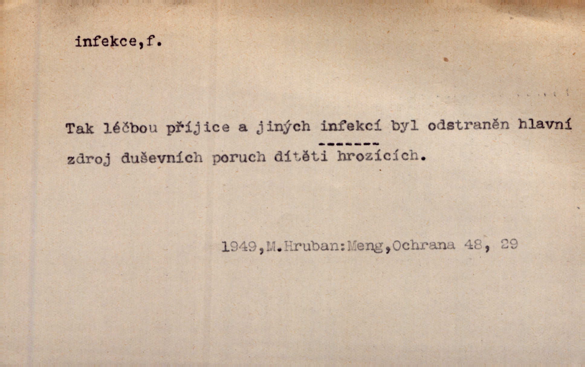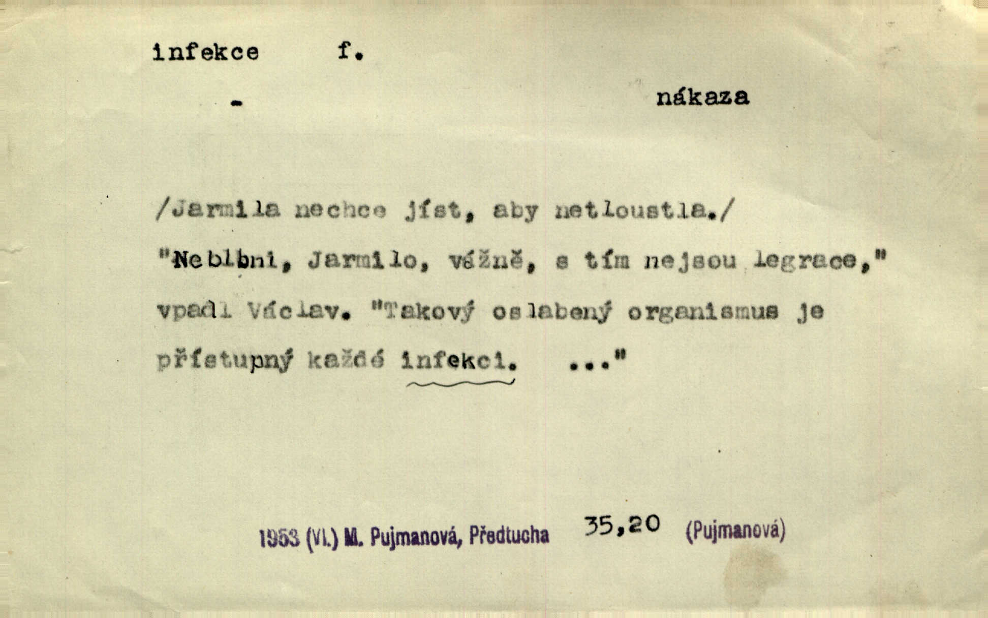 - infekce, -e f. lék. nákaza. Infekce se budou společnou chodbou [malé nemocnice] plížit do sousedních místností. Sez. Přen. Jenom bláhovci mohou myslit, že náš stát bude žít bez špionské infekce zahraniční — i domácí. Mach.