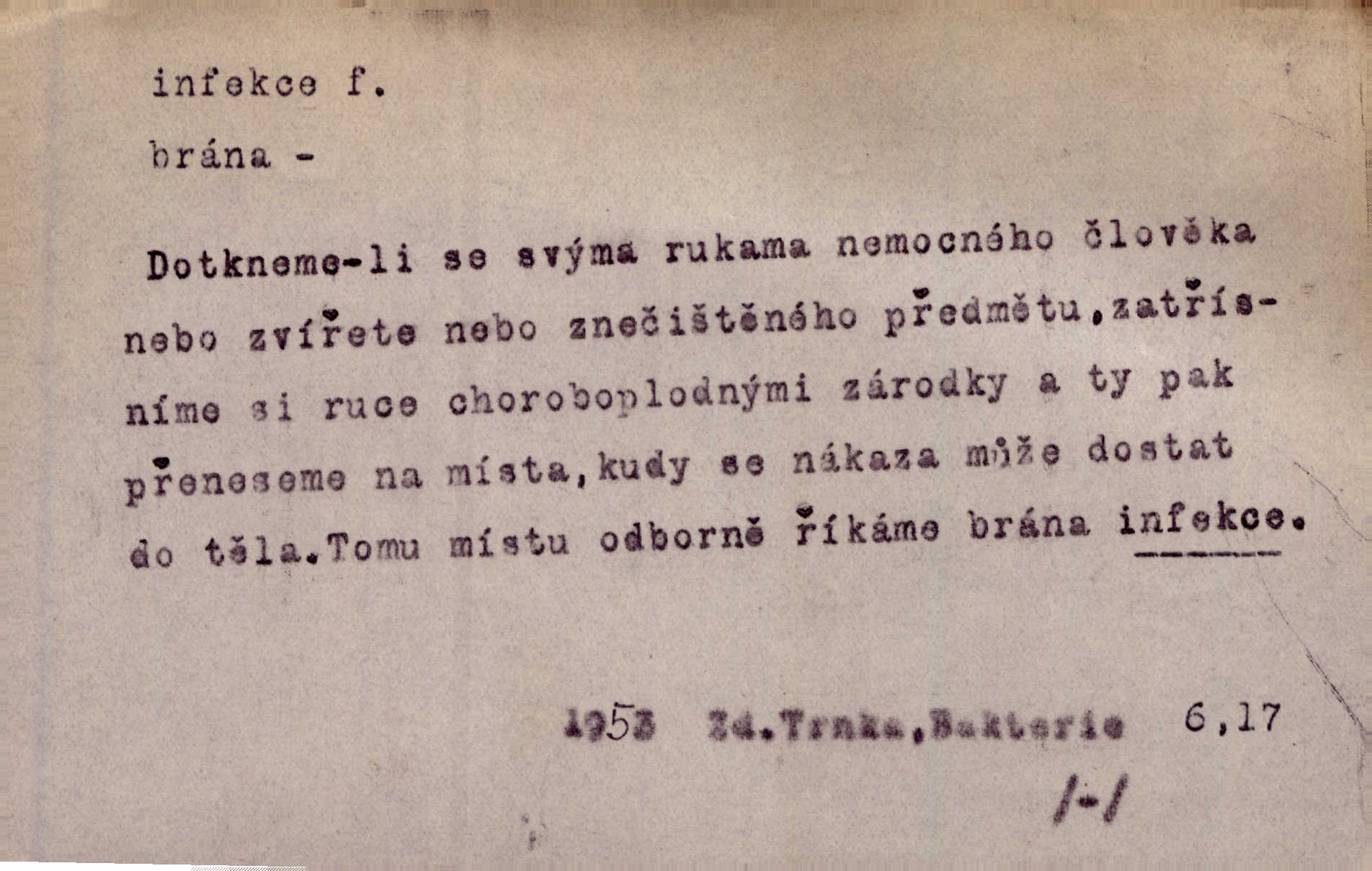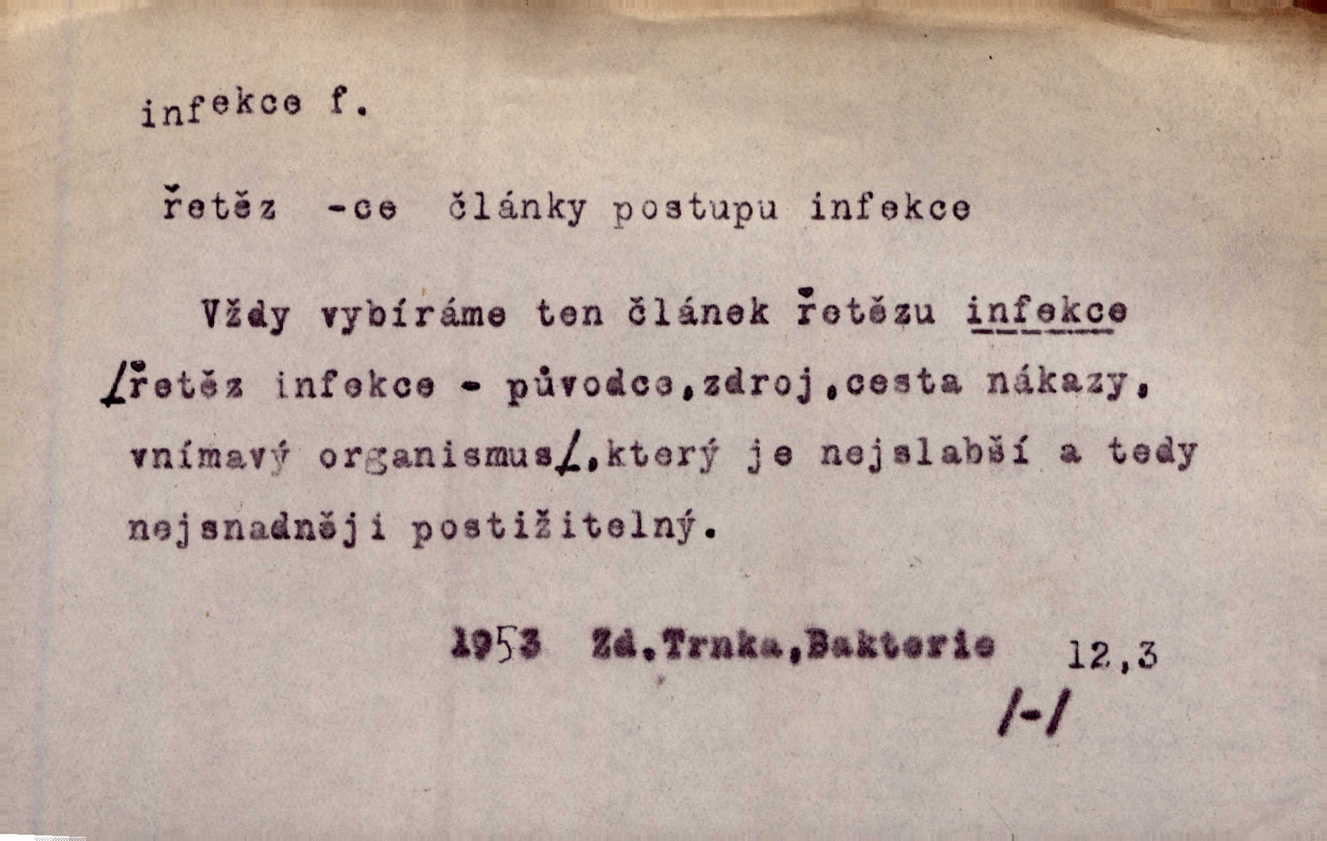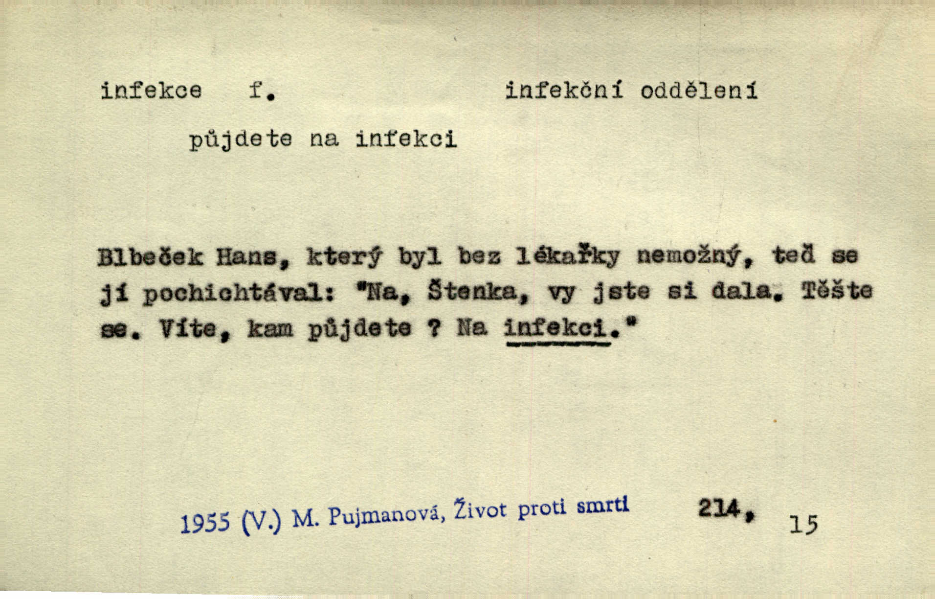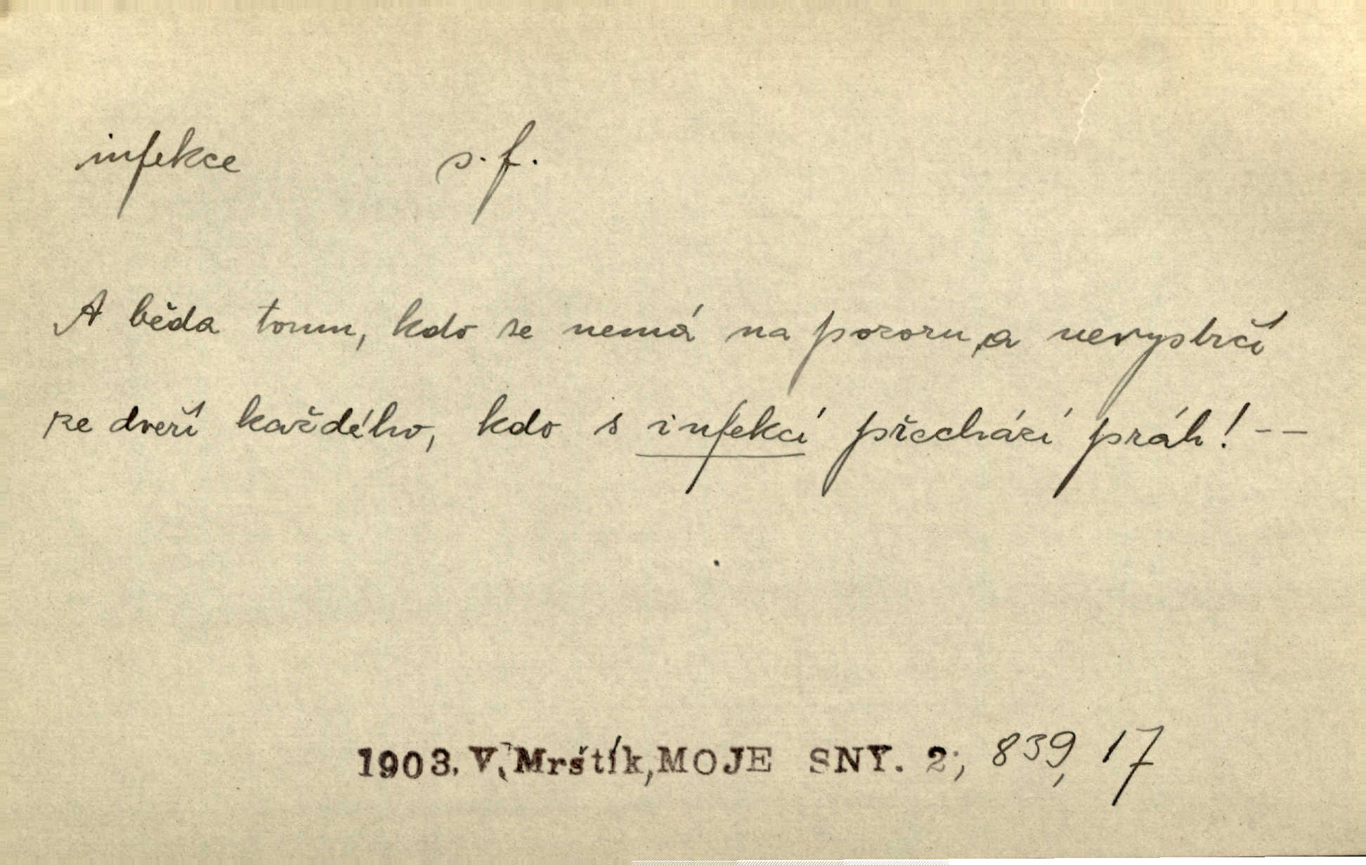 - infekce, -e f. lék. nákaza. Infekce se budou společnou chodbou [malé nemocnice] plížit do sousedních místností. Sez. Přen. Jenom bláhovci mohou myslit, že náš stát bude žít bez špionské infekce zahraniční — i domácí. Mach.
