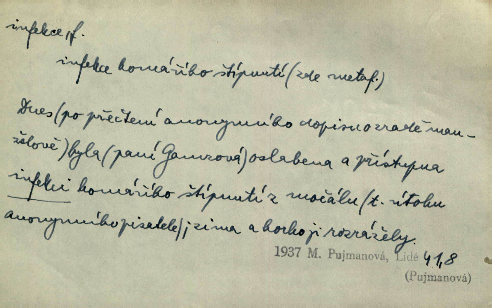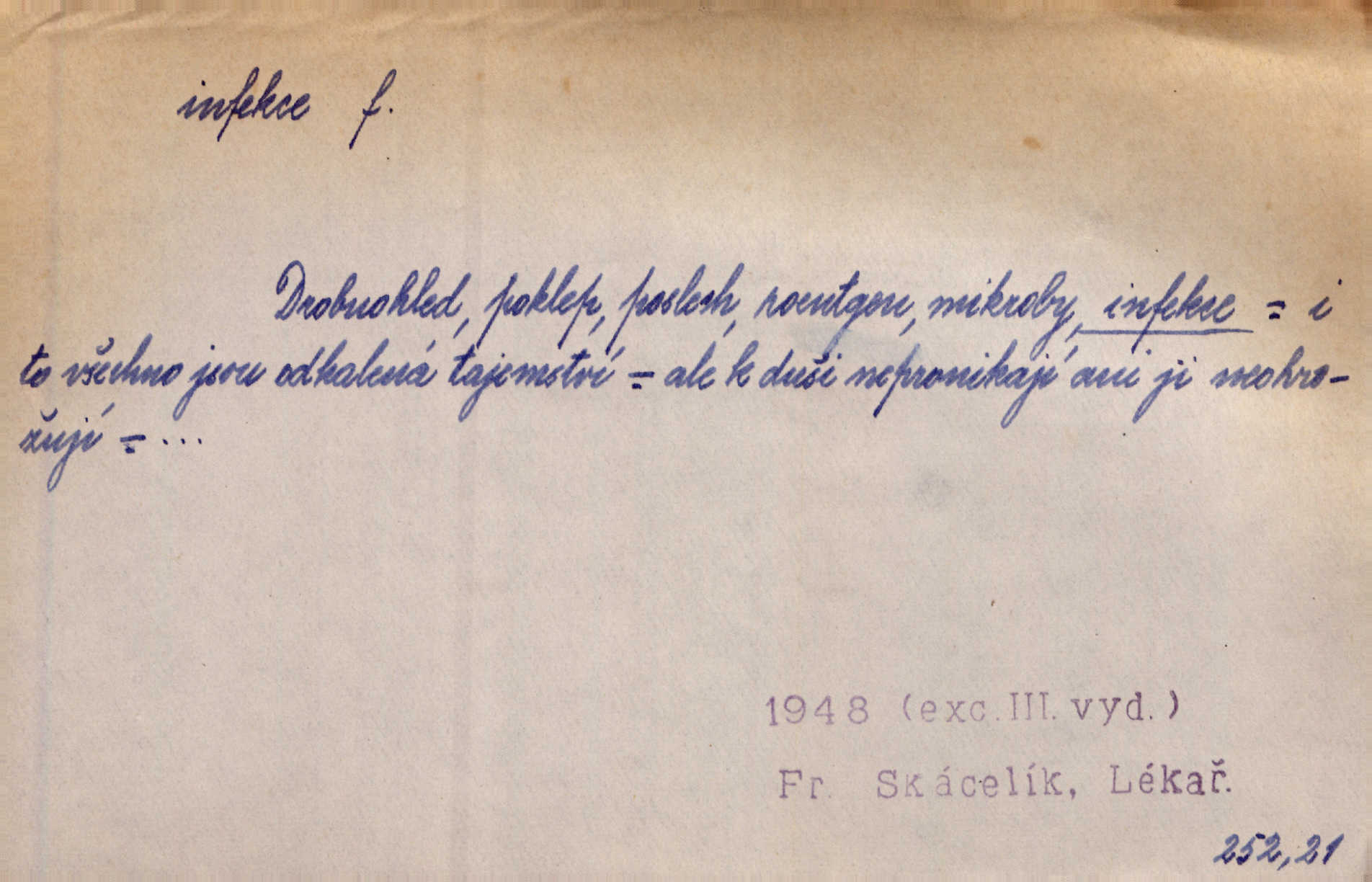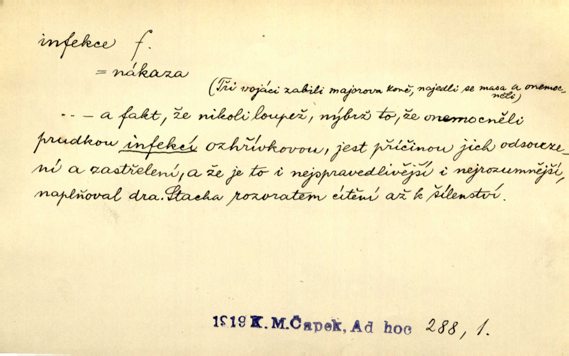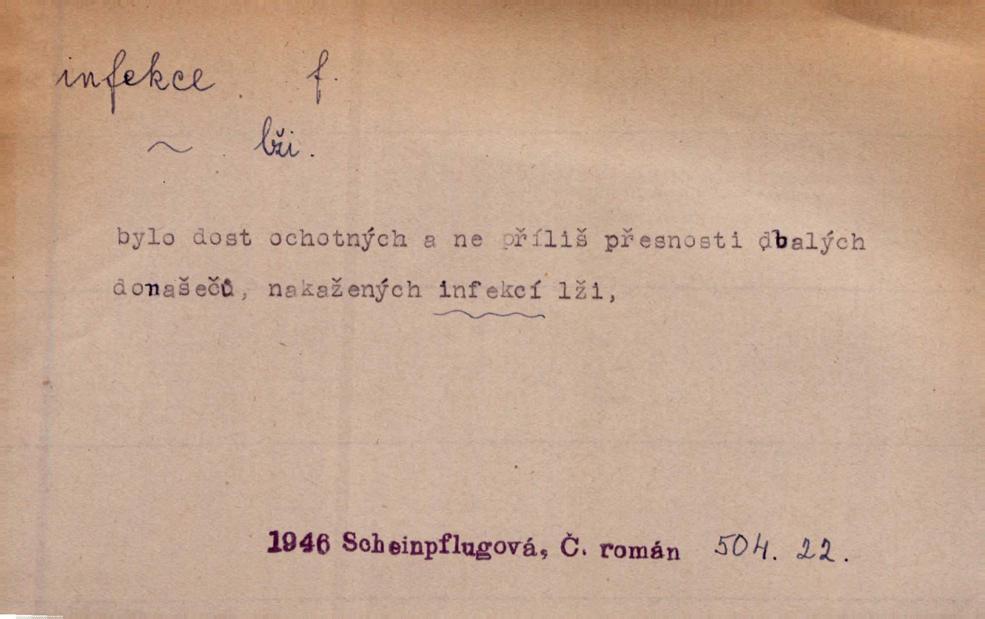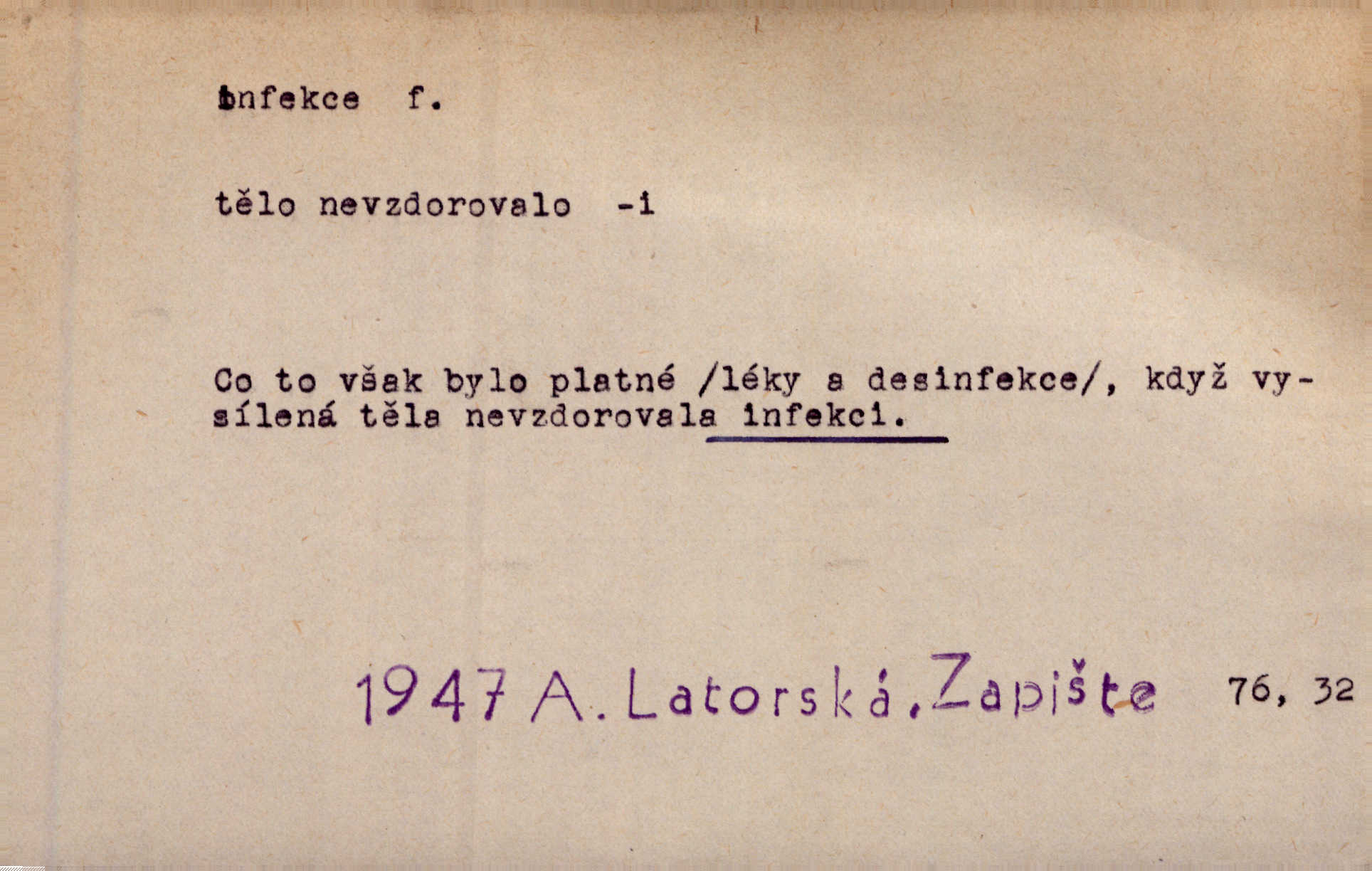 - infekce, -e f. lék. nákaza. Infekce se budou společnou chodbou [malé nemocnice] plížit do sousedních místností. Sez. Přen. Jenom bláhovci mohou myslit, že náš stát bude žít bez špionské infekce zahraniční — i domácí. Mach.