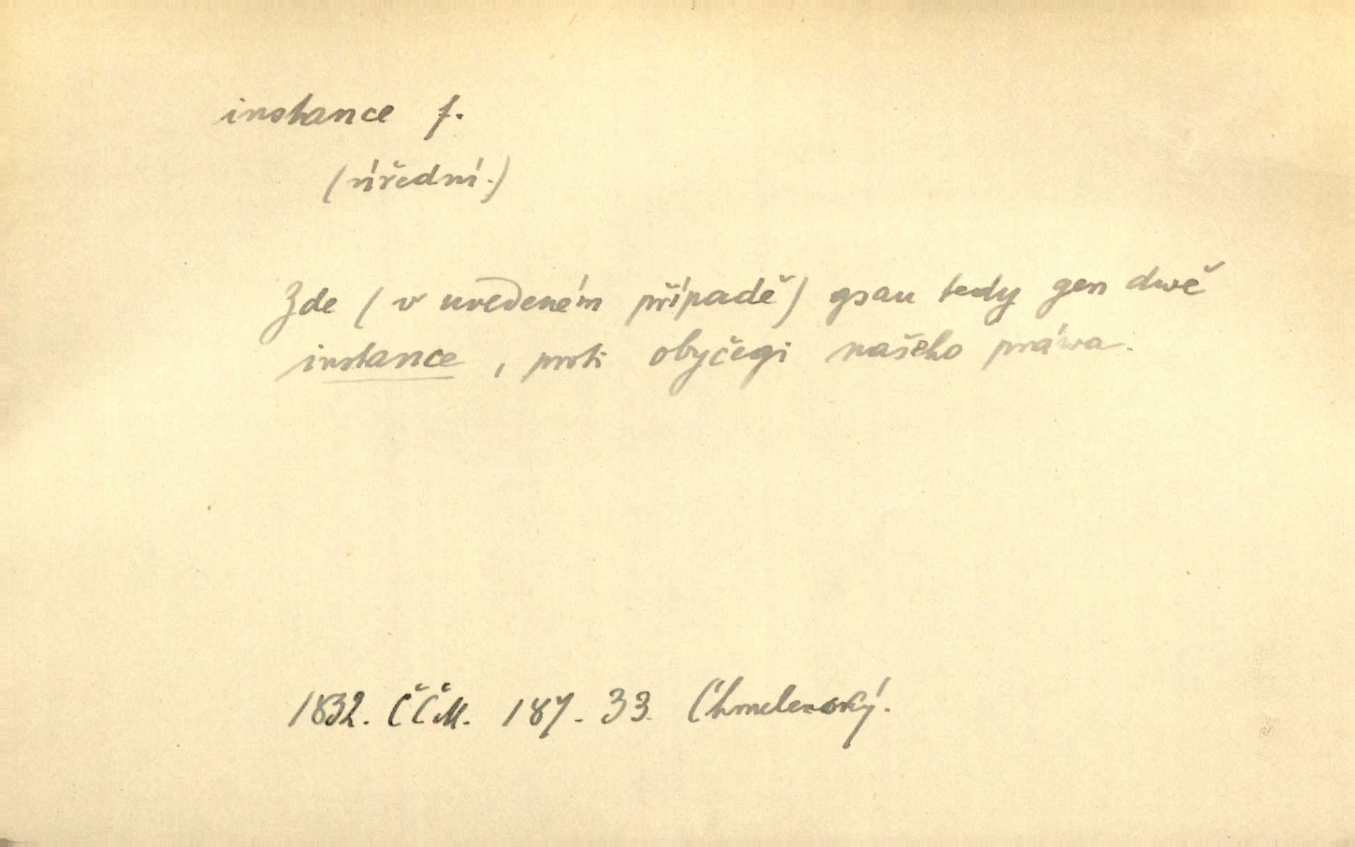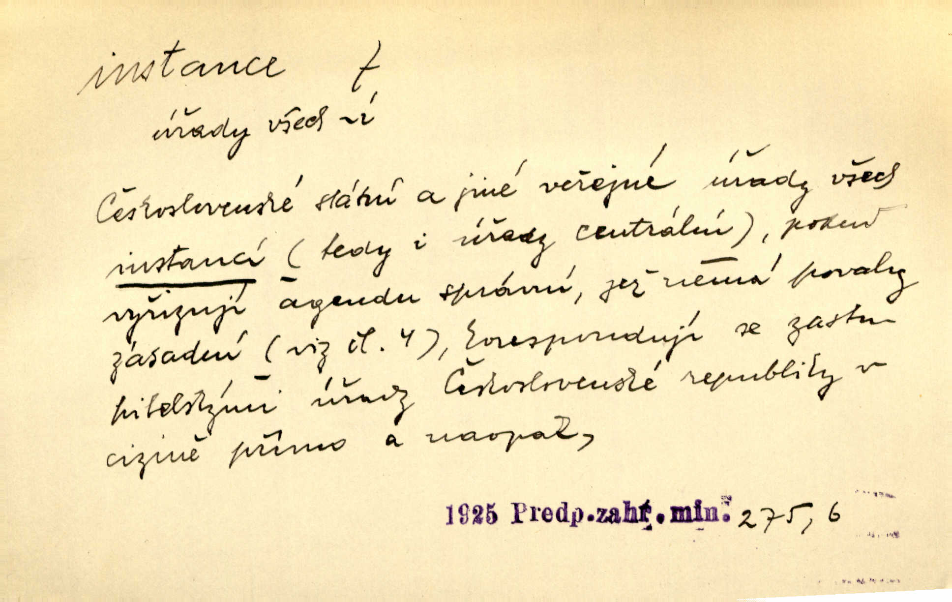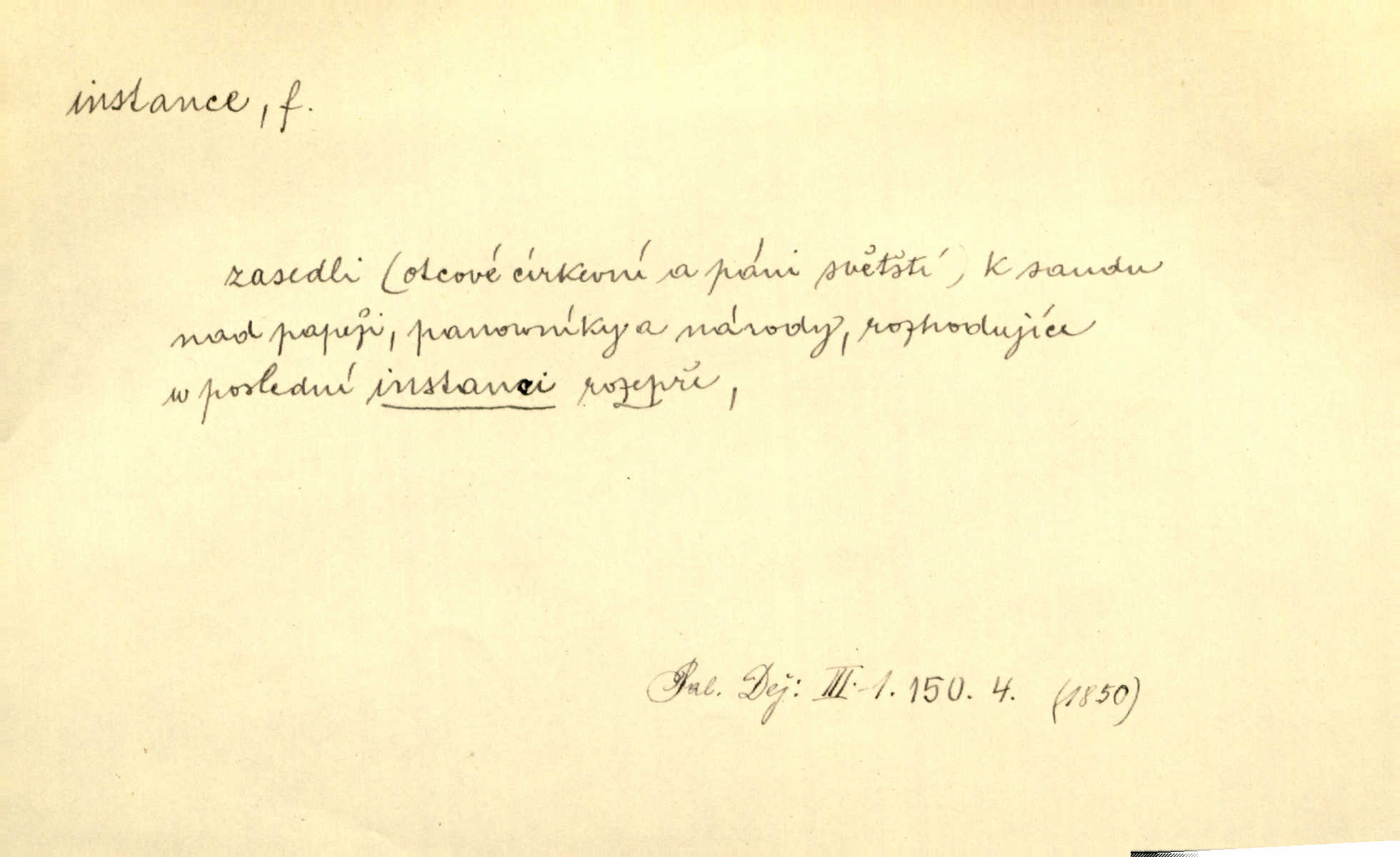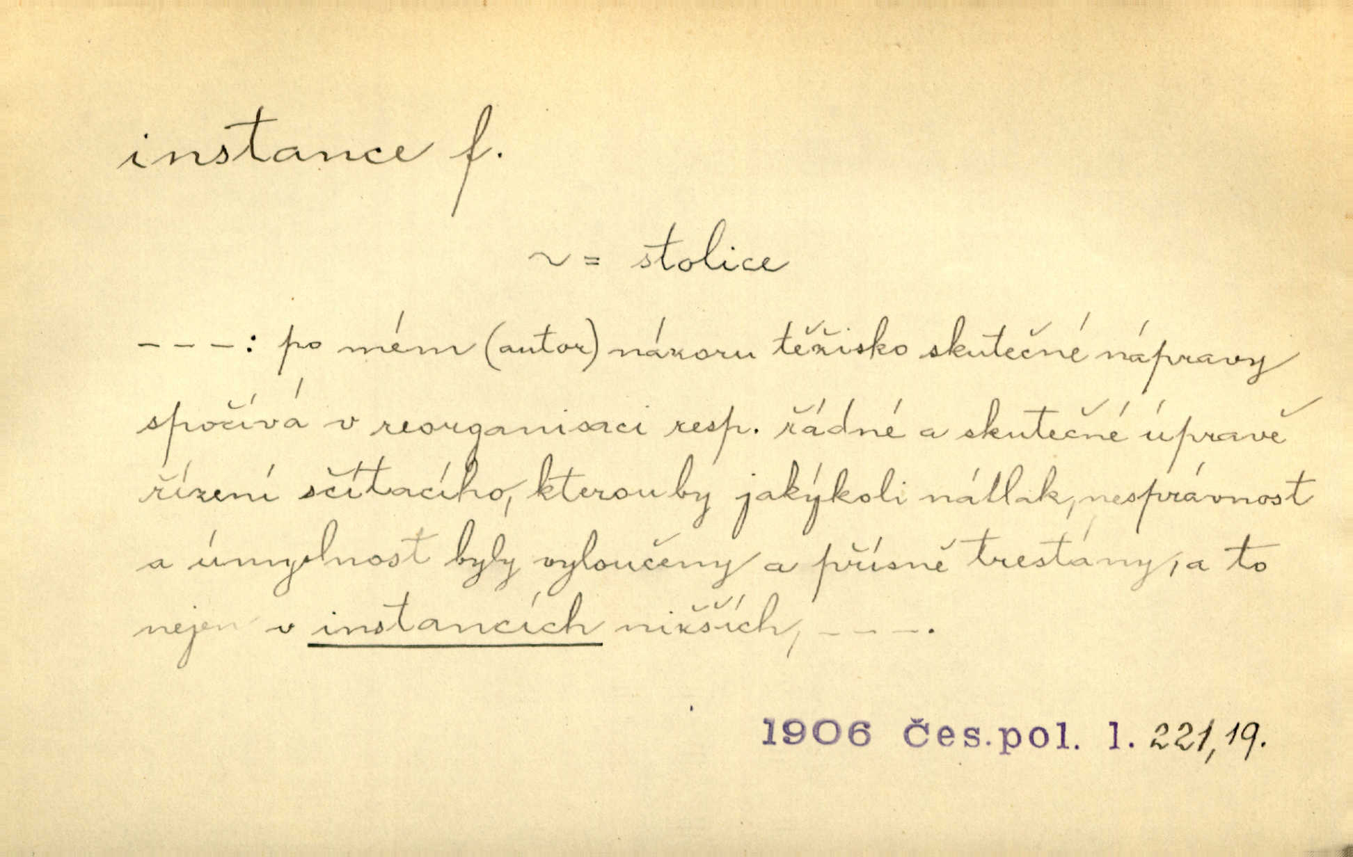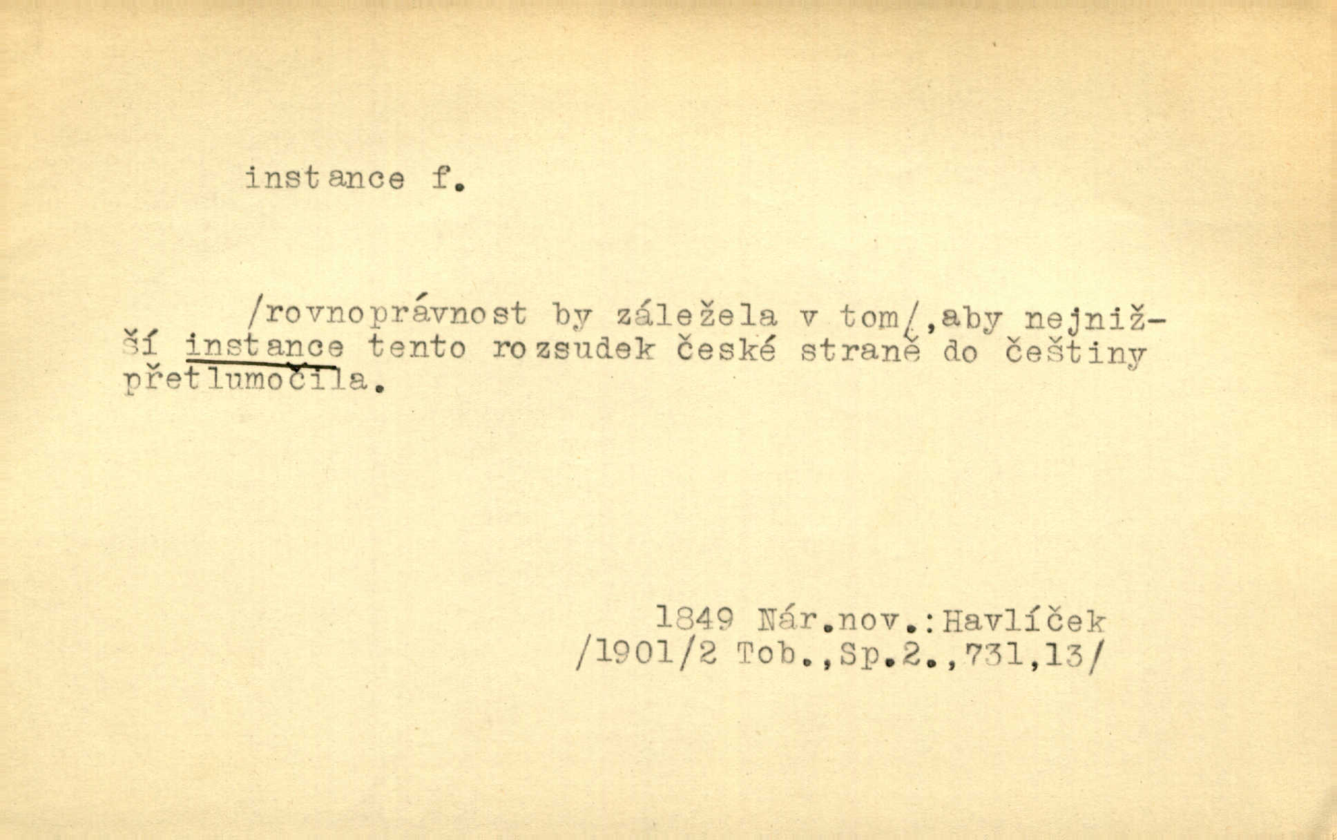- instance, -e f. práv. stolice, úřad jistého stupně. První až třetí soudní instance. Vyhrál ve všech instancích. Československé státní a jiné veřejné úřady všech instancí (tedy i úřady centrální) korespondují se zastupitelskými úřady Československé republiky v cizině přímo a naopak. Předp. zahr. min. D příslušný úřad. Pro spory zaměstnanců se zaměstnavateli jsou instancí soudy pracovní. D rozhodující činitel, autorita. Ale snad přece jest instance jakás, ústav, těleso, kde se dbá správnosti lazykové. Herrm. Jevová skutečnost a její konformita jest poslední rozhodčí instance vědecká. Šal. Nesl jsem práci k tehdejší nejvyšší instanci literární, k Hálkovi. Čech.
