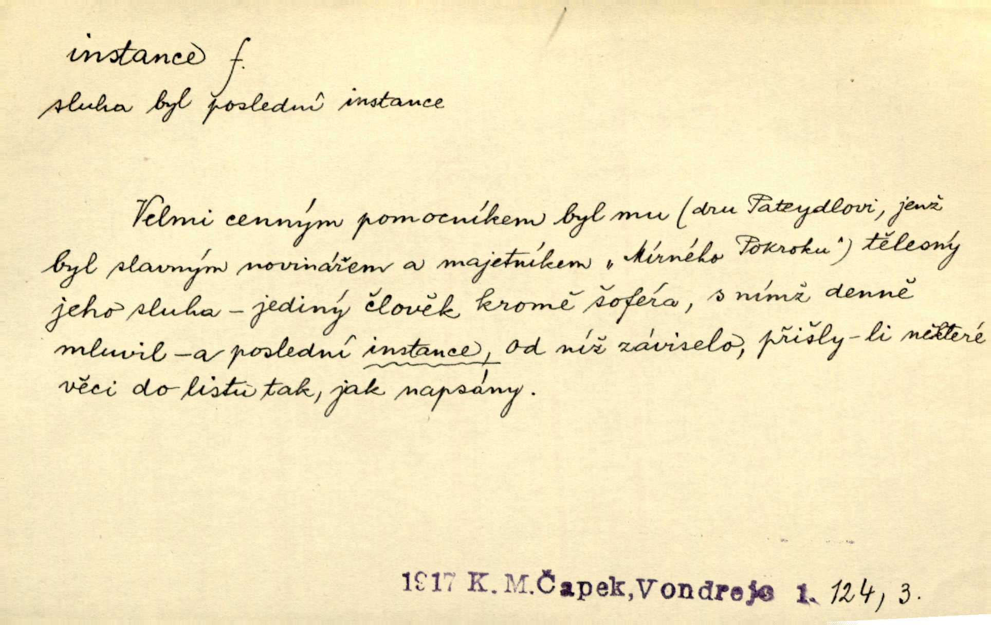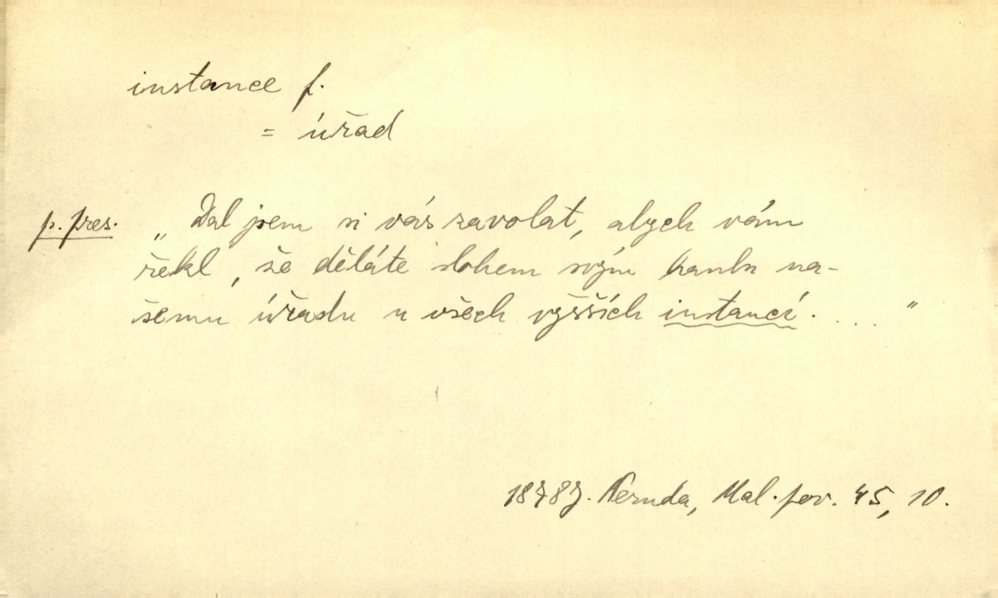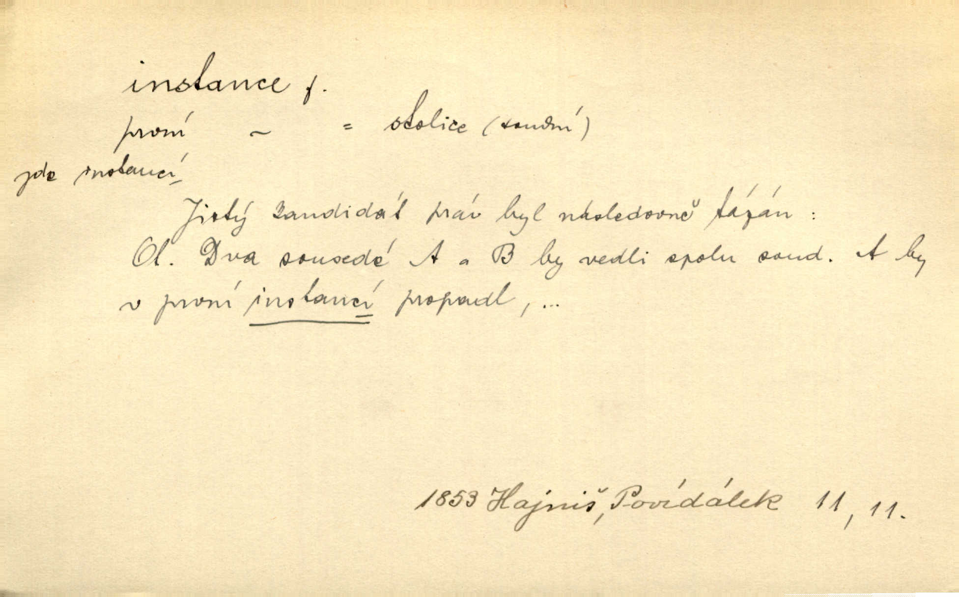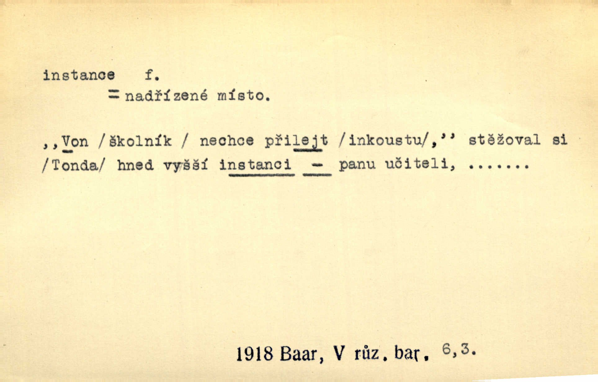 - instance, -e f. práv. stolice, úřad jistého stupně. První až třetí soudní instance. Vyhrál ve všech instancích. Československé státní a jiné veřejné úřady všech instancí (tedy i úřady centrální) korespondují se zastupitelskými úřady Československé republiky v cizině přímo a naopak. Předp. zahr. min. D příslušný úřad. Pro spory zaměstnanců se zaměstnavateli jsou instancí soudy pracovní. D rozhodující činitel, autorita. Ale snad přece jest instance jakás, ústav, těleso, kde se dbá správnosti lazykové. Herrm. Jevová skutečnost a její konformita jest poslední rozhodčí instance vědecká. Šal. Nesl jsem práci k tehdejší nejvyšší instanci literární, k Hálkovi. Čech.