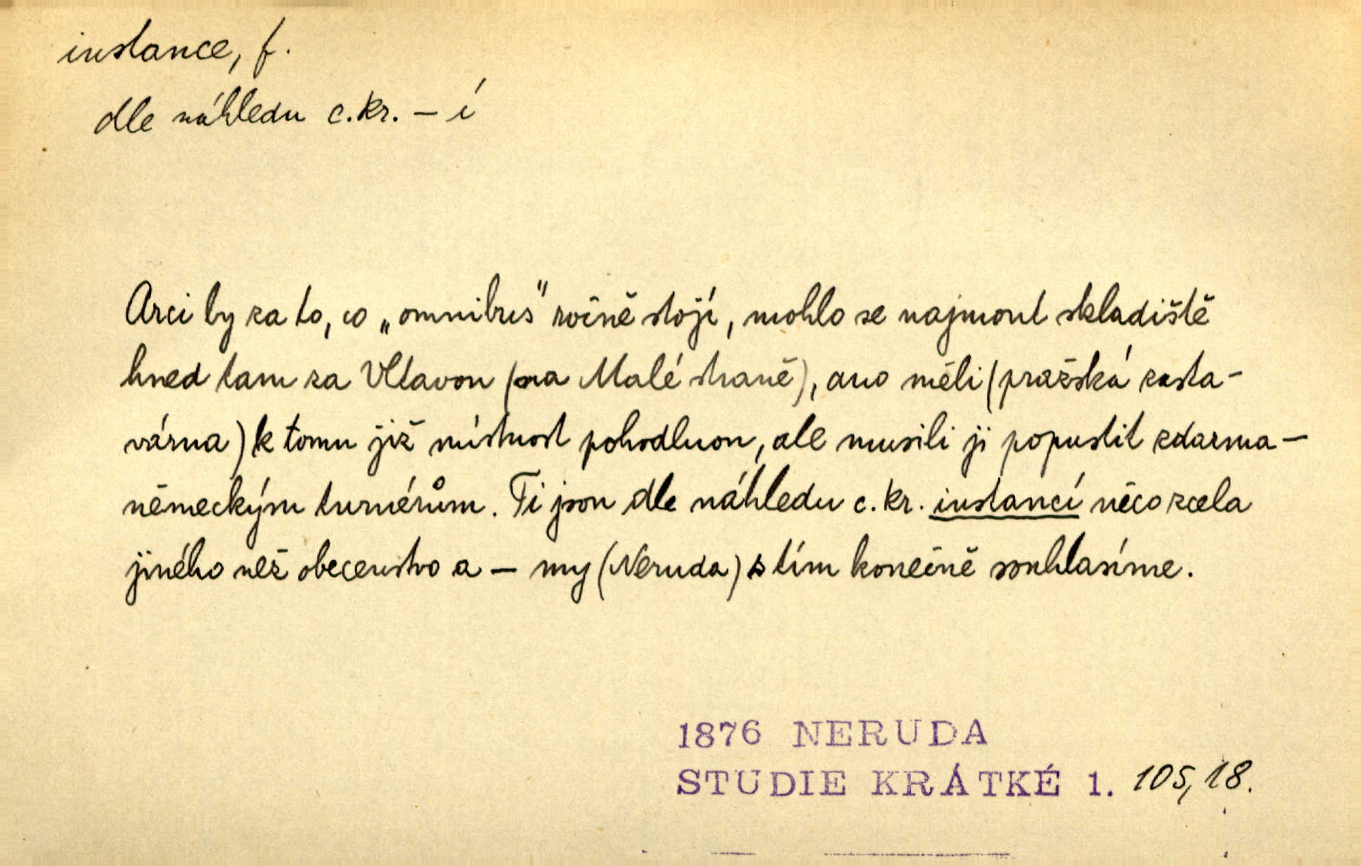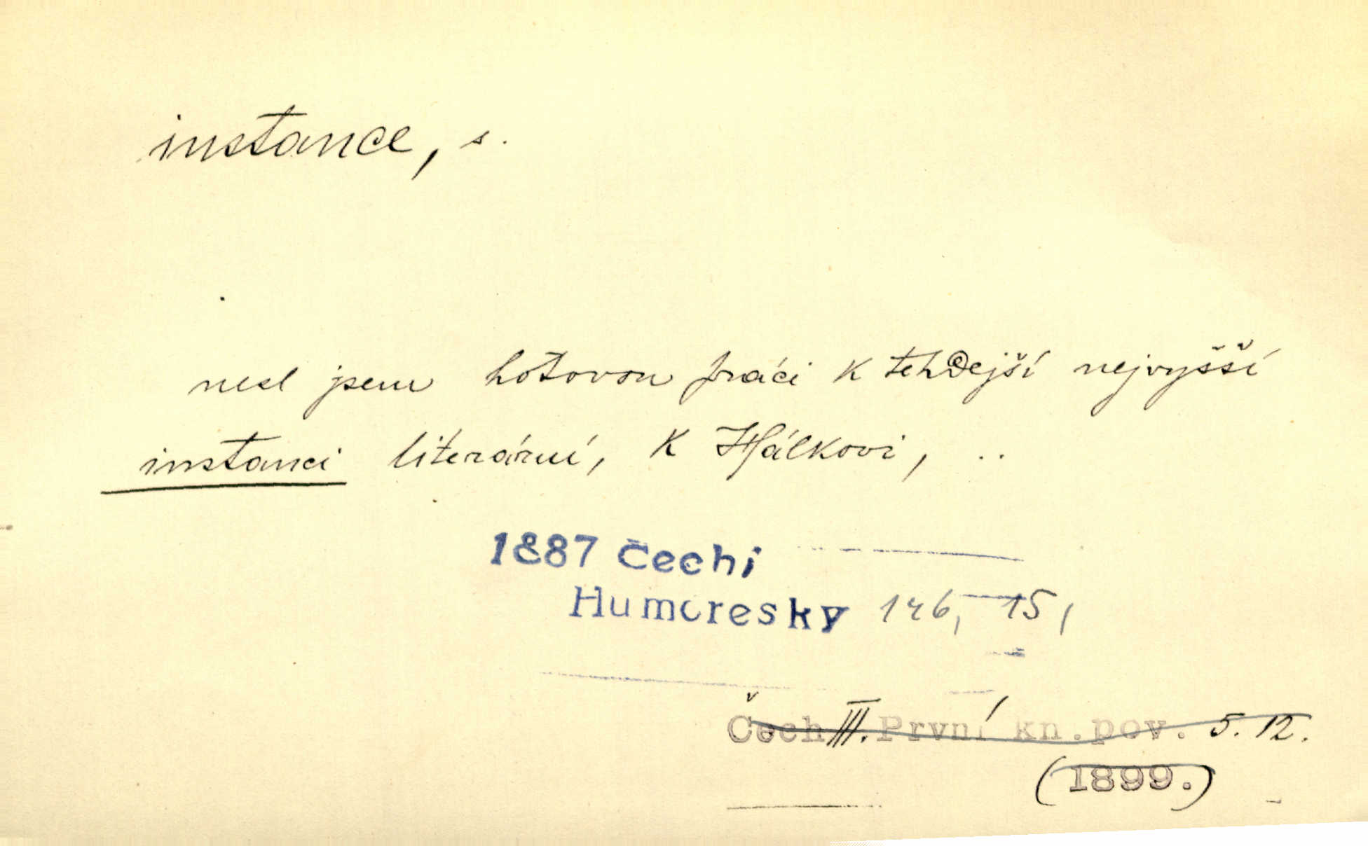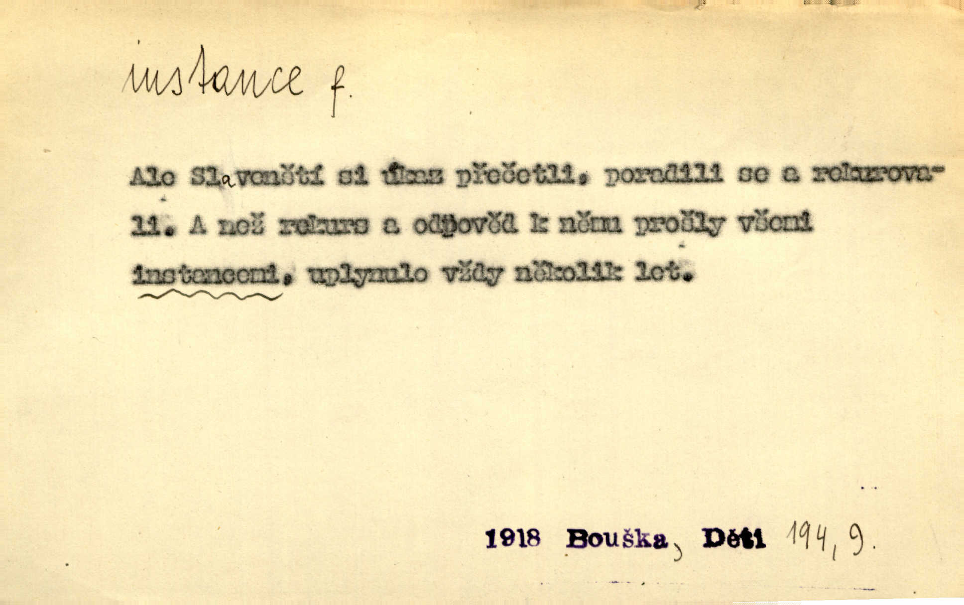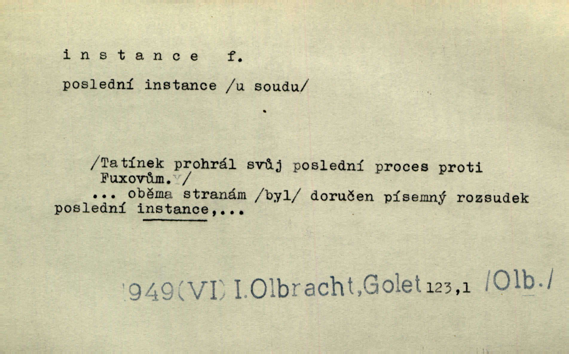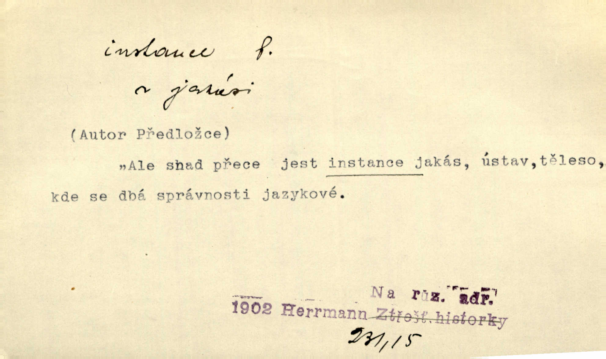 - instance, -e f. práv. stolice, úřad jistého stupně. První až třetí soudní instance. Vyhrál ve všech instancích. Československé státní a jiné veřejné úřady všech instancí (tedy i úřady centrální) korespondují se zastupitelskými úřady Československé republiky v cizině přímo a naopak. Předp. zahr. min. D příslušný úřad. Pro spory zaměstnanců se zaměstnavateli jsou instancí soudy pracovní. D rozhodující činitel, autorita. Ale snad přece jest instance jakás, ústav, těleso, kde se dbá správnosti lazykové. Herrm. Jevová skutečnost a její konformita jest poslední rozhodčí instance vědecká. Šal. Nesl jsem práci k tehdejší nejvyšší instanci literární, k Hálkovi. Čech.