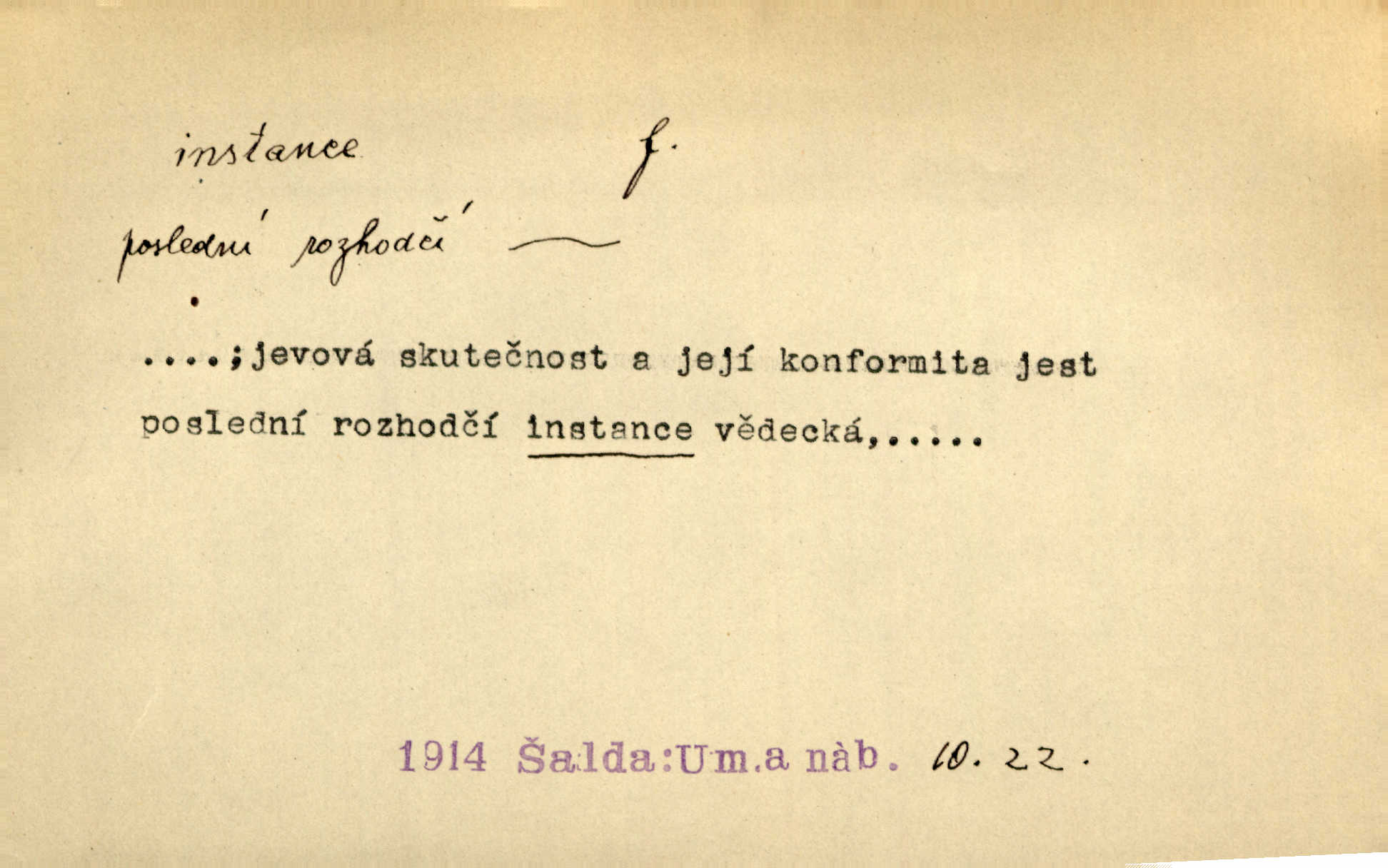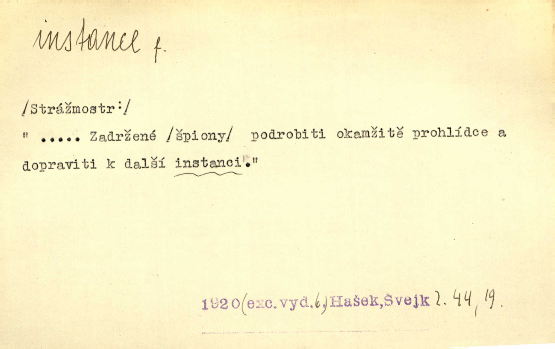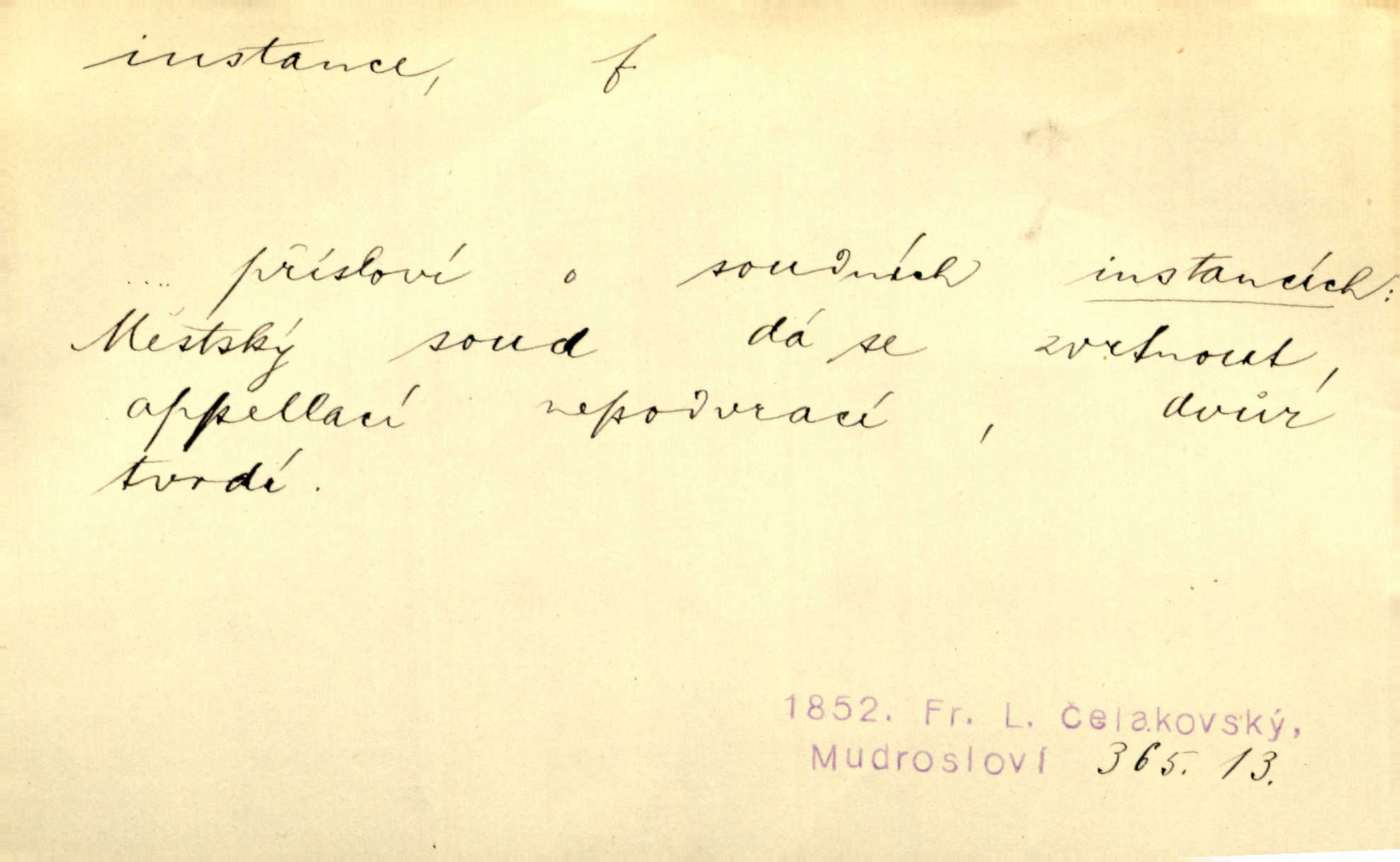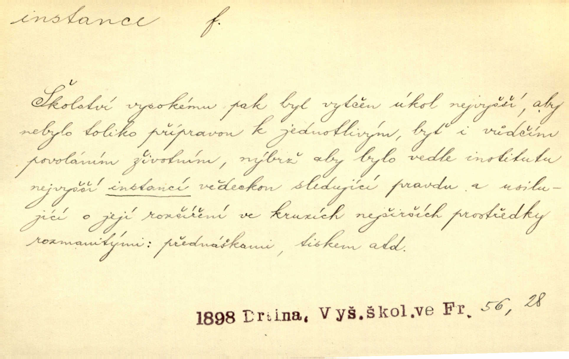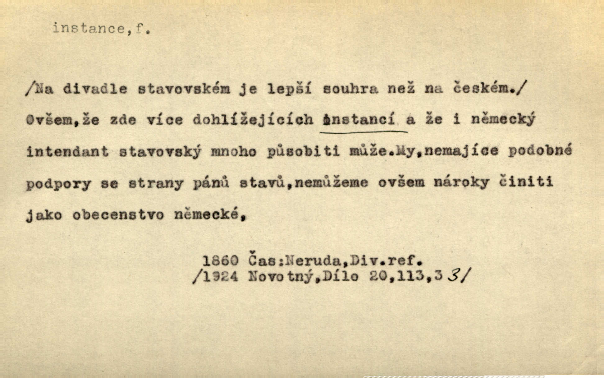 - instance, -e f. práv. stolice, úřad jistého stupně. První až třetí soudní instance. Vyhrál ve všech instancích. Československé státní a jiné veřejné úřady všech instancí (tedy i úřady centrální) korespondují se zastupitelskými úřady Československé republiky v cizině přímo a naopak. Předp. zahr. min. D příslušný úřad. Pro spory zaměstnanců se zaměstnavateli jsou instancí soudy pracovní. D rozhodující činitel, autorita. Ale snad přece jest instance jakás, ústav, těleso, kde se dbá správnosti lazykové. Herrm. Jevová skutečnost a její konformita jest poslední rozhodčí instance vědecká. Šal. Nesl jsem práci k tehdejší nejvyšší instanci literární, k Hálkovi. Čech.