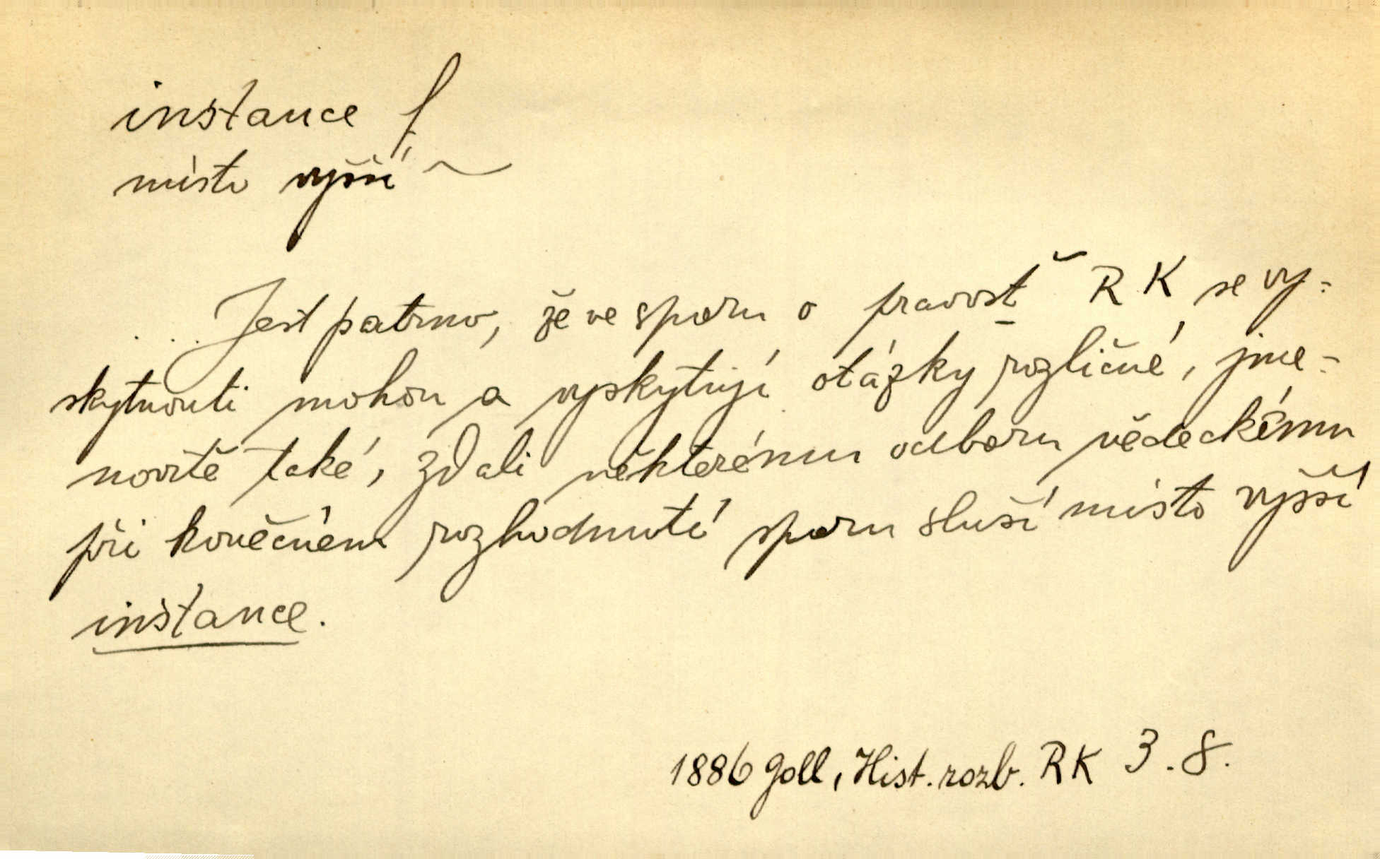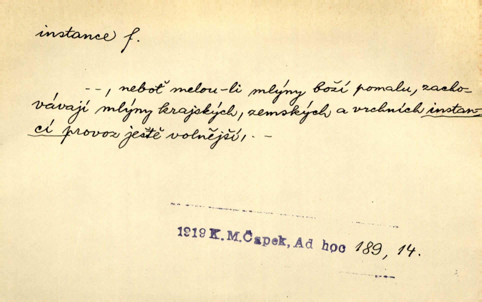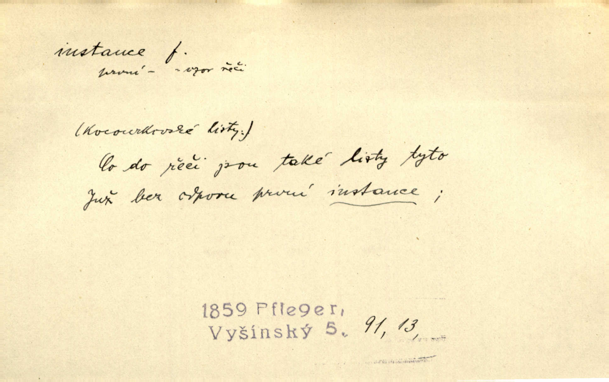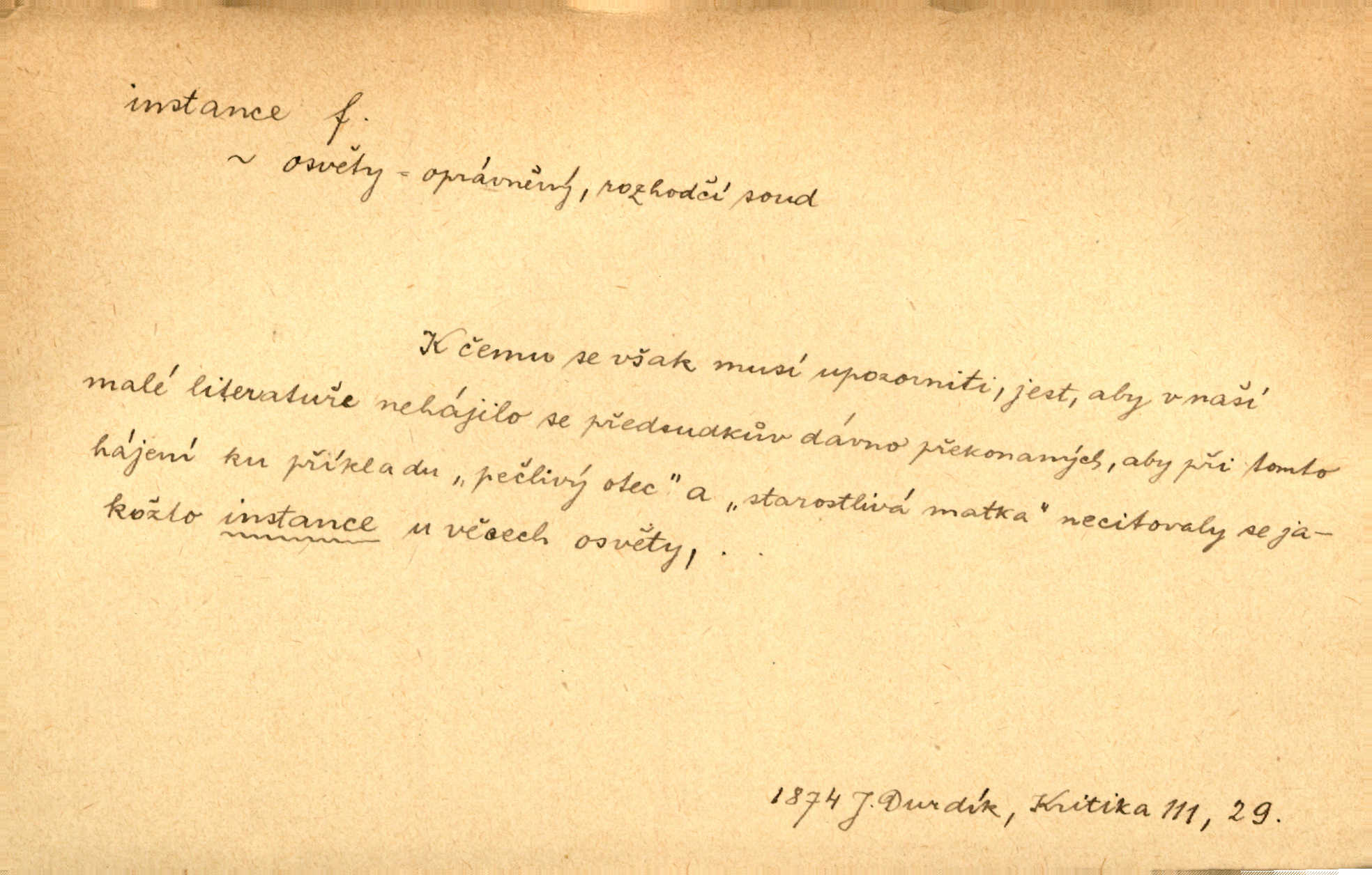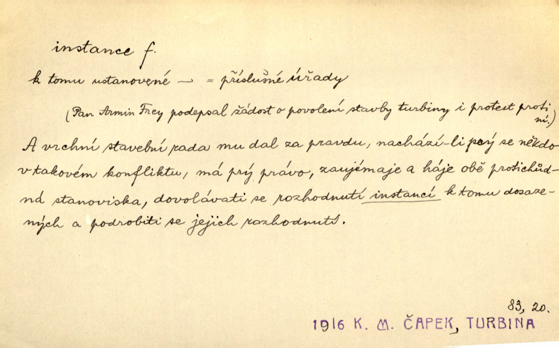 - instance, -e f. práv. stolice, úřad jistého stupně. První až třetí soudní instance. Vyhrál ve všech instancích. Československé státní a jiné veřejné úřady všech instancí (tedy i úřady centrální) korespondují se zastupitelskými úřady Československé republiky v cizině přímo a naopak. Předp. zahr. min. D příslušný úřad. Pro spory zaměstnanců se zaměstnavateli jsou instancí soudy pracovní. D rozhodující činitel, autorita. Ale snad přece jest instance jakás, ústav, těleso, kde se dbá správnosti lazykové. Herrm. Jevová skutečnost a její konformita jest poslední rozhodčí instance vědecká. Šal. Nesl jsem práci k tehdejší nejvyšší instanci literární, k Hálkovi. Čech.