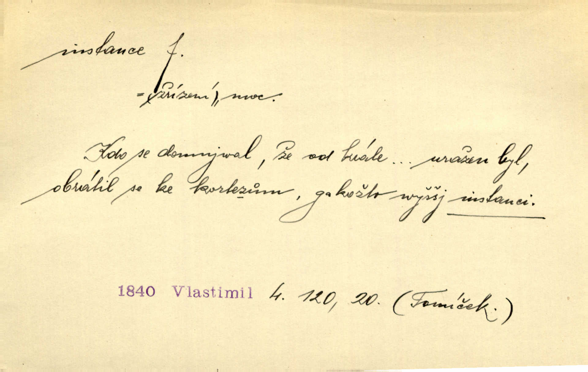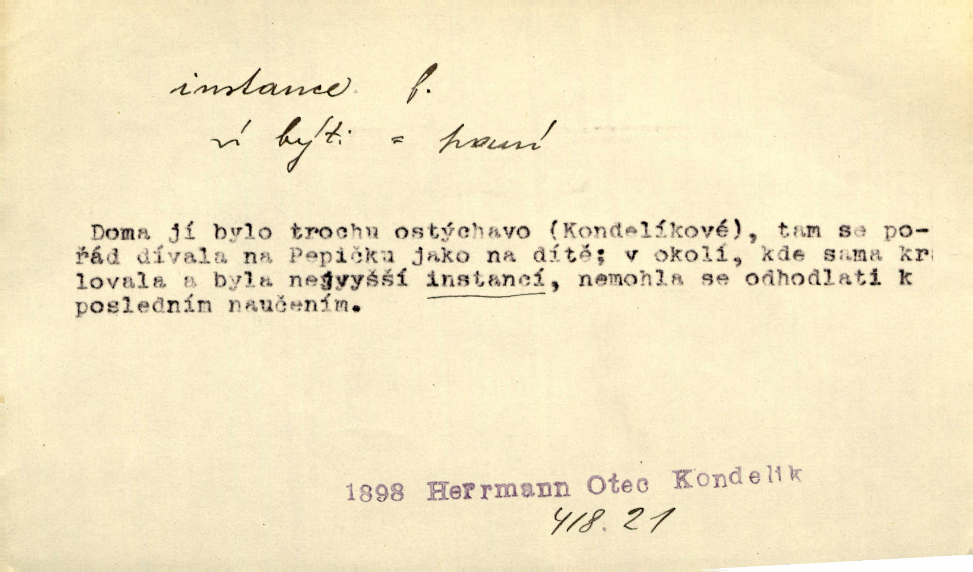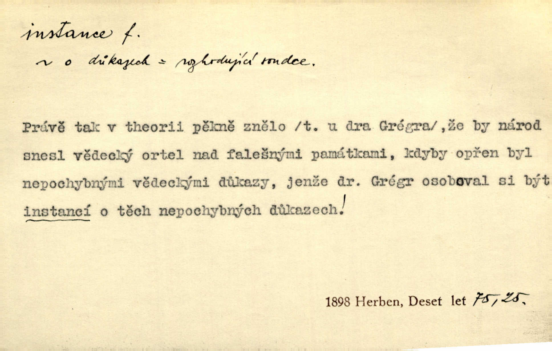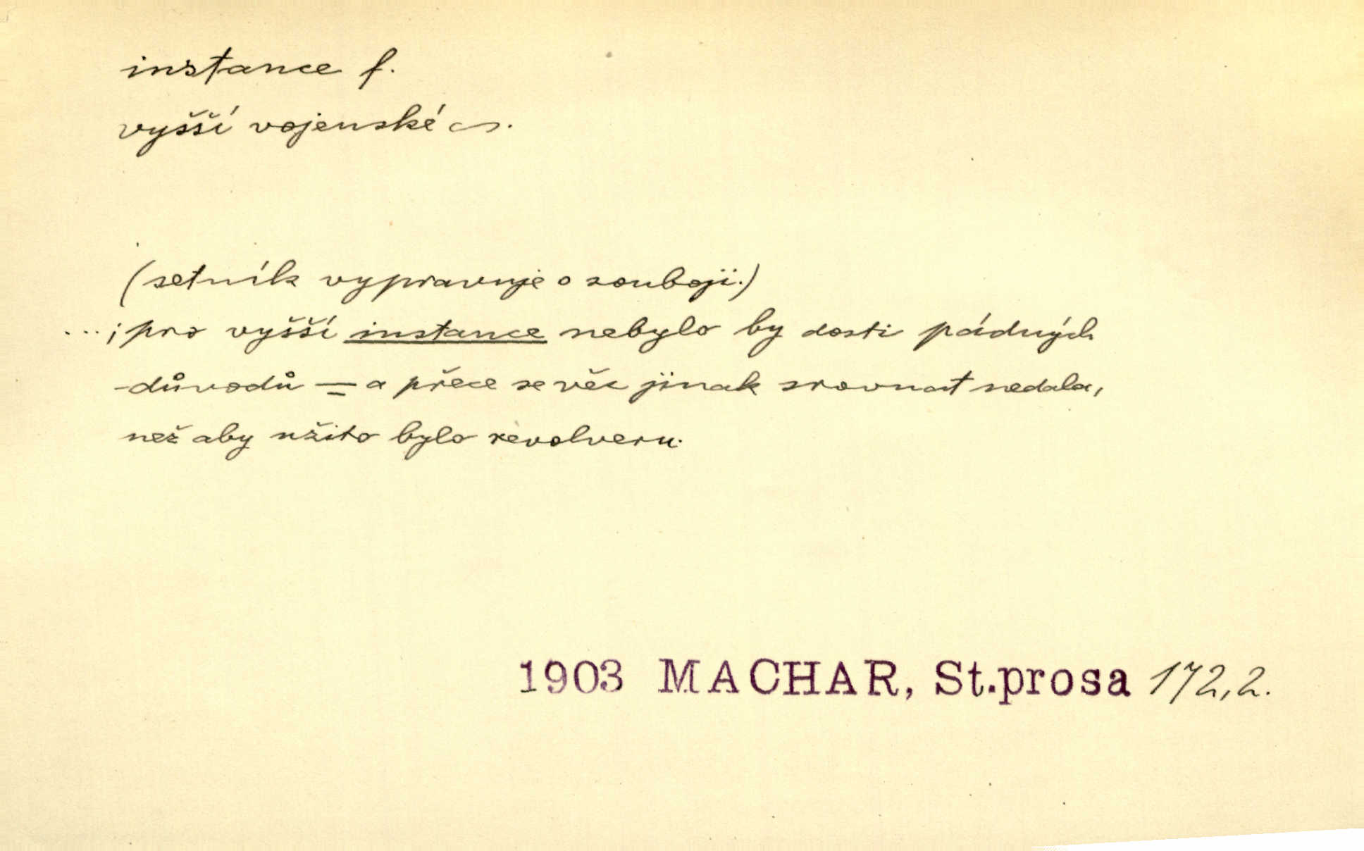 - instance, -e f. práv. stolice, úřad jistého stupně. První až třetí soudní instance. Vyhrál ve všech instancích. Československé státní a jiné veřejné úřady všech instancí (tedy i úřady centrální) korespondují se zastupitelskými úřady Československé republiky v cizině přímo a naopak. Předp. zahr. min. D příslušný úřad. Pro spory zaměstnanců se zaměstnavateli jsou instancí soudy pracovní. D rozhodující činitel, autorita. Ale snad přece jest instance jakás, ústav, těleso, kde se dbá správnosti lazykové. Herrm. Jevová skutečnost a její konformita jest poslední rozhodčí instance vědecká. Šal. Nesl jsem práci k tehdejší nejvyšší instanci literární, k Hálkovi. Čech.