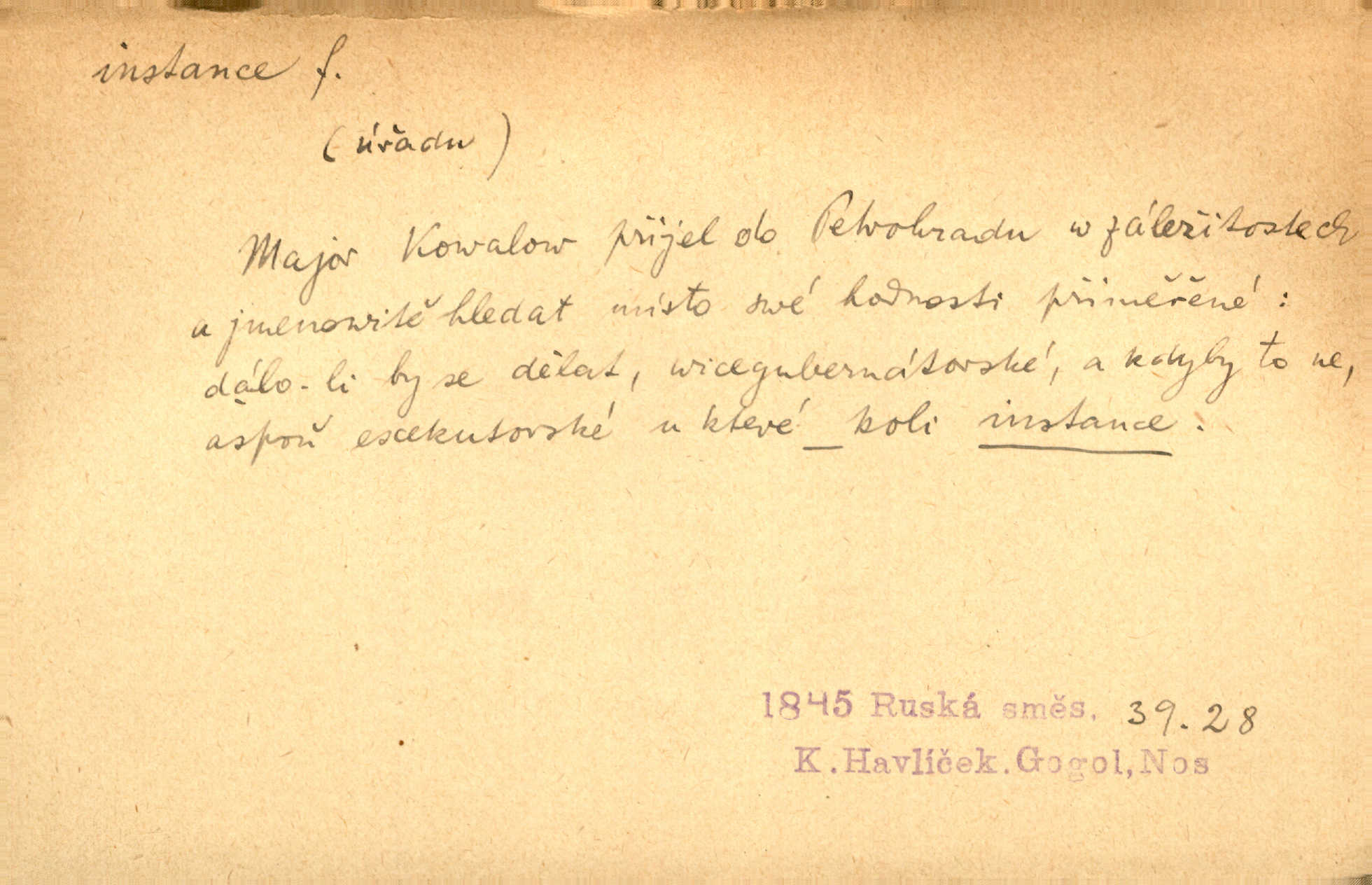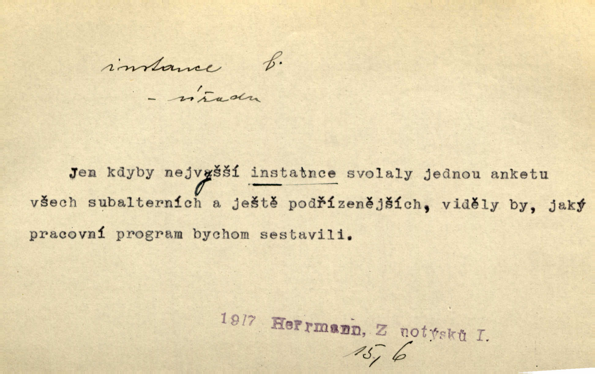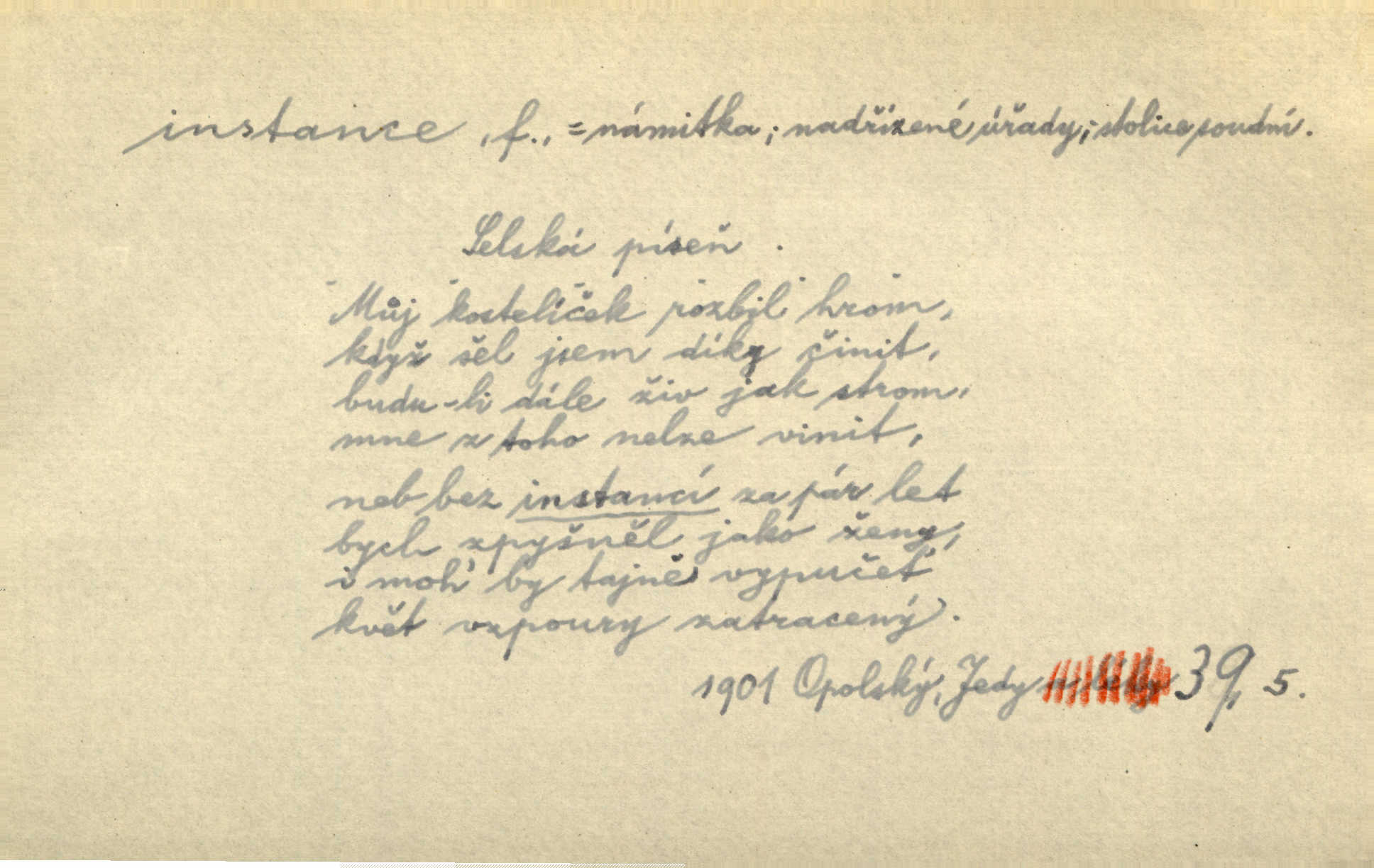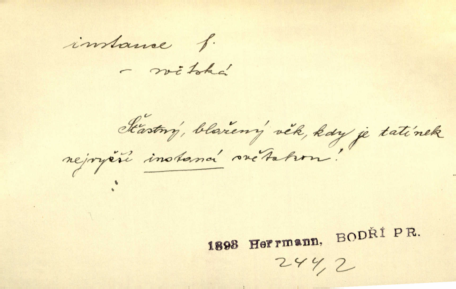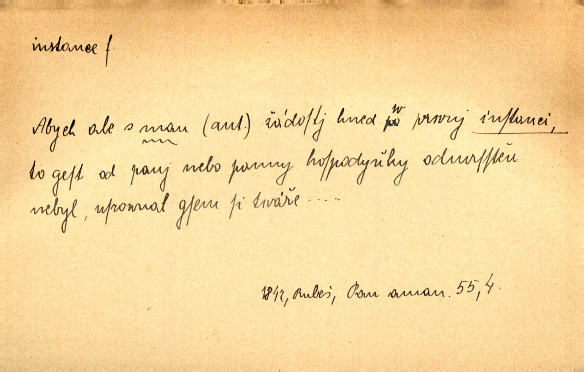 - instance, -e f. práv. stolice, úřad jistého stupně. První až třetí soudní instance. Vyhrál ve všech instancích. Československé státní a jiné veřejné úřady všech instancí (tedy i úřady centrální) korespondují se zastupitelskými úřady Československé republiky v cizině přímo a naopak. Předp. zahr. min. D příslušný úřad. Pro spory zaměstnanců se zaměstnavateli jsou instancí soudy pracovní. D rozhodující činitel, autorita. Ale snad přece jest instance jakás, ústav, těleso, kde se dbá správnosti lazykové. Herrm. Jevová skutečnost a její konformita jest poslední rozhodčí instance vědecká. Šal. Nesl jsem práci k tehdejší nejvyšší instanci literární, k Hálkovi. Čech.