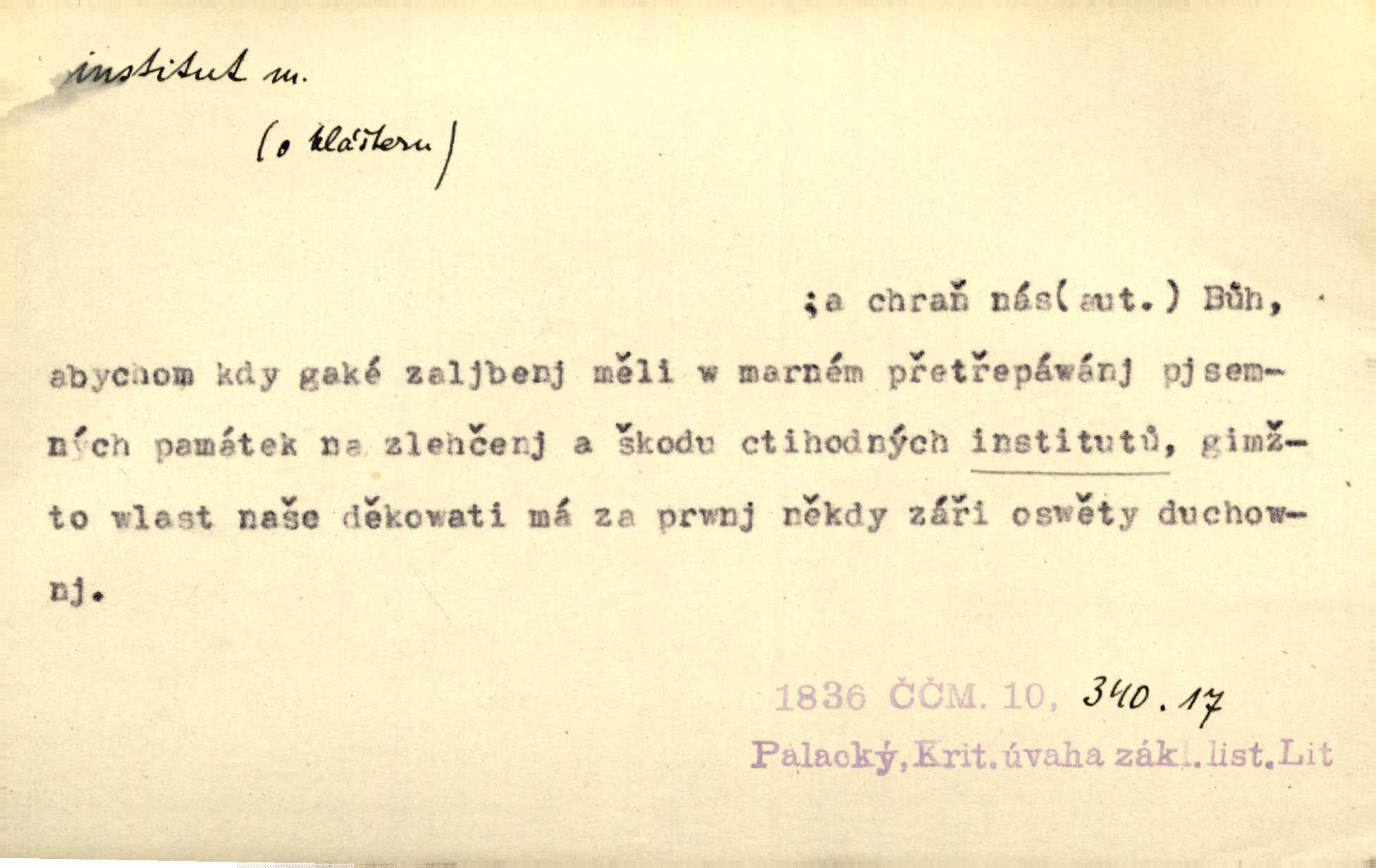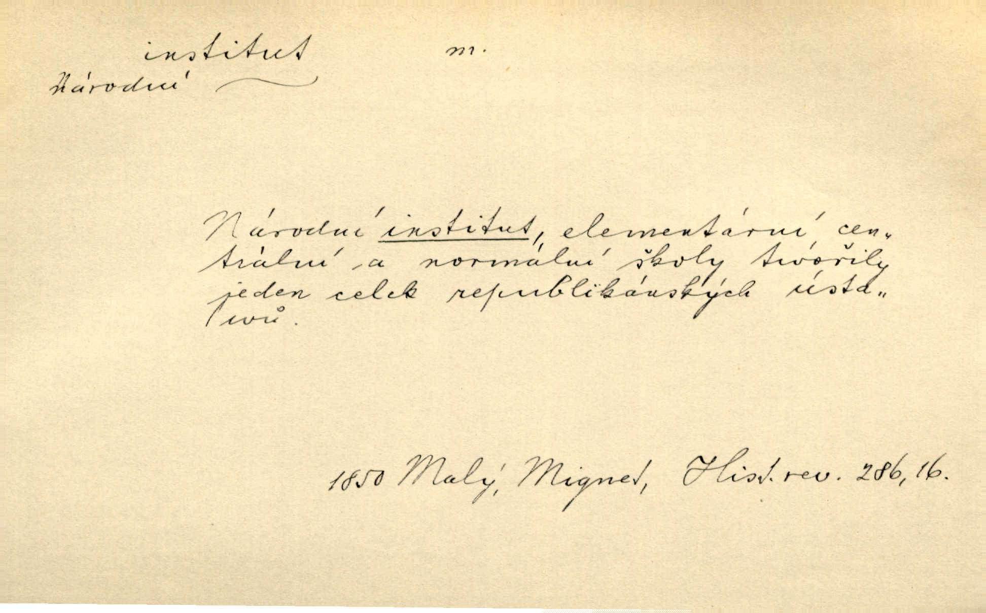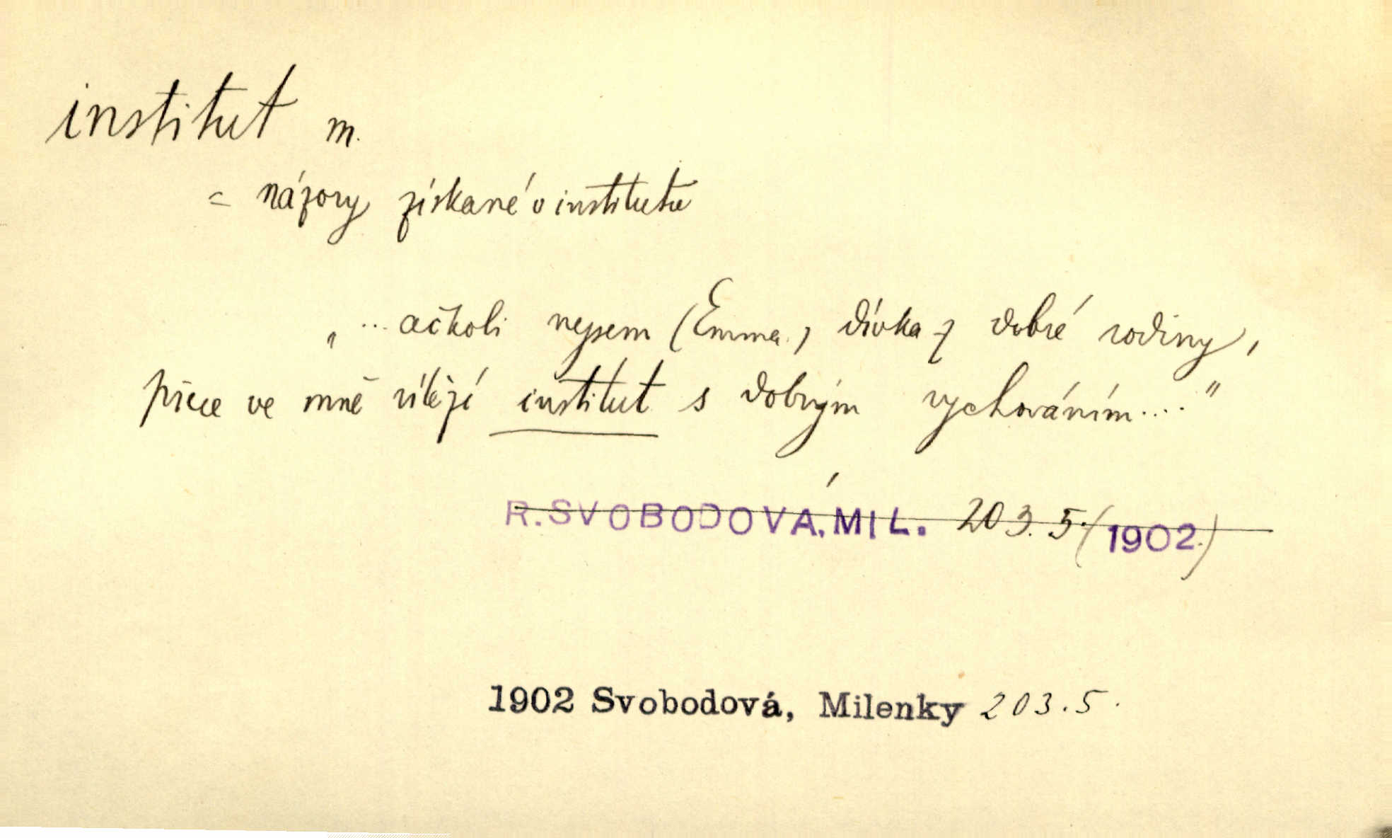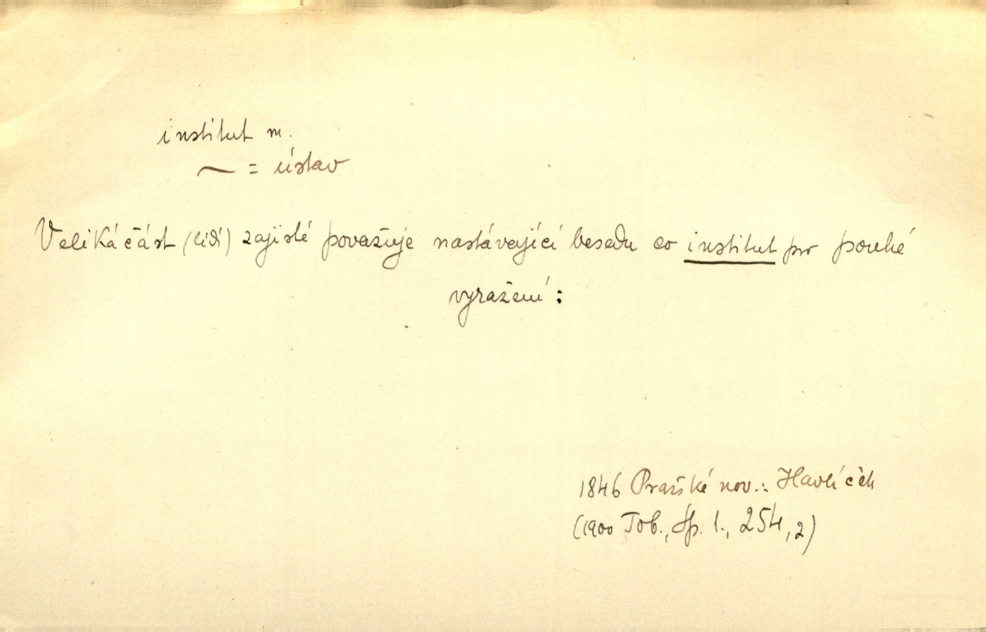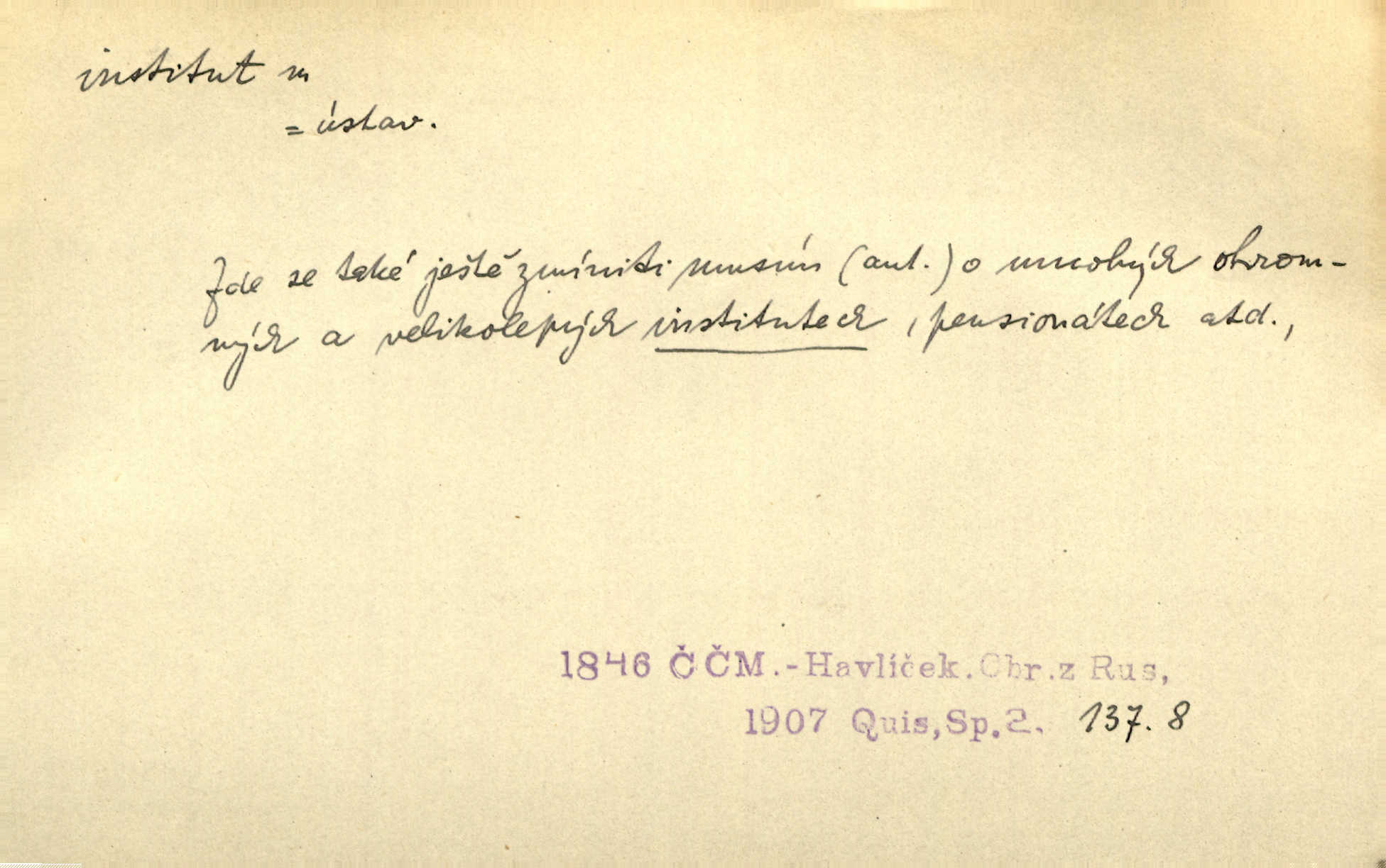 - institut, -u m. ústav, vychovávací a vzdělávací ústav pro dívky (pensionát). Některé německé instituty, pensiony, kláštery českými žáky a žačkami oplývají. Rais. Dcery vrátily se z institutu a [na plese] rozpačitě i mdle se usmívaly. Kun. D ústav vědecký. Byly smluveny už tehdy přípravy k Slovanskému institutu v Paříži. Beneš. V činnost institutu [Institut de France] skládány slibné naděje. Drt. D Práv. souhrn ustanovení vztahujících se k některému oboru právnímu. [Rossin] rozeznává právo schvalovací přesně od práva dozoru jako institut samostatný. Havel.