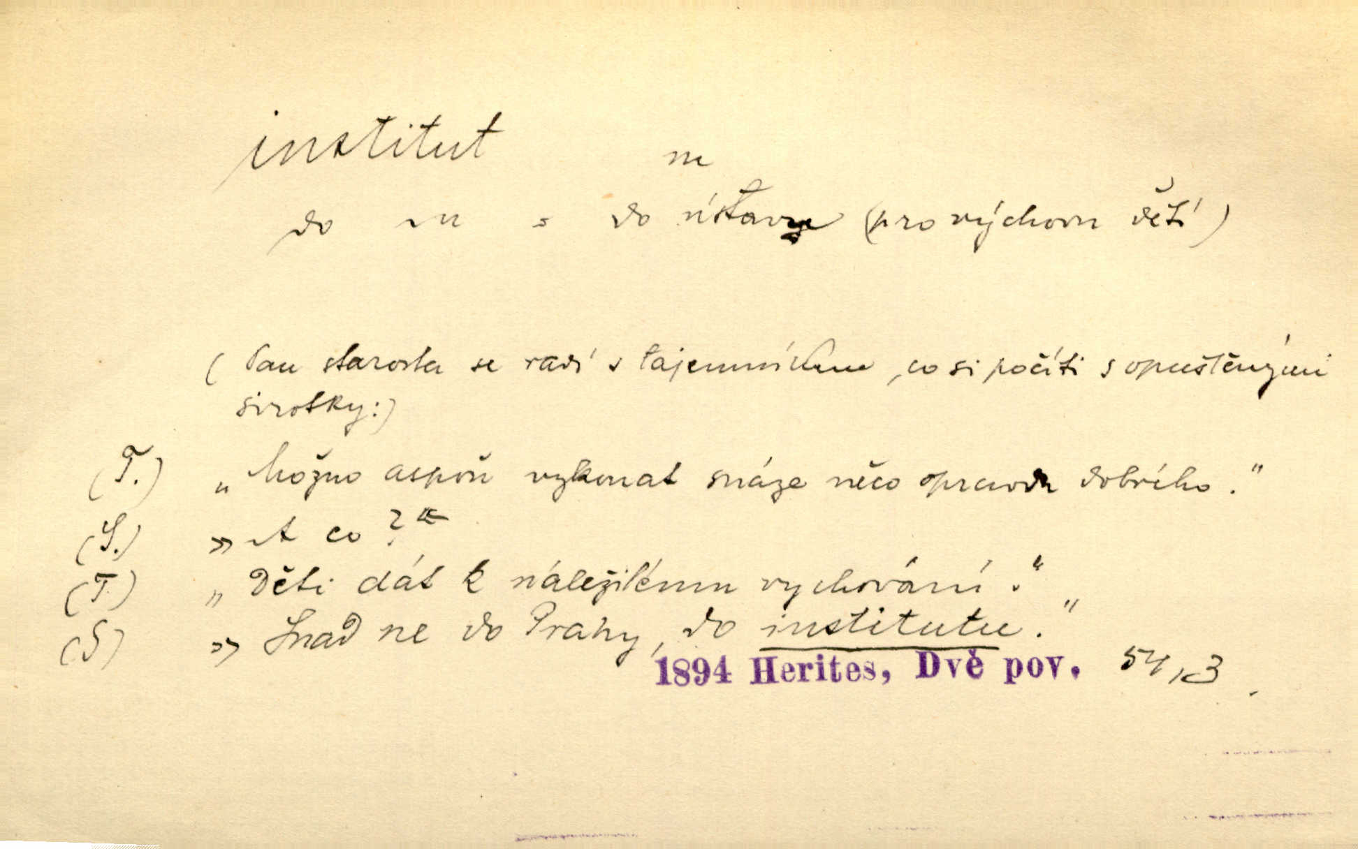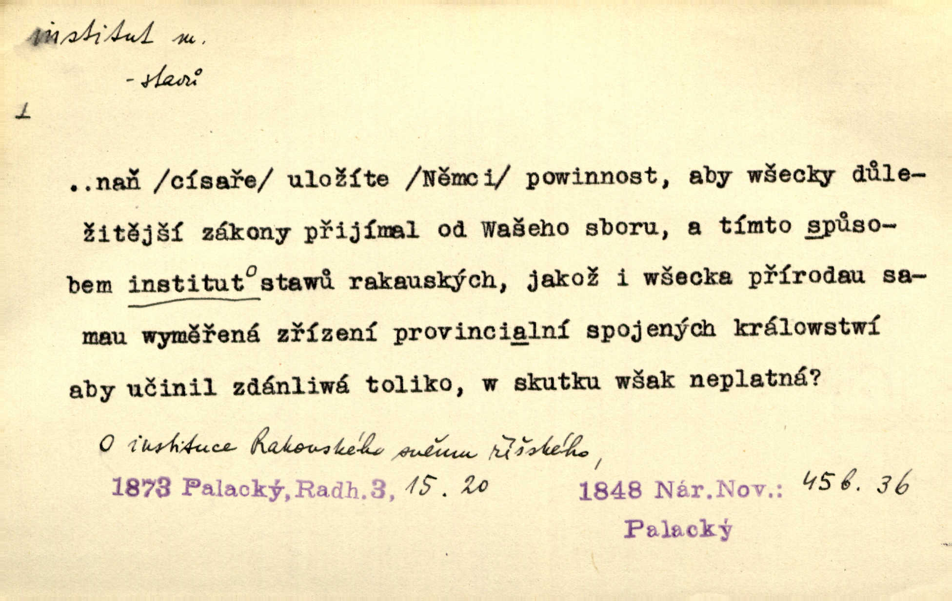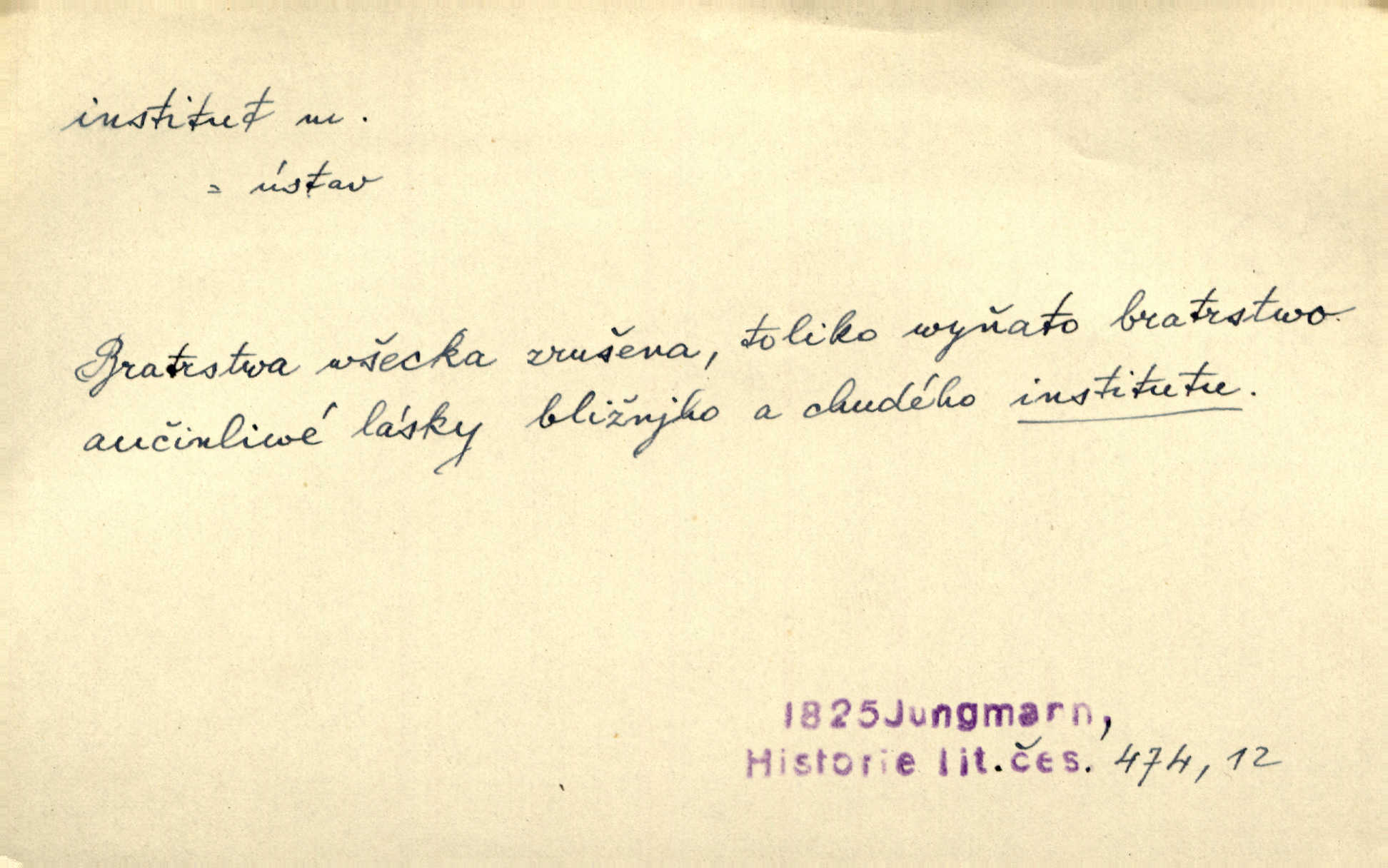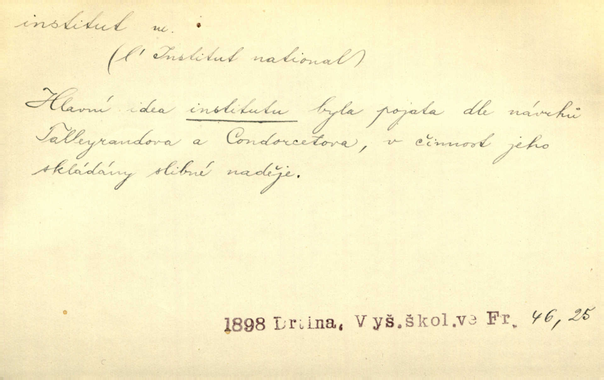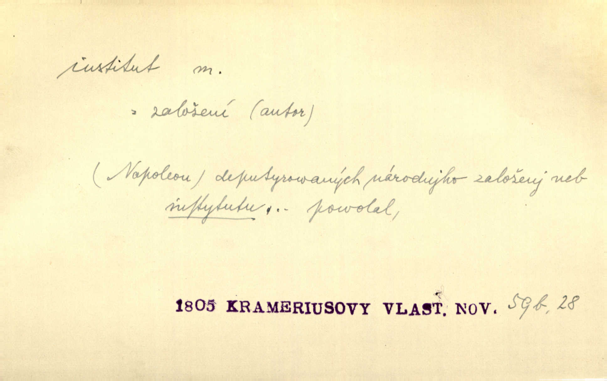 - institut, -u m. ústav, vychovávací a vzdělávací ústav pro dívky (pensionát). Některé německé instituty, pensiony, kláštery českými žáky a žačkami oplývají. Rais. Dcery vrátily se z institutu a [na plese] rozpačitě i mdle se usmívaly. Kun. D ústav vědecký. Byly smluveny už tehdy přípravy k Slovanskému institutu v Paříži. Beneš. V činnost institutu [Institut de France] skládány slibné naděje. Drt. D Práv. souhrn ustanovení vztahujících se k některému oboru právnímu. [Rossin] rozeznává právo schvalovací přesně od práva dozoru jako institut samostatný. Havel.