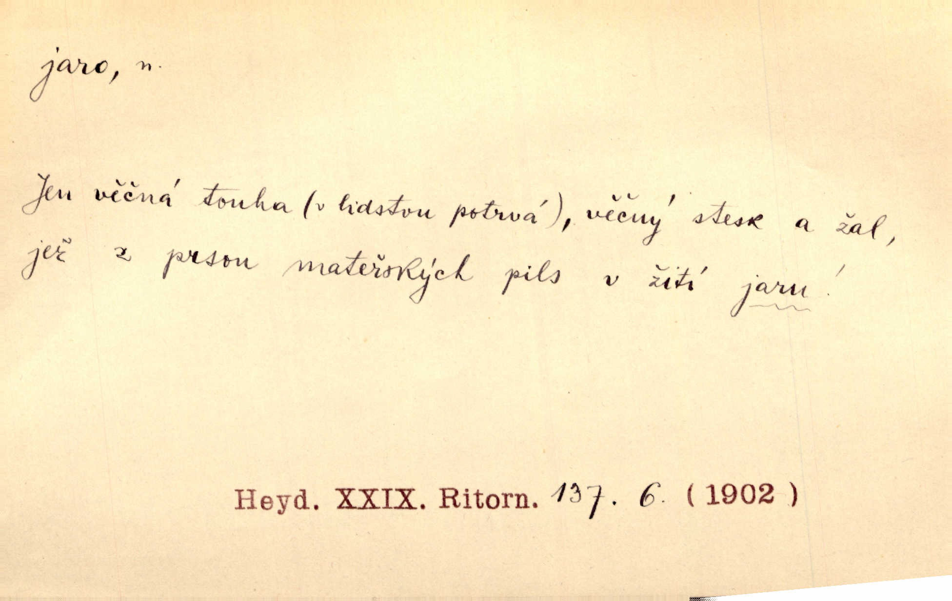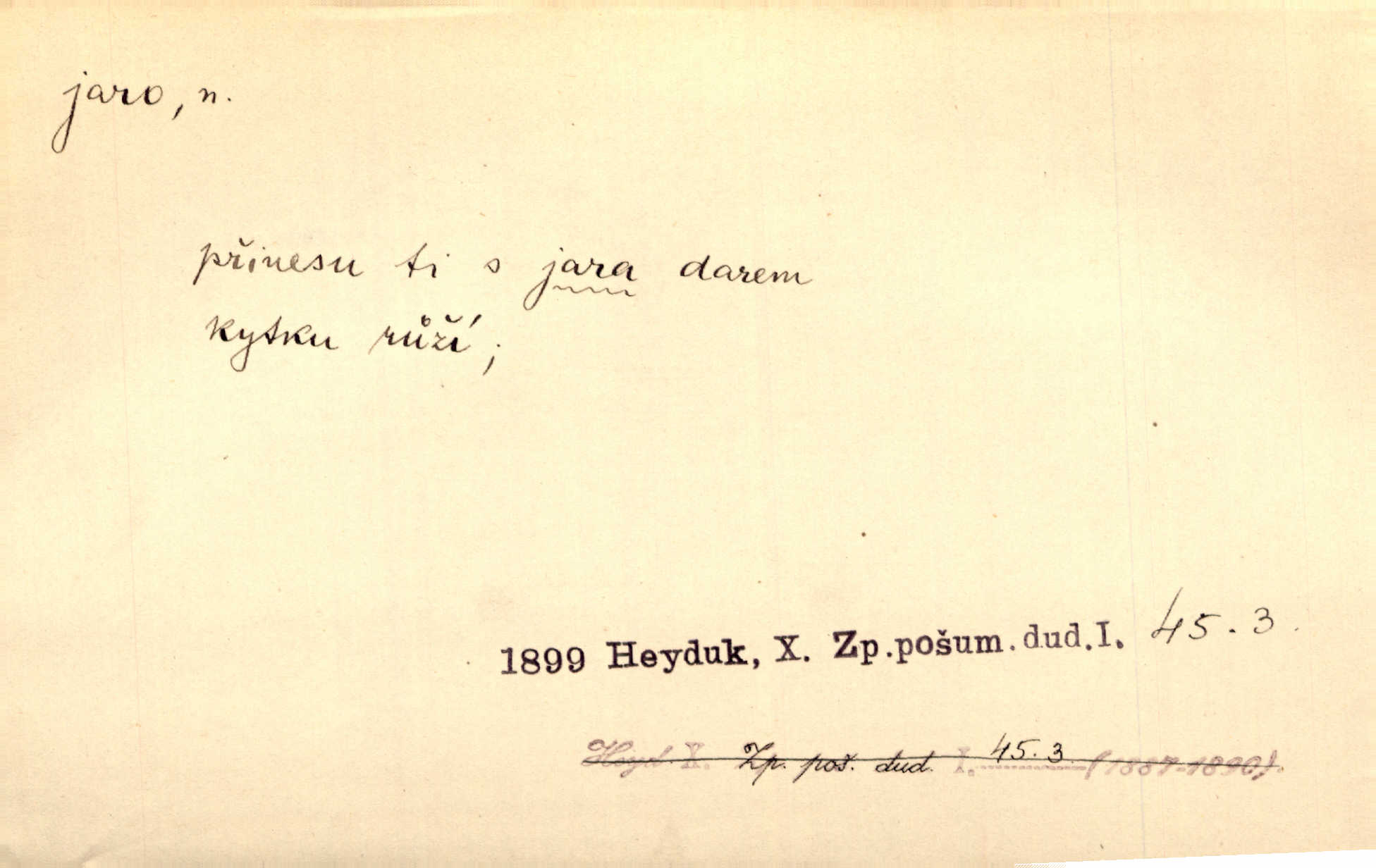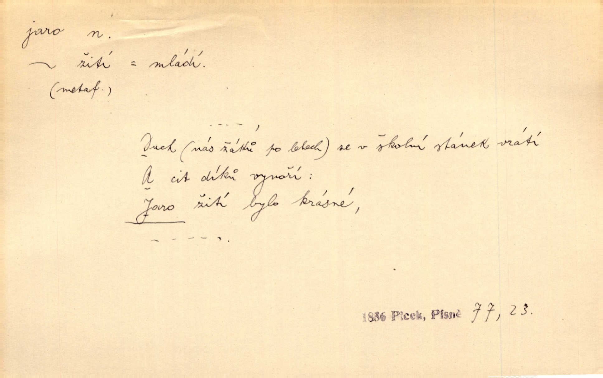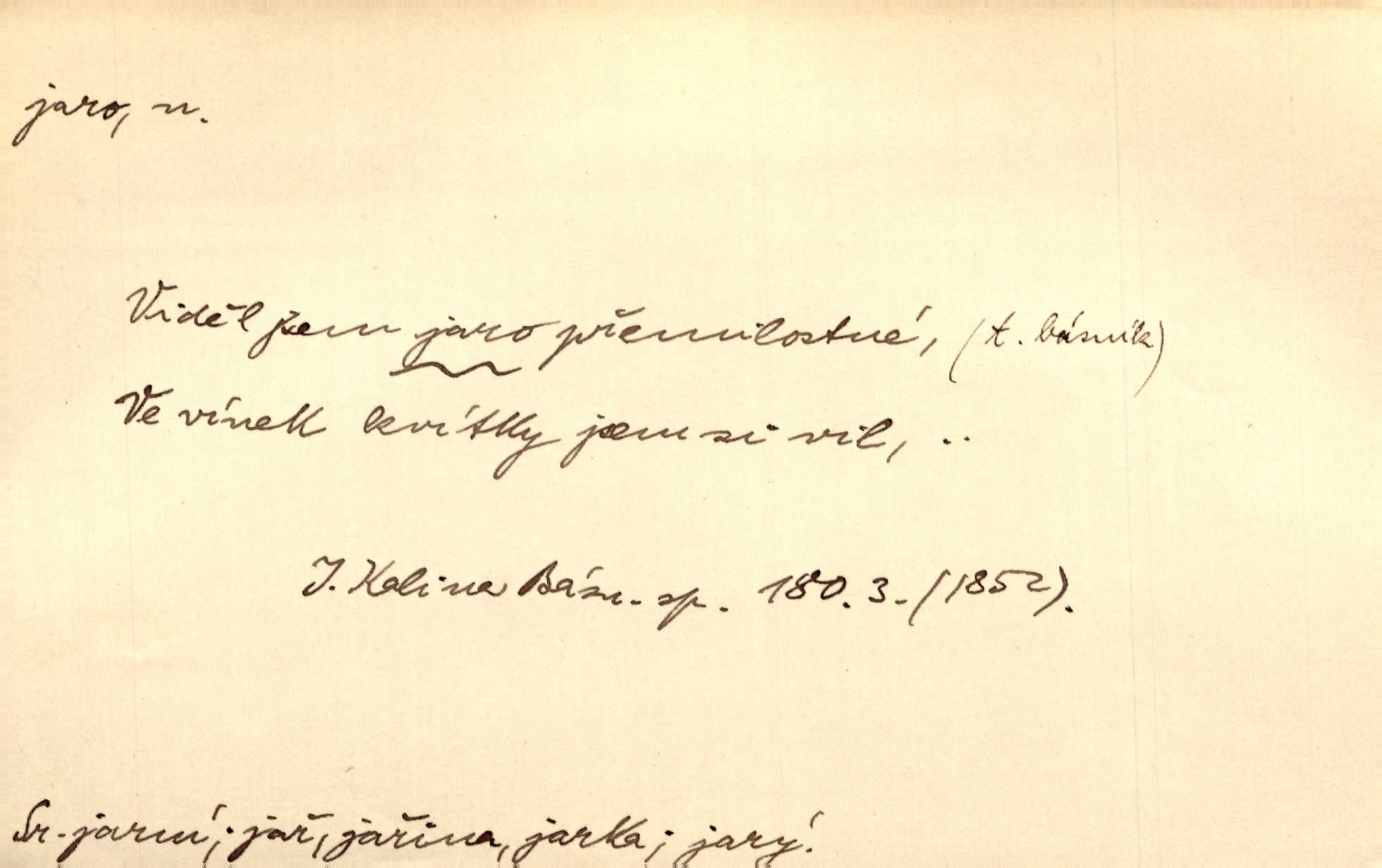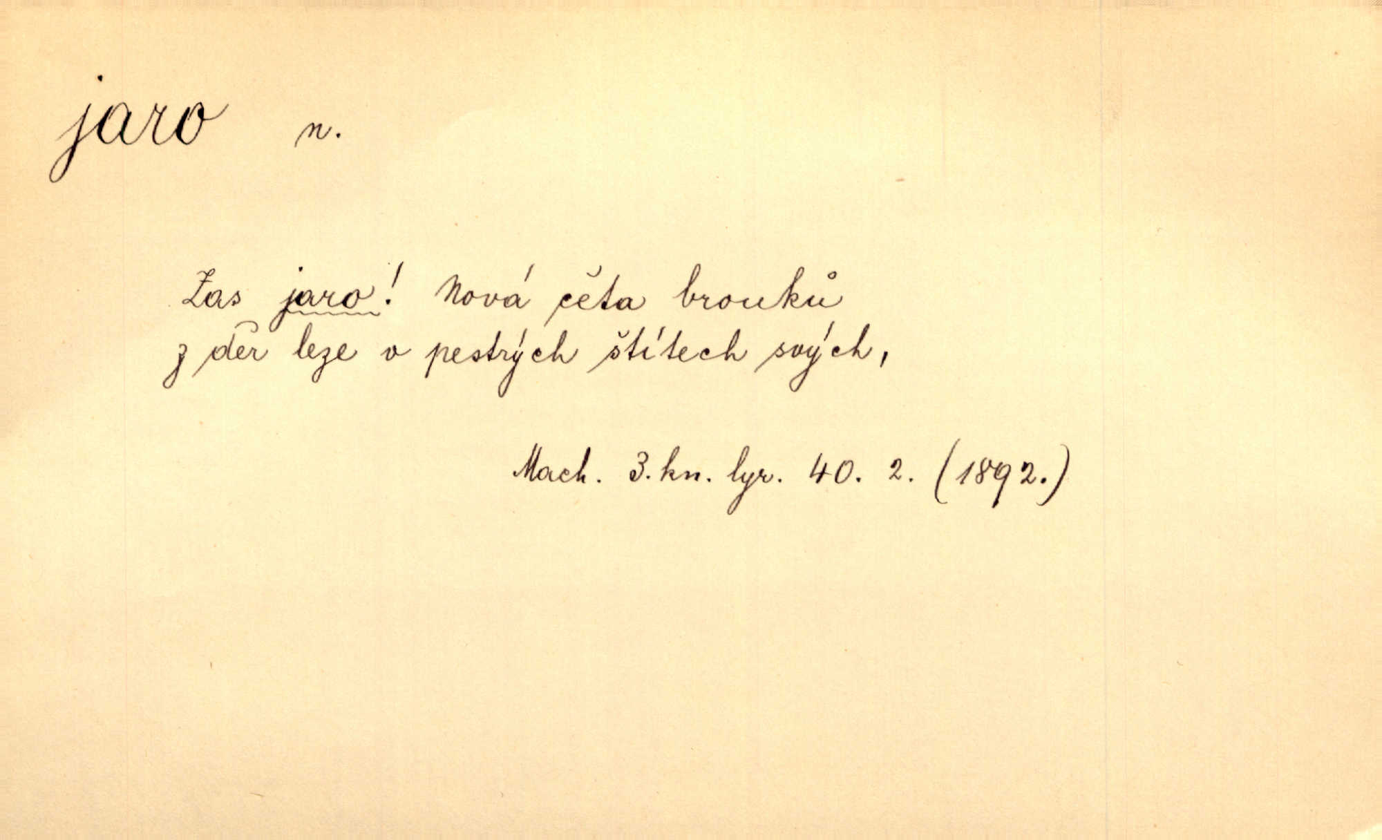 - jaro, -a n. část kalendářního roku od 21. března do 21. června. Jaro se otvíralo — práce volala hospodáře do polí. Baar. Na jaře, z jara, k jaru atd. Jedna vlaštovka jara nedělá z jednoho případu není radno soudit. Přísl. Krajina na Bretonově plátně jak v jeho verších směje se jarem. Vrch. Přen. Bylo mu, jako by jaro v sobě cítil měl jasnou náladu. Zey. V očích spanilé hospodyňky zrcadlilo se věčné jaro radosti a lásky. Šmil. Teď v srdci pusto — tenkrát jaro lásky. Hál. Do jara mých illusí a fantasií zavál náhle mrazivý dech. Šub. Jaro bujných nadějí v bujném srdci. Svět. Z nového myšlenkového jara i nový skutečný život se vyvine. Sab. Národ, dokud vůbec žije, je schopen více jar. Ner. To nové skvělé jaro mého národa. Podl. Jaro lidstva. Vrch. Jaro druhého manželství. Mrš. Krásné mládí, jaro života. Zey. D mládí. Šťastný byl věk jata mého. Tyl. Dívka, obestřená všemi půvaby a kouzly ženského jara. Herrm. Uvadlá kráska ve všech koutech kryje uvadlé květy, památky svých jar mladých let. Mach. D rok života. Dámy mezi šestnáctým a dvacátým jarem. Ner. Ačkoli zažila na třicet jar, přece posud byla svěží. Svob. Již je tomu hezká řada jar. Mach.