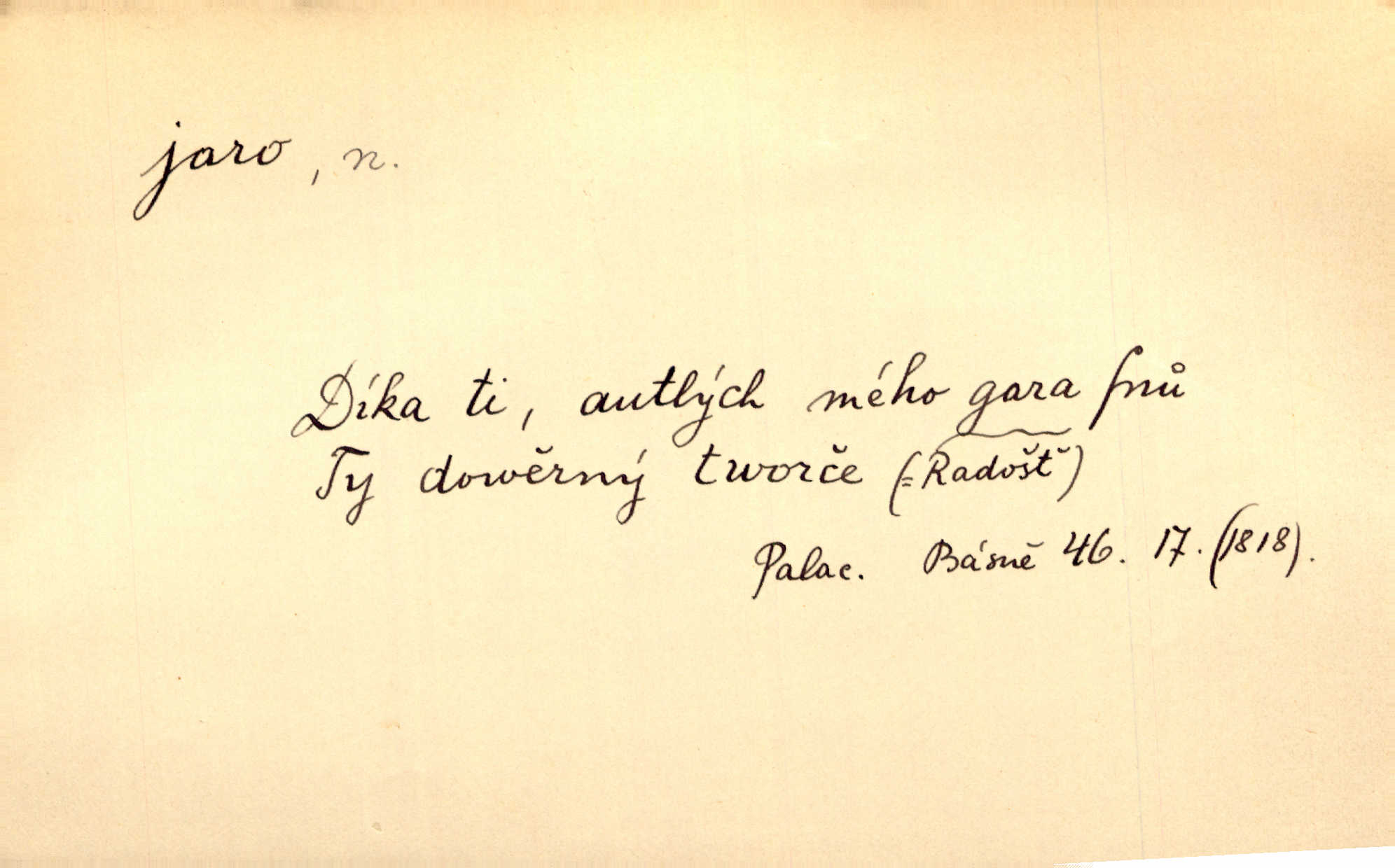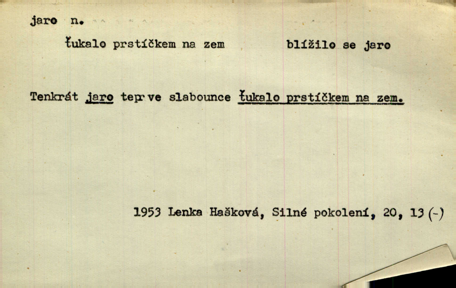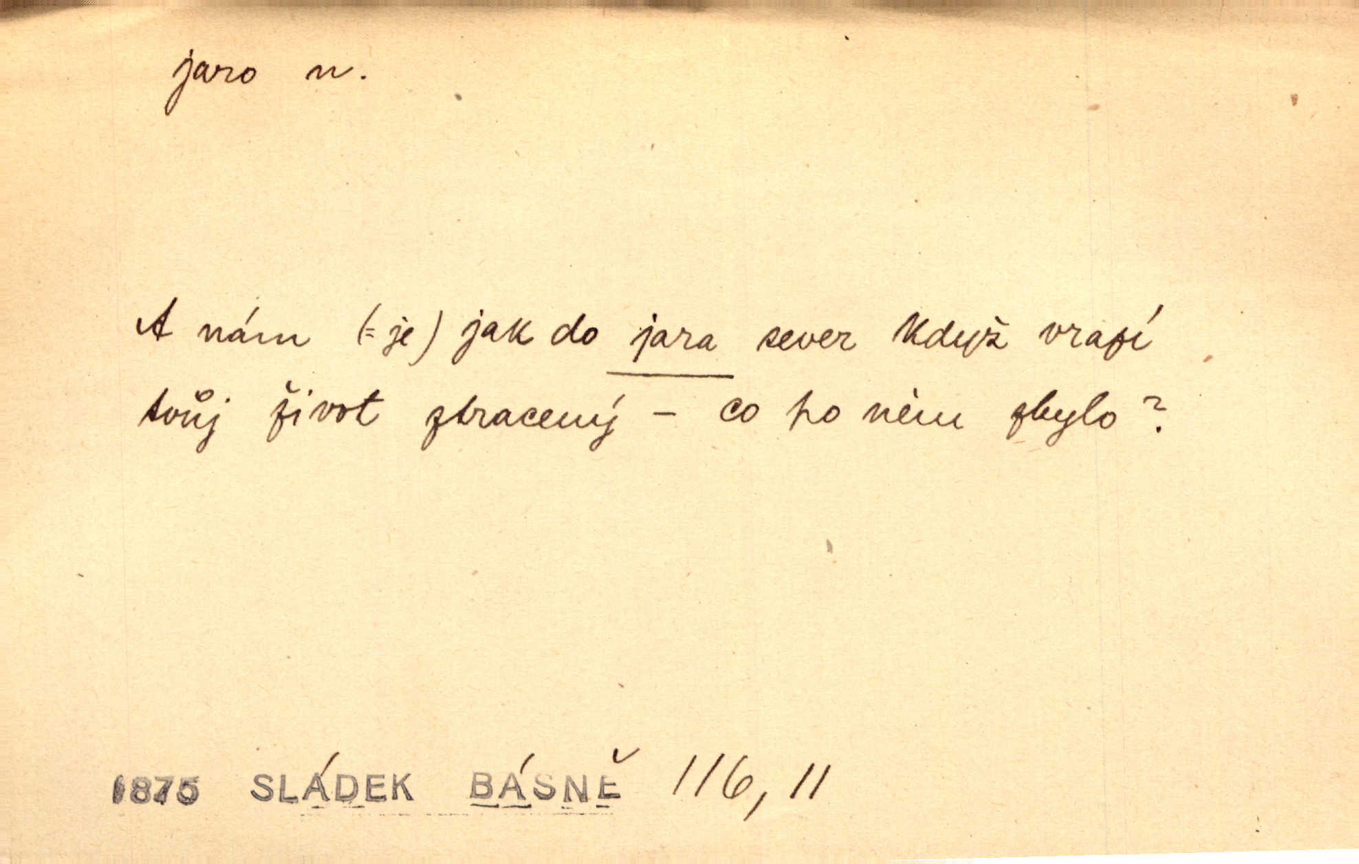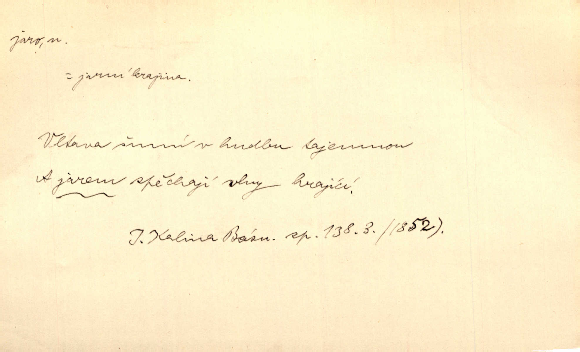 - jaro, -a n. část kalendářního roku od 21. března do 21. června. Jaro se otvíralo — práce volala hospodáře do polí. Baar. Na jaře, z jara, k jaru atd. Jedna vlaštovka jara nedělá z jednoho případu není radno soudit. Přísl. Krajina na Bretonově plátně jak v jeho verších směje se jarem. Vrch. Přen. Bylo mu, jako by jaro v sobě cítil měl jasnou náladu. Zey. V očích spanilé hospodyňky zrcadlilo se věčné jaro radosti a lásky. Šmil. Teď v srdci pusto — tenkrát jaro lásky. Hál. Do jara mých illusí a fantasií zavál náhle mrazivý dech. Šub. Jaro bujných nadějí v bujném srdci. Svět. Z nového myšlenkového jara i nový skutečný život se vyvine. Sab. Národ, dokud vůbec žije, je schopen více jar. Ner. To nové skvělé jaro mého národa. Podl. Jaro lidstva. Vrch. Jaro druhého manželství. Mrš. Krásné mládí, jaro života. Zey. D mládí. Šťastný byl věk jata mého. Tyl. Dívka, obestřená všemi půvaby a kouzly ženského jara. Herrm. Uvadlá kráska ve všech koutech kryje uvadlé květy, památky svých jar mladých let. Mach. D rok života. Dámy mezi šestnáctým a dvacátým jarem. Ner. Ačkoli zažila na třicet jar, přece posud byla svěží. Svob. Již je tomu hezká řada jar. Mach.