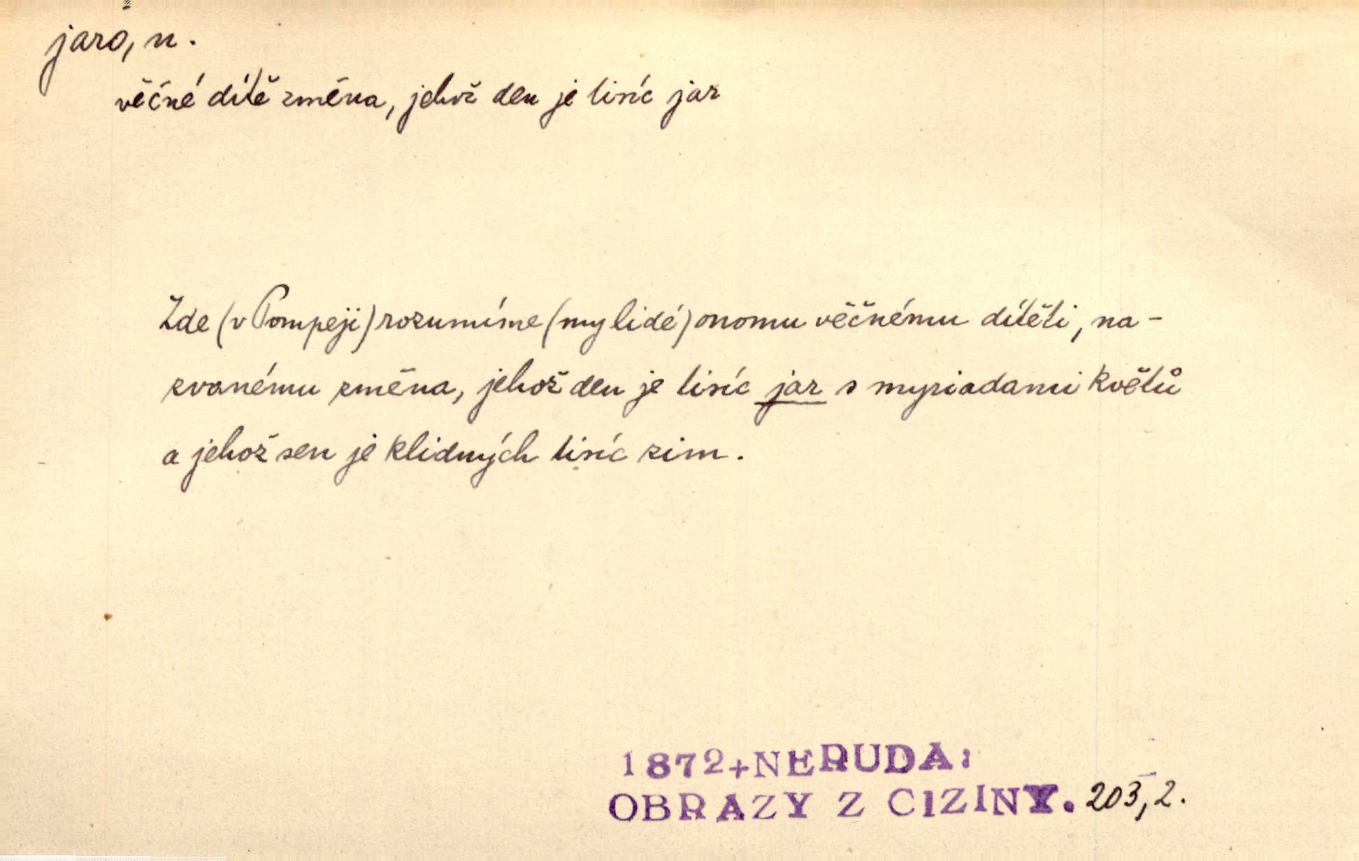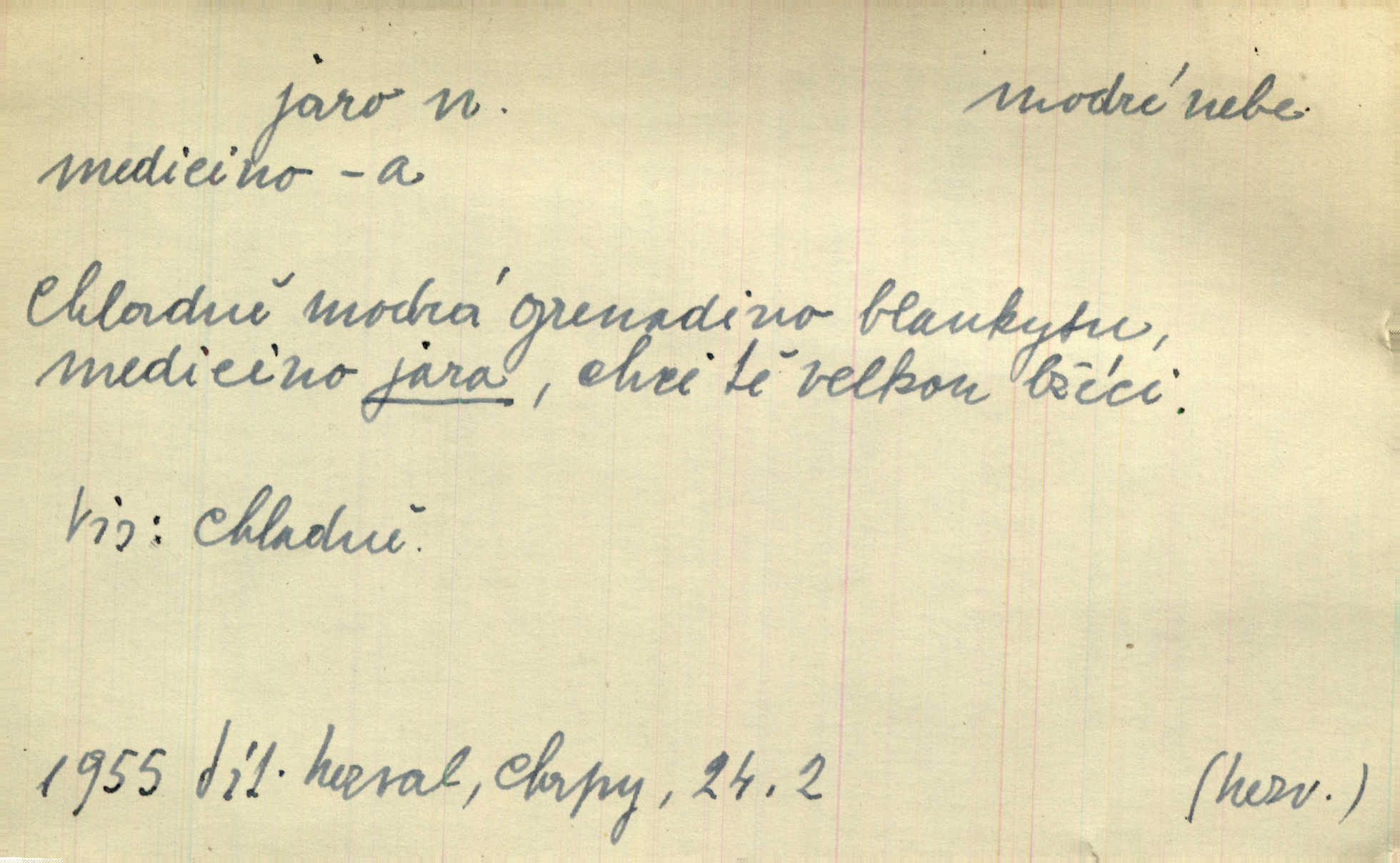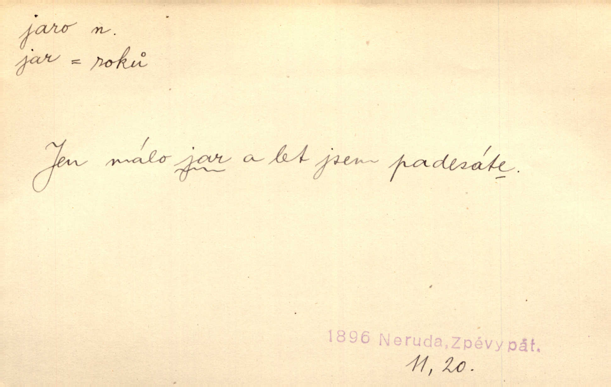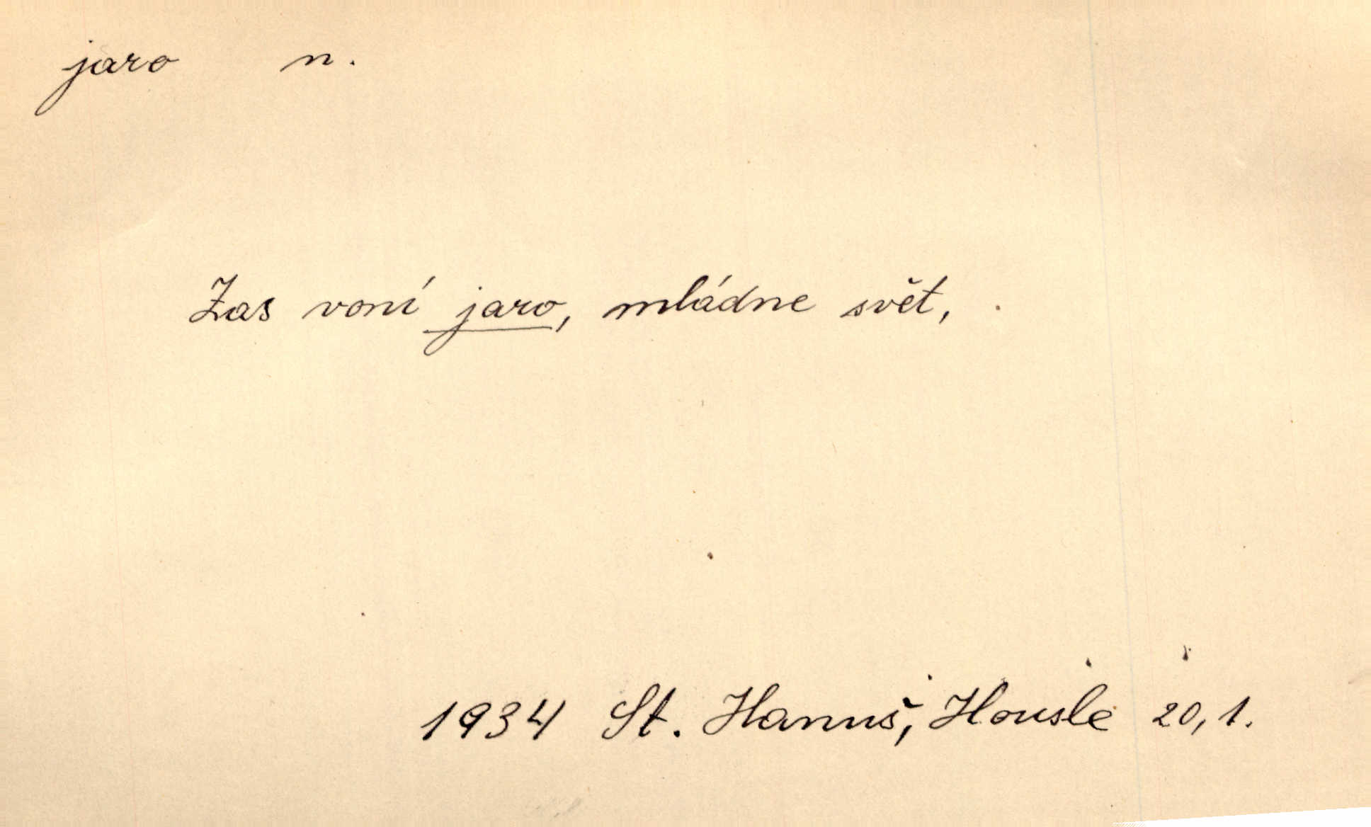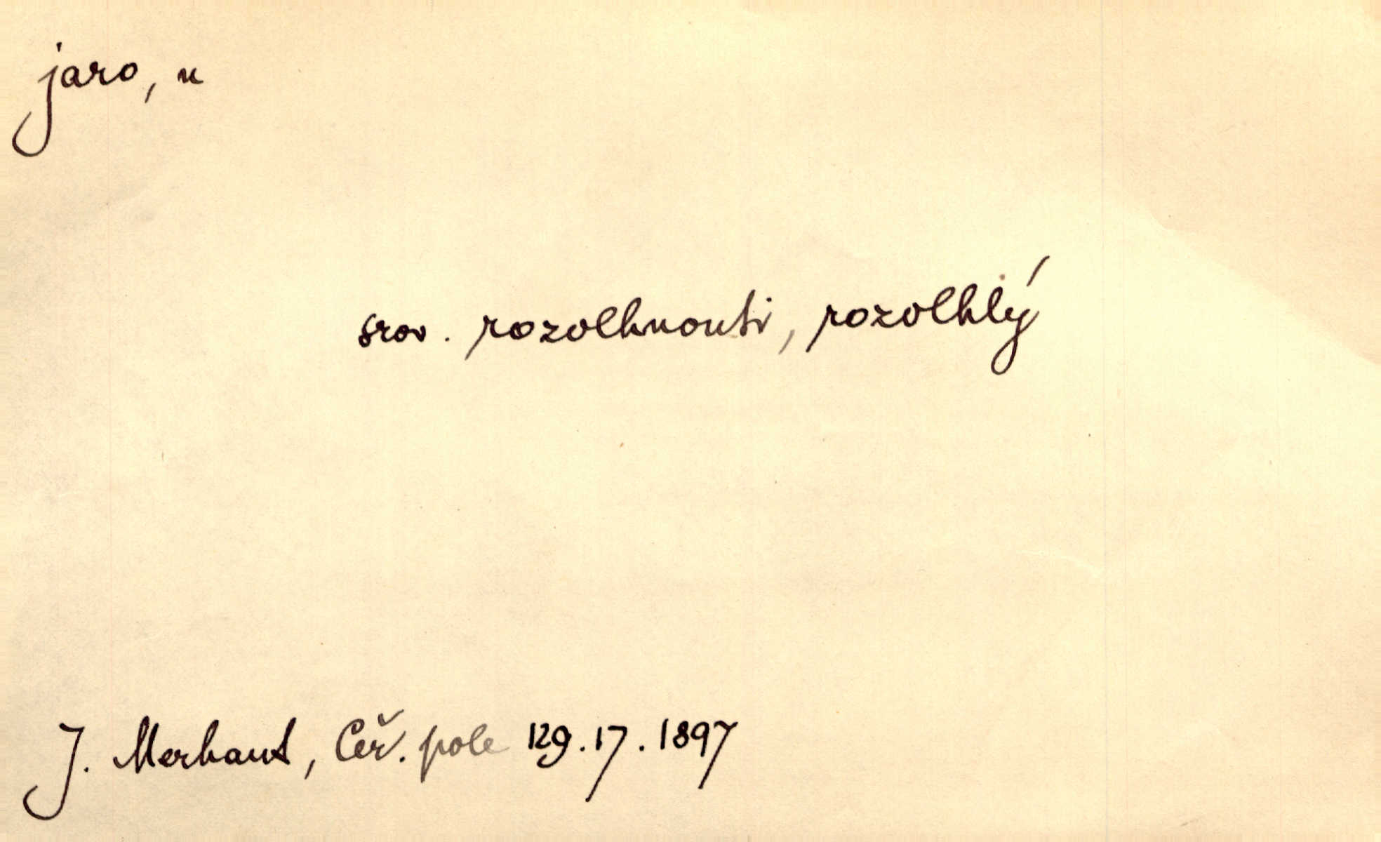 - jaro, -a n. část kalendářního roku od 21. března do 21. června. Jaro se otvíralo — práce volala hospodáře do polí. Baar. Na jaře, z jara, k jaru atd. Jedna vlaštovka jara nedělá z jednoho případu není radno soudit. Přísl. Krajina na Bretonově plátně jak v jeho verších směje se jarem. Vrch. Přen. Bylo mu, jako by jaro v sobě cítil měl jasnou náladu. Zey. V očích spanilé hospodyňky zrcadlilo se věčné jaro radosti a lásky. Šmil. Teď v srdci pusto — tenkrát jaro lásky. Hál. Do jara mých illusí a fantasií zavál náhle mrazivý dech. Šub. Jaro bujných nadějí v bujném srdci. Svět. Z nového myšlenkového jara i nový skutečný život se vyvine. Sab. Národ, dokud vůbec žije, je schopen více jar. Ner. To nové skvělé jaro mého národa. Podl. Jaro lidstva. Vrch. Jaro druhého manželství. Mrš. Krásné mládí, jaro života. Zey. D mládí. Šťastný byl věk jata mého. Tyl. Dívka, obestřená všemi půvaby a kouzly ženského jara. Herrm. Uvadlá kráska ve všech koutech kryje uvadlé květy, památky svých jar mladých let. Mach. D rok života. Dámy mezi šestnáctým a dvacátým jarem. Ner. Ačkoli zažila na třicet jar, přece posud byla svěží. Svob. Již je tomu hezká řada jar. Mach.