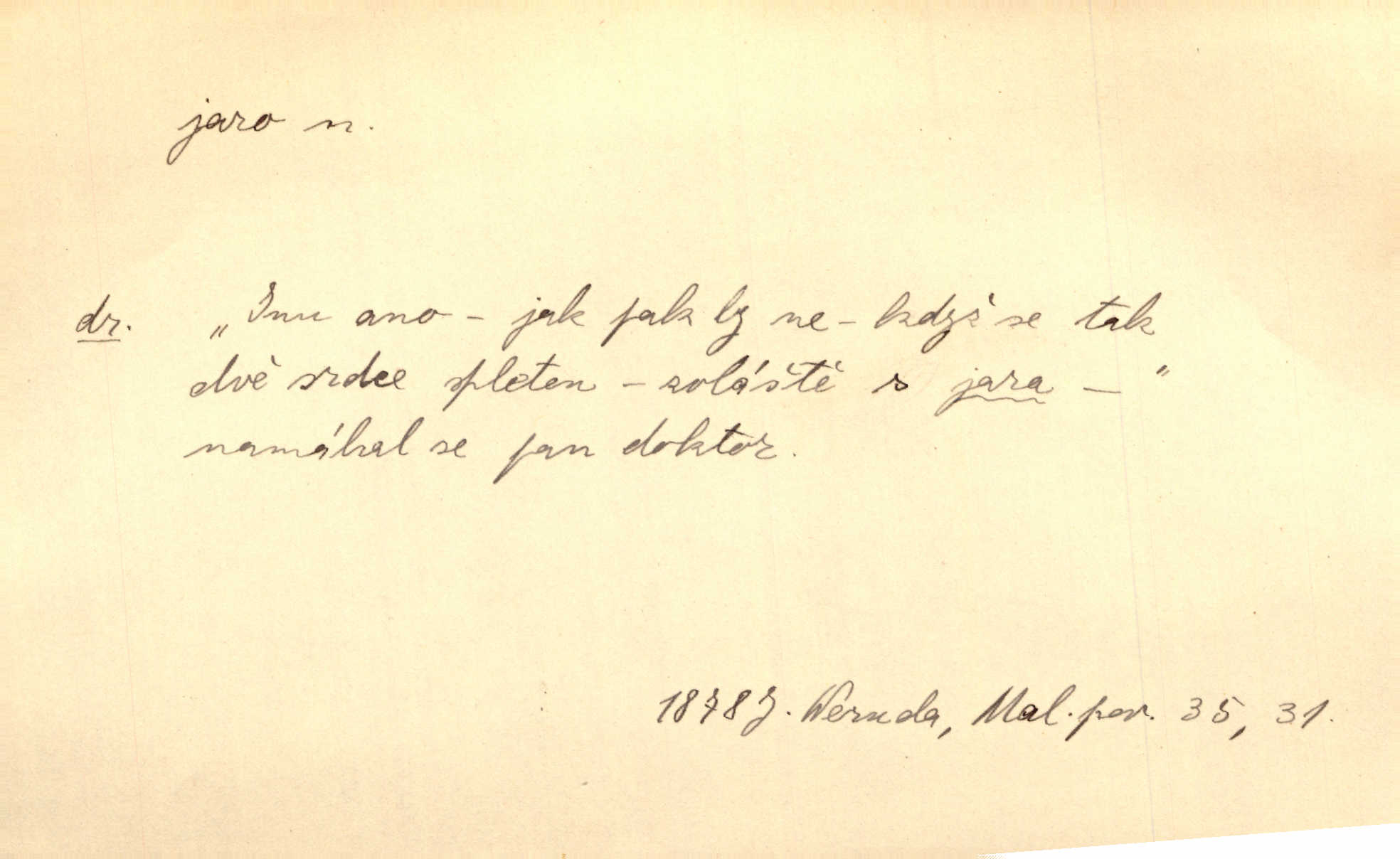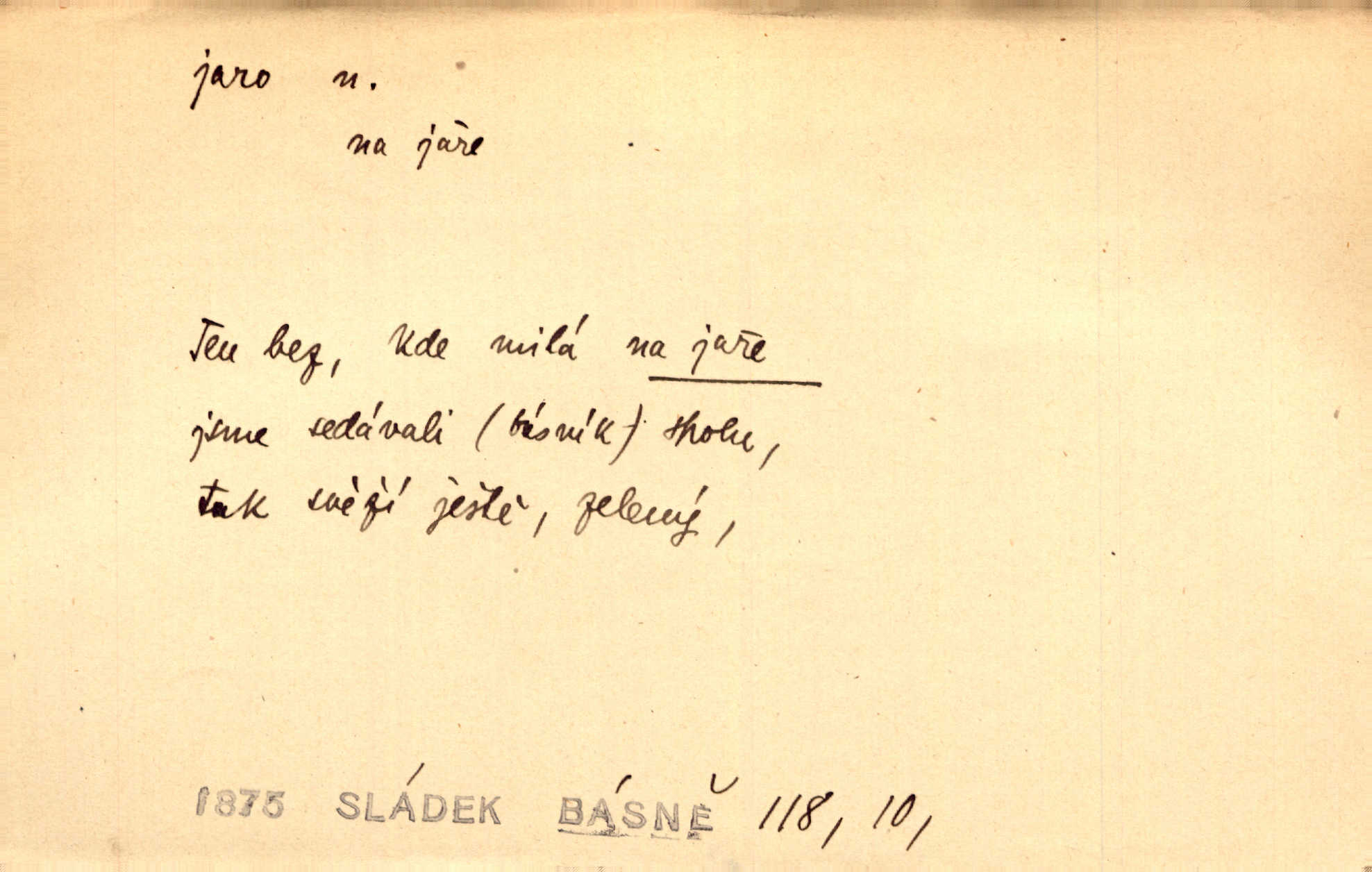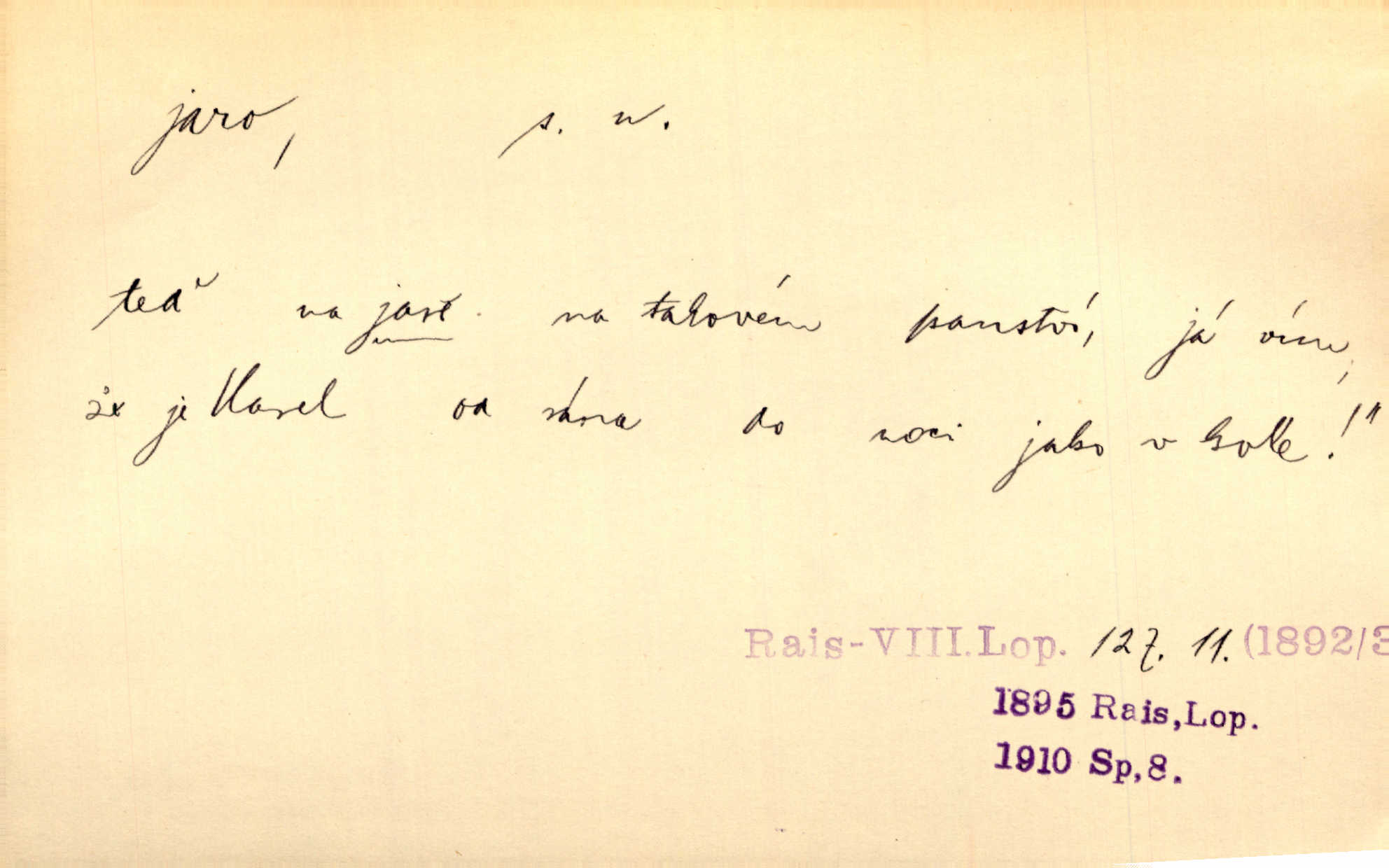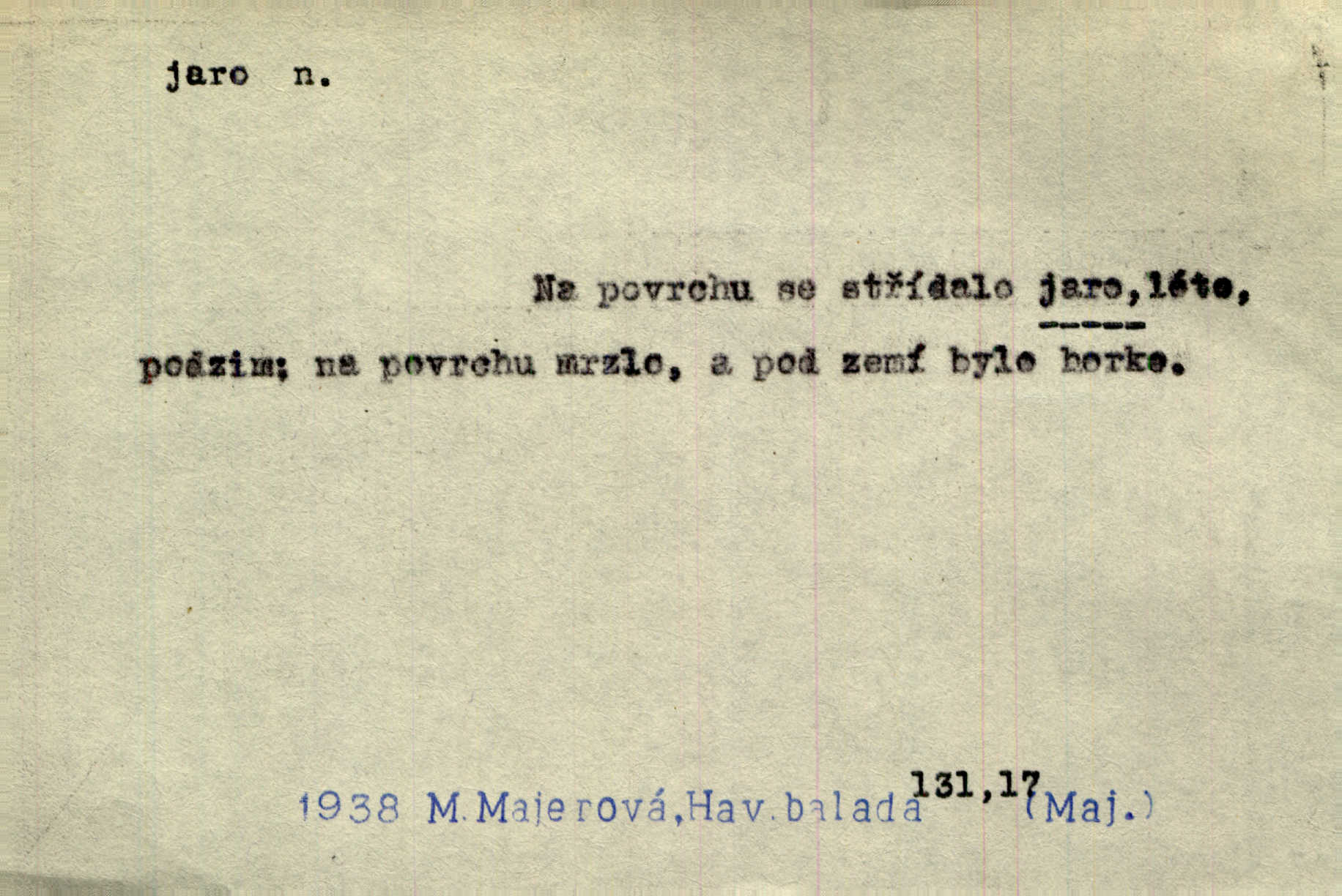- jaro, -a n. část kalendářního roku od 21. března do 21. června. Jaro se otvíralo — práce volala hospodáře do polí. Baar. Na jaře, z jara, k jaru atd. Jedna vlaštovka jara nedělá z jednoho případu není radno soudit. Přísl. Krajina na Bretonově plátně jak v jeho verších směje se jarem. Vrch. Přen. Bylo mu, jako by jaro v sobě cítil měl jasnou náladu. Zey. V očích spanilé hospodyňky zrcadlilo se věčné jaro radosti a lásky. Šmil. Teď v srdci pusto — tenkrát jaro lásky. Hál. Do jara mých illusí a fantasií zavál náhle mrazivý dech. Šub. Jaro bujných nadějí v bujném srdci. Svět. Z nového myšlenkového jara i nový skutečný život se vyvine. Sab. Národ, dokud vůbec žije, je schopen více jar. Ner. To nové skvělé jaro mého národa. Podl. Jaro lidstva. Vrch. Jaro druhého manželství. Mrš. Krásné mládí, jaro života. Zey. D mládí. Šťastný byl věk jata mého. Tyl. Dívka, obestřená všemi půvaby a kouzly ženského jara. Herrm. Uvadlá kráska ve všech koutech kryje uvadlé květy, památky svých jar mladých let. Mach. D rok života. Dámy mezi šestnáctým a dvacátým jarem. Ner. Ačkoli zažila na třicet jar, přece posud byla svěží. Svob. Již je tomu hezká řada jar. Mach.