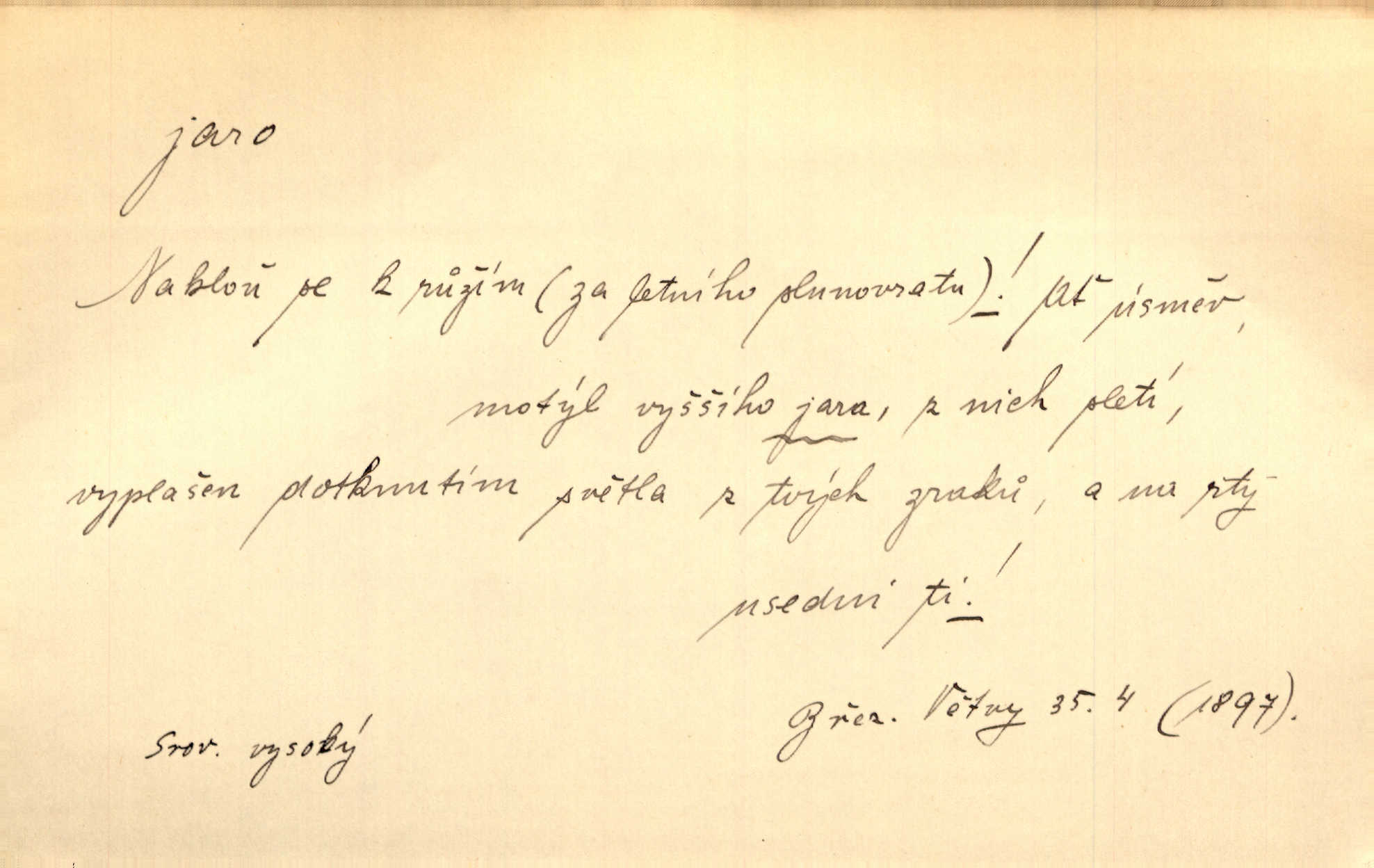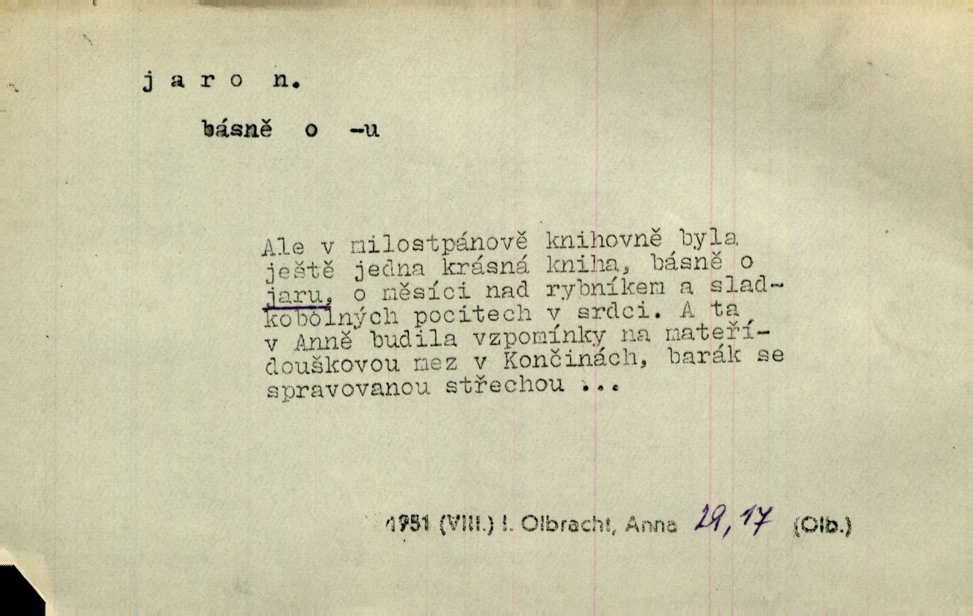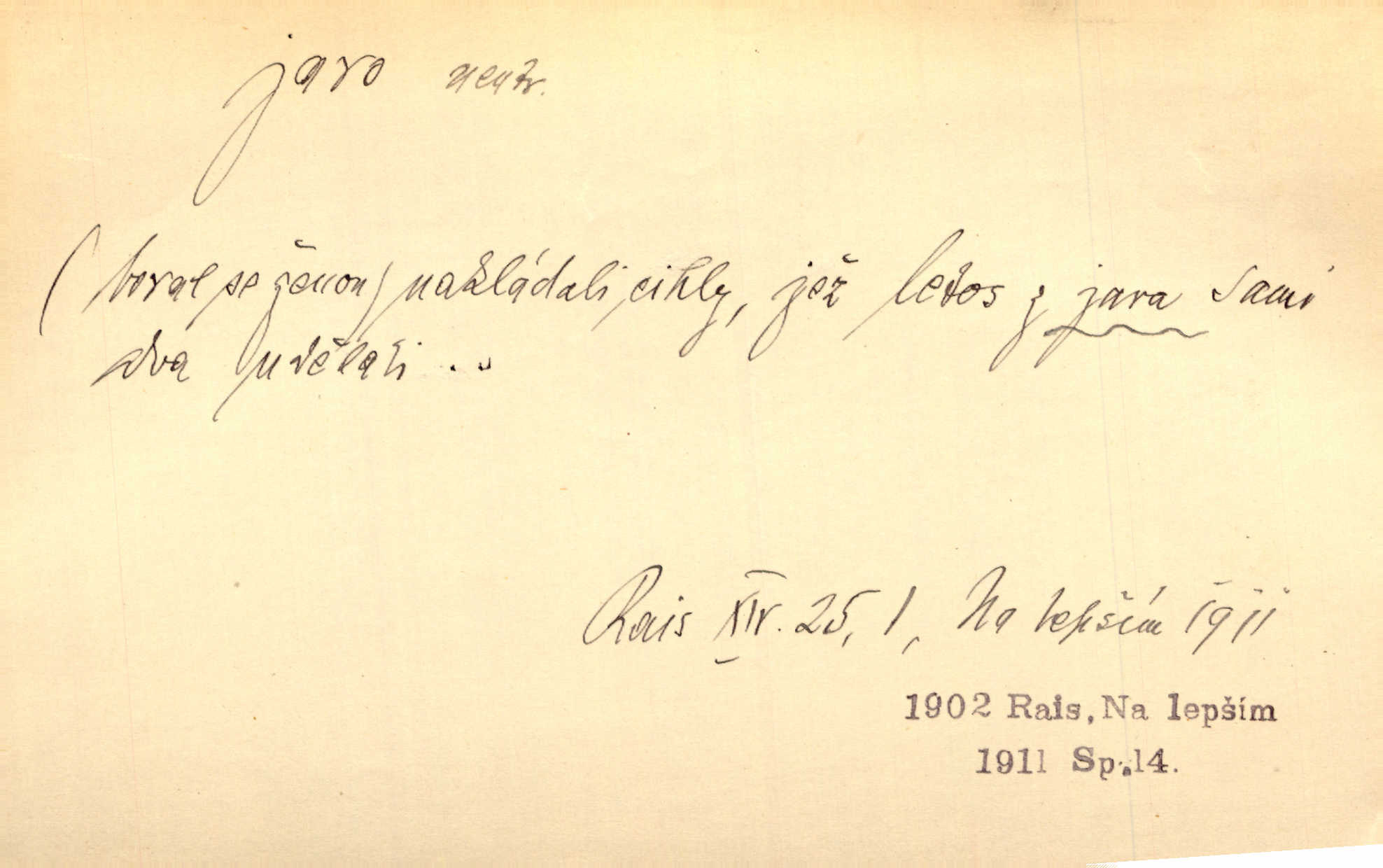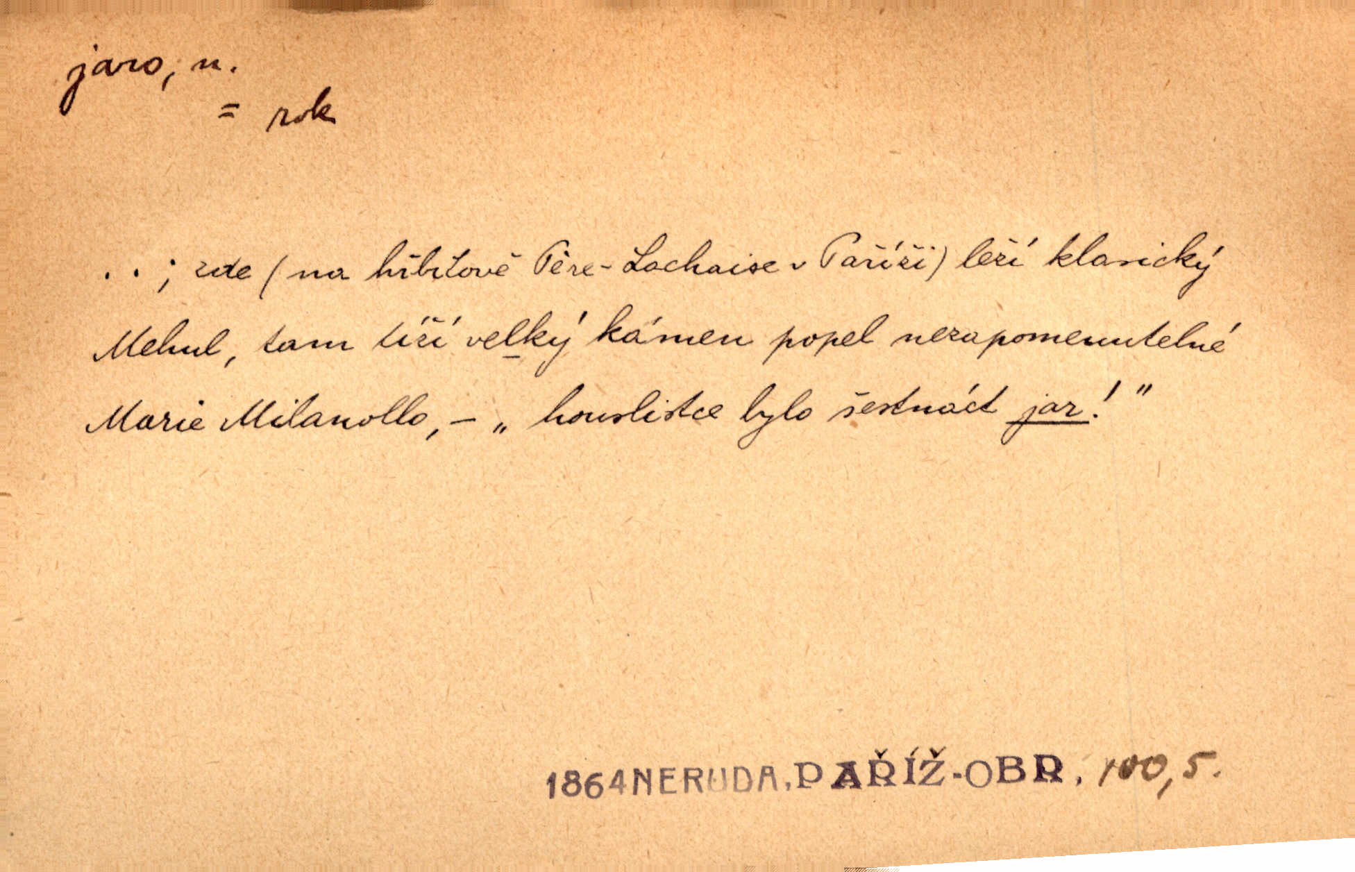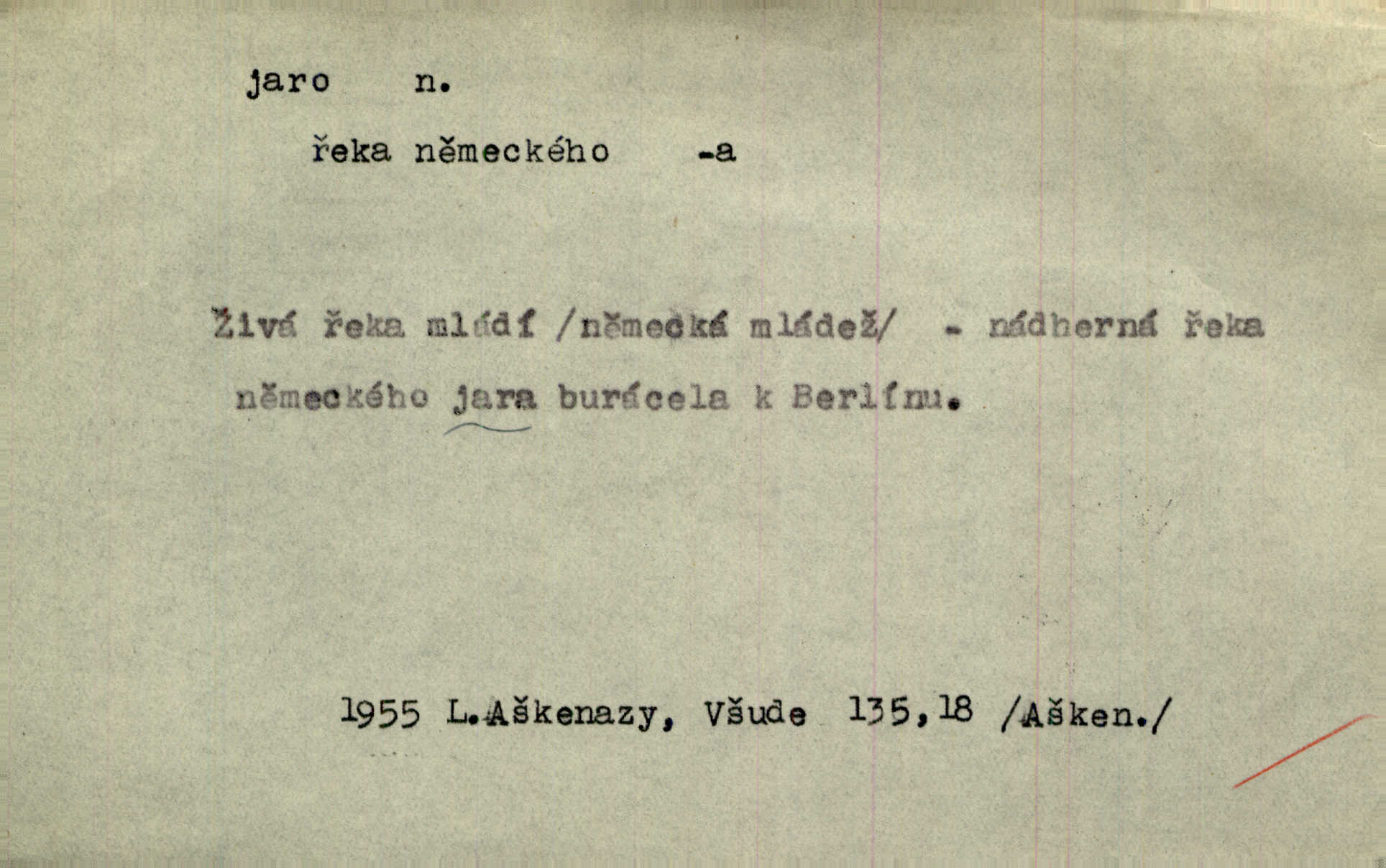 - jaro, -a n. část kalendářního roku od 21. března do 21. června. Jaro se otvíralo — práce volala hospodáře do polí. Baar. Na jaře, z jara, k jaru atd. Jedna vlaštovka jara nedělá z jednoho případu není radno soudit. Přísl. Krajina na Bretonově plátně jak v jeho verších směje se jarem. Vrch. Přen. Bylo mu, jako by jaro v sobě cítil měl jasnou náladu. Zey. V očích spanilé hospodyňky zrcadlilo se věčné jaro radosti a lásky. Šmil. Teď v srdci pusto — tenkrát jaro lásky. Hál. Do jara mých illusí a fantasií zavál náhle mrazivý dech. Šub. Jaro bujných nadějí v bujném srdci. Svět. Z nového myšlenkového jara i nový skutečný život se vyvine. Sab. Národ, dokud vůbec žije, je schopen více jar. Ner. To nové skvělé jaro mého národa. Podl. Jaro lidstva. Vrch. Jaro druhého manželství. Mrš. Krásné mládí, jaro života. Zey. D mládí. Šťastný byl věk jata mého. Tyl. Dívka, obestřená všemi půvaby a kouzly ženského jara. Herrm. Uvadlá kráska ve všech koutech kryje uvadlé květy, památky svých jar mladých let. Mach. D rok života. Dámy mezi šestnáctým a dvacátým jarem. Ner. Ačkoli zažila na třicet jar, přece posud byla svěží. Svob. Již je tomu hezká řada jar. Mach.