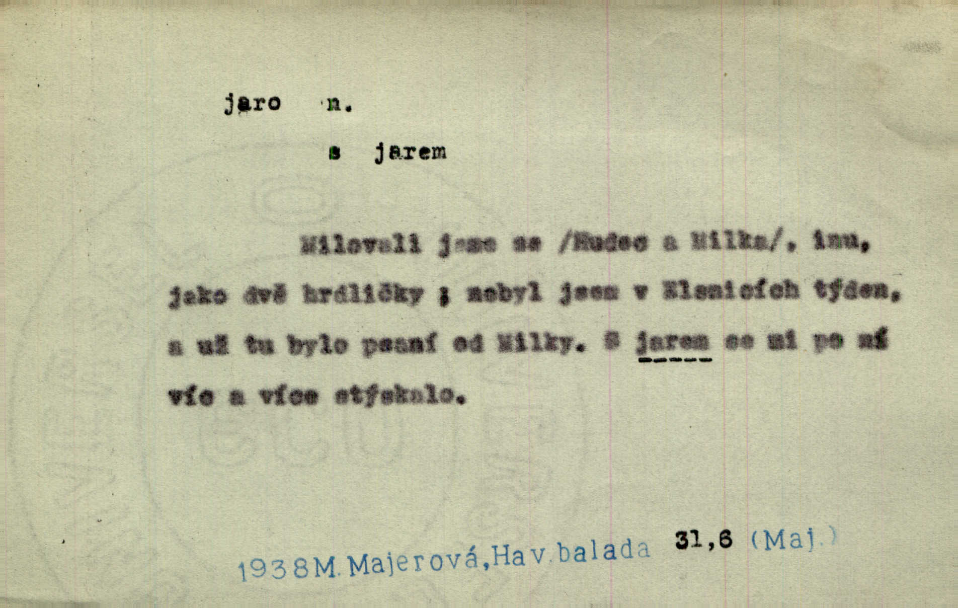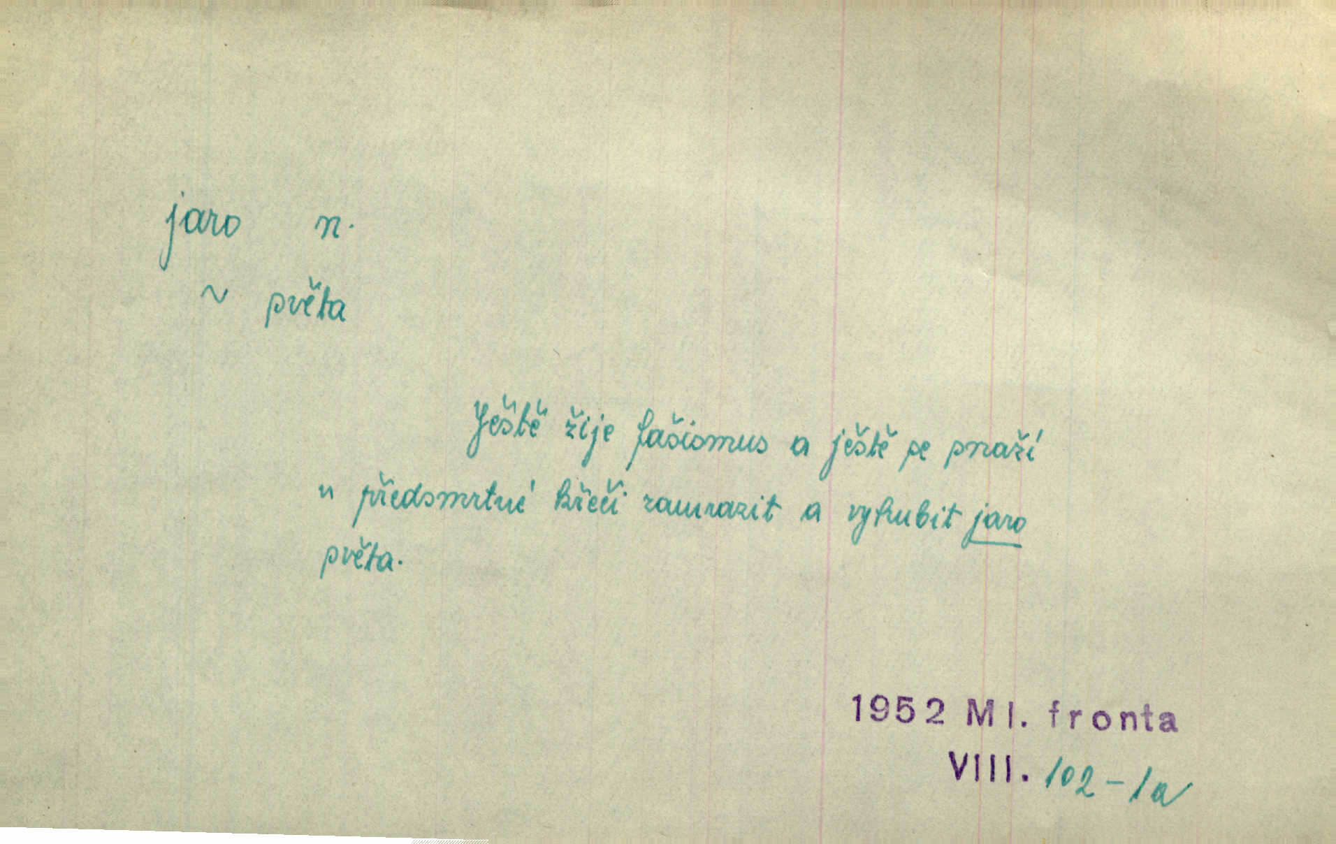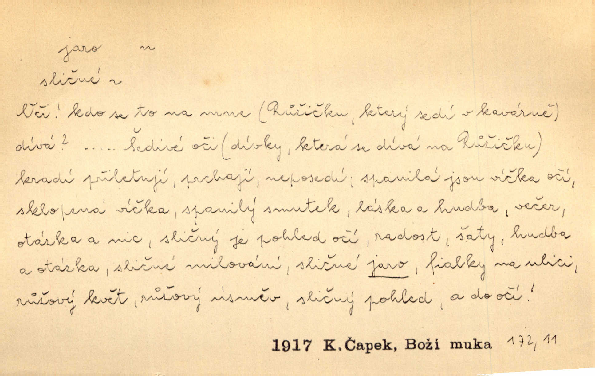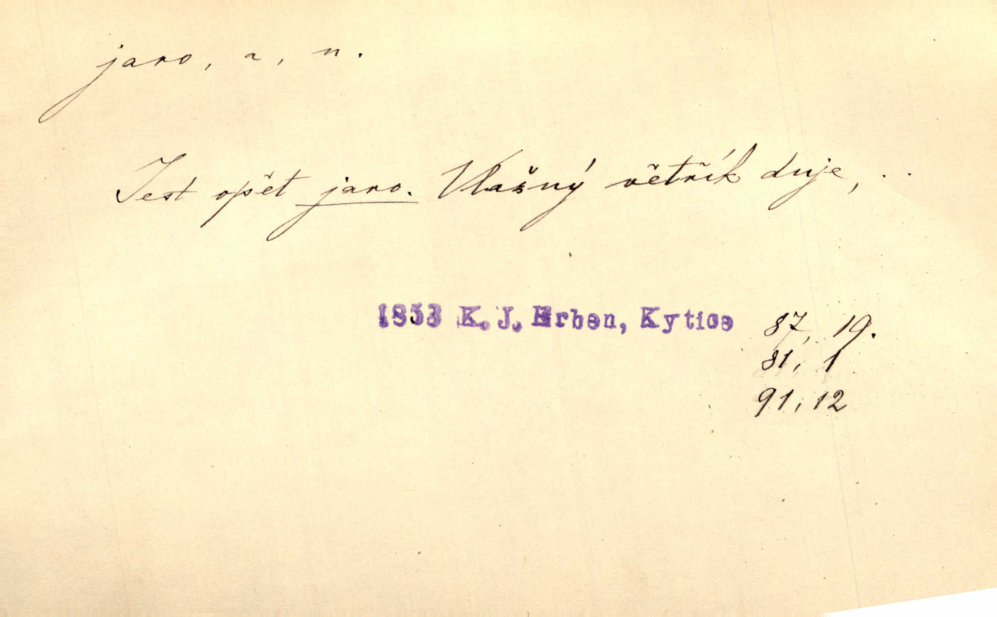 - jaro, -a n. část kalendářního roku od 21. března do 21. června. Jaro se otvíralo — práce volala hospodáře do polí. Baar. Na jaře, z jara, k jaru atd. Jedna vlaštovka jara nedělá z jednoho případu není radno soudit. Přísl. Krajina na Bretonově plátně jak v jeho verších směje se jarem. Vrch. Přen. Bylo mu, jako by jaro v sobě cítil měl jasnou náladu. Zey. V očích spanilé hospodyňky zrcadlilo se věčné jaro radosti a lásky. Šmil. Teď v srdci pusto — tenkrát jaro lásky. Hál. Do jara mých illusí a fantasií zavál náhle mrazivý dech. Šub. Jaro bujných nadějí v bujném srdci. Svět. Z nového myšlenkového jara i nový skutečný život se vyvine. Sab. Národ, dokud vůbec žije, je schopen více jar. Ner. To nové skvělé jaro mého národa. Podl. Jaro lidstva. Vrch. Jaro druhého manželství. Mrš. Krásné mládí, jaro života. Zey. D mládí. Šťastný byl věk jata mého. Tyl. Dívka, obestřená všemi půvaby a kouzly ženského jara. Herrm. Uvadlá kráska ve všech koutech kryje uvadlé květy, památky svých jar mladých let. Mach. D rok života. Dámy mezi šestnáctým a dvacátým jarem. Ner. Ačkoli zažila na třicet jar, přece posud byla svěží. Svob. Již je tomu hezká řada jar. Mach.