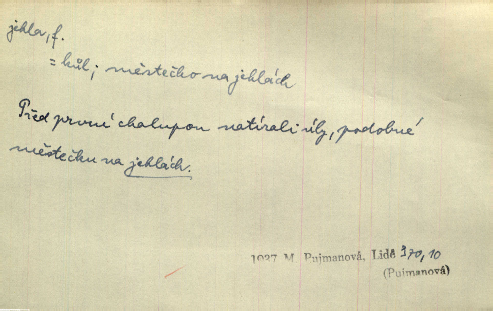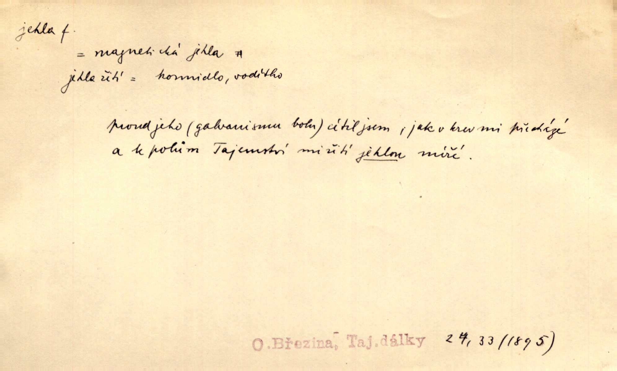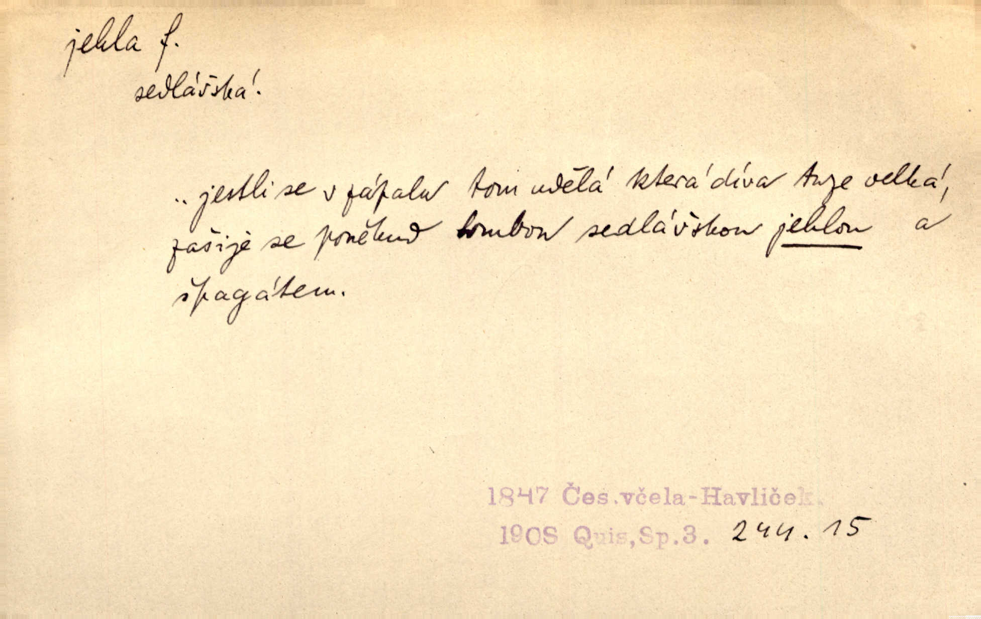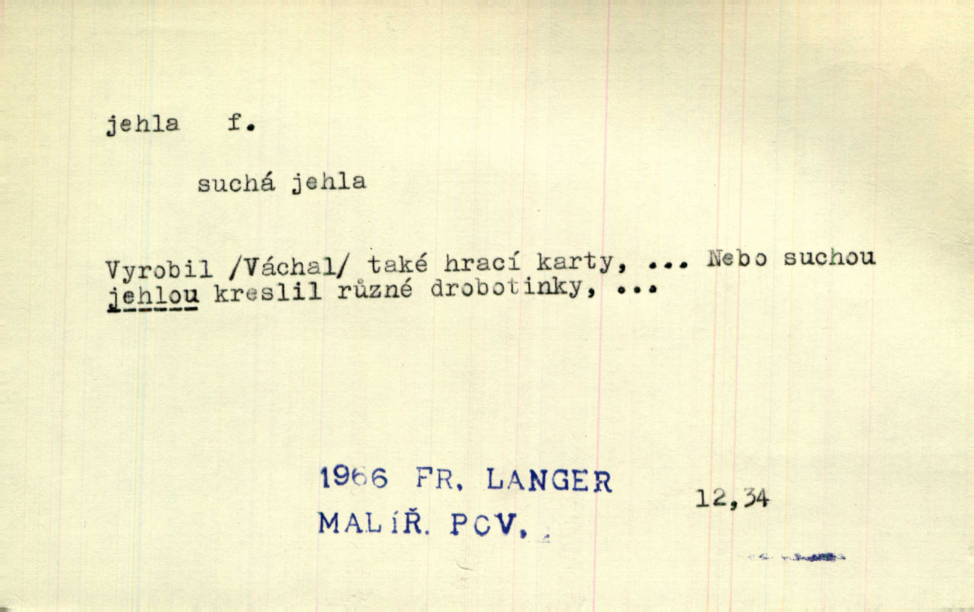 - jehla, -y f. tenký, drobný nástroj k šití, vyrobený z drátu. A kdybych měla pracovat jehlou, uživíme se vydělávati si šitím. Mach. To jako ostrou jehlou bodlo ji. Holý. Takové se rozlilo kolkolem světlo, že by jehlu na podlaze ležící dobře byl člověk uznamenal. Kos. Oči má jak jehly pronikavé, pohyblivé. Třeb. Je [Nácek] jako jehla čiperný. Jir. Žemla byl jako na jehlách a po celý den byl velice rozčilen netrpělivý, nedočkavý. Herrm. Hovor nepříjemně se táhl, obě dámy byly jako na jehlách. Jah. Krade od jehly, jak se říká všechno. Uh. Nácek byl k jehle šikovný učil se dobře krejčovině. Kosm. Netěšila ji jehla ani domácí práce šití. Krás. Šíti horkou jehlou kvapně, nedbale, ledabyle. Žert. Mistr jehla chtěl to pánu vymluvit krejčí. Jir. Zase jim prášenice metala jehly do tváří ostře bodající krupky sněhové. Jir. Vážný list srší jehlami na hlavy naše jizlivostmi. Mach. Lék. nástroj k sešívání tkání; dutá jehla u injekční stříkačky, jíž se vstřikuje léčivo do těla. D jehlice na pletení, ozdobná jehlice do vlasů, klobouků, nákrčníků, do oděvu. Stařec pletl dřevěnými jehlami velkou punčochu. Zey. Do vlasů a do šatků měly zastrčeny jehly s velkými hlavami. Prav. Pomohla paní správcové vytáhnout z klobouku jehlu. Šim. D věc připomínající tvarem jehlu. Nedaleko Alexandrie ční z pouště jehla Kleopatřina štíhlý jehlanec. Lier. Na nejvyšší jehly bych ti vodu ze studánek přinášel ostré vrcholky horské. Dur. Jste akrobati. Slezači alpských jehel. Olb. Jím [sluncem] lupeny a jehly prozlaceny lístky jehličnatých stromů. Čech. Borovice stály tu nehybně jako v dřímotě; ani jehla se na nich nepohnula. Rok. Stav. zaostřený kůl dřevěný, železný n. betonový, pilota. Fys. jehla magnetická střelka magnetky. Ukazatel měřicích přístrojů, ručička. Typ. nástroj k rytí; suchá jehla způsob mědirytecké práce, při níž se kresba vrývá jehlou do desky; mokrá jehla rozličné leptání fotochemigrafických způsobu. Tech. jehla u fonografu n. gramofonu zapisující na desku n. prostředkující reprodukci zvuků na desce zapsaných. Voj. jehla zapalovače ostrý hrot přivádějící nárazem třaskavinu k výbuchu. Stroj. jehla protahovací nástroj na úpravu vnitřních ploch otvorů, protahovák; jehla rýsovací nástroj na rýsování obrysů výrobku před obráběním. Zool. jehla hranatá ryba z čeledi hranatek (Syngnathus acus).
