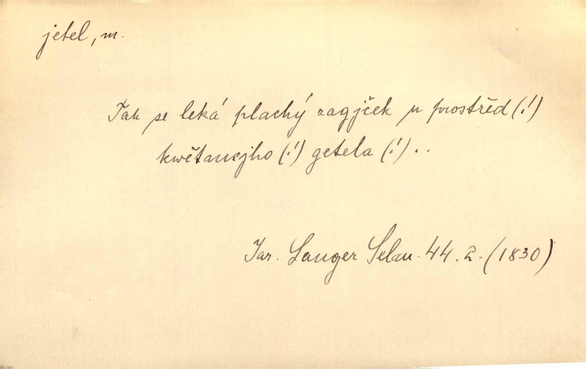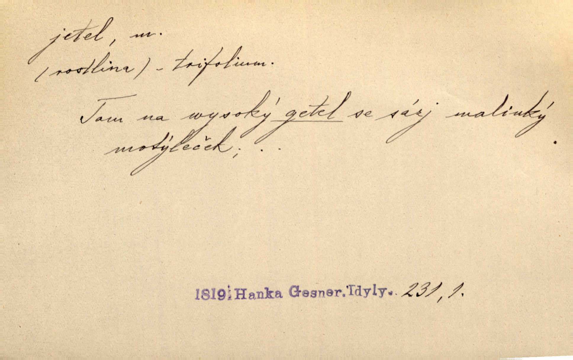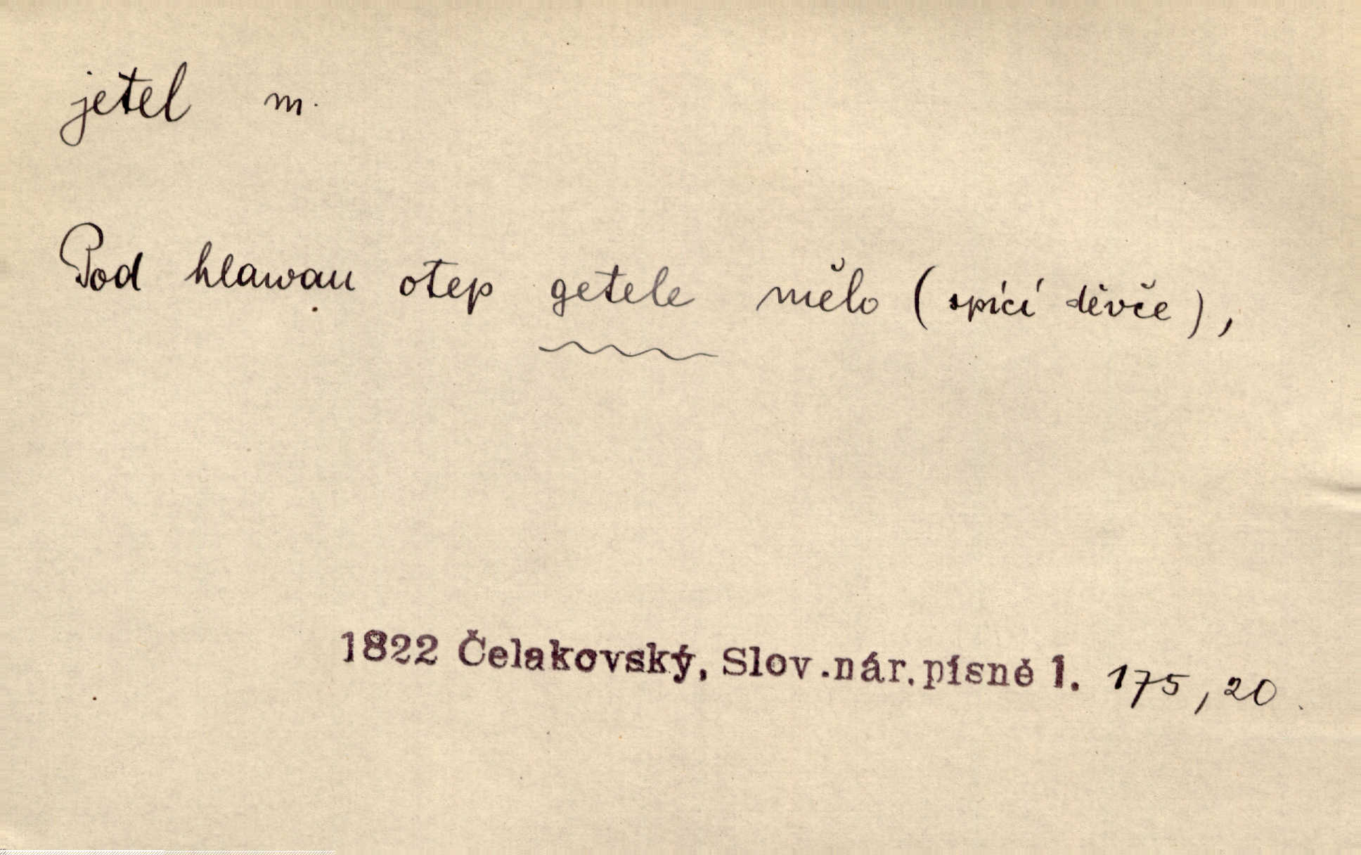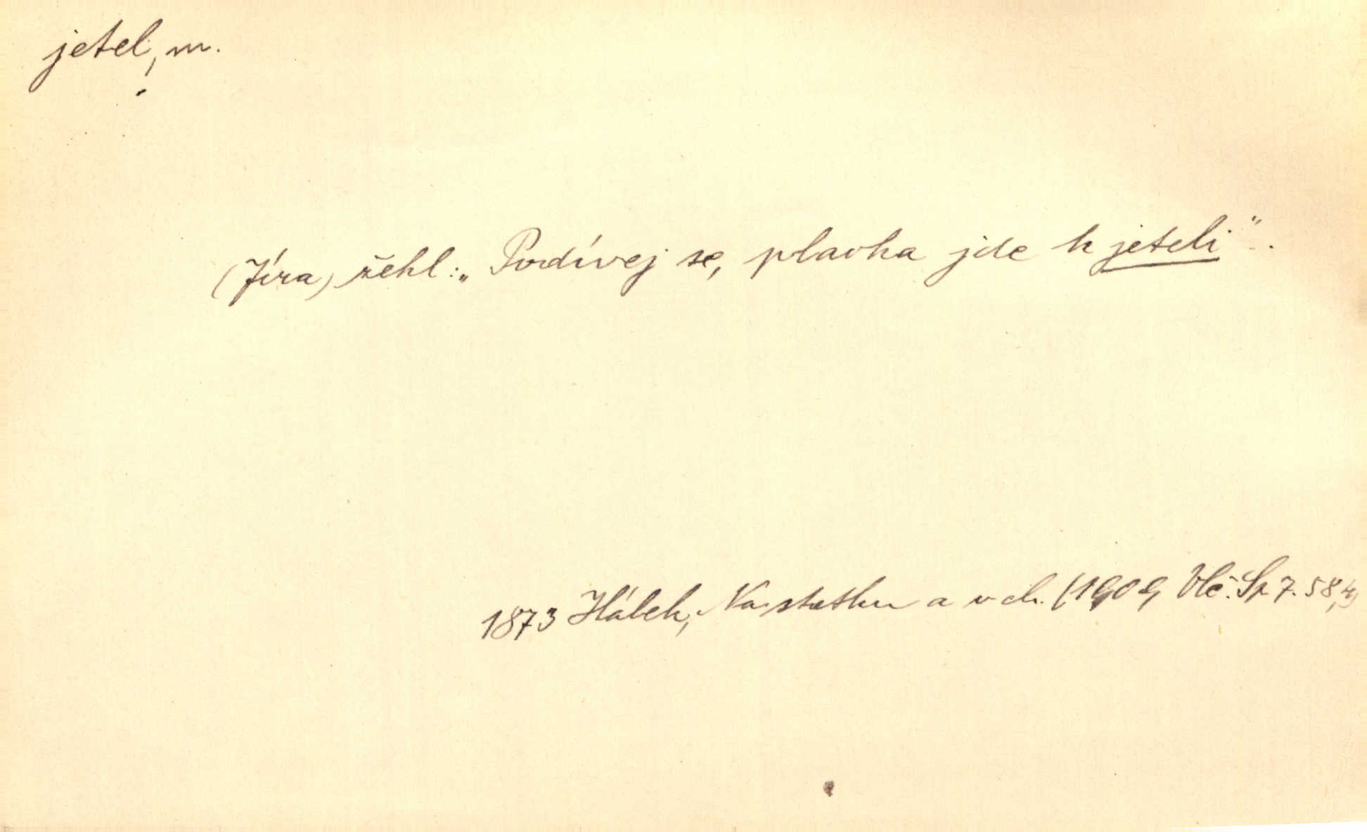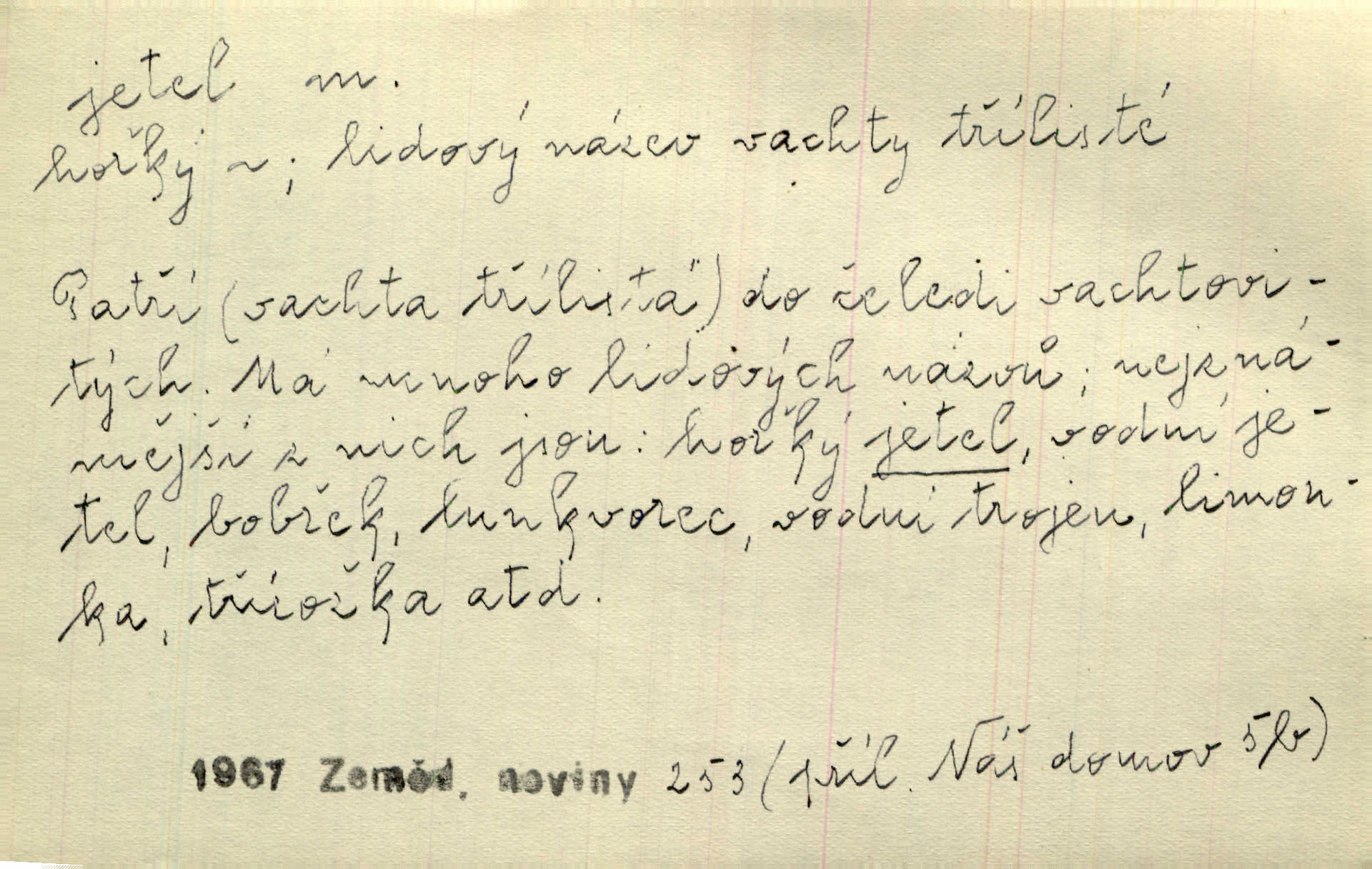 - jetel, -e m. (dial. f.) bot. rod rostlin motýlokvětých (Trifolium). Jetel polní, luční, plazivý a j. Jetel nachový inkarnát, růžák. Jetel strnišťák narostlý po žních na strništi. Hořký jetel vachta třílistá (Menyanthes trifoliata); kozí jetel čilimník odvislý (Cytisus laburnum); zaječí jetel šťavel kyselý (Oxalis acetosella).