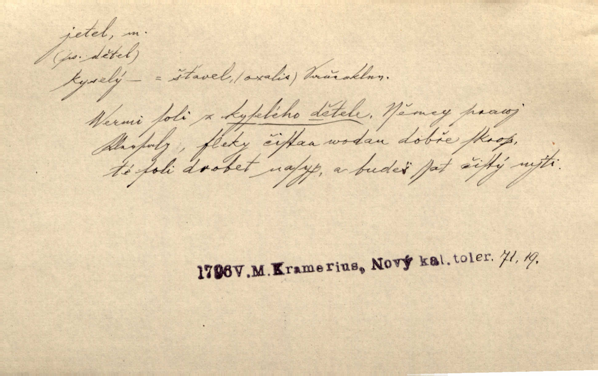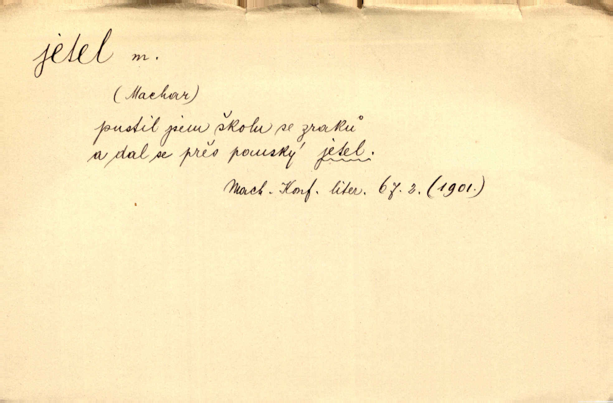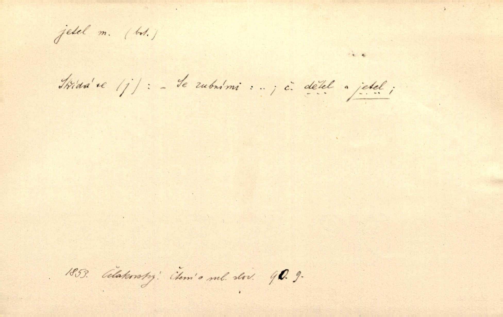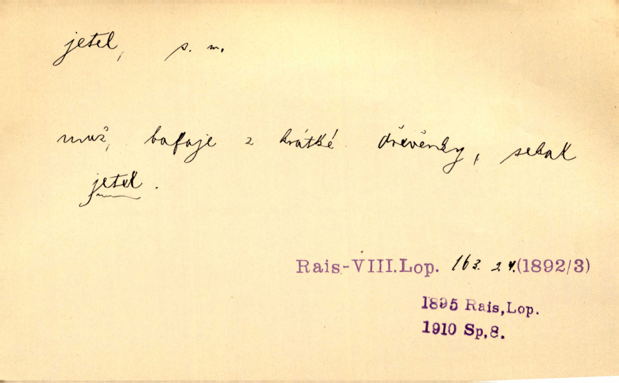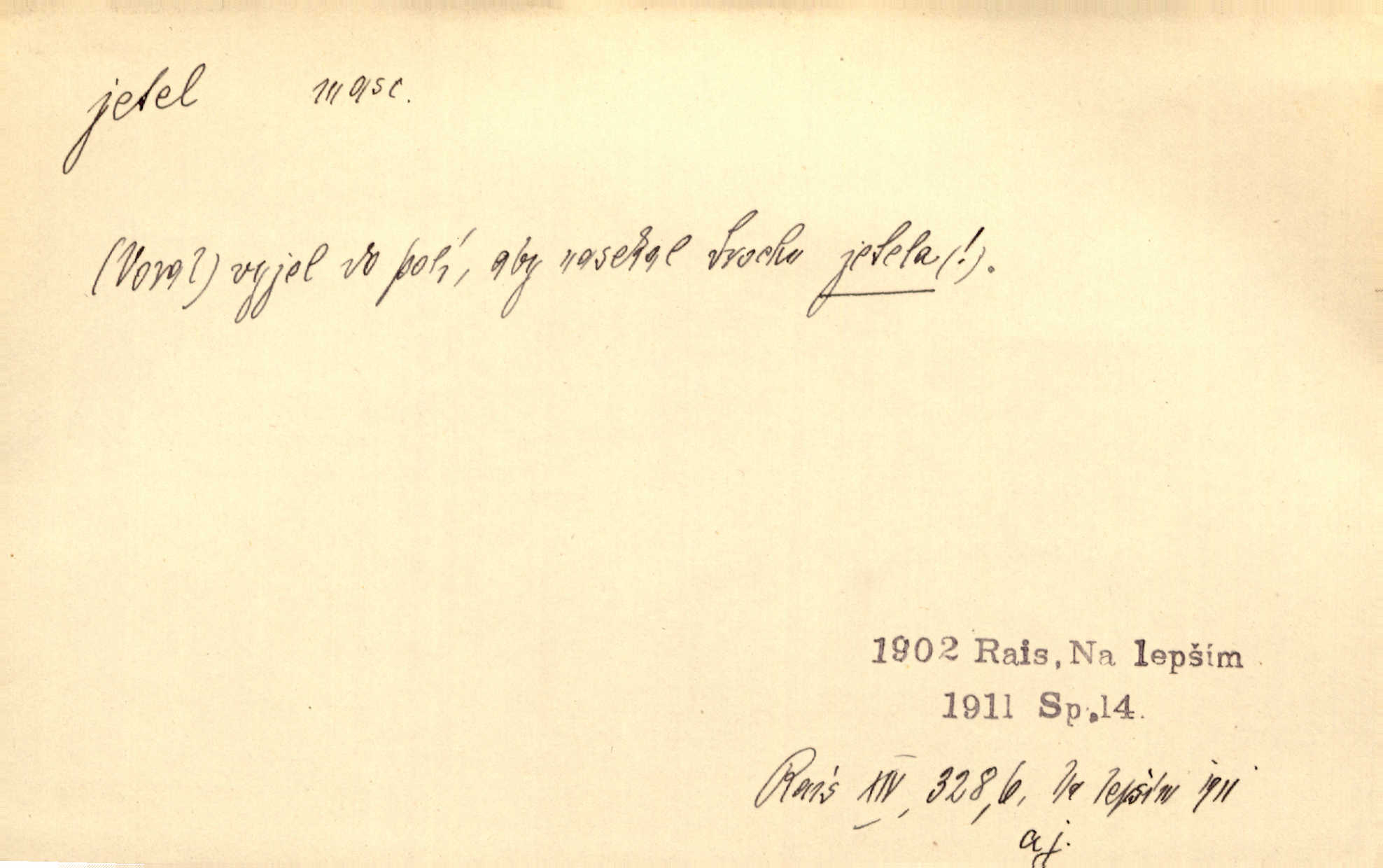 - jetel, -e m. (dial. f.) bot. rod rostlin motýlokvětých (Trifolium). Jetel polní, luční, plazivý a j. Jetel nachový inkarnát, růžák. Jetel strnišťák narostlý po žních na strništi. Hořký jetel vachta třílistá (Menyanthes trifoliata); kozí jetel čilimník odvislý (Cytisus laburnum); zaječí jetel šťavel kyselý (Oxalis acetosella).