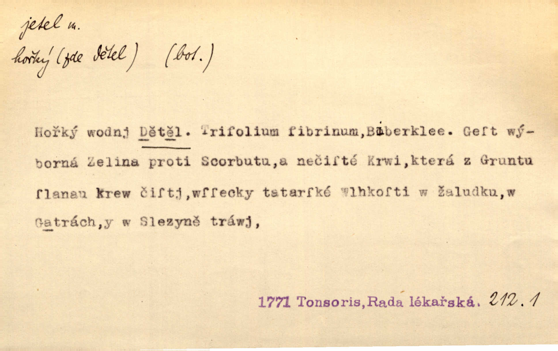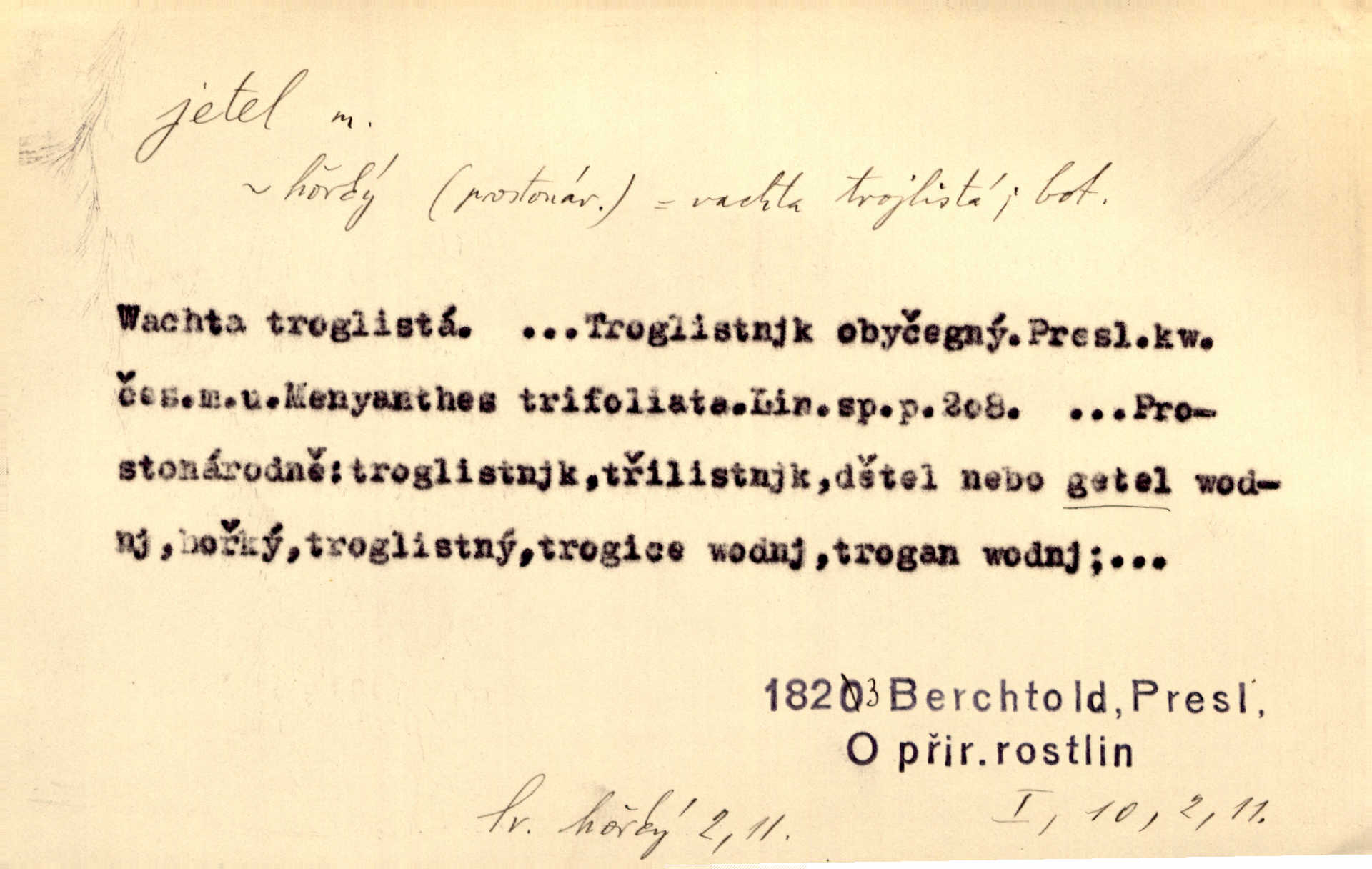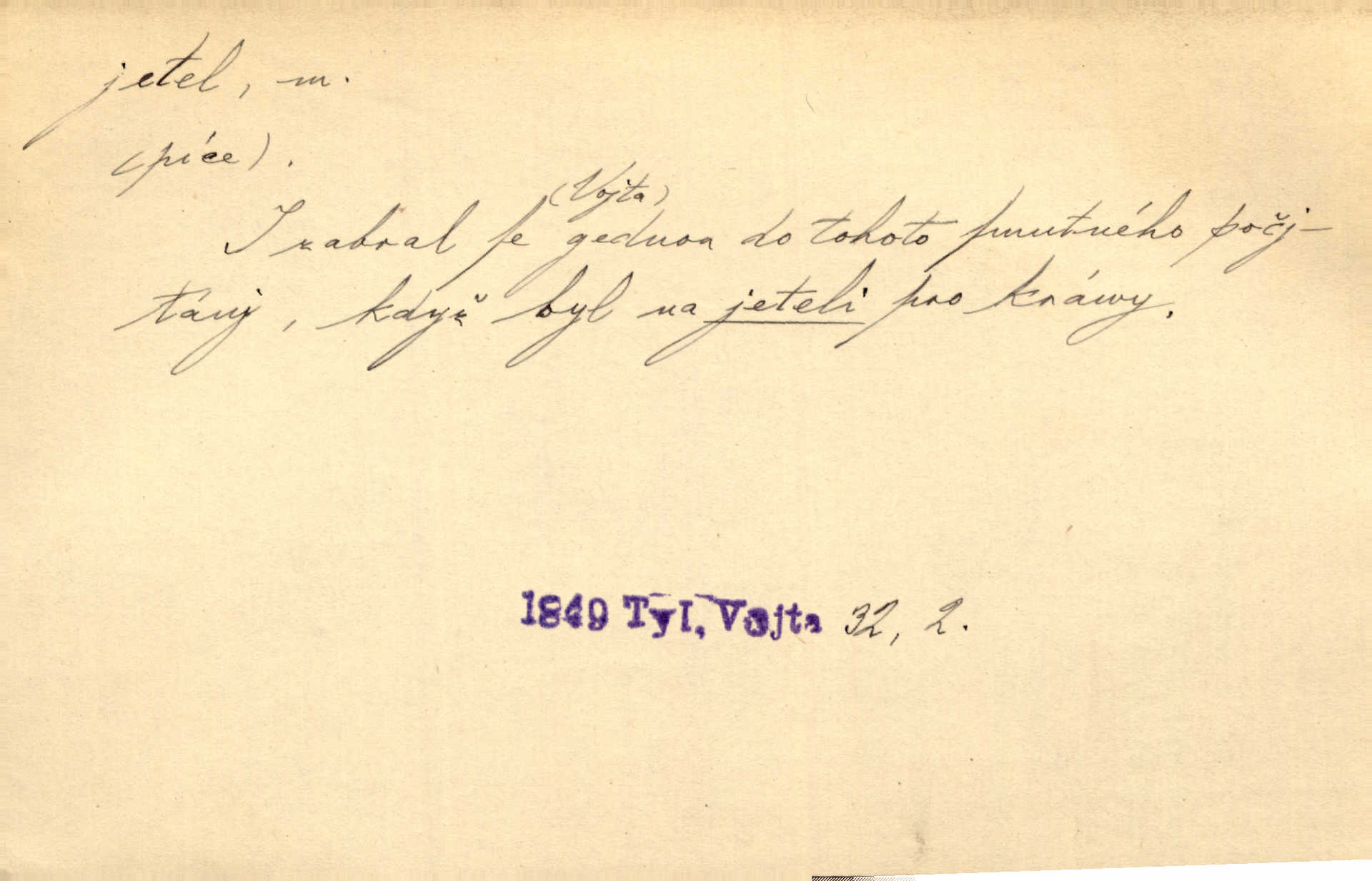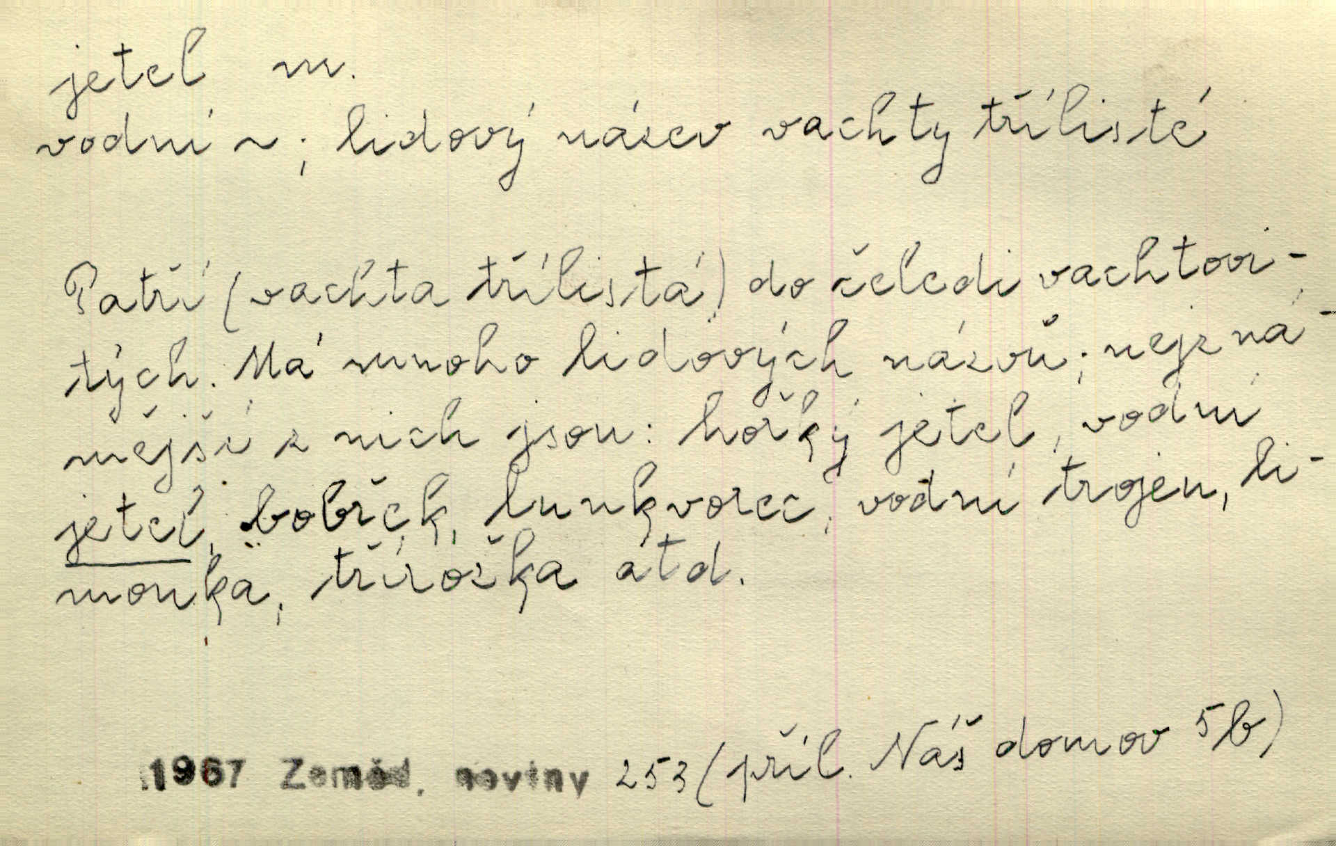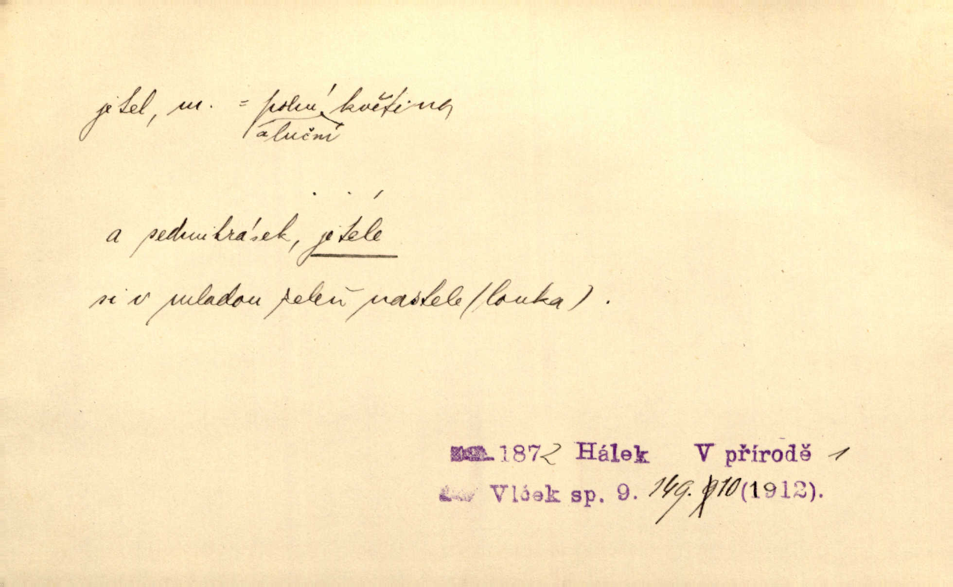 - jetel, -e m. (dial. f.) bot. rod rostlin motýlokvětých (Trifolium). Jetel polní, luční, plazivý a j. Jetel nachový inkarnát, růžák. Jetel strnišťák narostlý po žních na strništi. Hořký jetel vachta třílistá (Menyanthes trifoliata); kozí jetel čilimník odvislý (Cytisus laburnum); zaječí jetel šťavel kyselý (Oxalis acetosella).