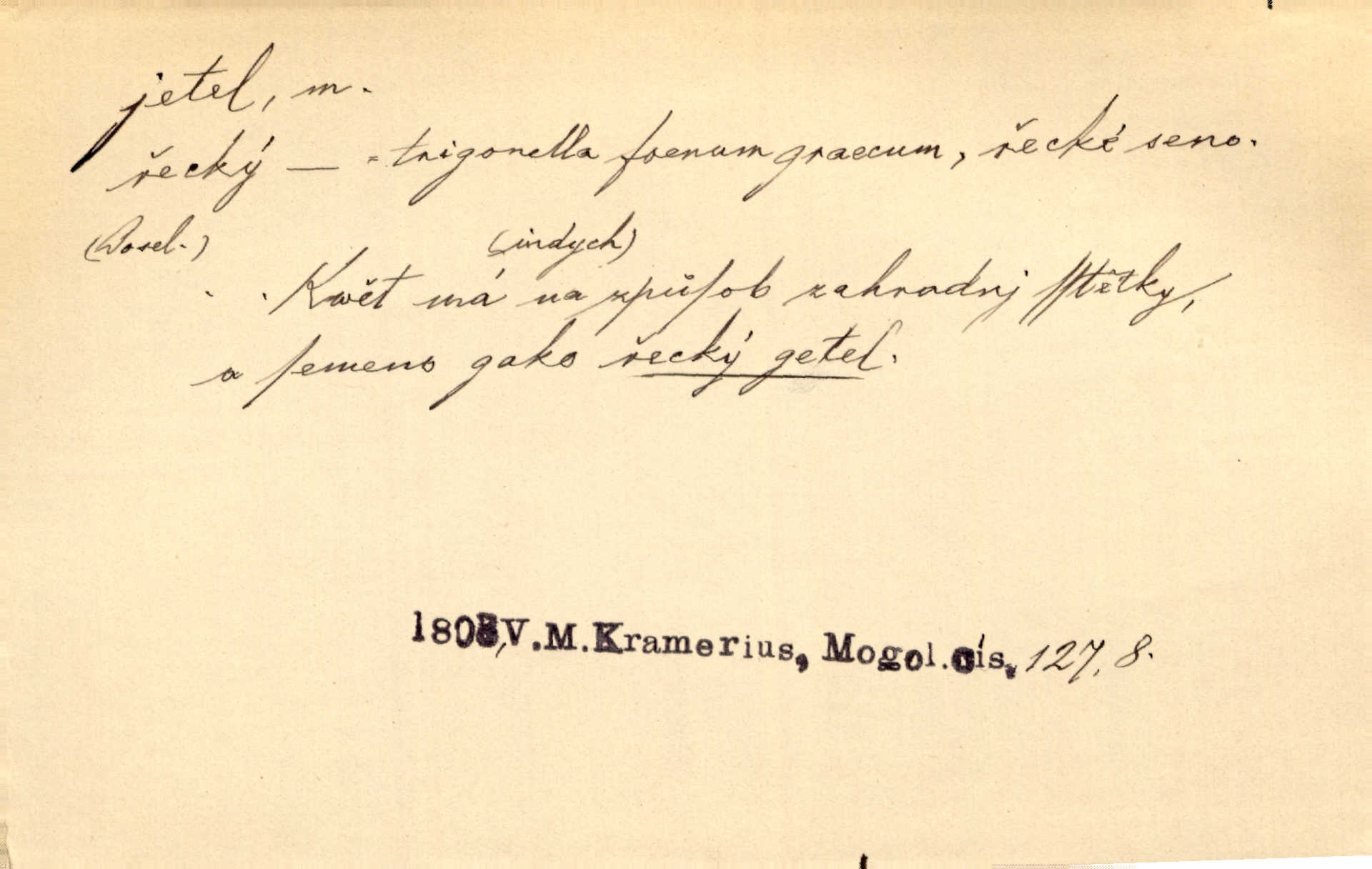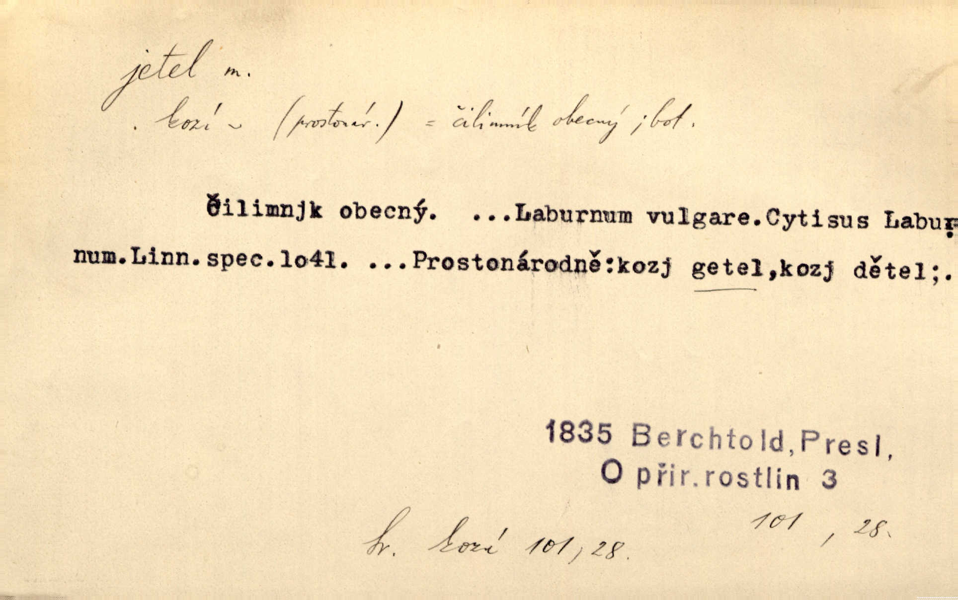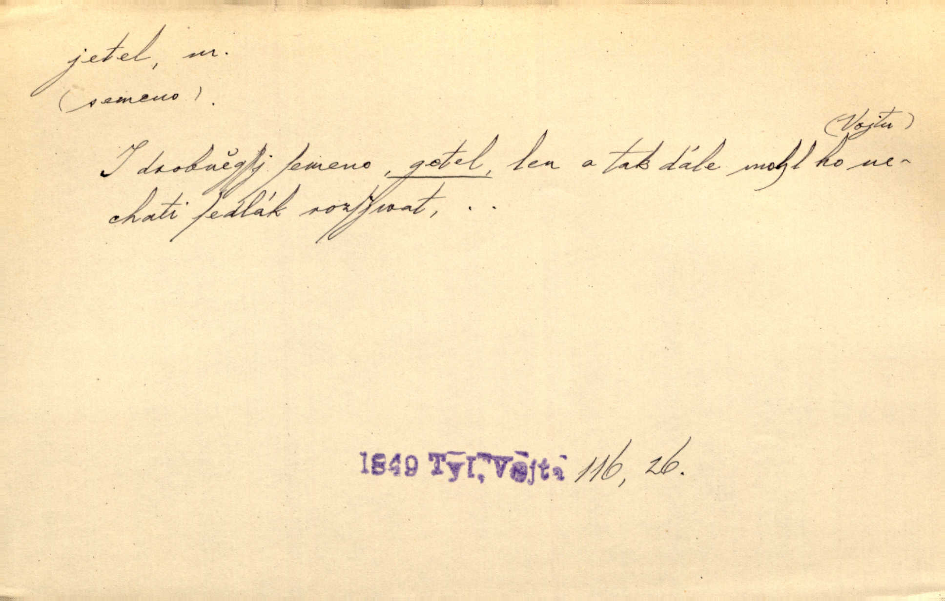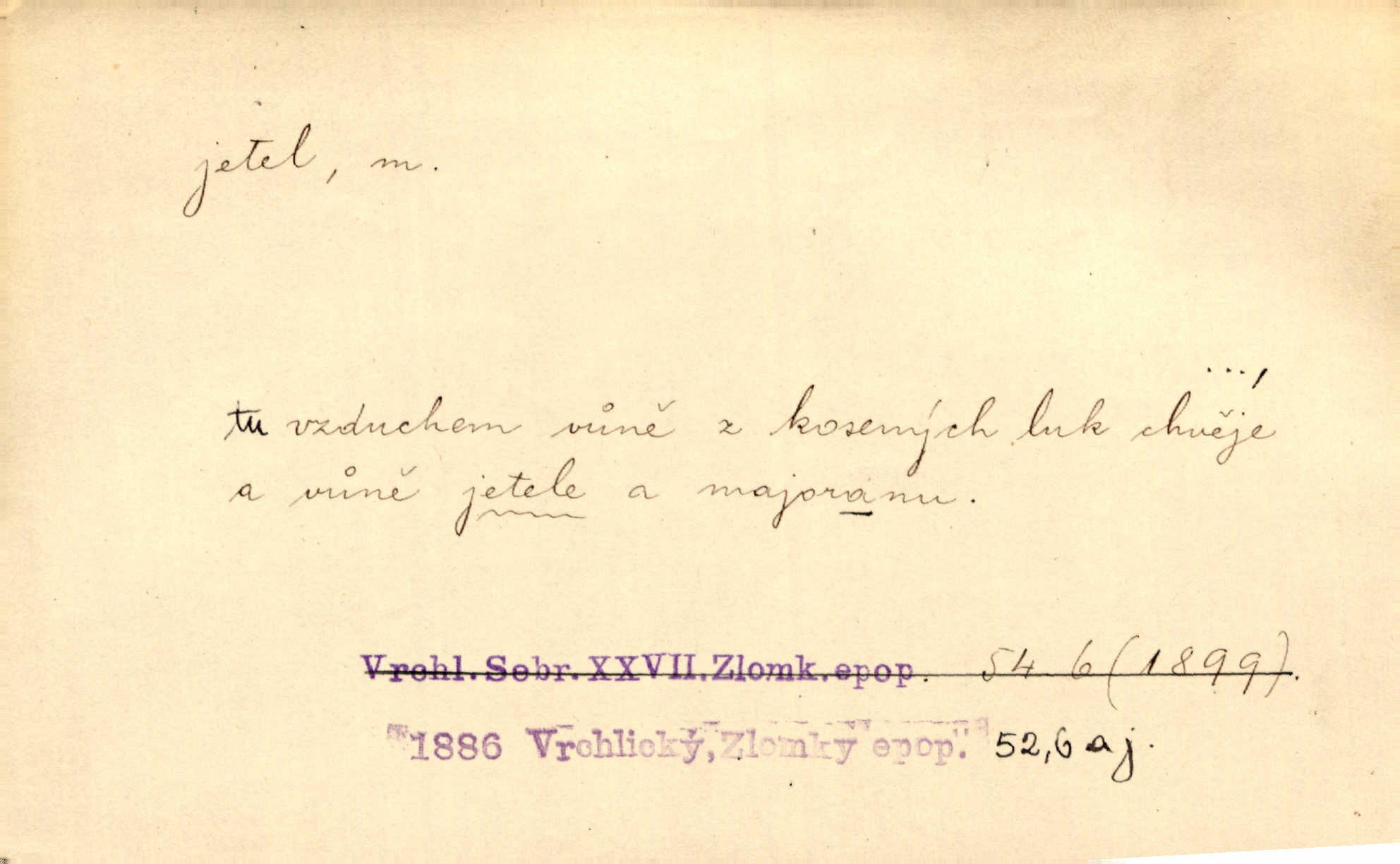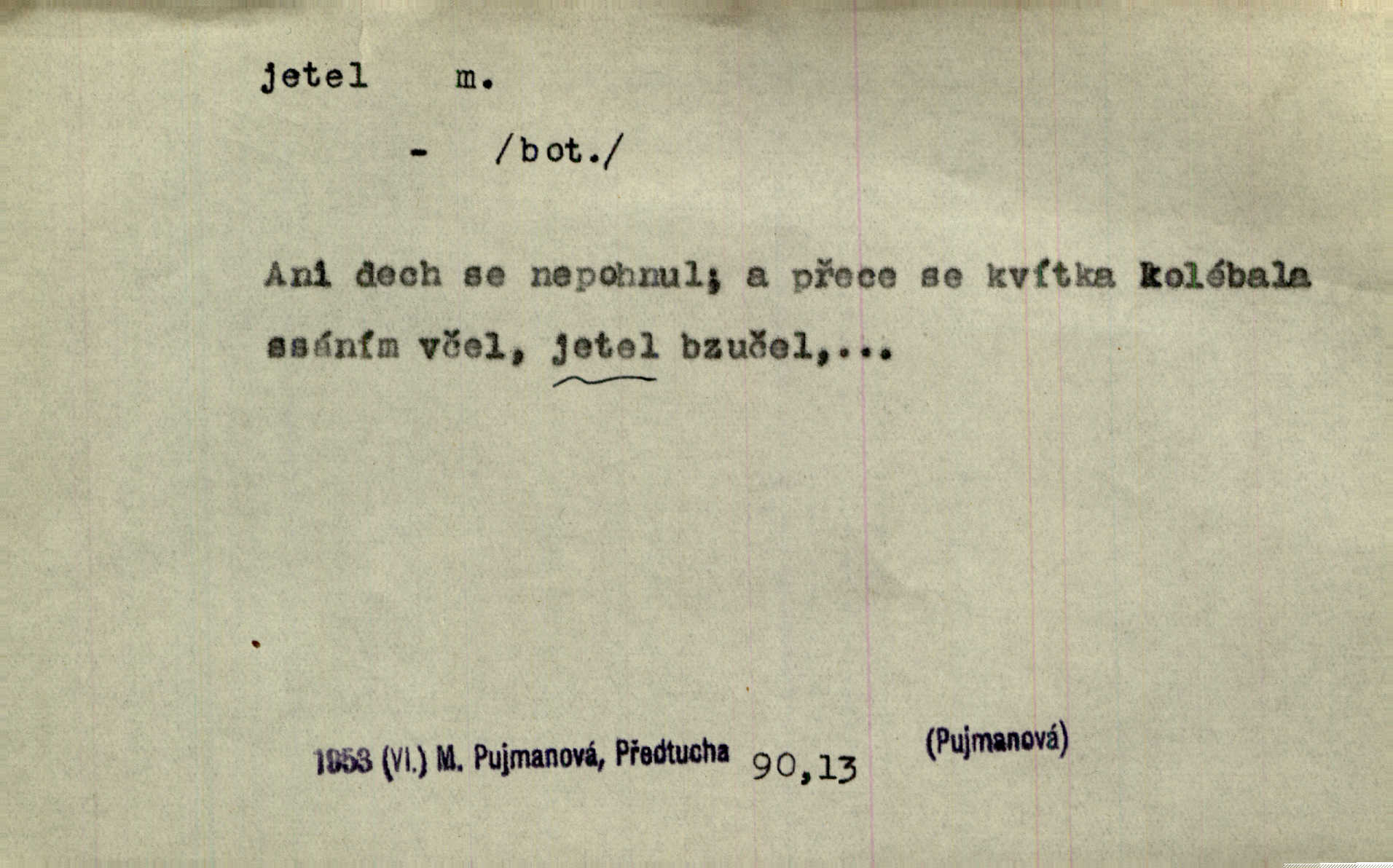- jetel, -e m. (dial. f.) bot. rod rostlin motýlokvětých (Trifolium). Jetel polní, luční, plazivý a j. Jetel nachový inkarnát, růžák. Jetel strnišťák narostlý po žních na strništi. Hořký jetel vachta třílistá (Menyanthes trifoliata); kozí jetel čilimník odvislý (Cytisus laburnum); zaječí jetel šťavel kyselý (Oxalis acetosella).
