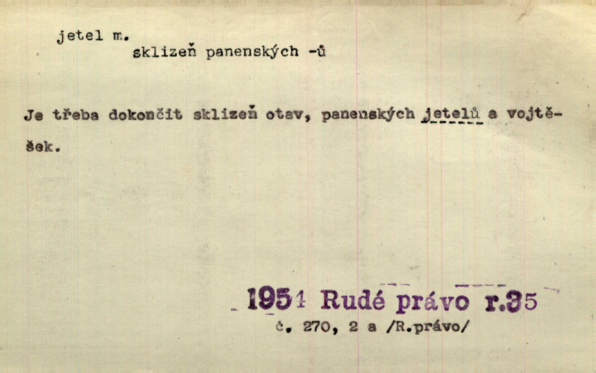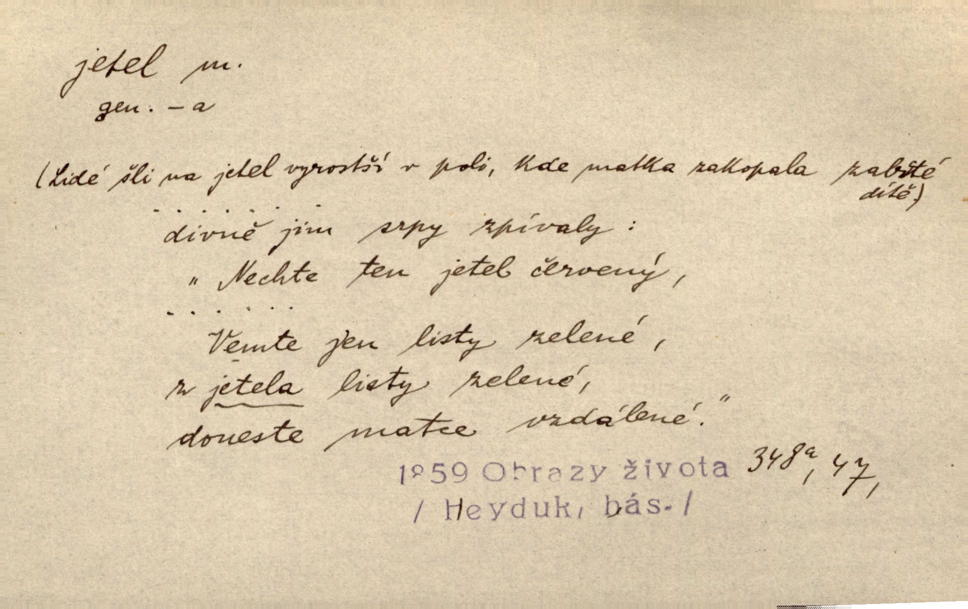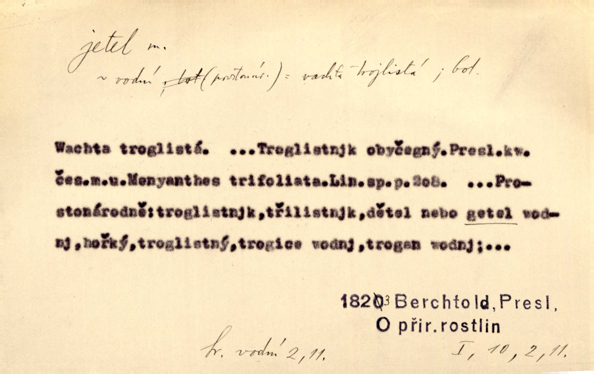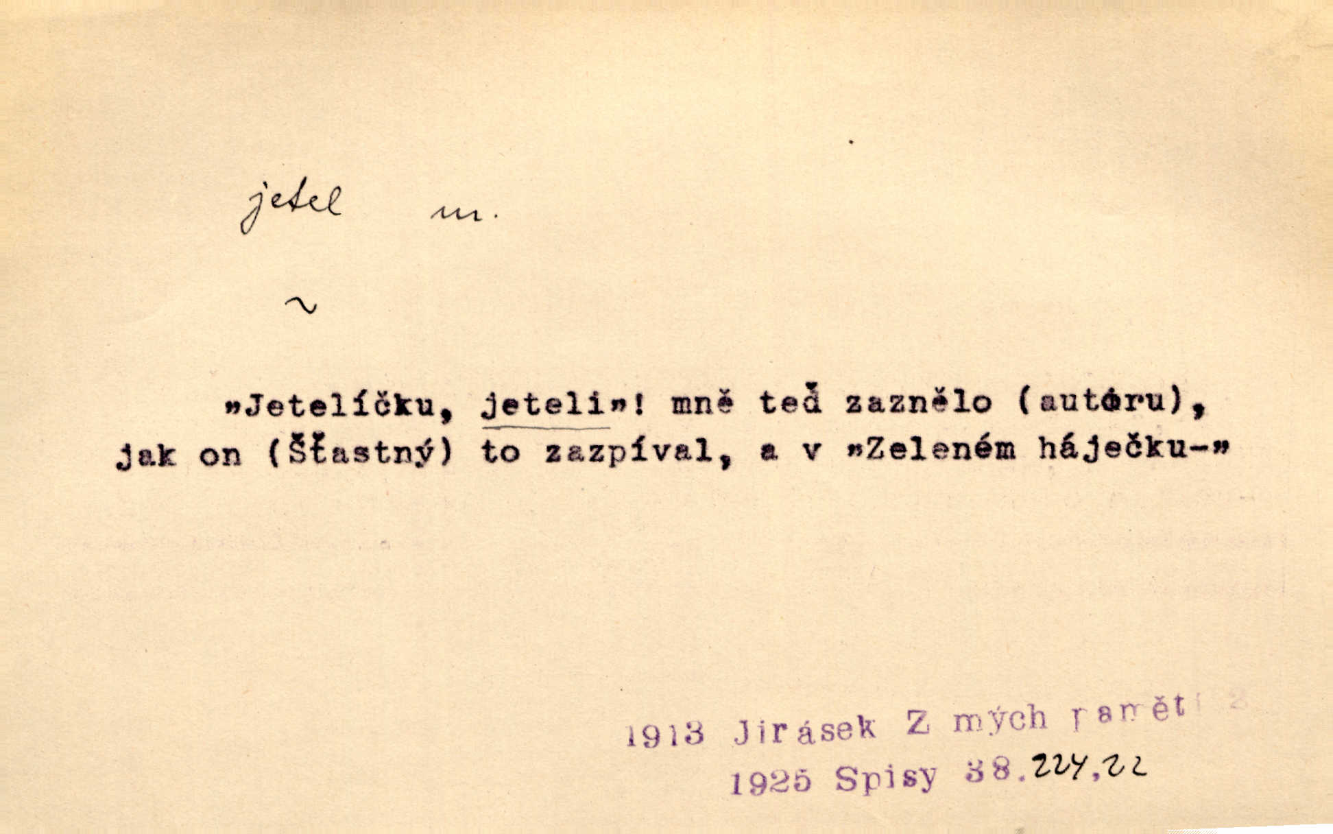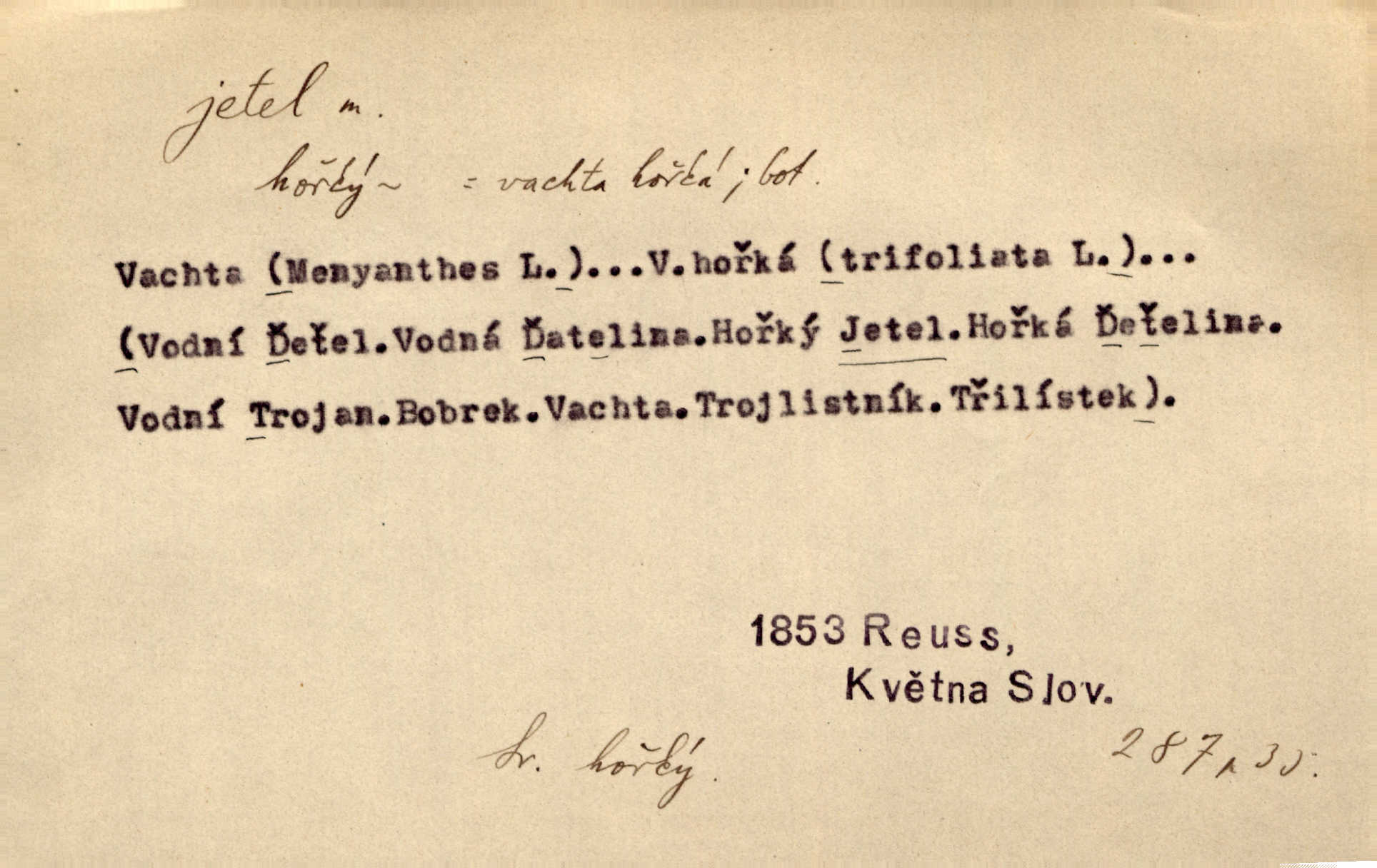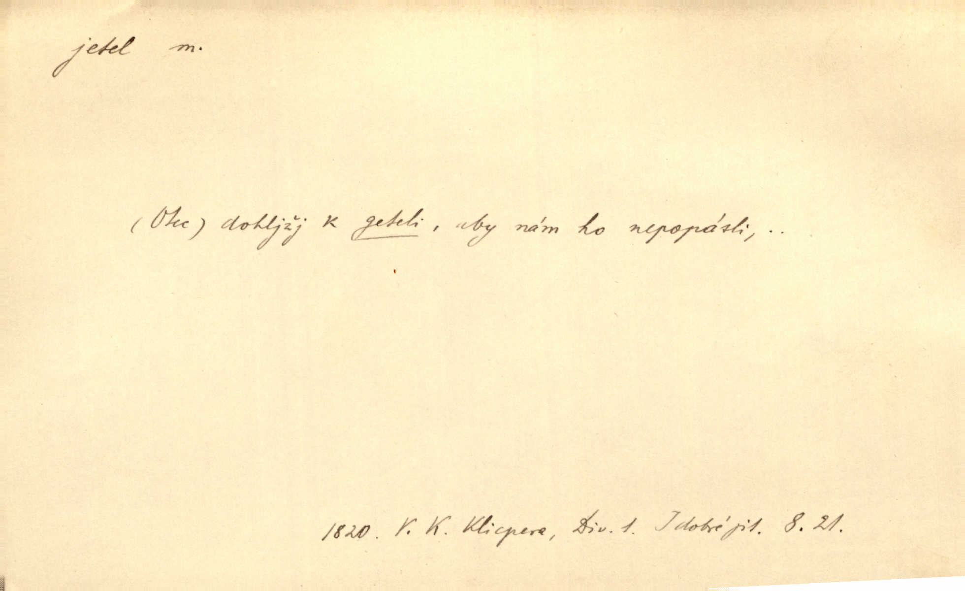 - jetel, -e m. (dial. f.) bot. rod rostlin motýlokvětých (Trifolium). Jetel polní, luční, plazivý a j. Jetel nachový inkarnát, růžák. Jetel strnišťák narostlý po žních na strništi. Hořký jetel vachta třílistá (Menyanthes trifoliata); kozí jetel čilimník odvislý (Cytisus laburnum); zaječí jetel šťavel kyselý (Oxalis acetosella).