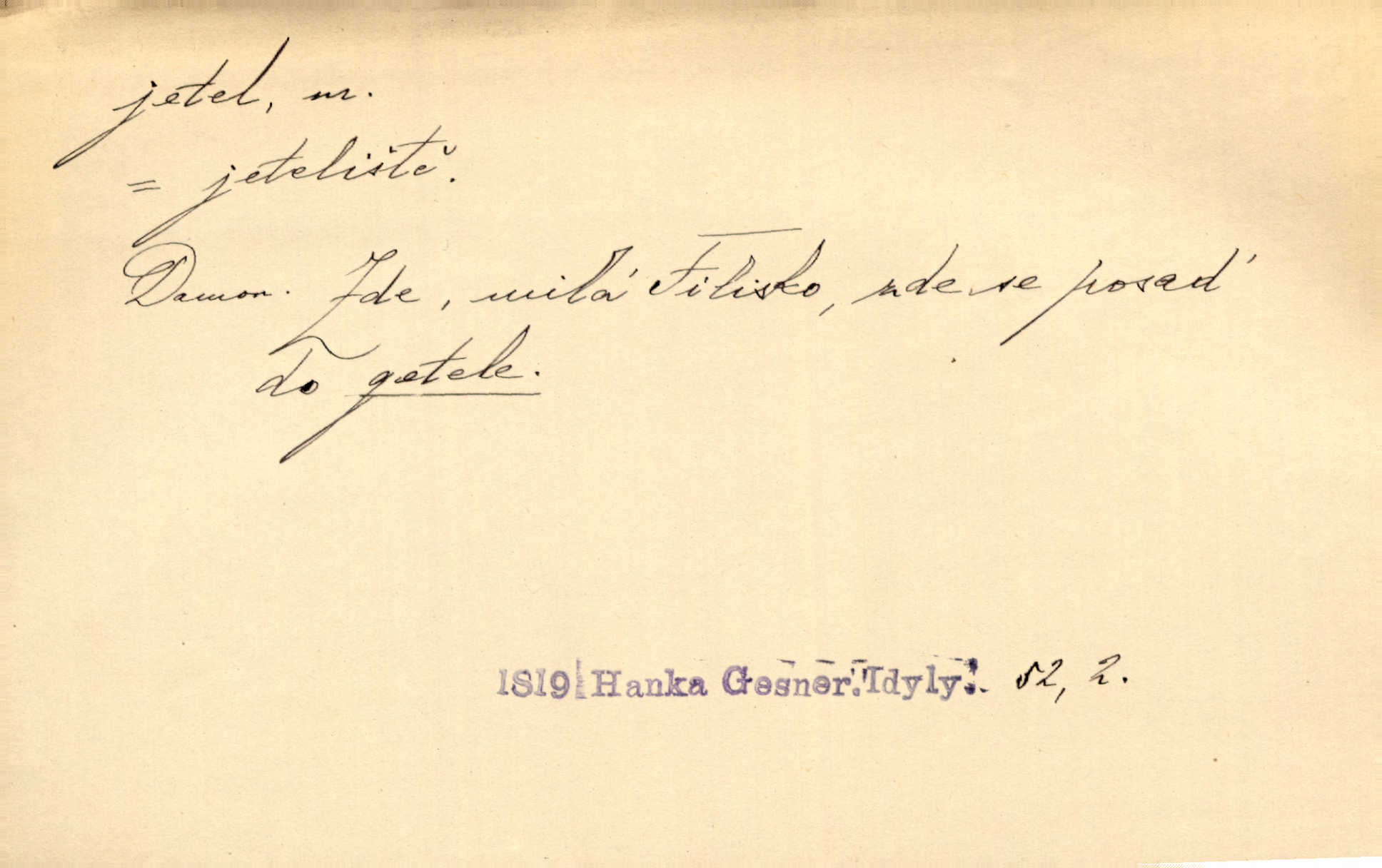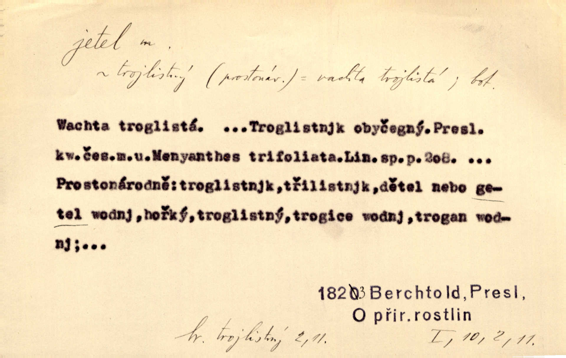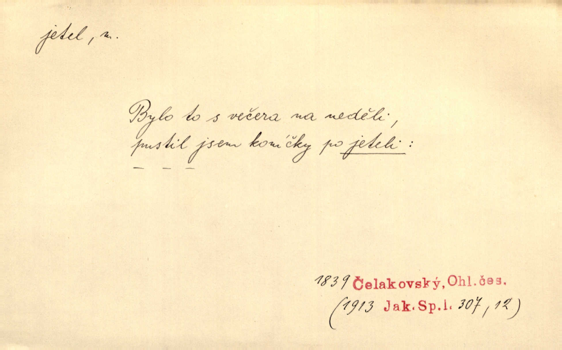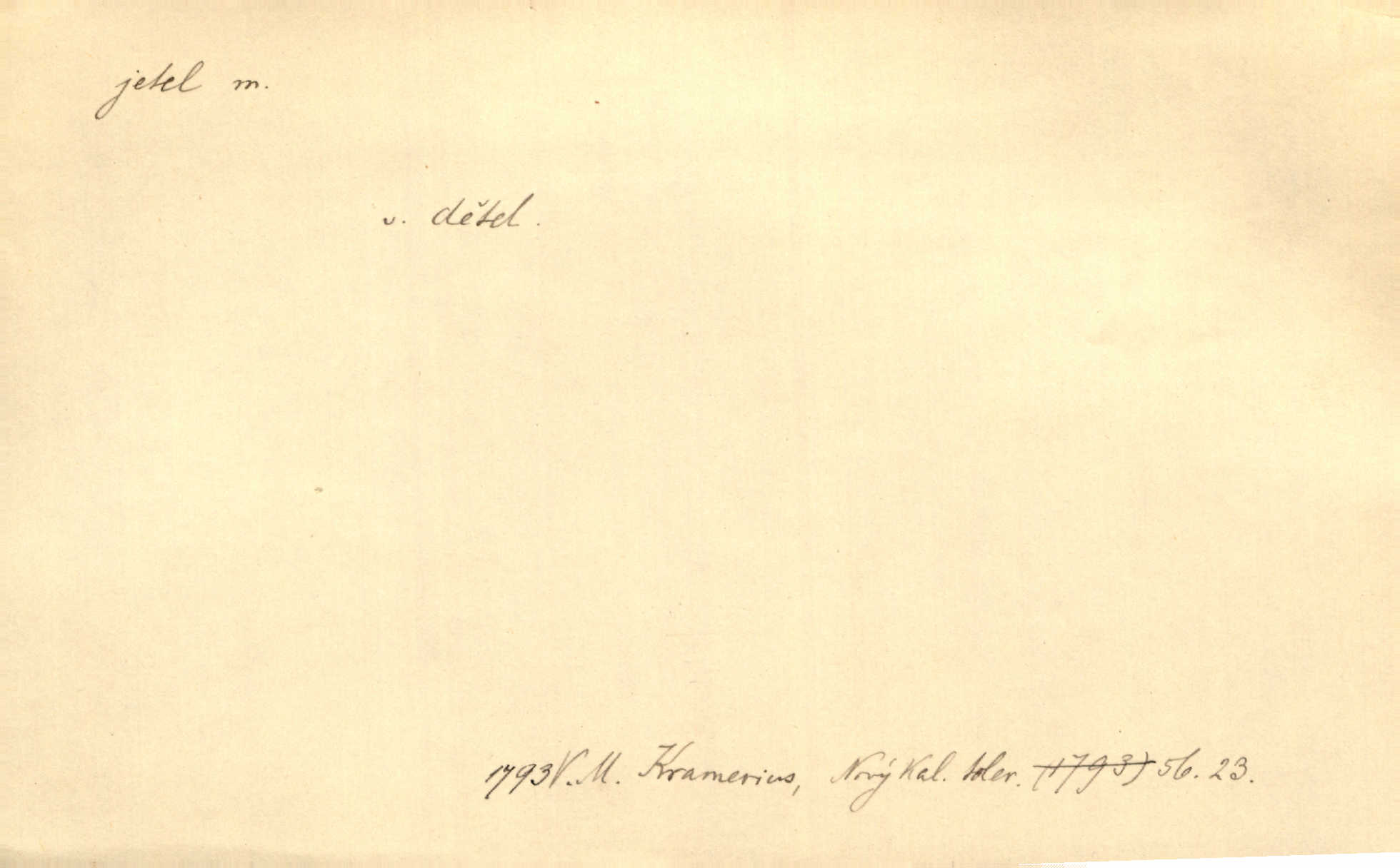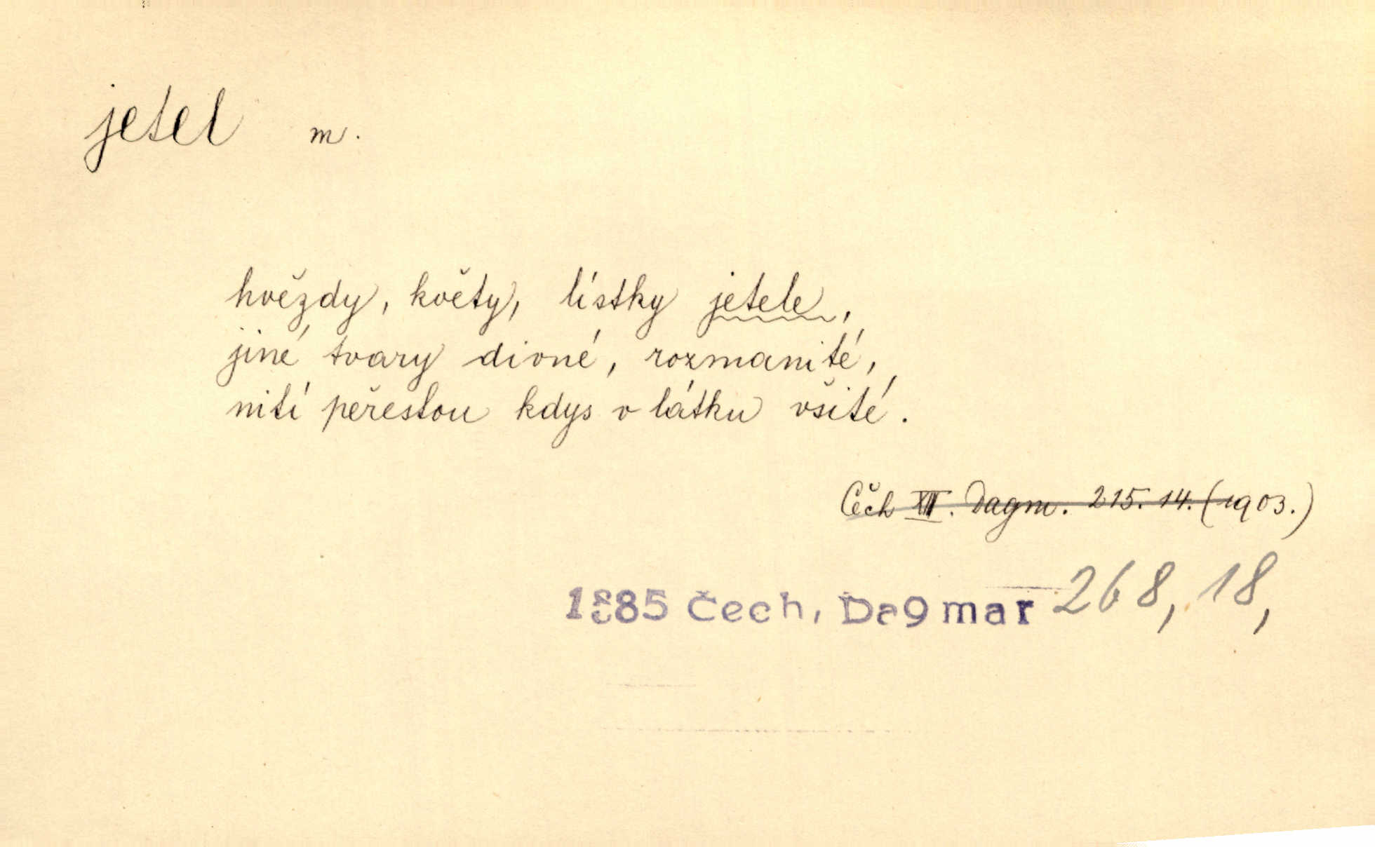 - jetel, -e m. (dial. f.) bot. rod rostlin motýlokvětých (Trifolium). Jetel polní, luční, plazivý a j. Jetel nachový inkarnát, růžák. Jetel strnišťák narostlý po žních na strništi. Hořký jetel vachta třílistá (Menyanthes trifoliata); kozí jetel čilimník odvislý (Cytisus laburnum); zaječí jetel šťavel kyselý (Oxalis acetosella).
