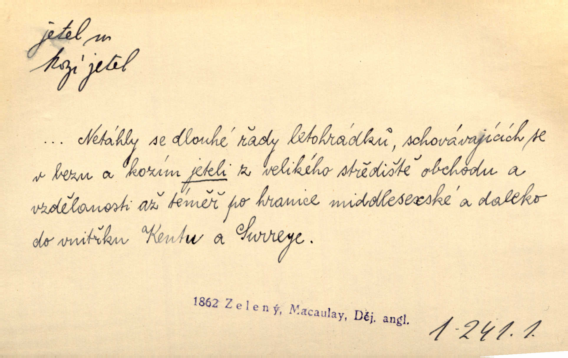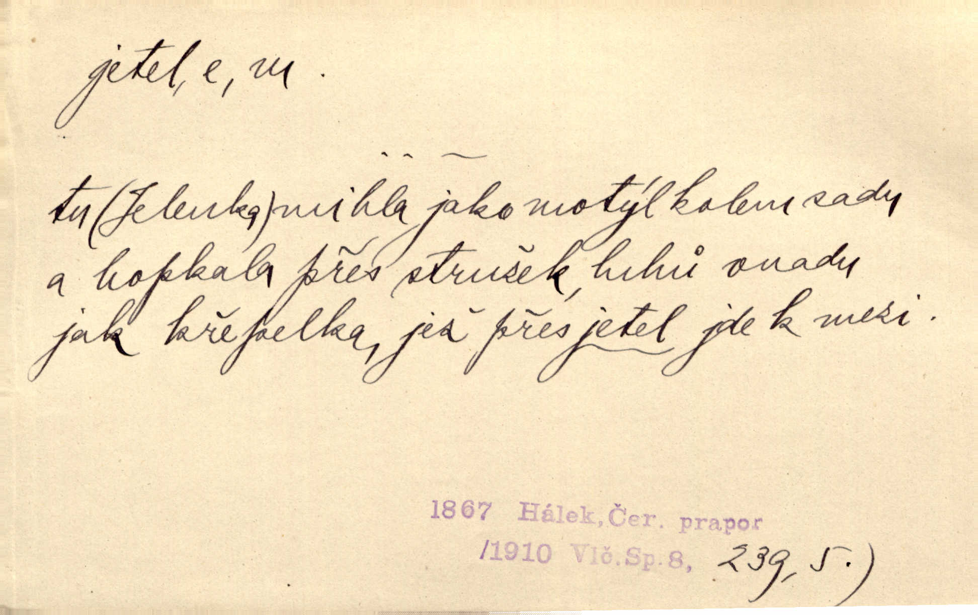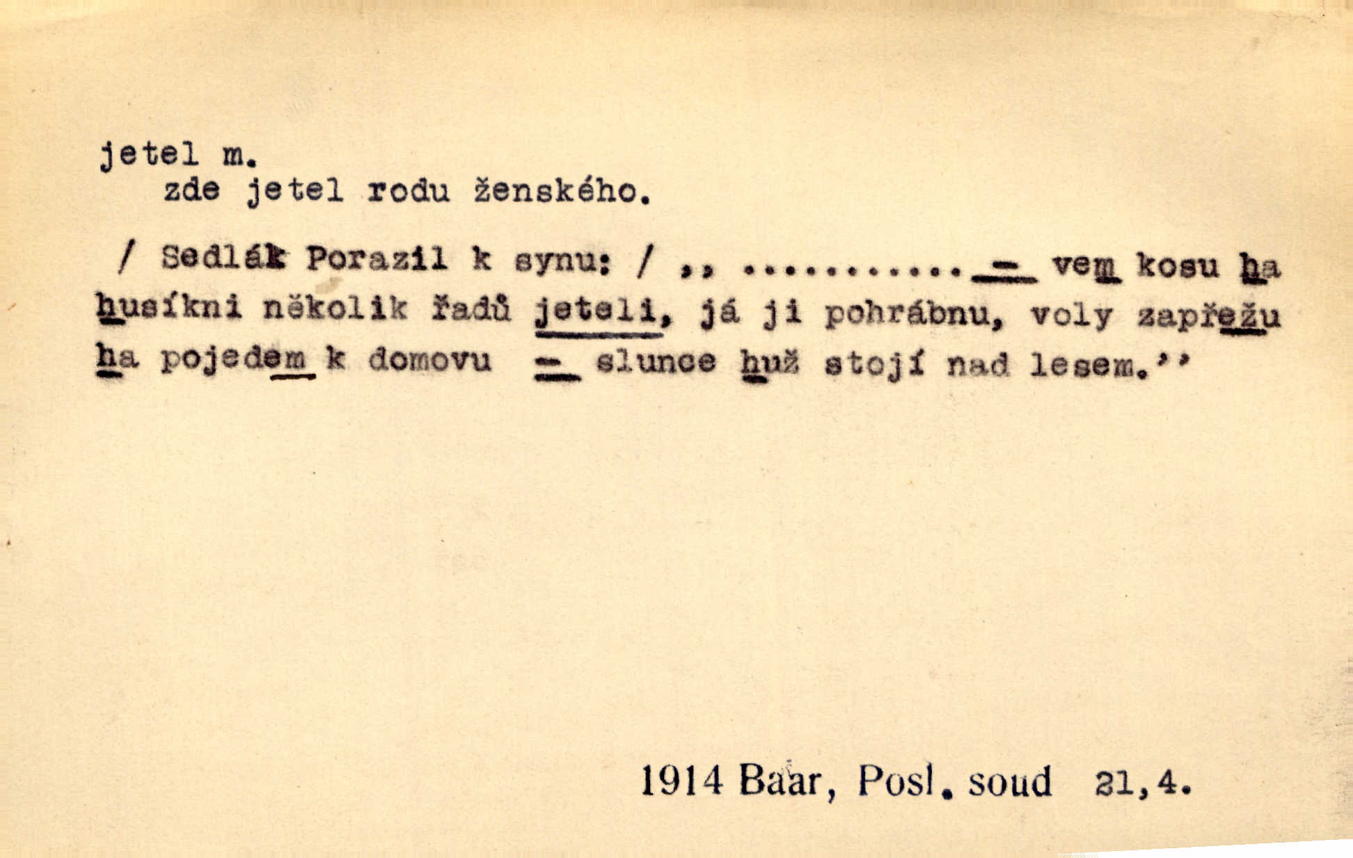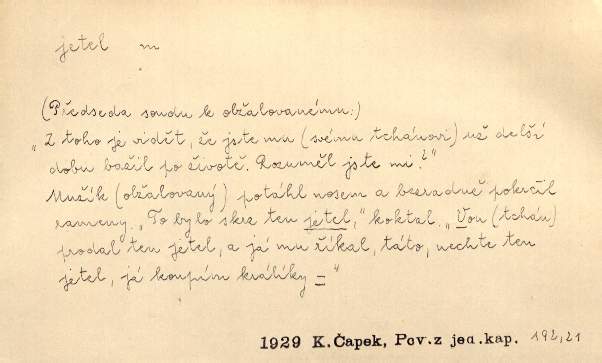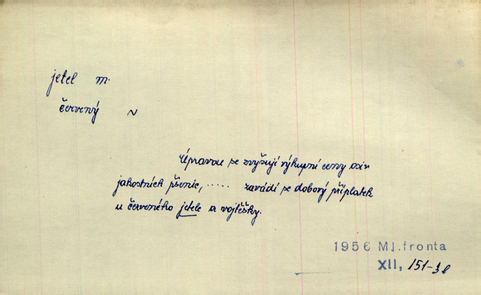 - jetel, -e m. (dial. f.) bot. rod rostlin motýlokvětých (Trifolium). Jetel polní, luční, plazivý a j. Jetel nachový inkarnát, růžák. Jetel strnišťák narostlý po žních na strništi. Hořký jetel vachta třílistá (Menyanthes trifoliata); kozí jetel čilimník odvislý (Cytisus laburnum); zaječí jetel šťavel kyselý (Oxalis acetosella).