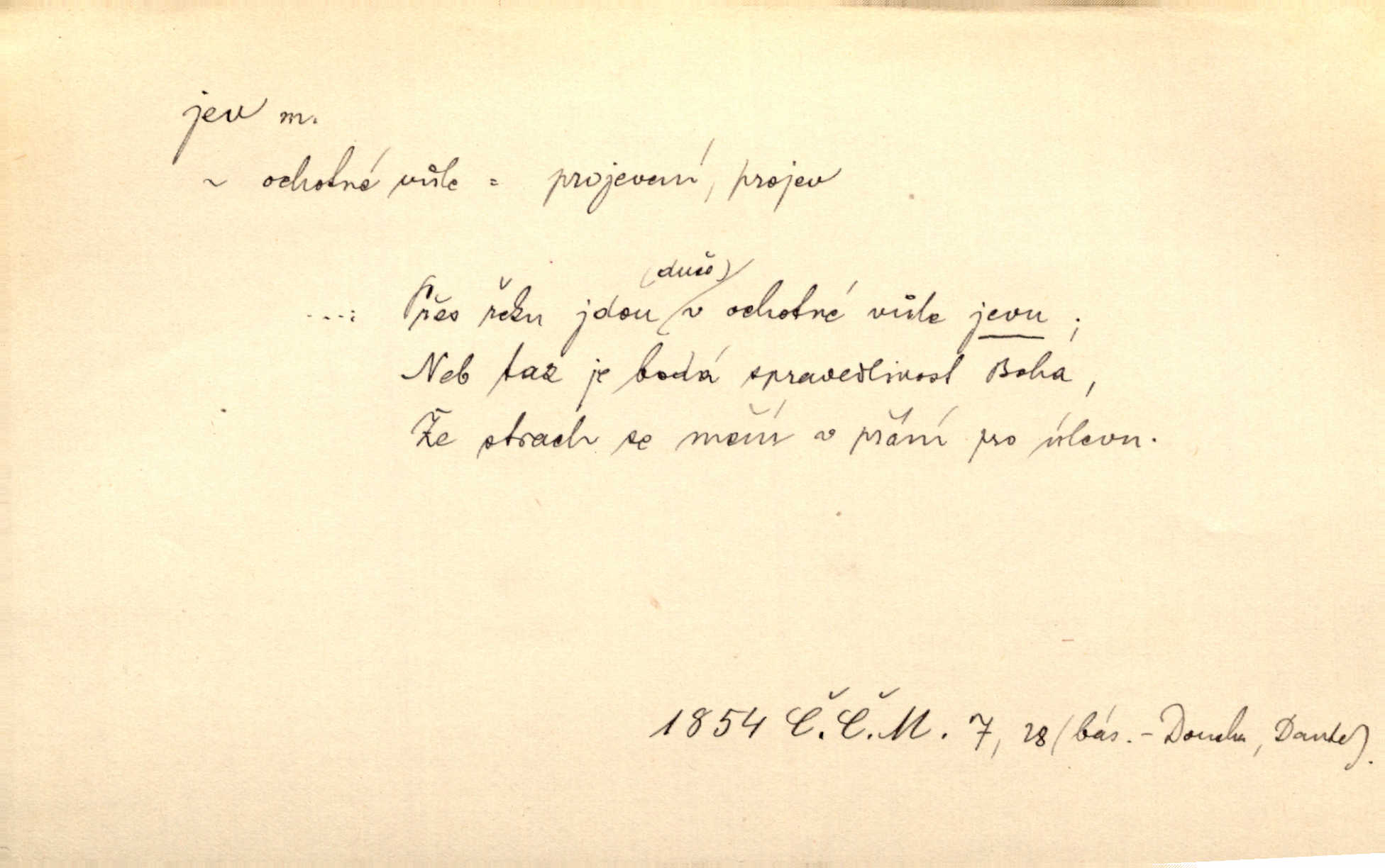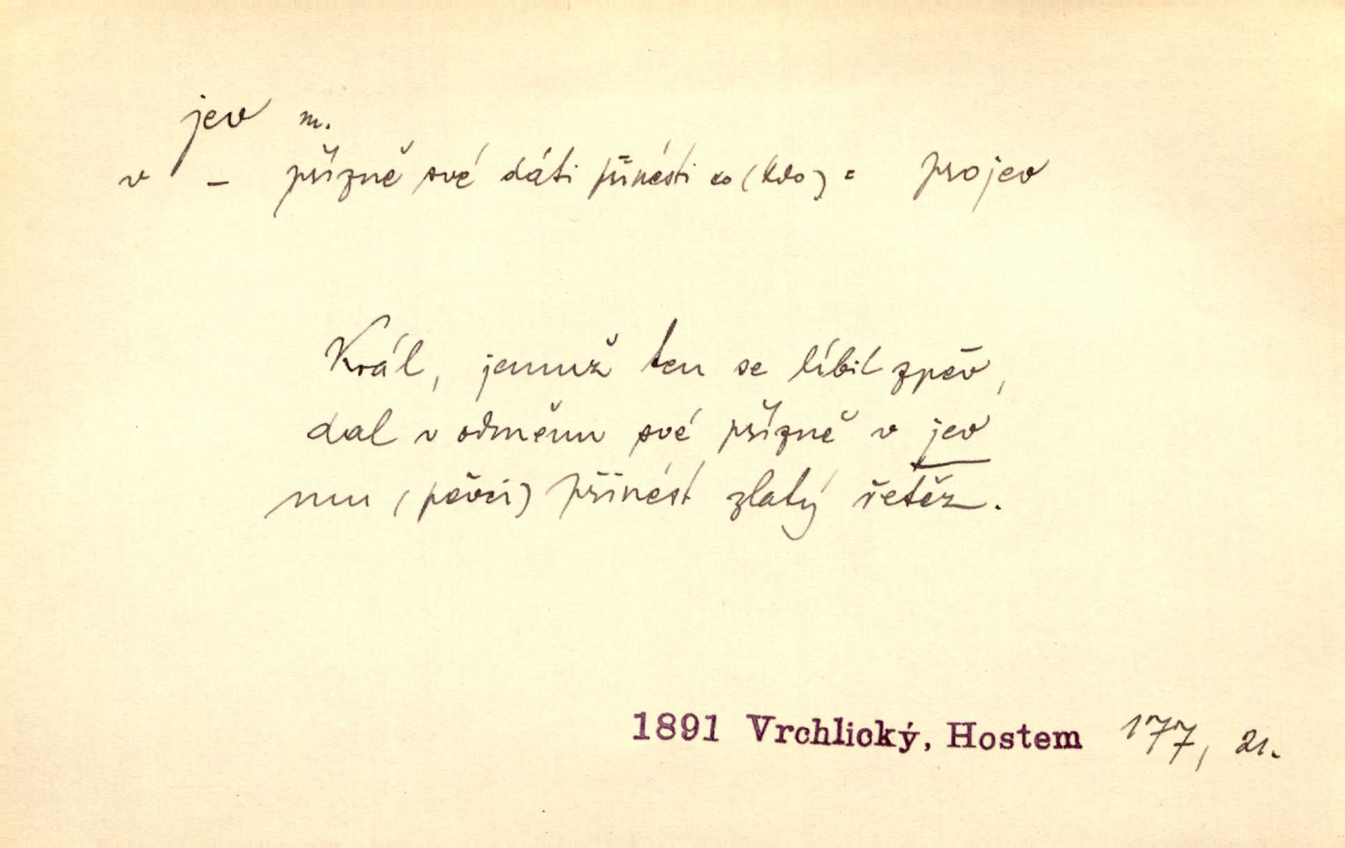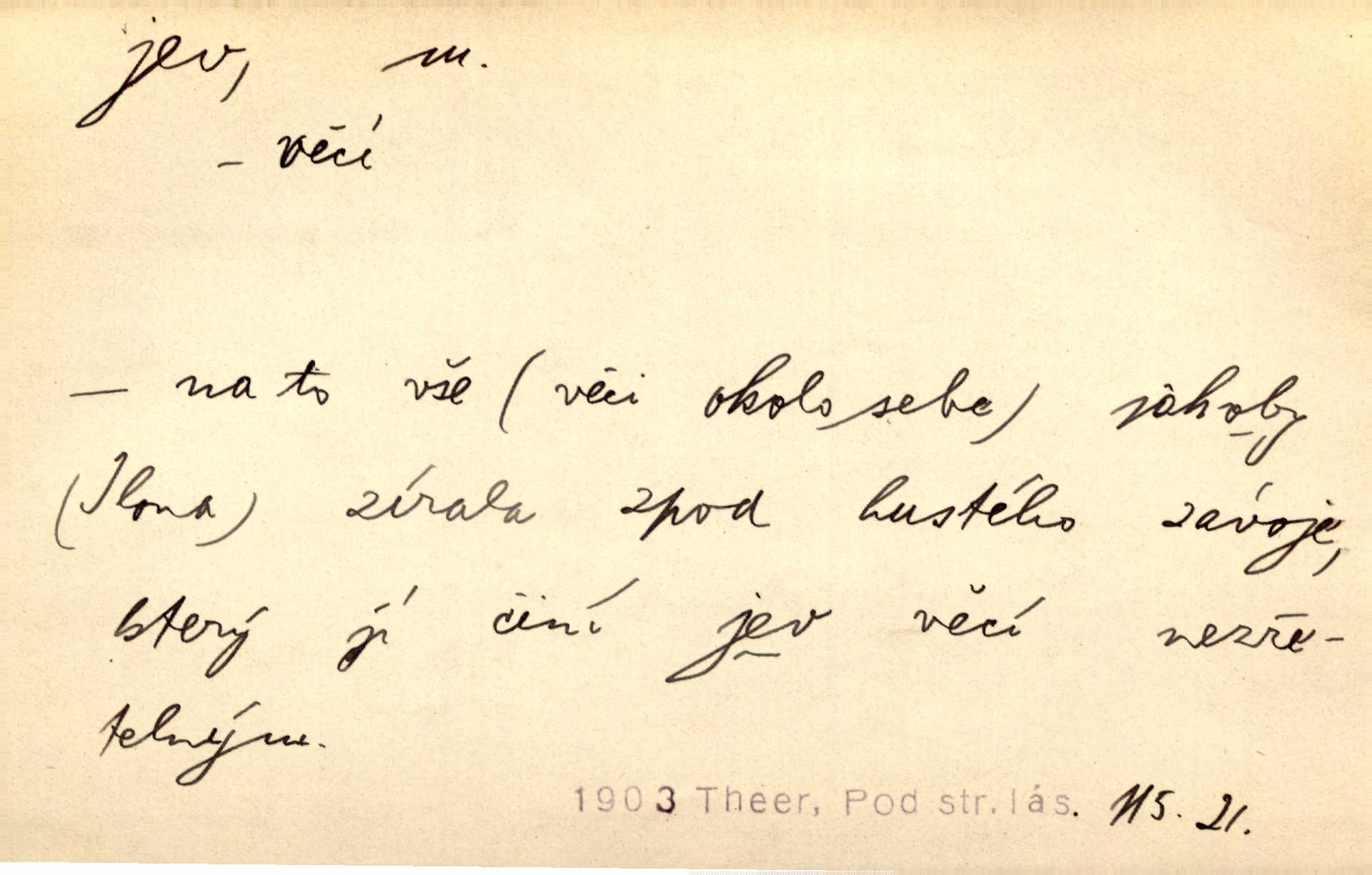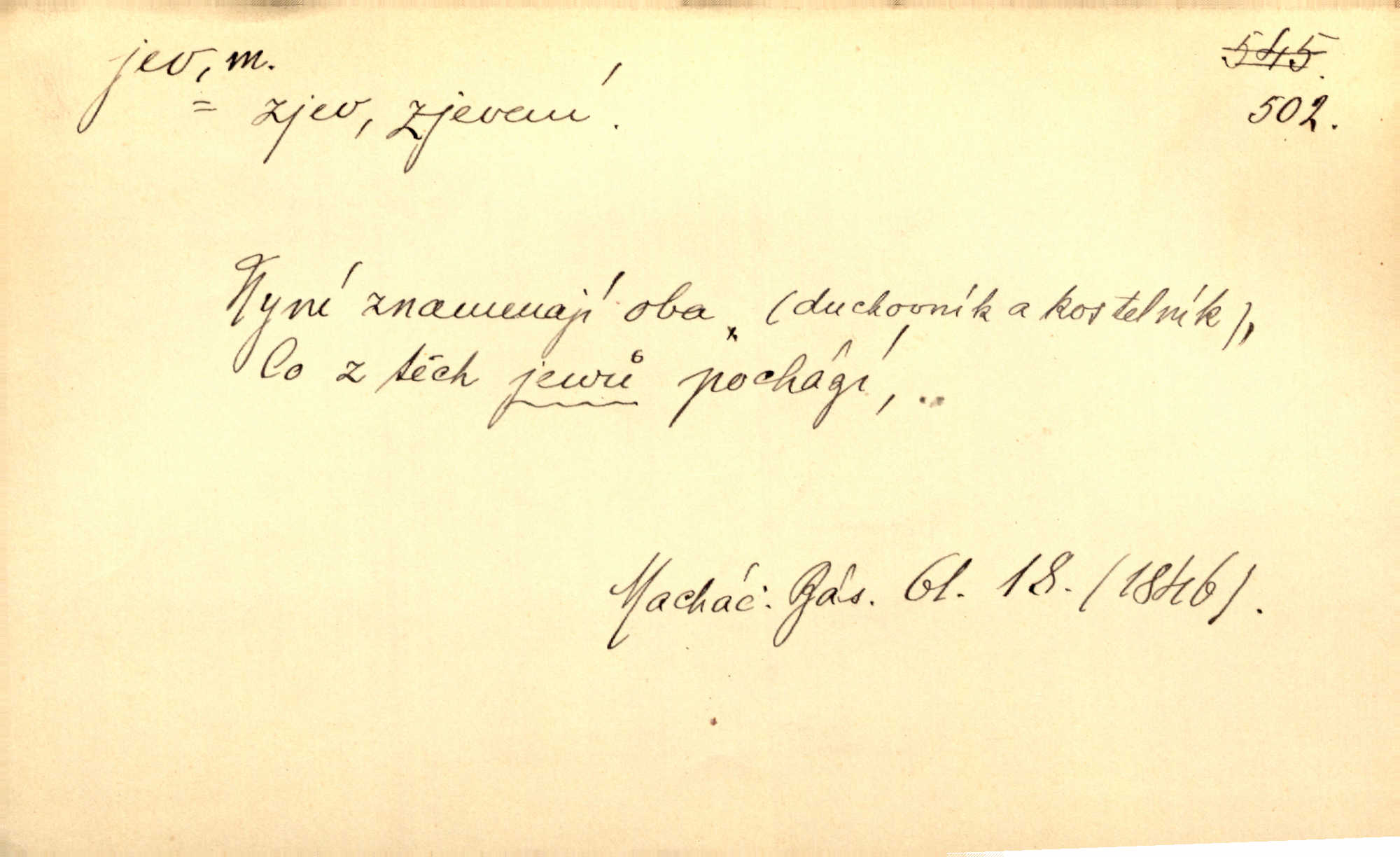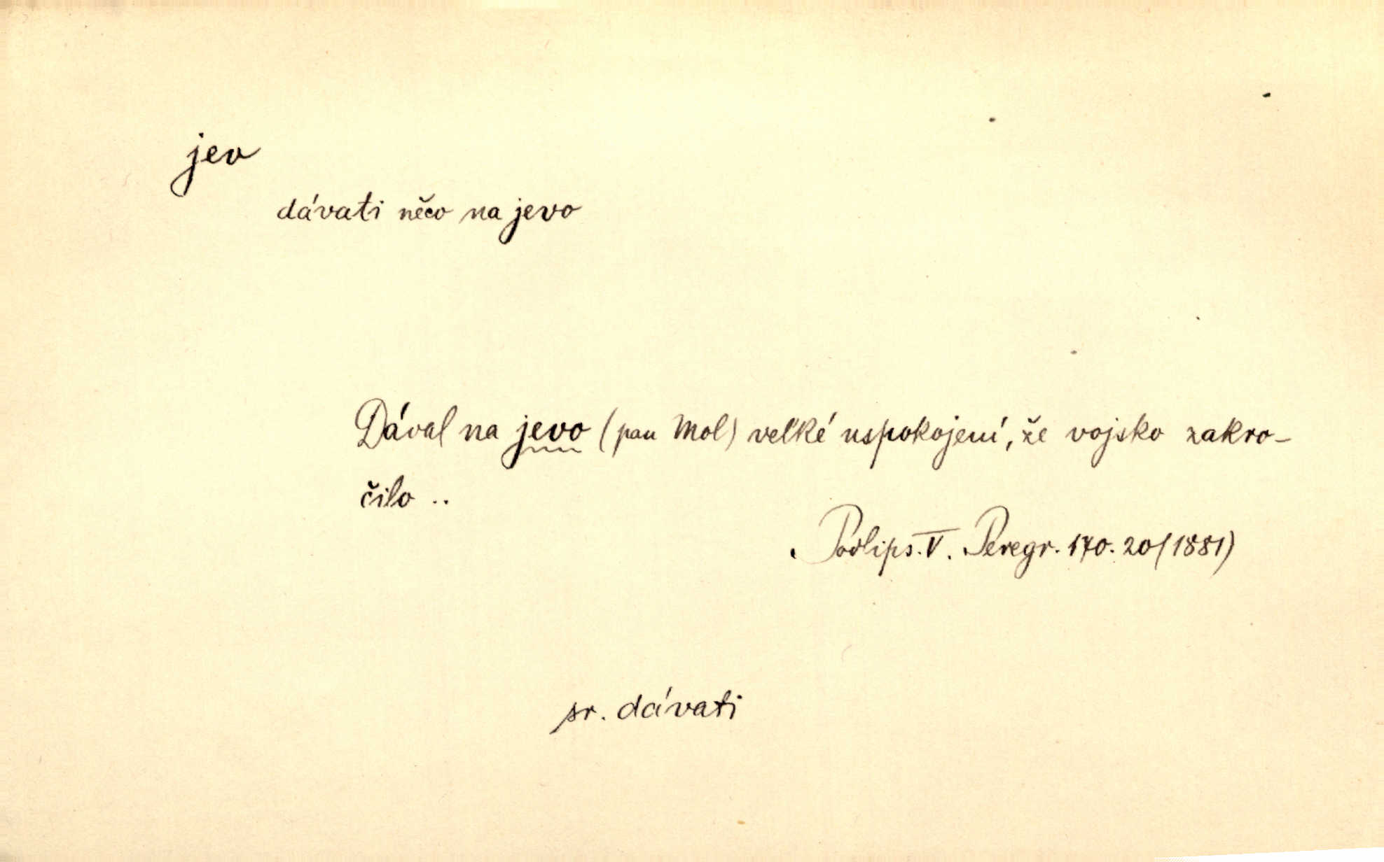 - jev, -u m. úkaz. Děti obrátily se tváří do sálu a zrovna hltaly jevy svého okolí. Kronb. Kongres prohlásil vyznání náboženské za jev, který by obligatorně měl býti při každém sčítání lidu zjišťován. Čes. pol. Dělíme jevy jazykové na fysické a psychické. Ath. Přede vším jisty jsou nám naše jevy duševní, rozličné stavy našeho vědomí. Mas. Gram. jevy fonetické, hláskové, syntaktické. D Zř. projevení. Každá empirická chvíle, byť na pohled a jev sebe krásnější a ohnivější, vykuklí se Máchovi záhy v starý mučivý osten. Šal. Není třeba, abych vyčítával, čím pan hrabě, obce příznivec, vždy svou dobrou vůli na jev dával. F. S. Proch. Mé všechny rány by pak přišly v jev najevo. Mach. Brzo vstoupí [nepřítel] v jev na pláň světlou. Quis.