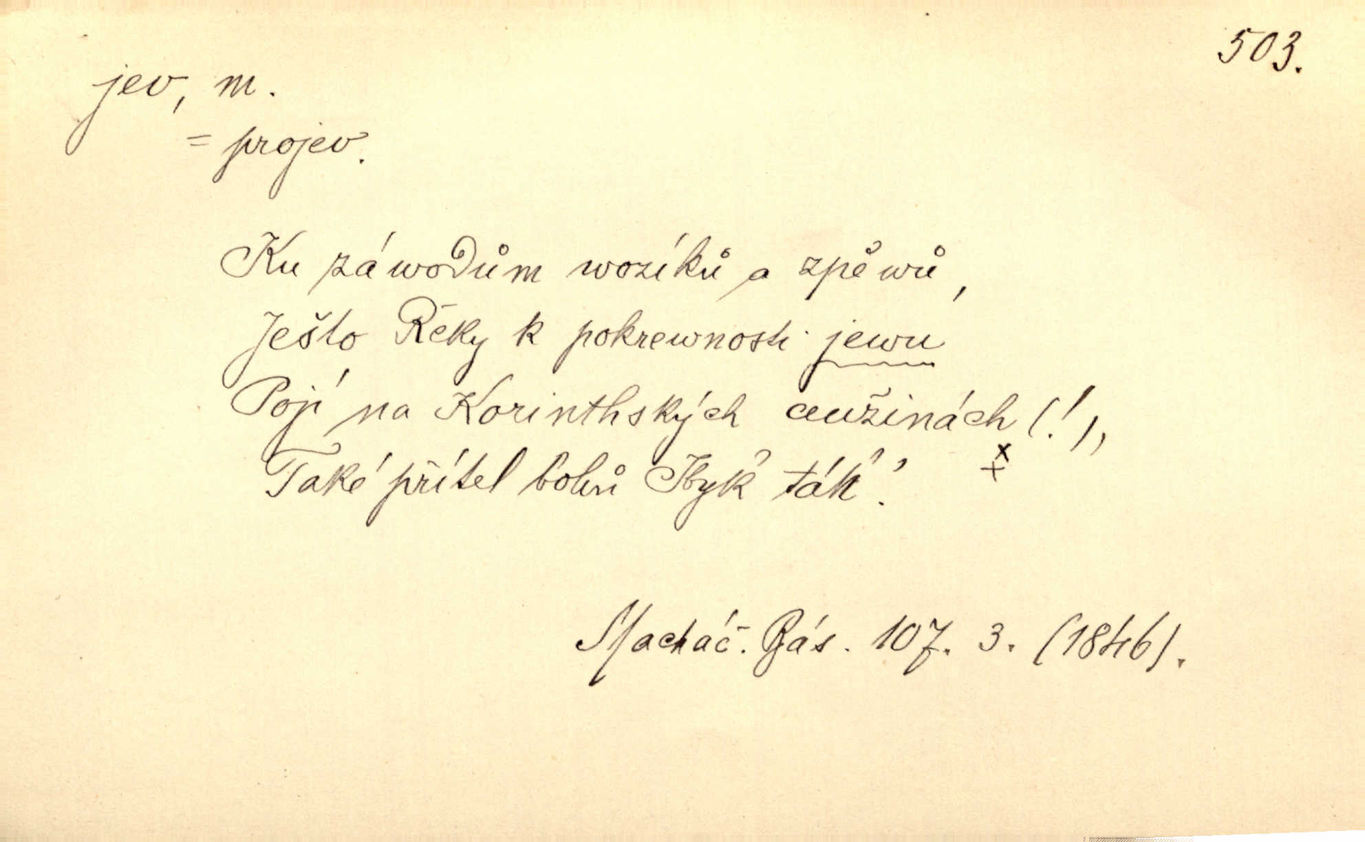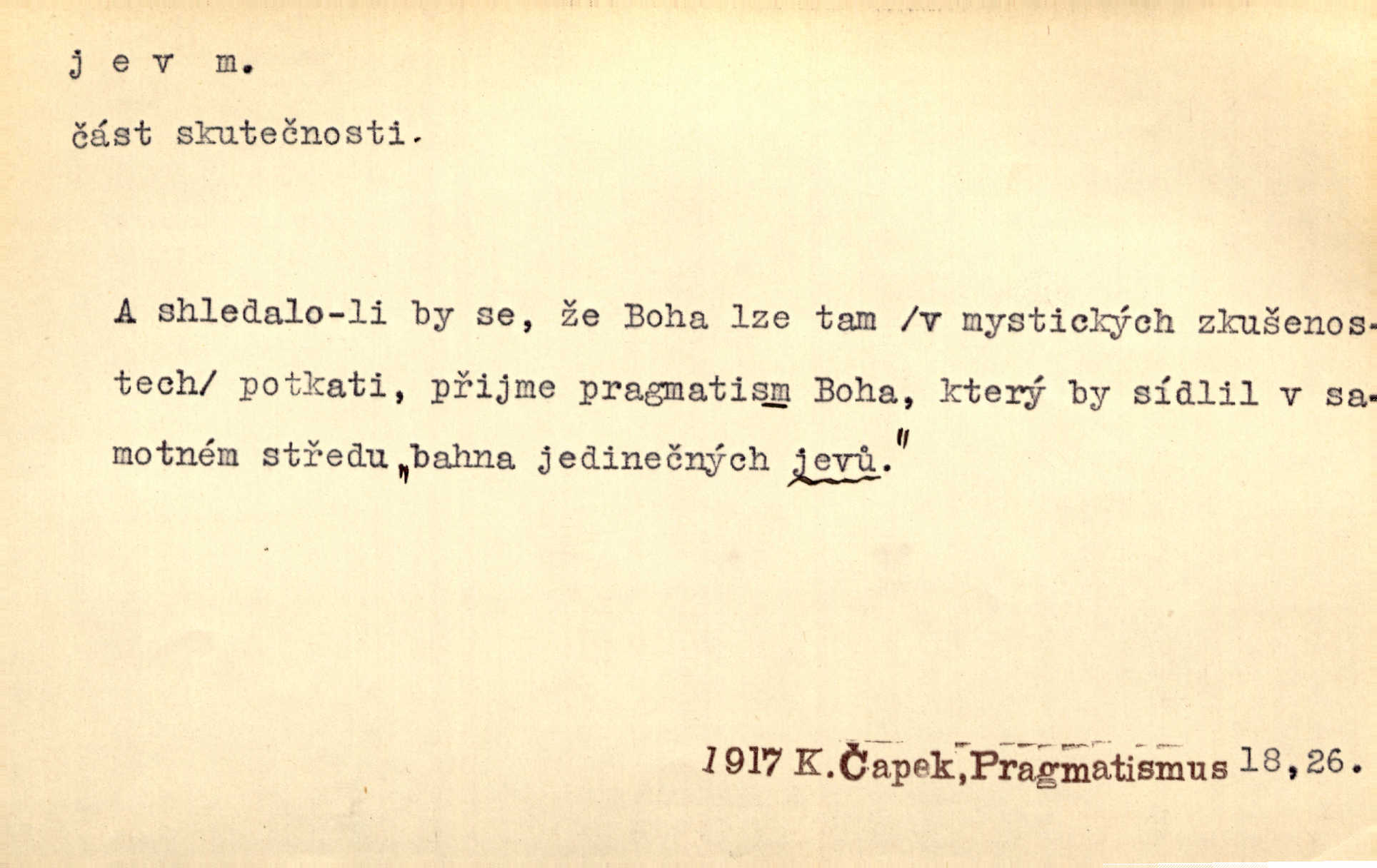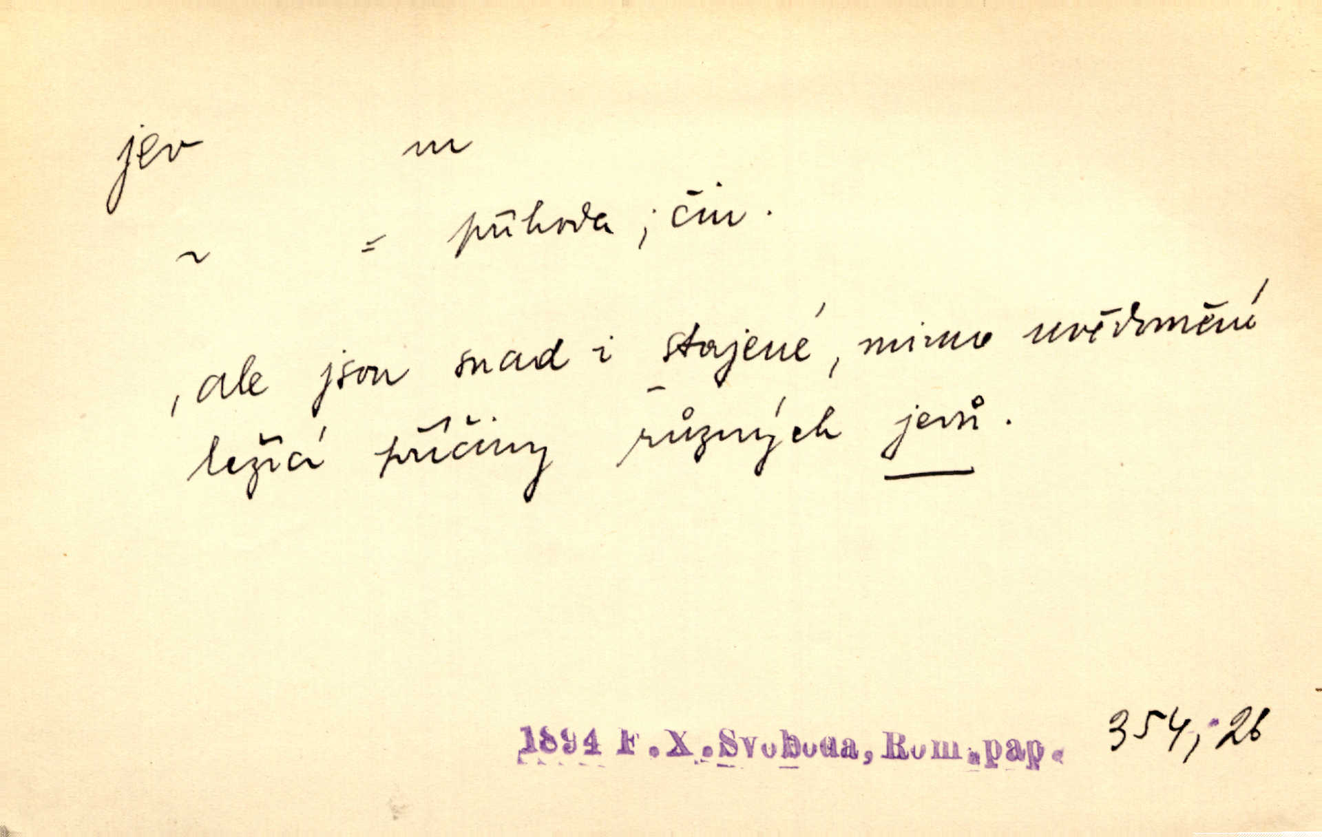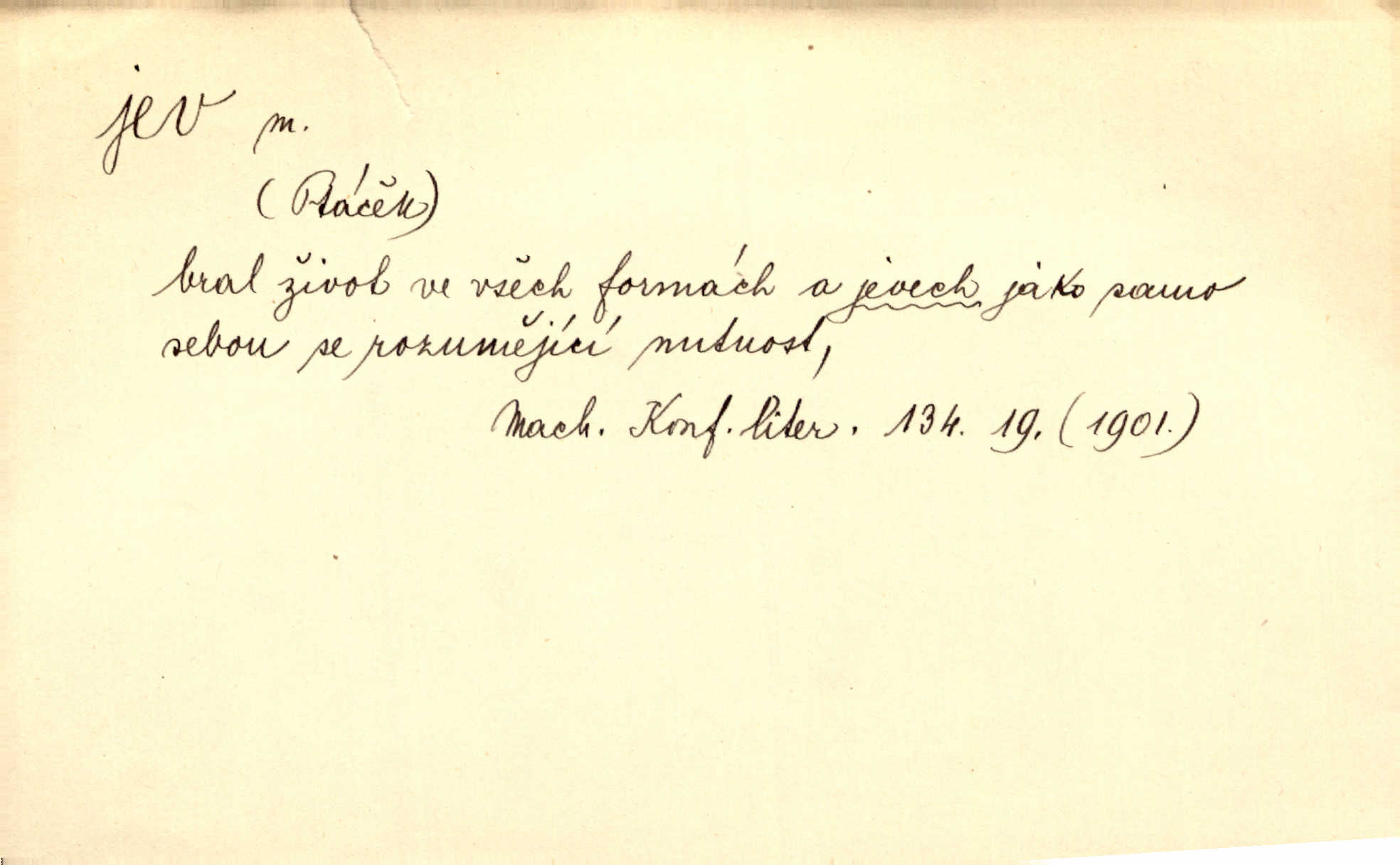 - jev, -u m. úkaz. Děti obrátily se tváří do sálu a zrovna hltaly jevy svého okolí. Kronb. Kongres prohlásil vyznání náboženské za jev, který by obligatorně měl býti při každém sčítání lidu zjišťován. Čes. pol. Dělíme jevy jazykové na fysické a psychické. Ath. Přede vším jisty jsou nám naše jevy duševní, rozličné stavy našeho vědomí. Mas. Gram. jevy fonetické, hláskové, syntaktické. D Zř. projevení. Každá empirická chvíle, byť na pohled a jev sebe krásnější a ohnivější, vykuklí se Máchovi záhy v starý mučivý osten. Šal. Není třeba, abych vyčítával, čím pan hrabě, obce příznivec, vždy svou dobrou vůli na jev dával. F. S. Proch. Mé všechny rány by pak přišly v jev najevo. Mach. Brzo vstoupí [nepřítel] v jev na pláň světlou. Quis.