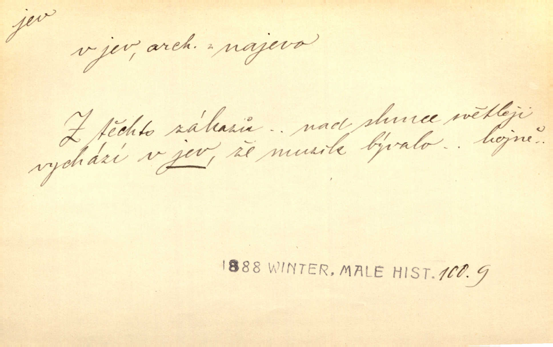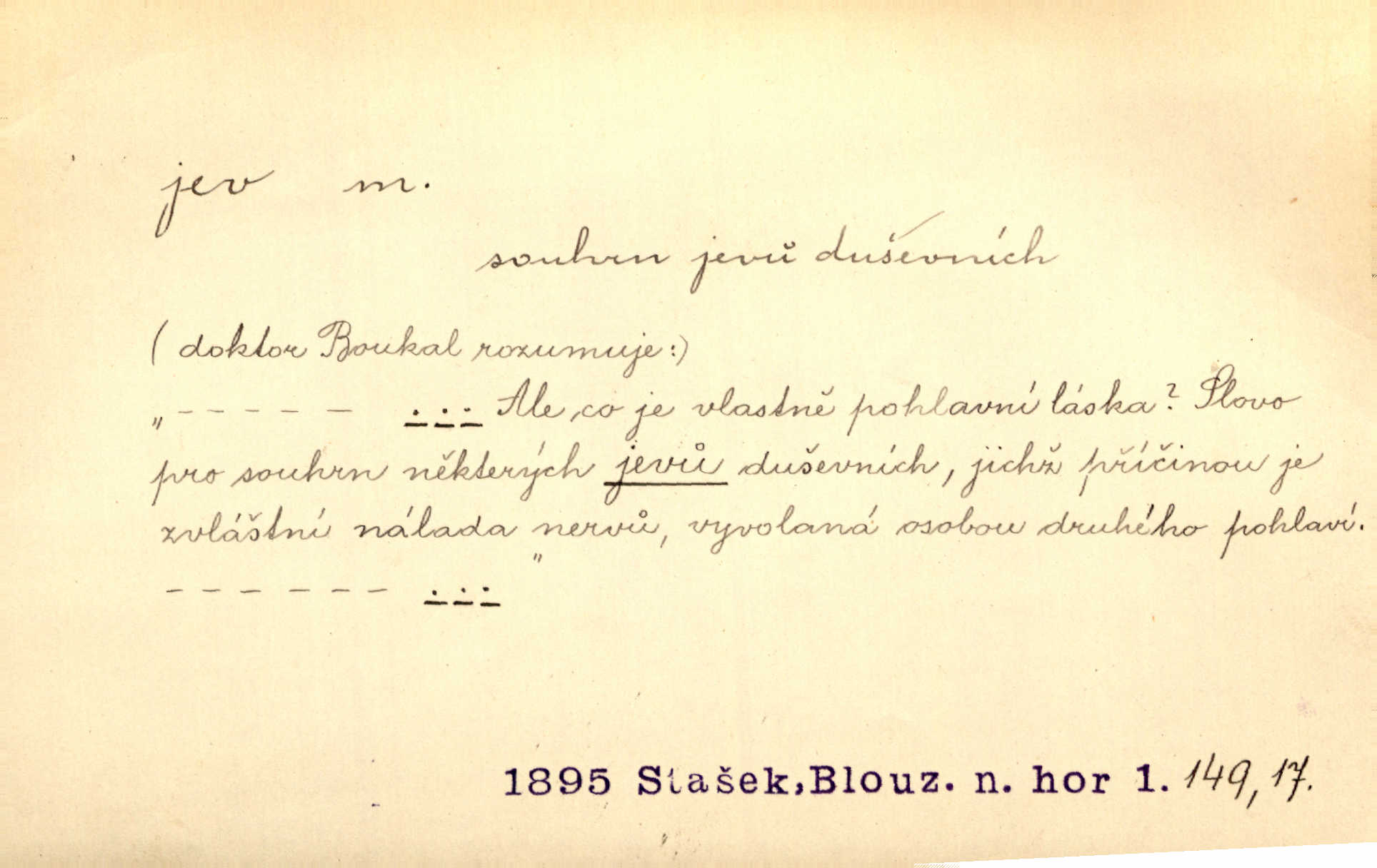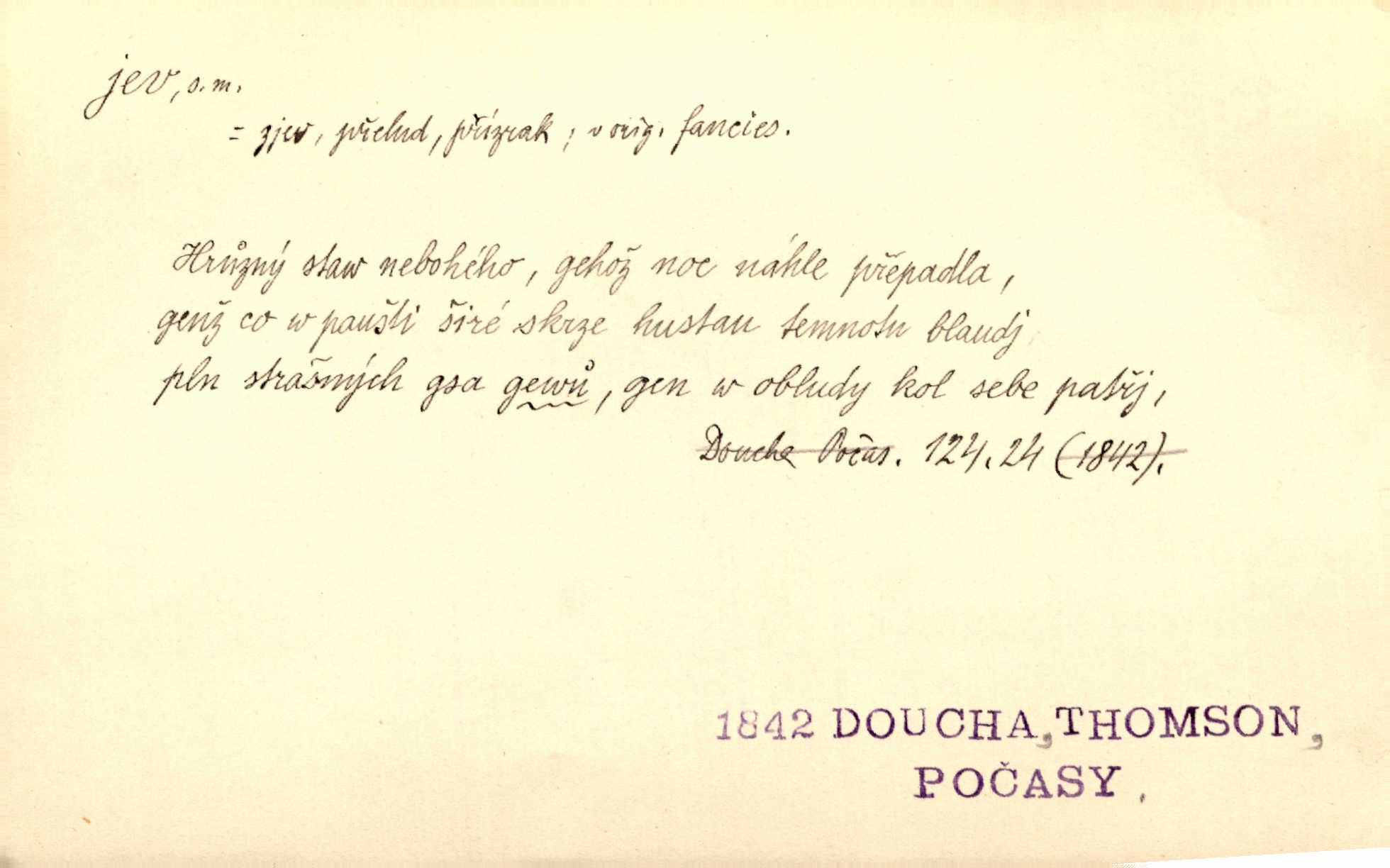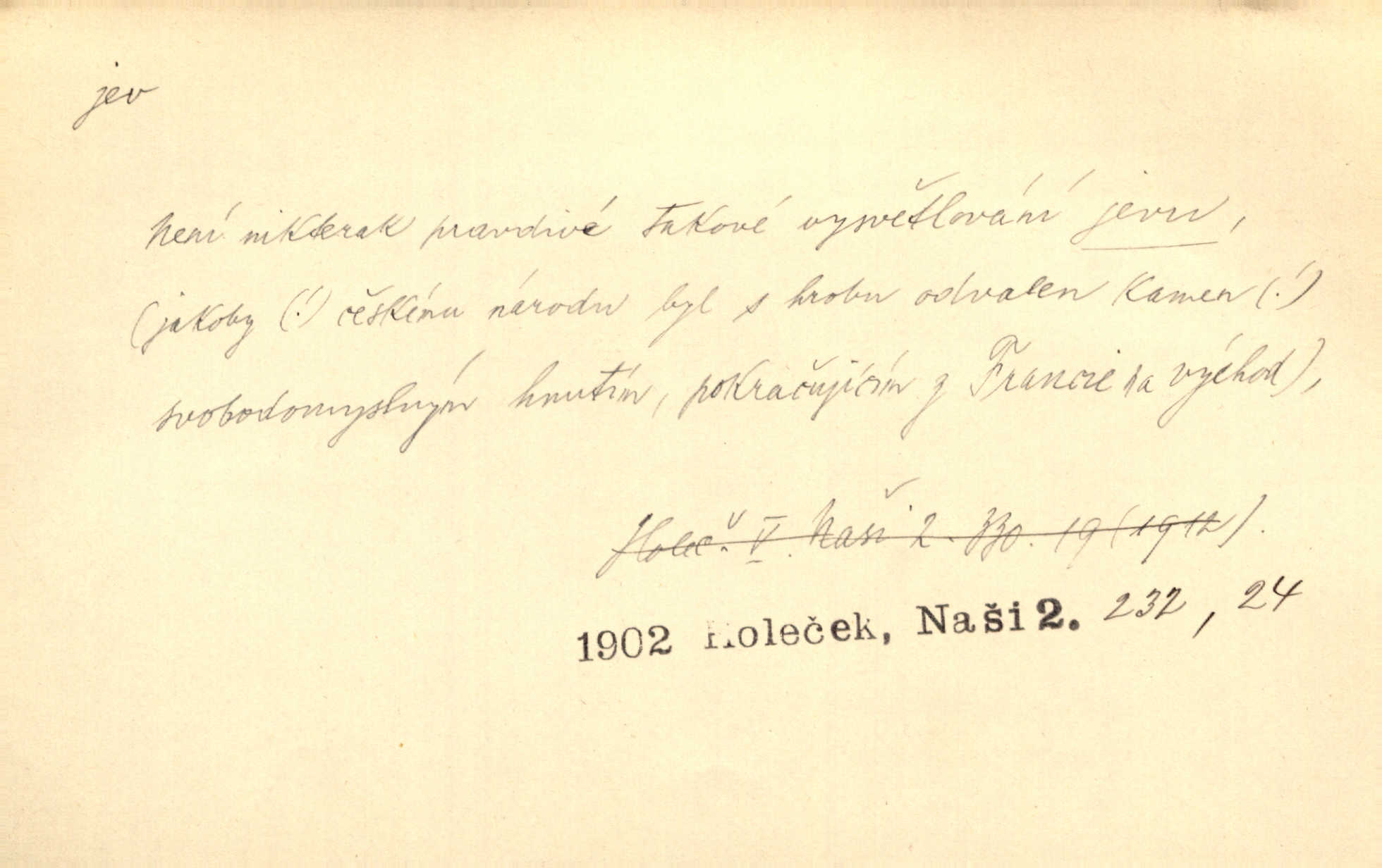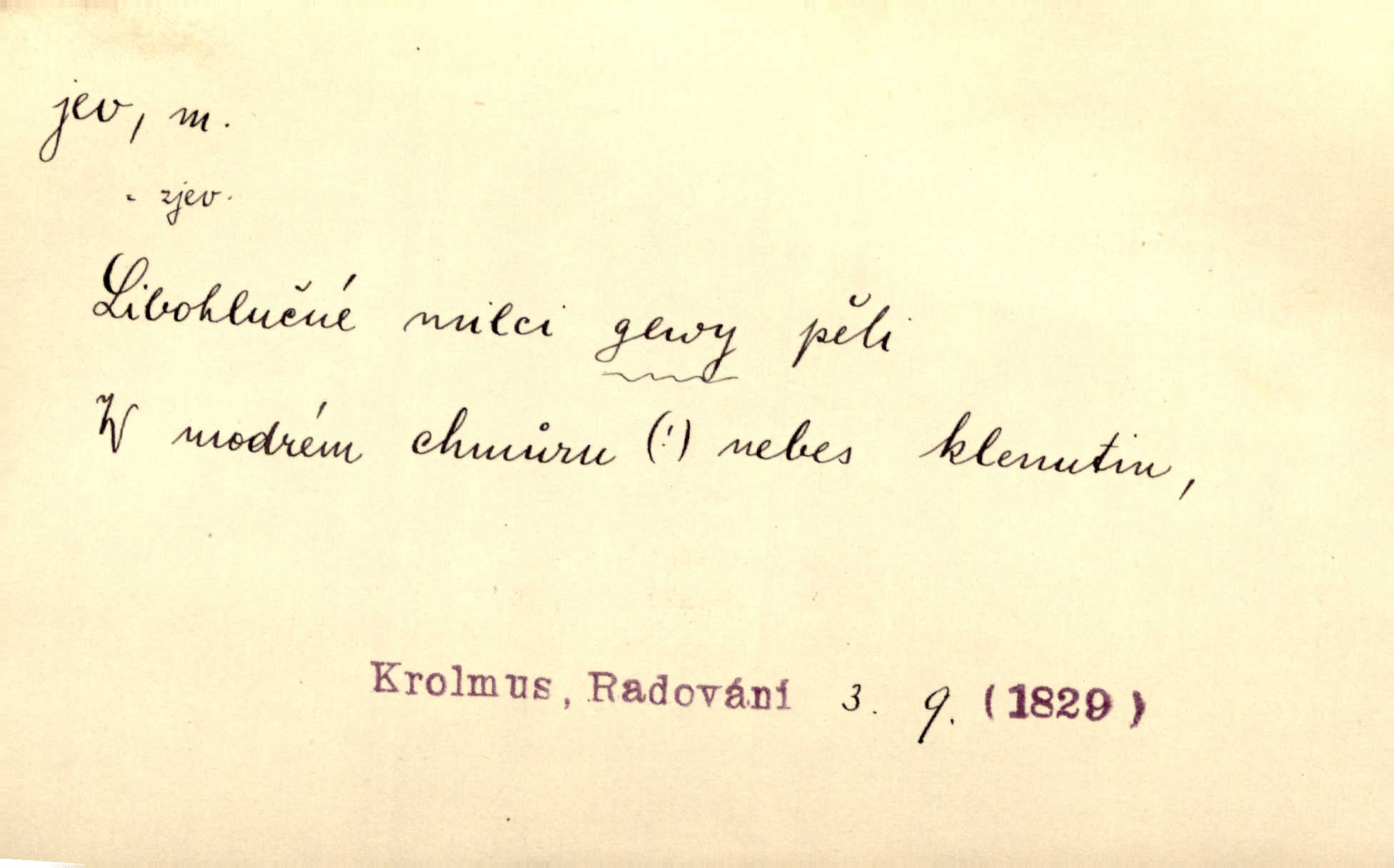 - jev, -u m. úkaz. Děti obrátily se tváří do sálu a zrovna hltaly jevy svého okolí. Kronb. Kongres prohlásil vyznání náboženské za jev, který by obligatorně měl býti při každém sčítání lidu zjišťován. Čes. pol. Dělíme jevy jazykové na fysické a psychické. Ath. Přede vším jisty jsou nám naše jevy duševní, rozličné stavy našeho vědomí. Mas. Gram. jevy fonetické, hláskové, syntaktické. D Zř. projevení. Každá empirická chvíle, byť na pohled a jev sebe krásnější a ohnivější, vykuklí se Máchovi záhy v starý mučivý osten. Šal. Není třeba, abych vyčítával, čím pan hrabě, obce příznivec, vždy svou dobrou vůli na jev dával. F. S. Proch. Mé všechny rány by pak přišly v jev najevo. Mach. Brzo vstoupí [nepřítel] v jev na pláň světlou. Quis.