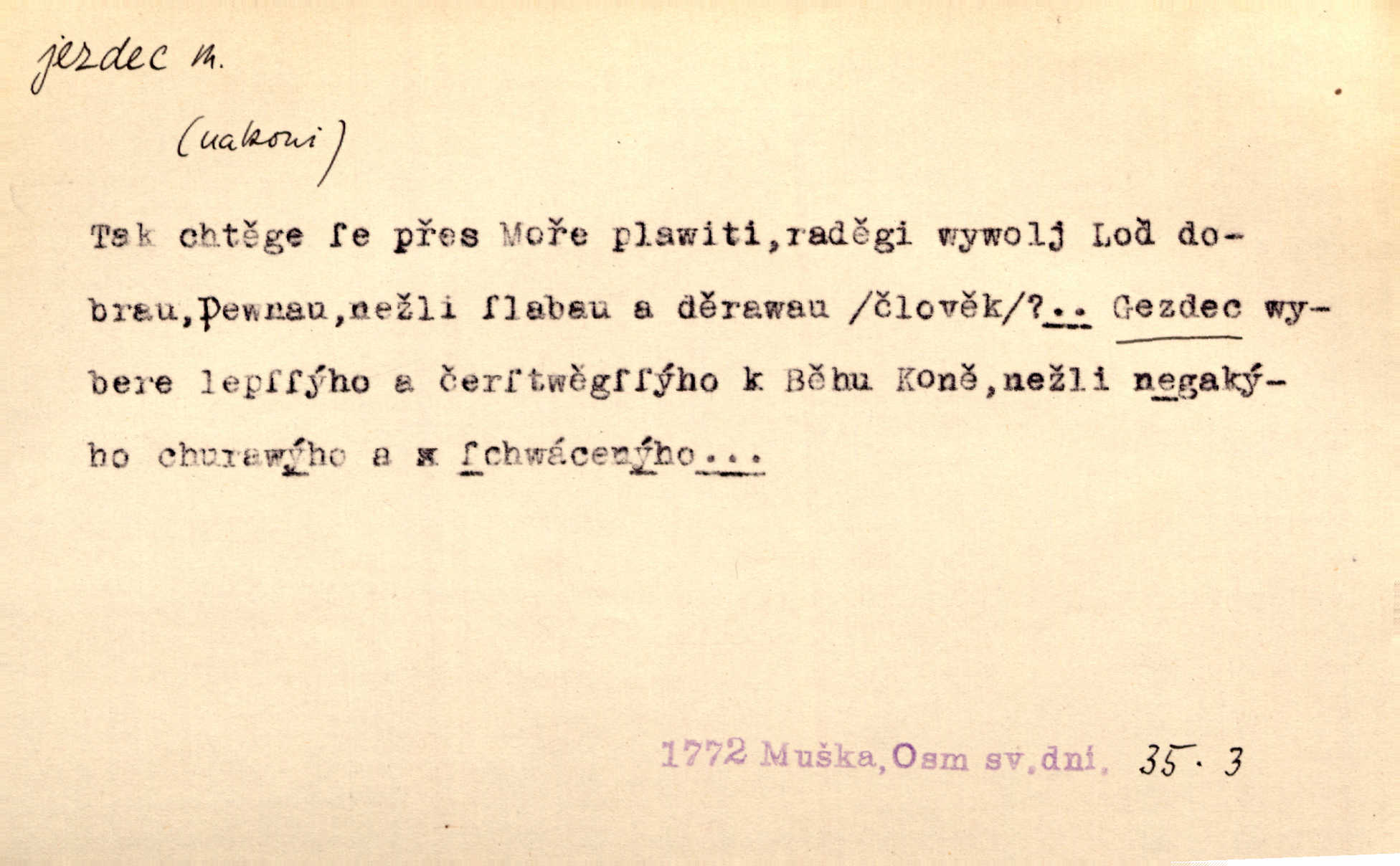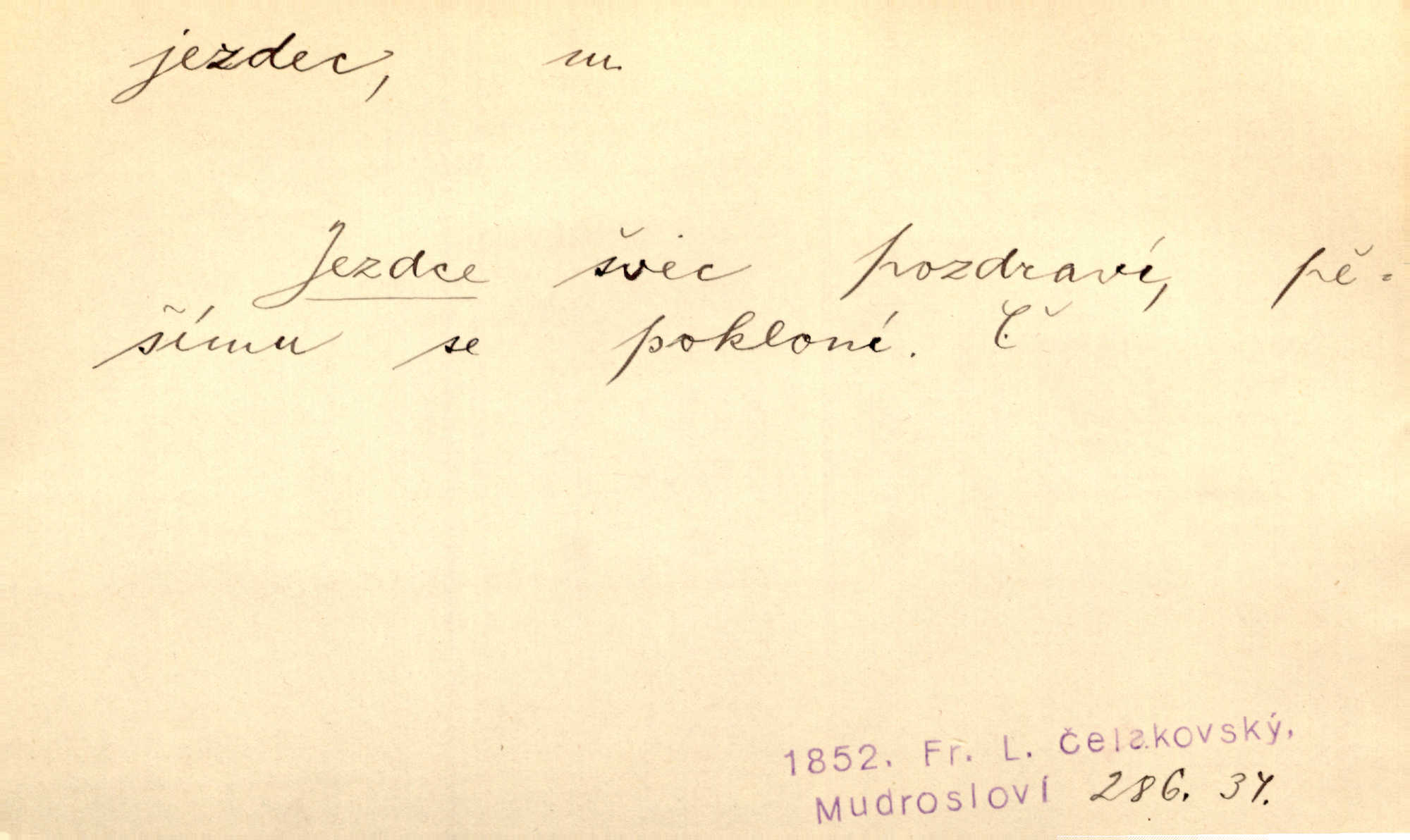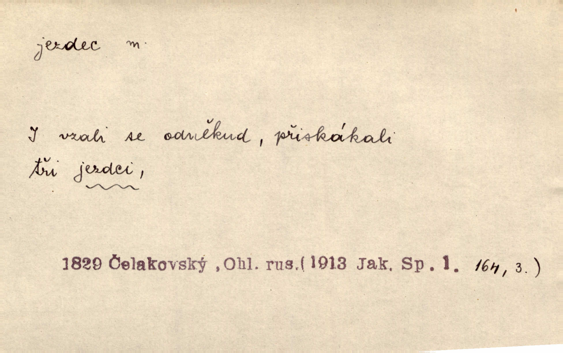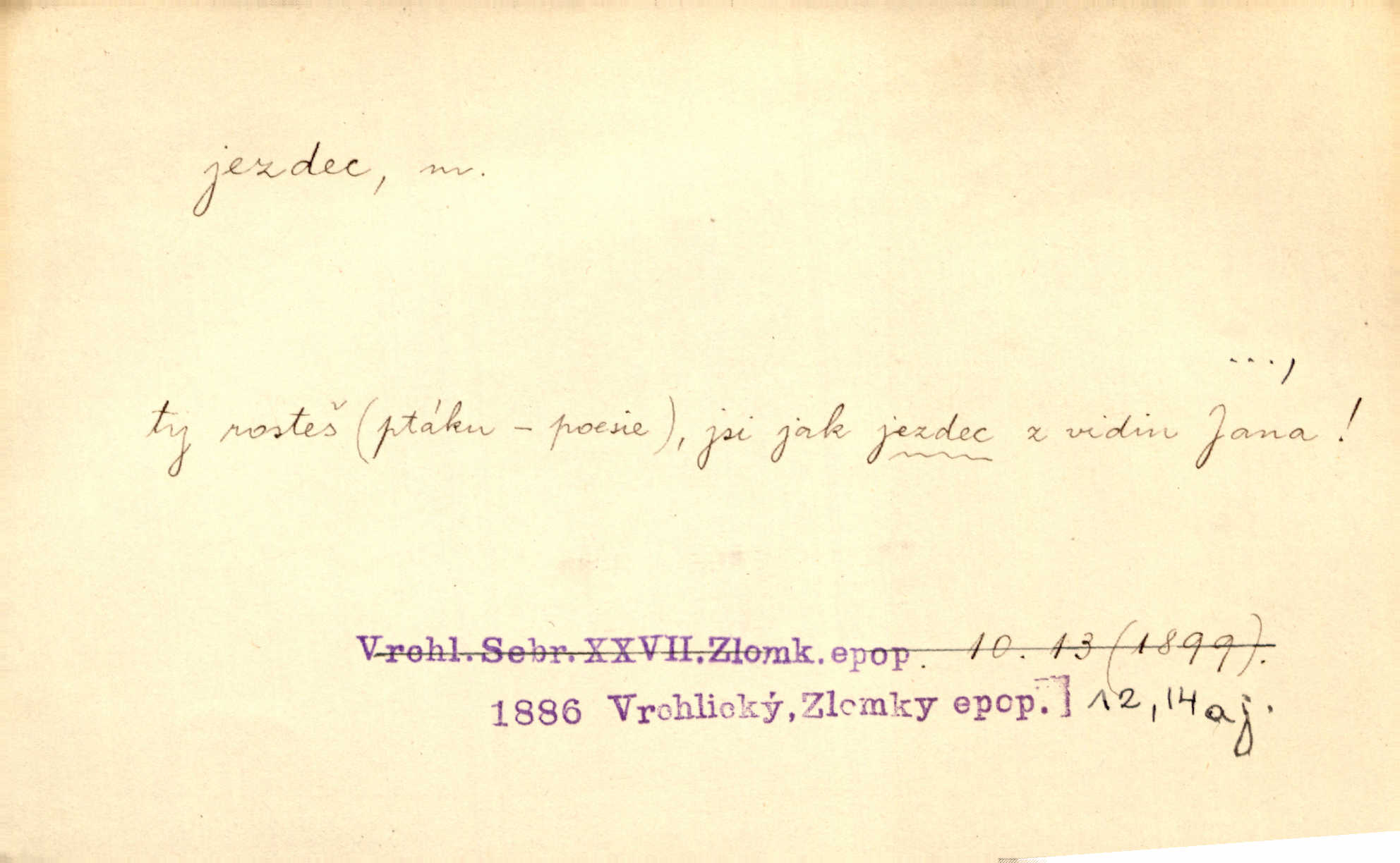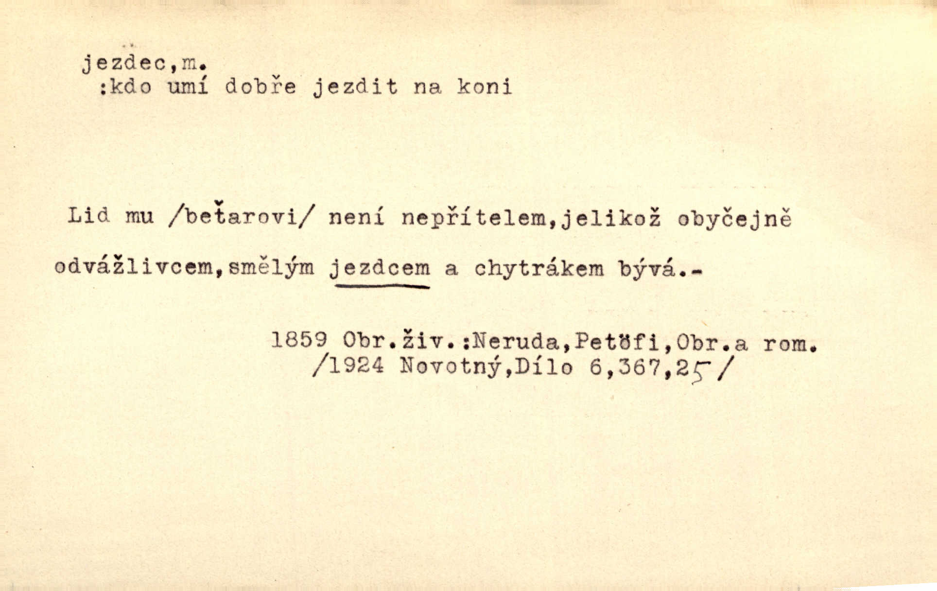 - jezdec, -dce m. člověk jezdící na koni, řidč. jedoucí na nějakém vozidle. V tom se ozval koňský dusot, po silnici od splavu pádil jezdec. Něm. Jezdci na koních i na lesklých kolech bicyklů frčí rychle kolem za sebou. V. Mrš. Voj. jízdný vojín, kavalerista. D věc nějak připomínající jezdce. Šach. šachová figurka koník, kůň. Obch. a kancel. vložka do knihy n. do lístkového seznamu určená k rychlému nalezení hledaného listu, koníček, signál. Voj. španělský jezdec druh překážek z kolů a ostnatého drátu, účinný zejména proti jezdectvu. Tech. posuvná součást na přístroji n. stroji. Jezdec na přesných vahách. Jezdec u soustruhu. Stav. ozdobná čtyřboká až osmiboká věžička.