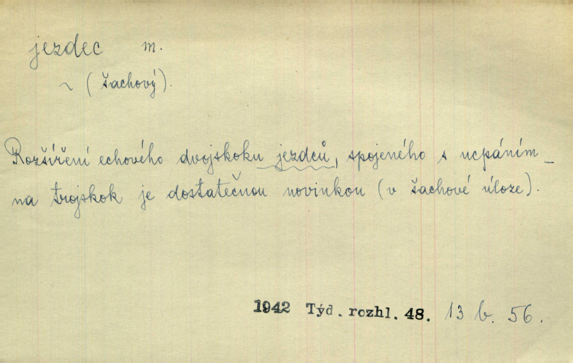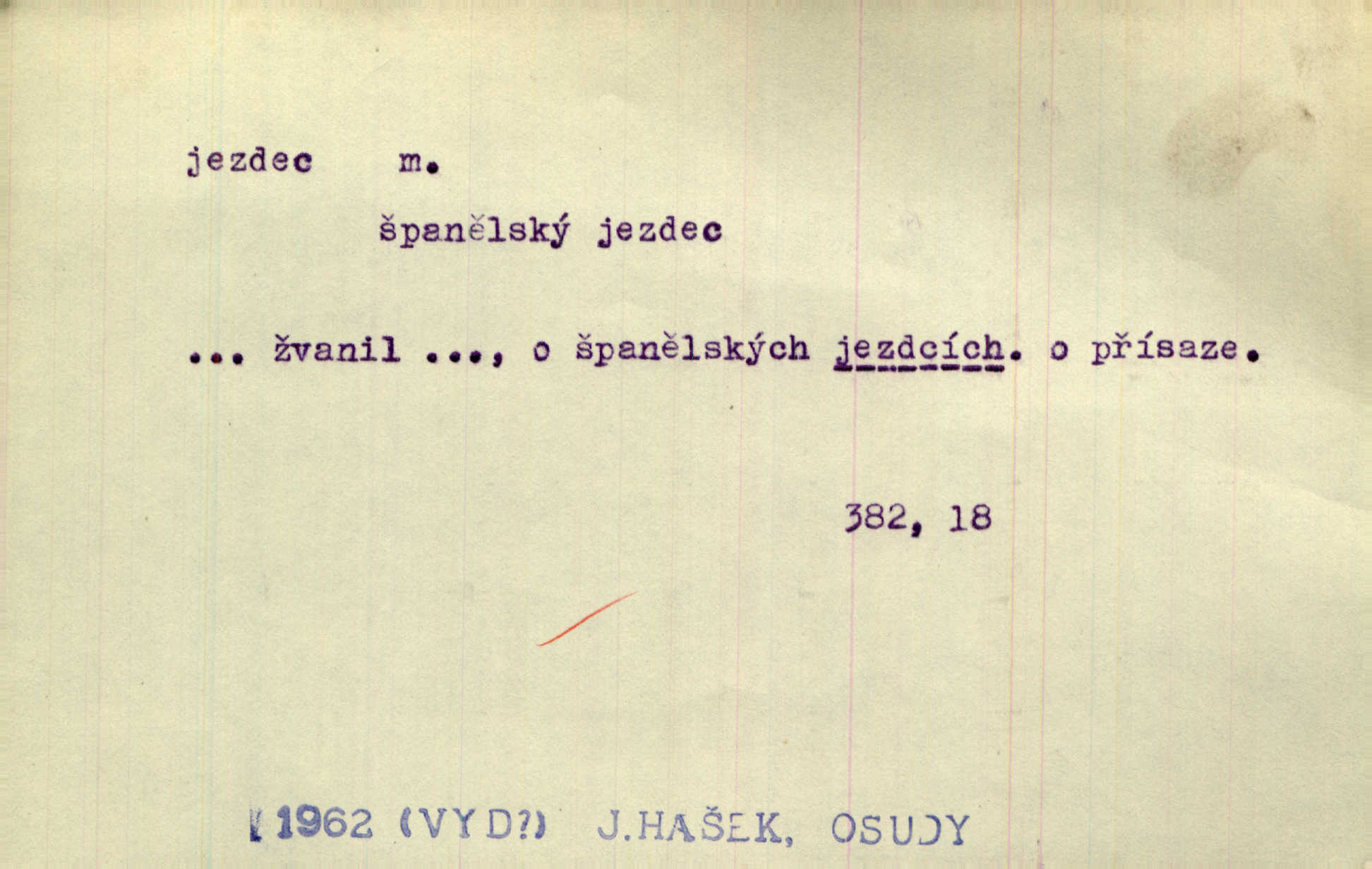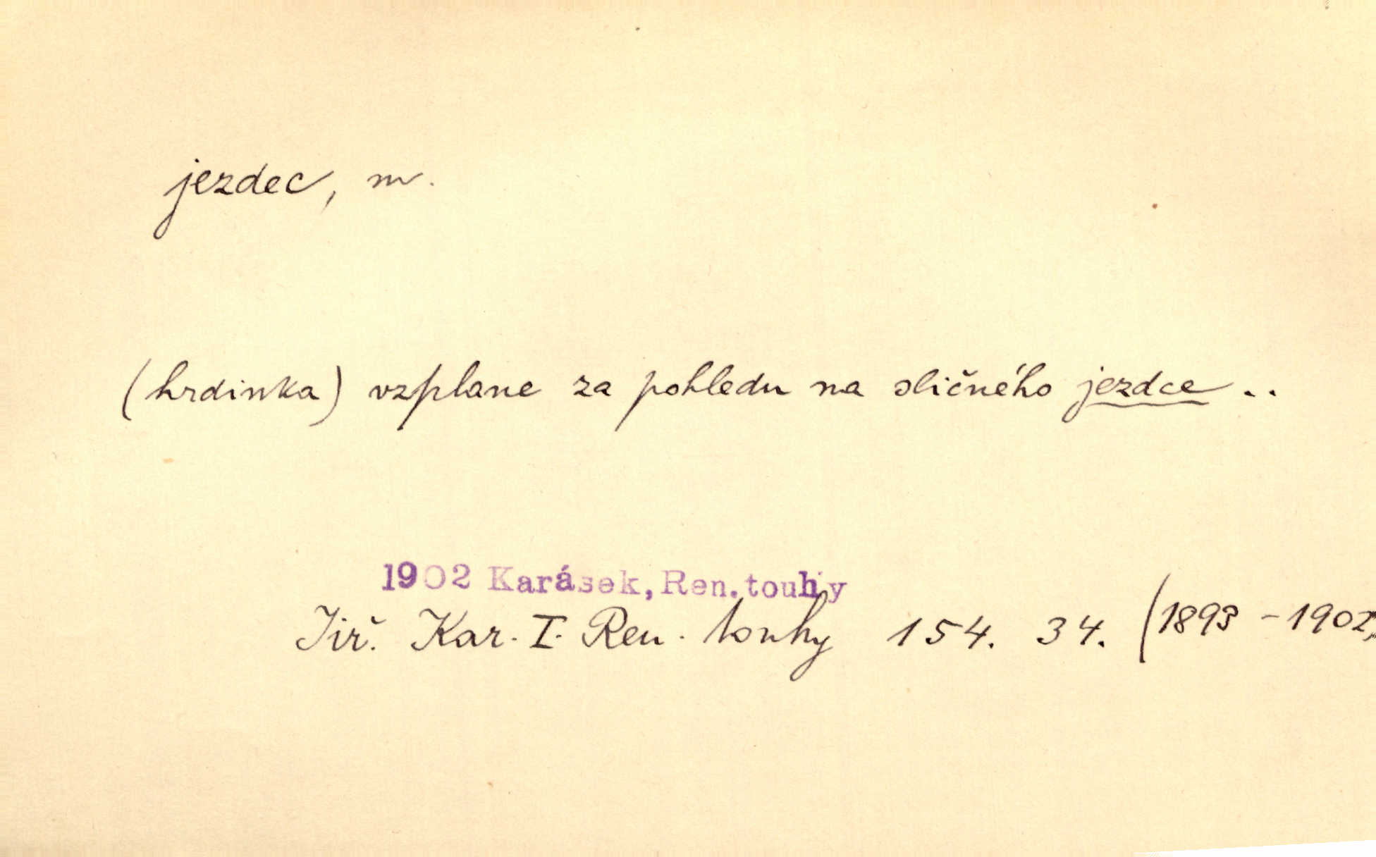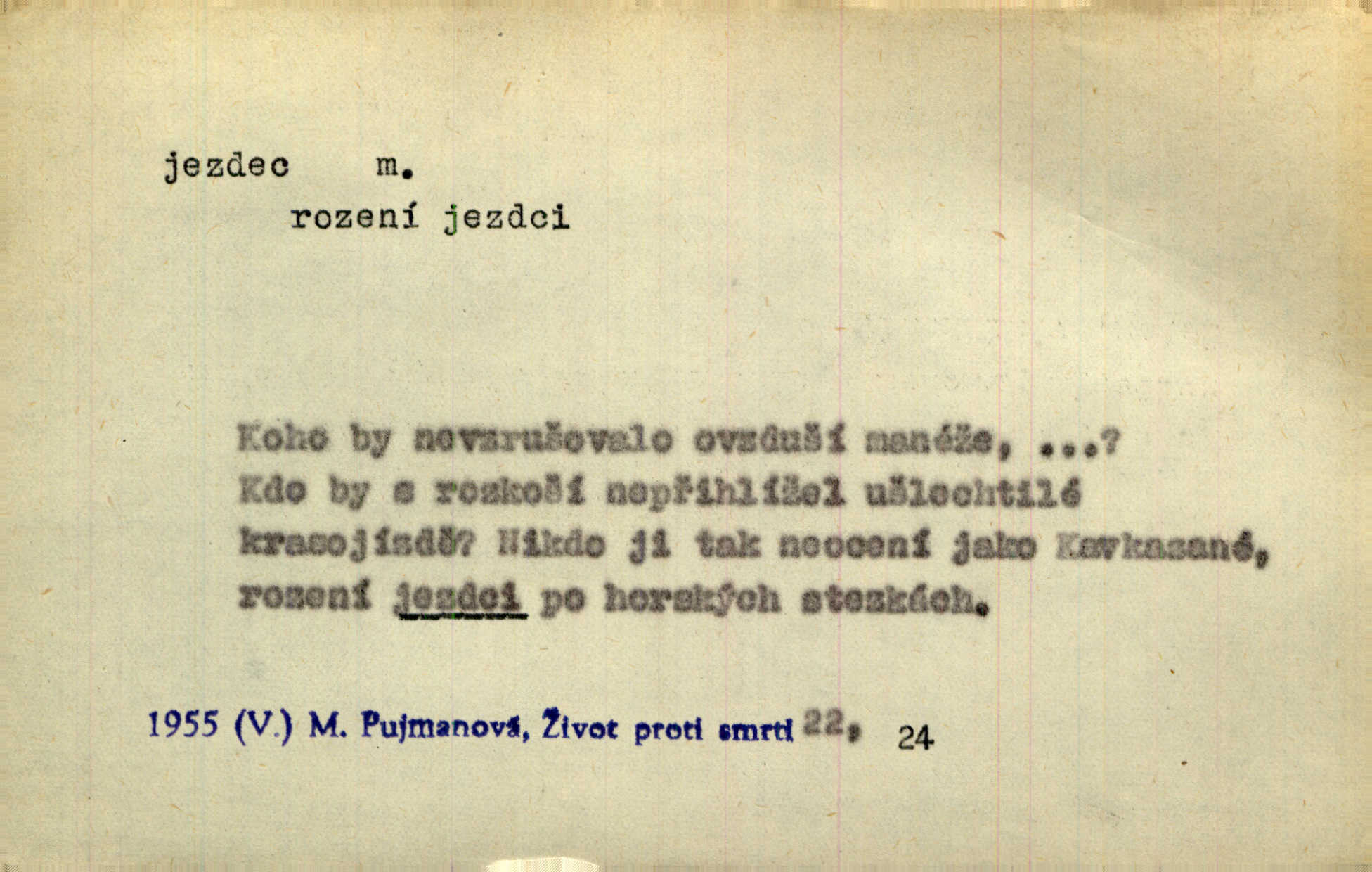- jezdec, -dce m. člověk jezdící na koni, řidč. jedoucí na nějakém vozidle. V tom se ozval koňský dusot, po silnici od splavu pádil jezdec. Něm. Jezdci na koních i na lesklých kolech bicyklů frčí rychle kolem za sebou. V. Mrš. Voj. jízdný vojín, kavalerista. D věc nějak připomínající jezdce. Šach. šachová figurka koník, kůň. Obch. a kancel. vložka do knihy n. do lístkového seznamu určená k rychlému nalezení hledaného listu, koníček, signál. Voj. španělský jezdec druh překážek z kolů a ostnatého drátu, účinný zejména proti jezdectvu. Tech. posuvná součást na přístroji n. stroji. Jezdec na přesných vahách. Jezdec u soustruhu. Stav. ozdobná čtyřboká až osmiboká věžička.