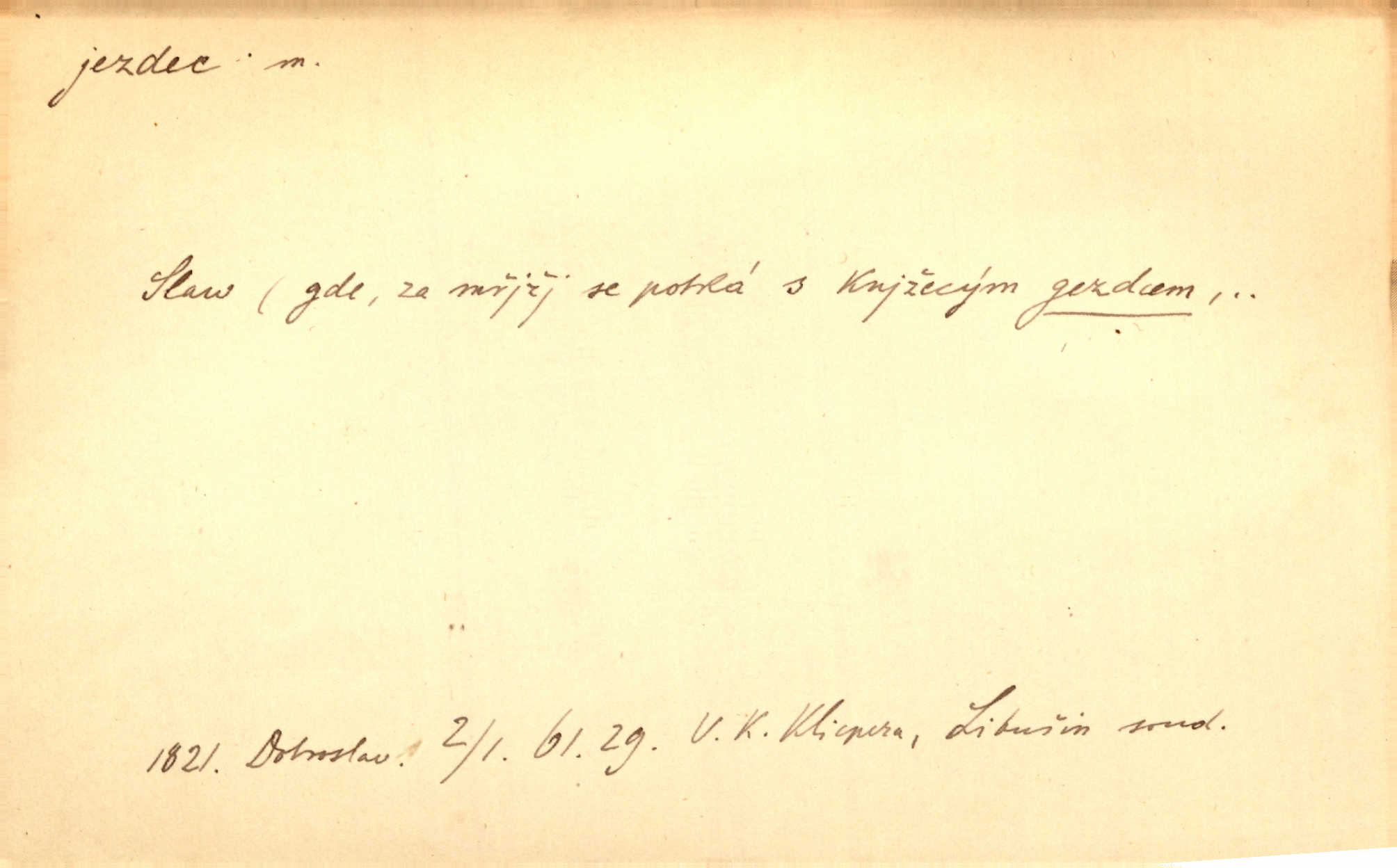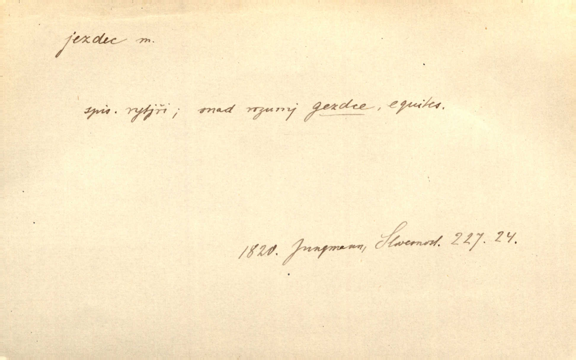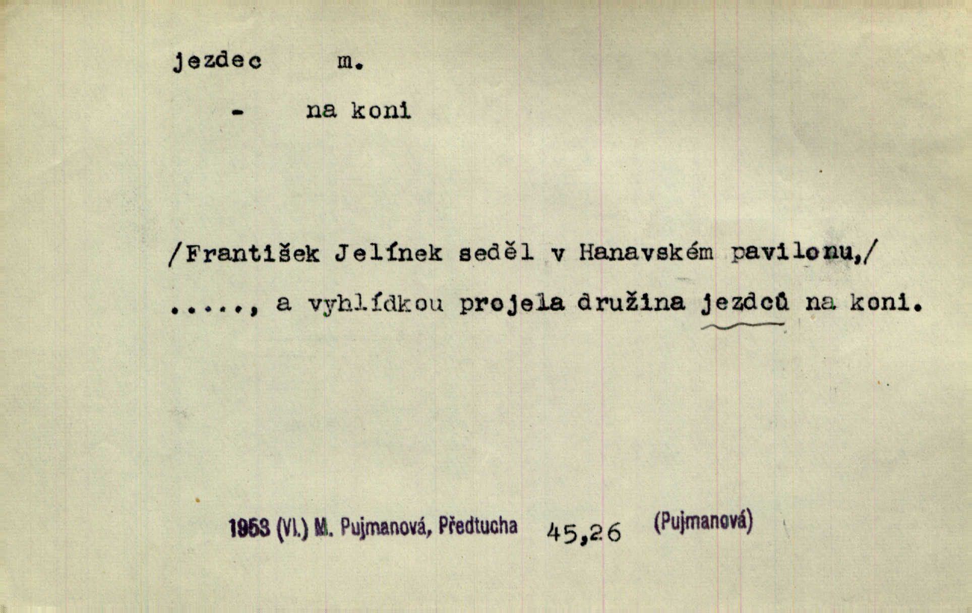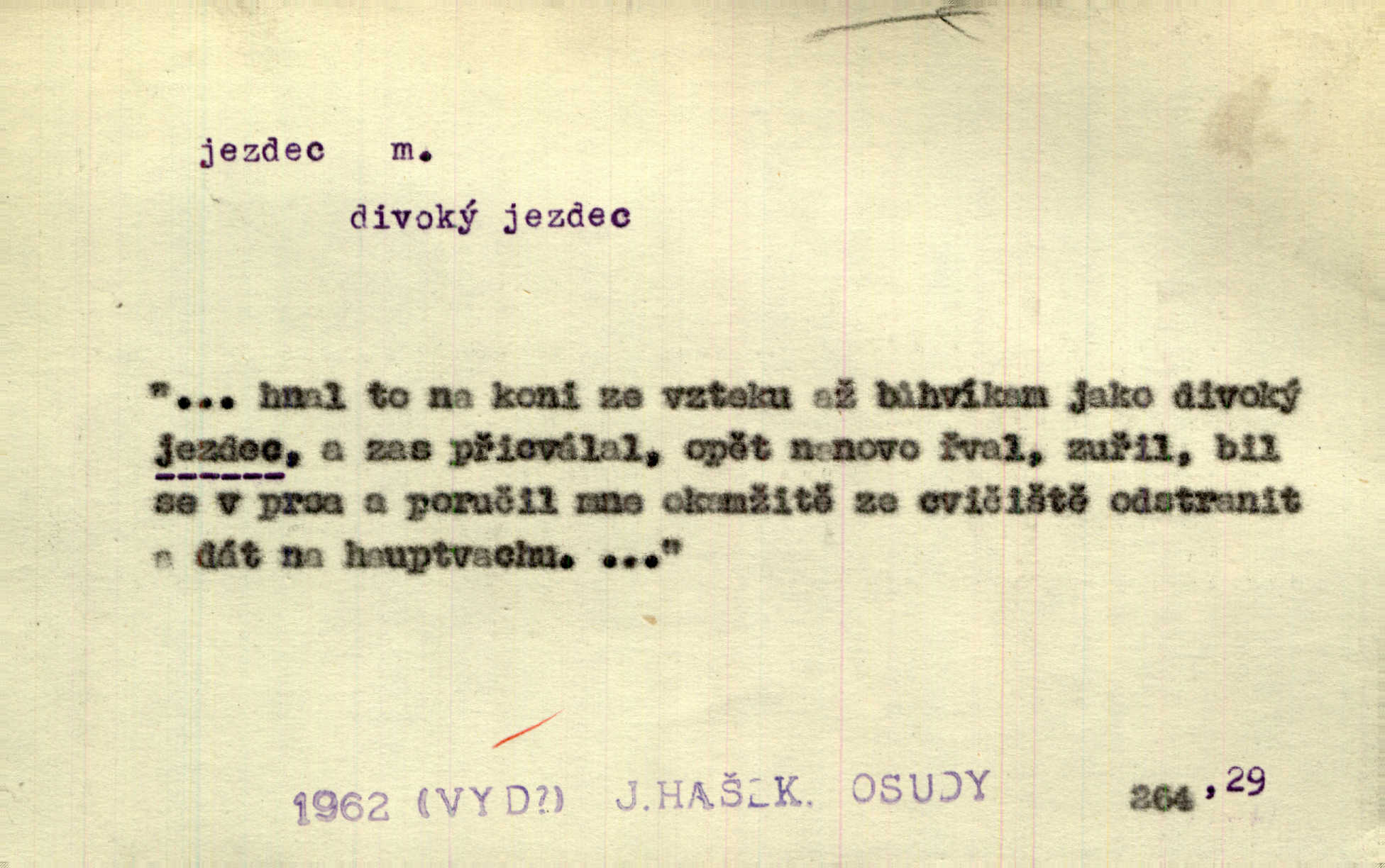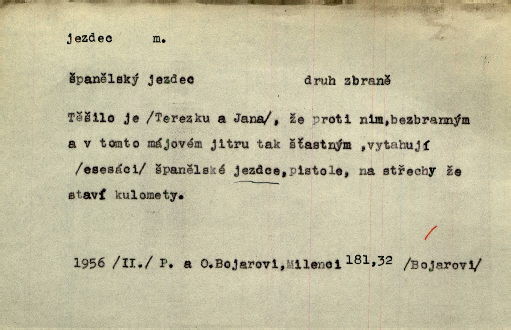 - jezdec, -dce m. člověk jezdící na koni, řidč. jedoucí na nějakém vozidle. V tom se ozval koňský dusot, po silnici od splavu pádil jezdec. Něm. Jezdci na koních i na lesklých kolech bicyklů frčí rychle kolem za sebou. V. Mrš. Voj. jízdný vojín, kavalerista. D věc nějak připomínající jezdce. Šach. šachová figurka koník, kůň. Obch. a kancel. vložka do knihy n. do lístkového seznamu určená k rychlému nalezení hledaného listu, koníček, signál. Voj. španělský jezdec druh překážek z kolů a ostnatého drátu, účinný zejména proti jezdectvu. Tech. posuvná součást na přístroji n. stroji. Jezdec na přesných vahách. Jezdec u soustruhu. Stav. ozdobná čtyřboká až osmiboká věžička.