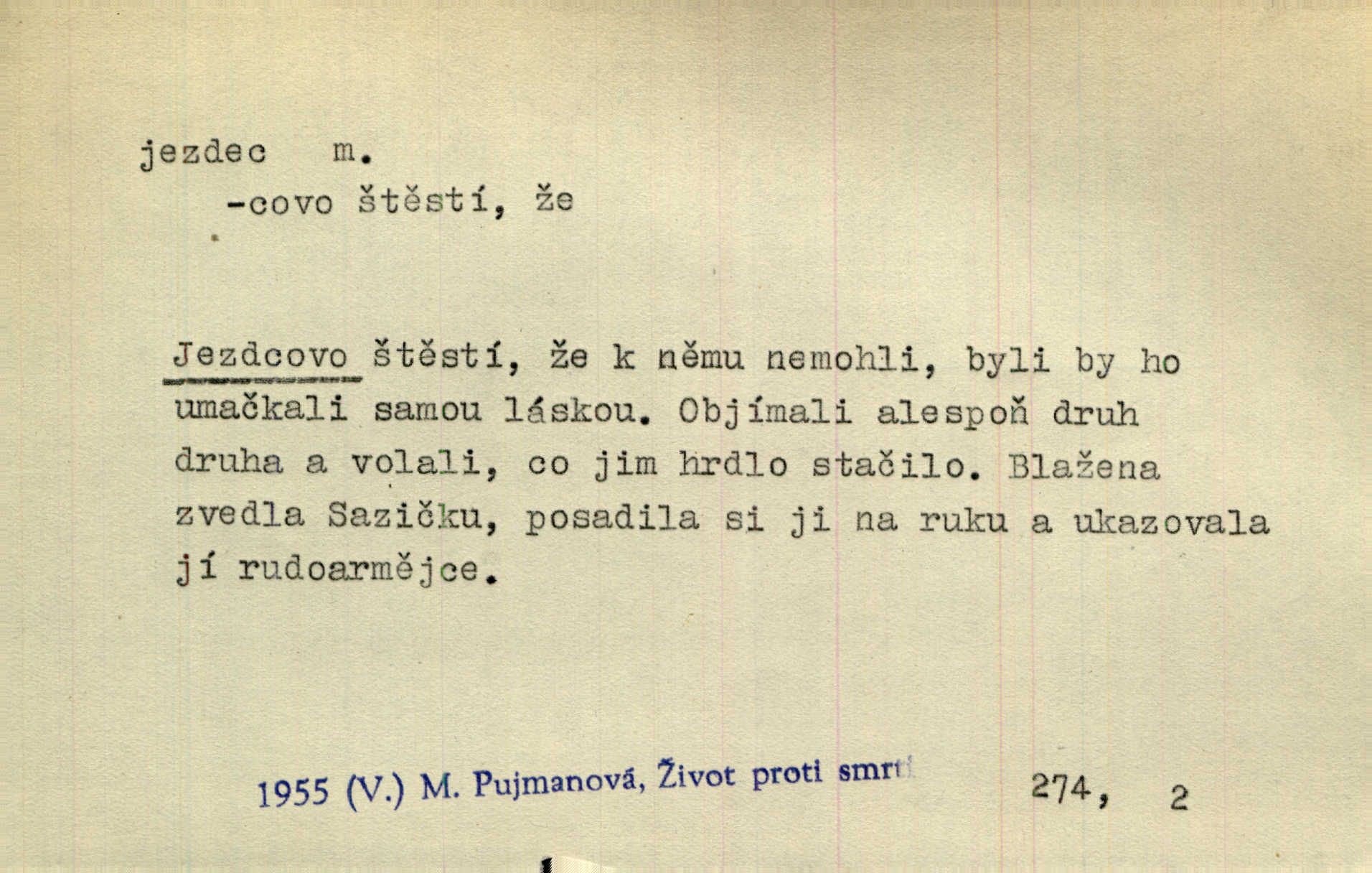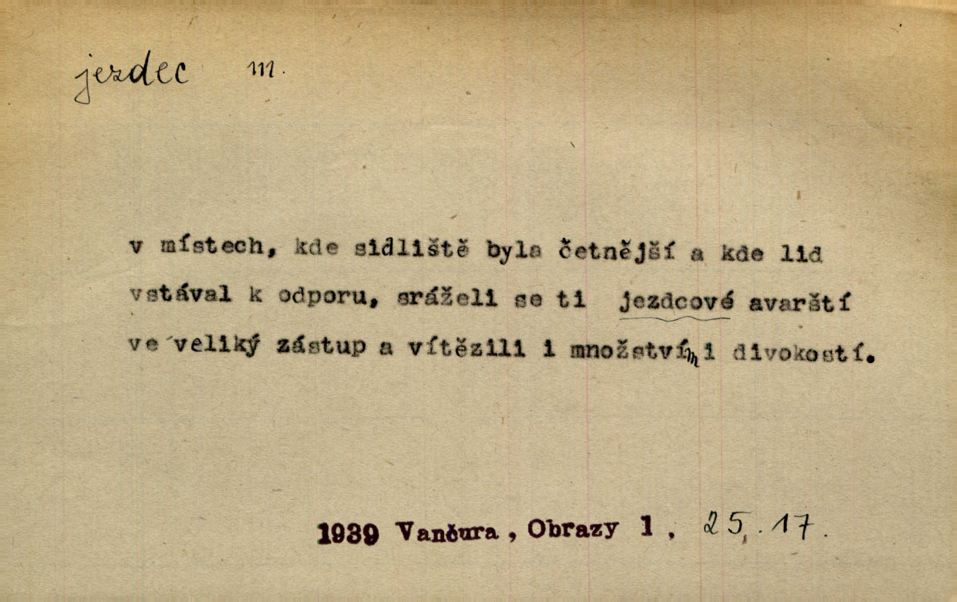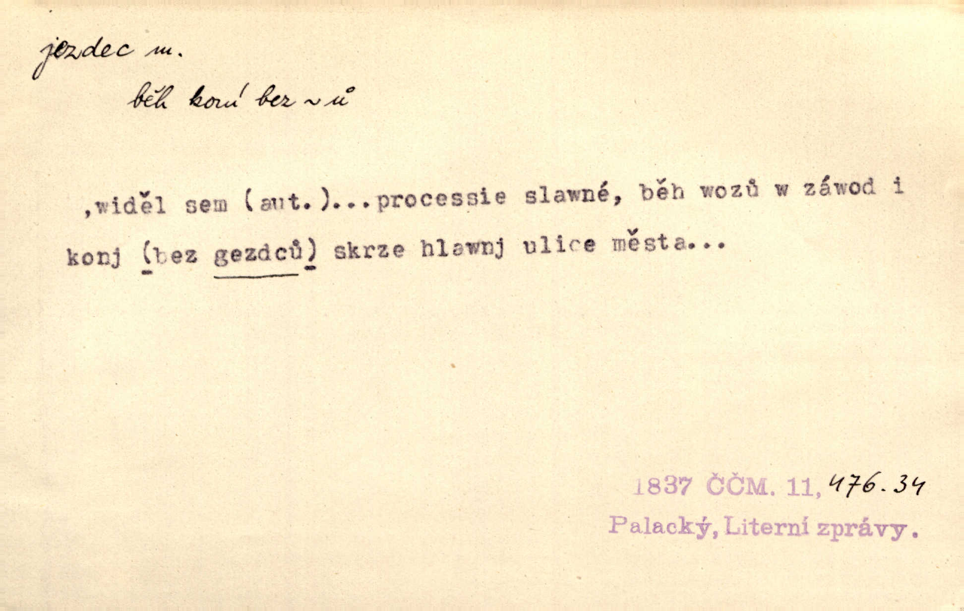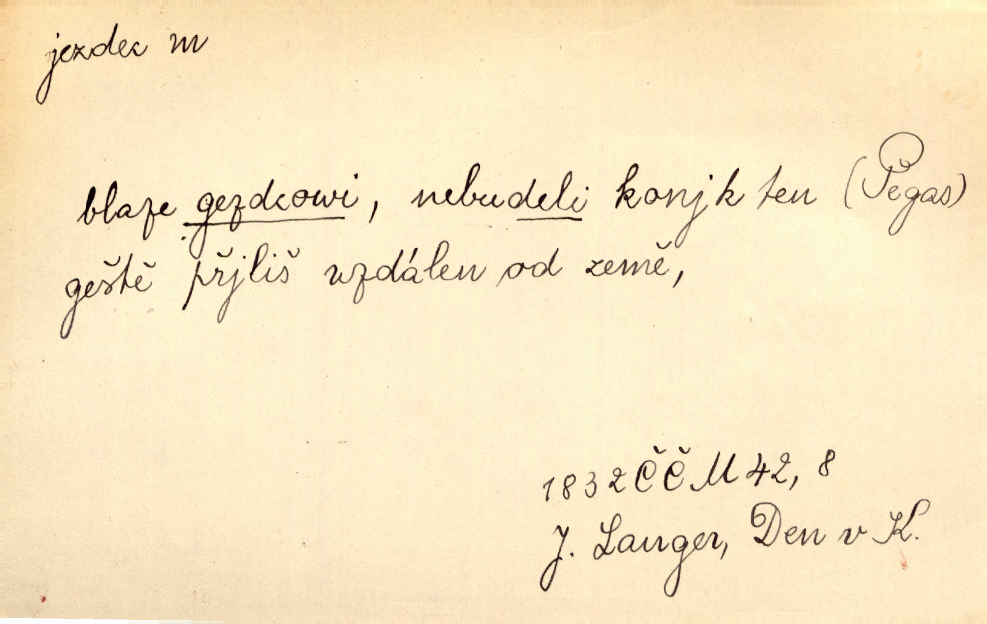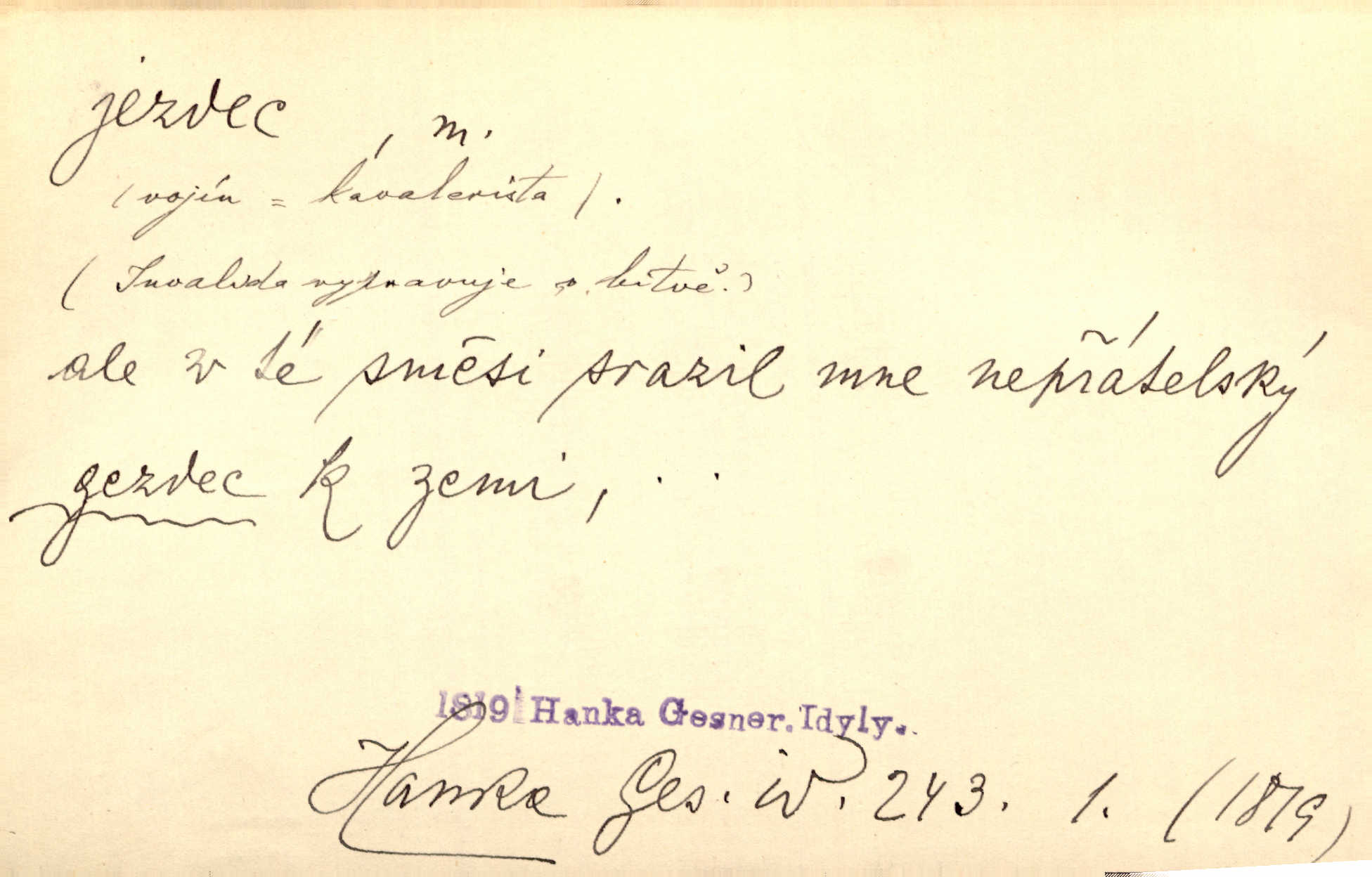 - jezdec, -dce m. člověk jezdící na koni, řidč. jedoucí na nějakém vozidle. V tom se ozval koňský dusot, po silnici od splavu pádil jezdec. Něm. Jezdci na koních i na lesklých kolech bicyklů frčí rychle kolem za sebou. V. Mrš. Voj. jízdný vojín, kavalerista. D věc nějak připomínající jezdce. Šach. šachová figurka koník, kůň. Obch. a kancel. vložka do knihy n. do lístkového seznamu určená k rychlému nalezení hledaného listu, koníček, signál. Voj. španělský jezdec druh překážek z kolů a ostnatého drátu, účinný zejména proti jezdectvu. Tech. posuvná součást na přístroji n. stroji. Jezdec na přesných vahách. Jezdec u soustruhu. Stav. ozdobná čtyřboká až osmiboká věžička.
