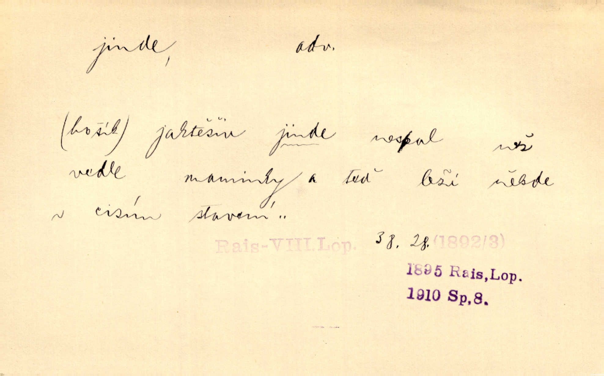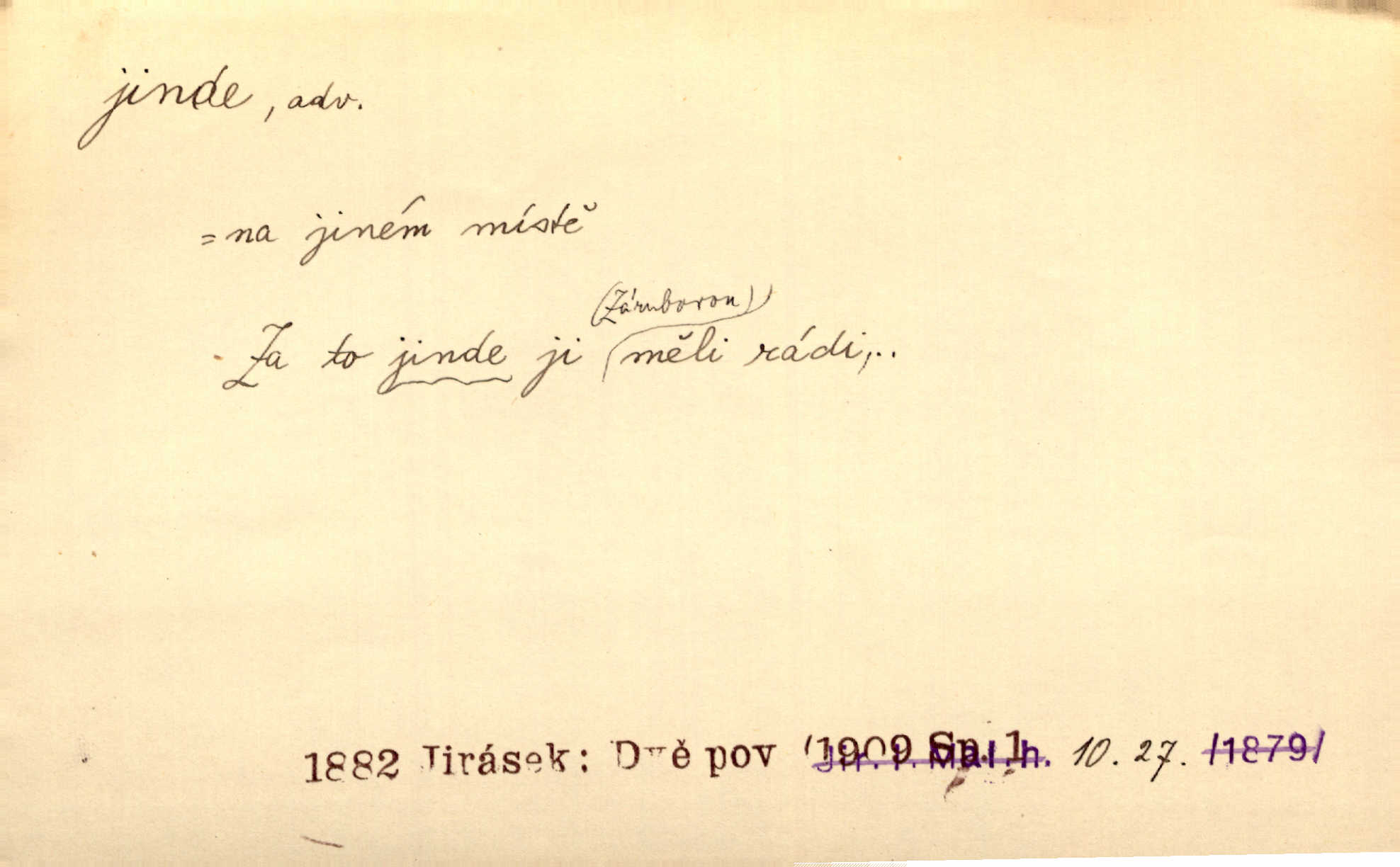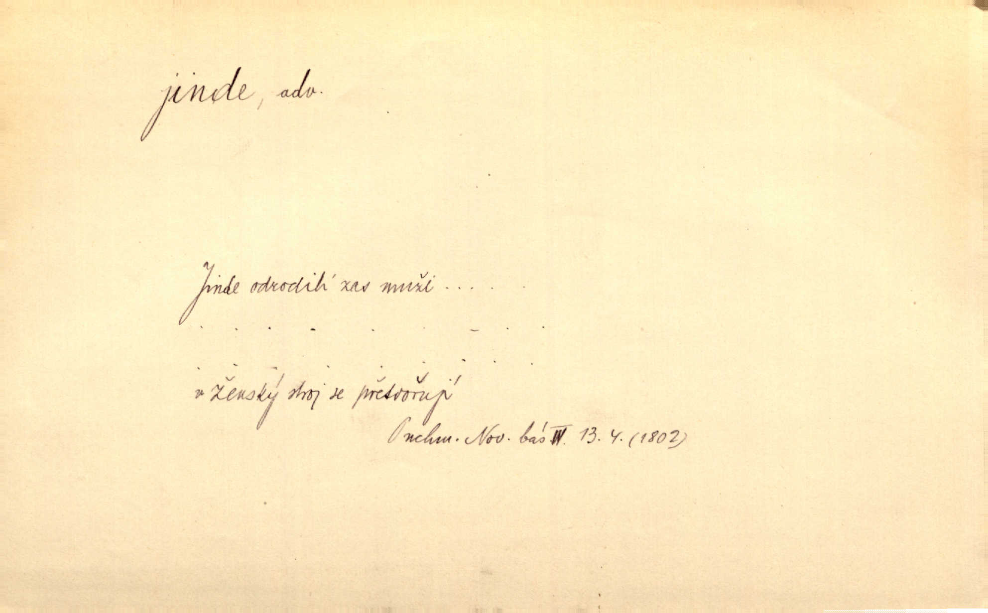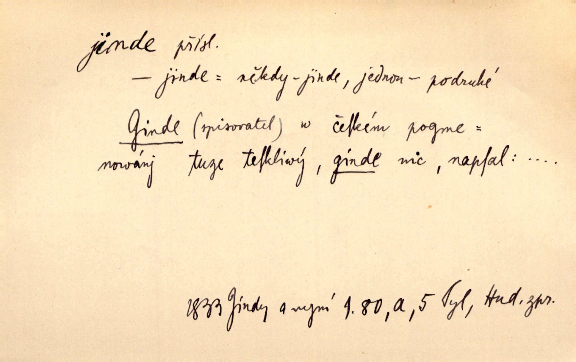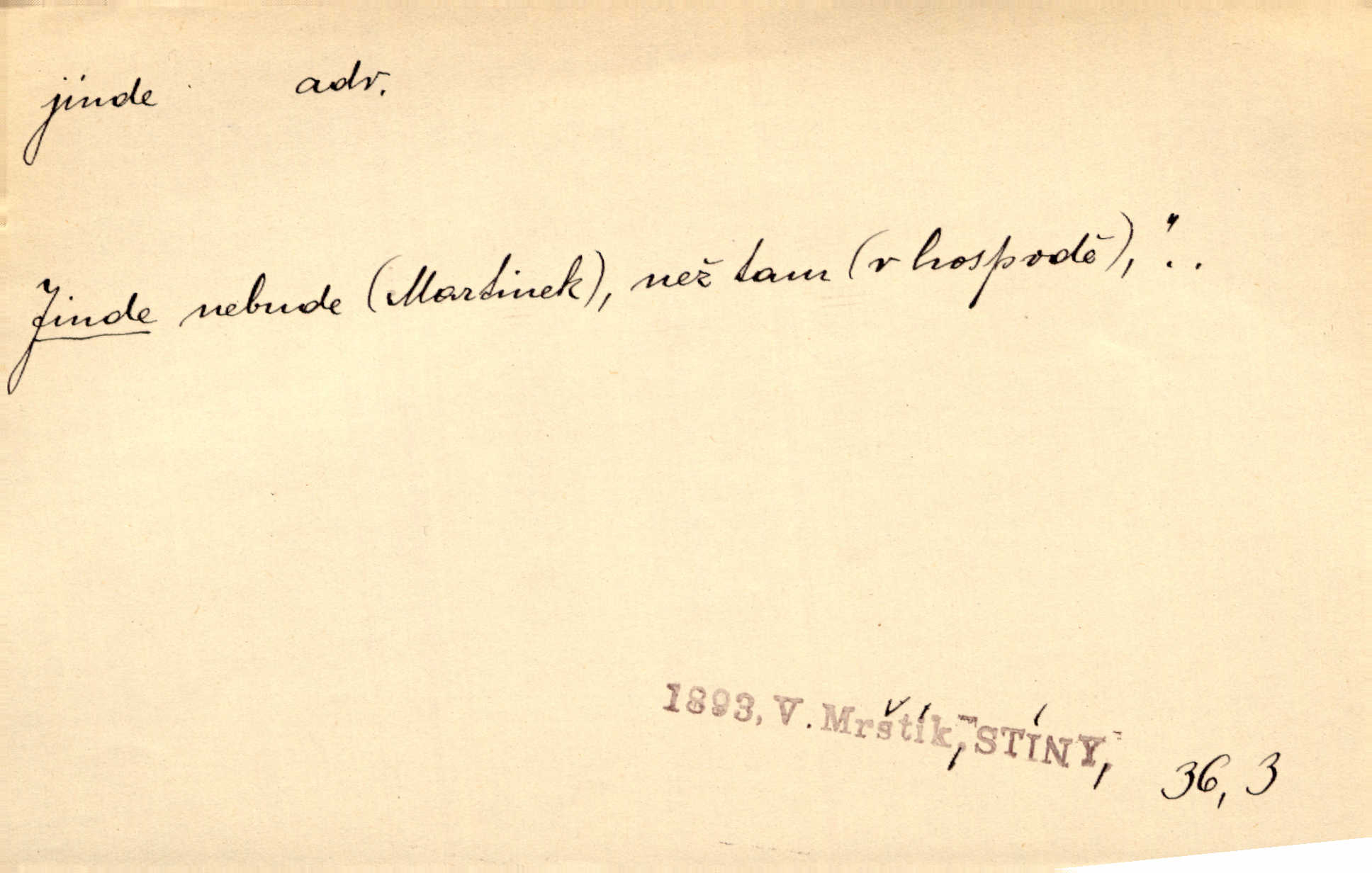 - jinde adv. na jiném místě. Taky byste mohla vyklepávat ty koberce jinde! Čech. Kde jinde, jestli ne ve Španělích, měli bychom dobrodružství hledati? Zey. D Dial. jinam. Kde bychom šli jinde jak k Balátovi? Herb. Nemůžeme spat! Půjdu jinde! Herb.