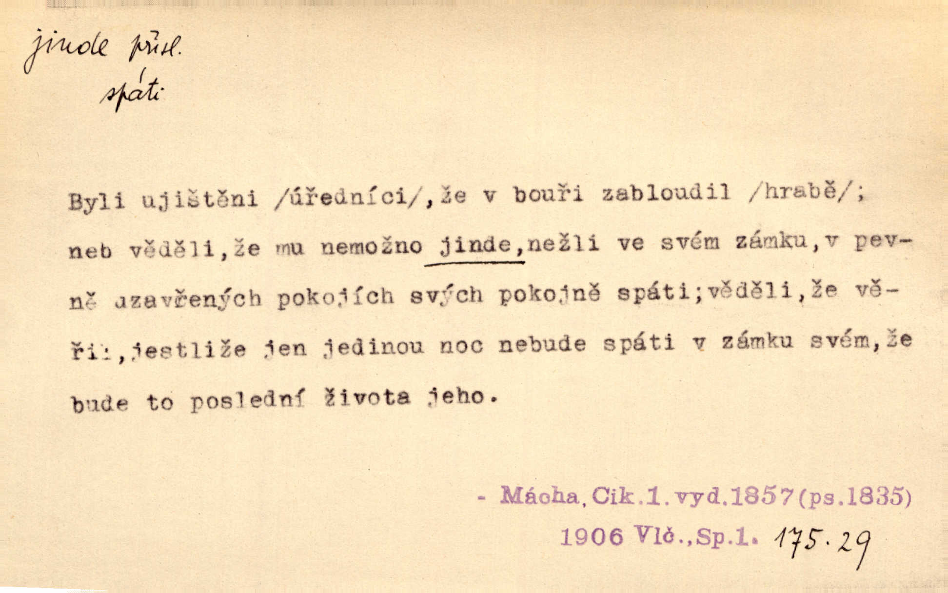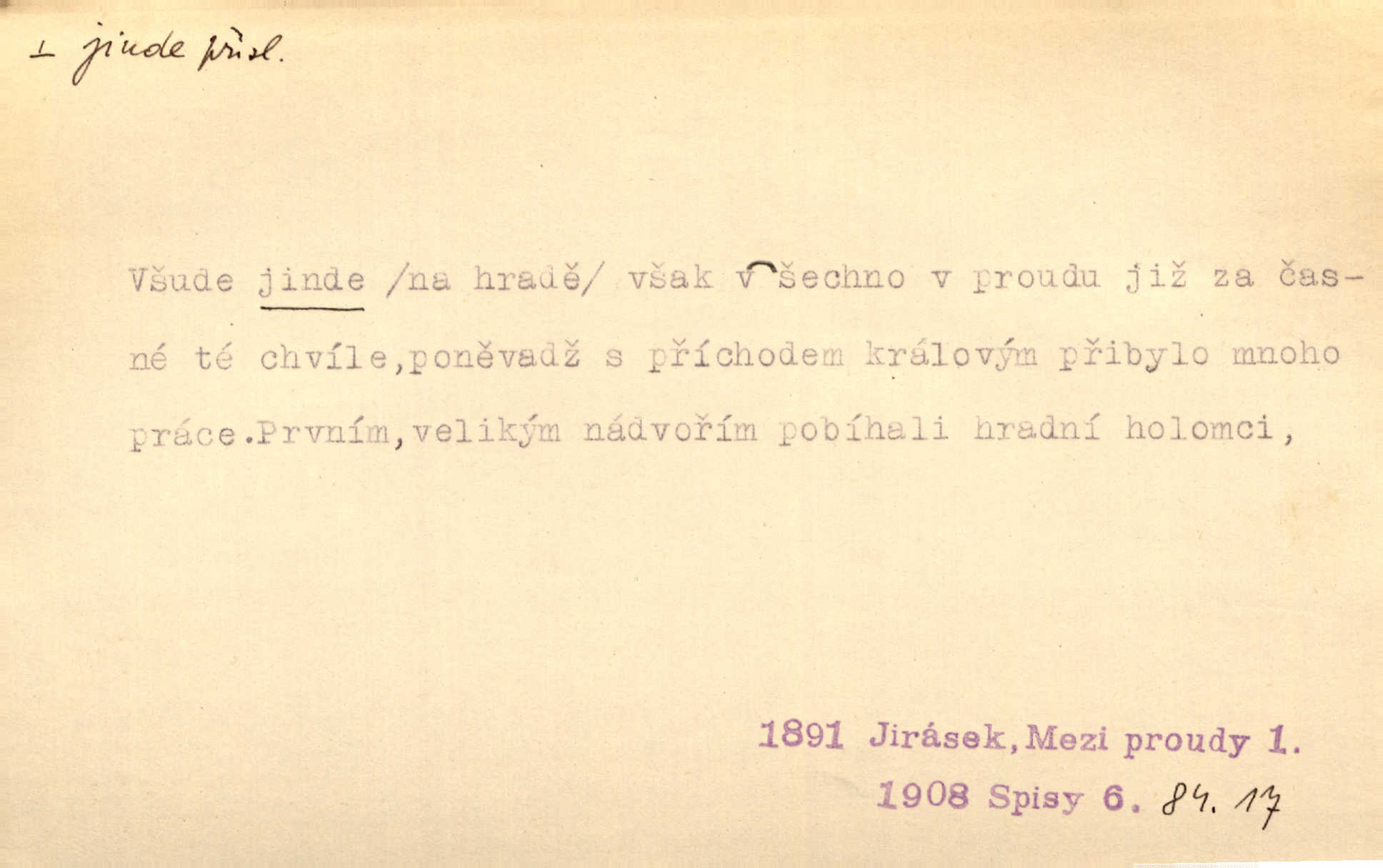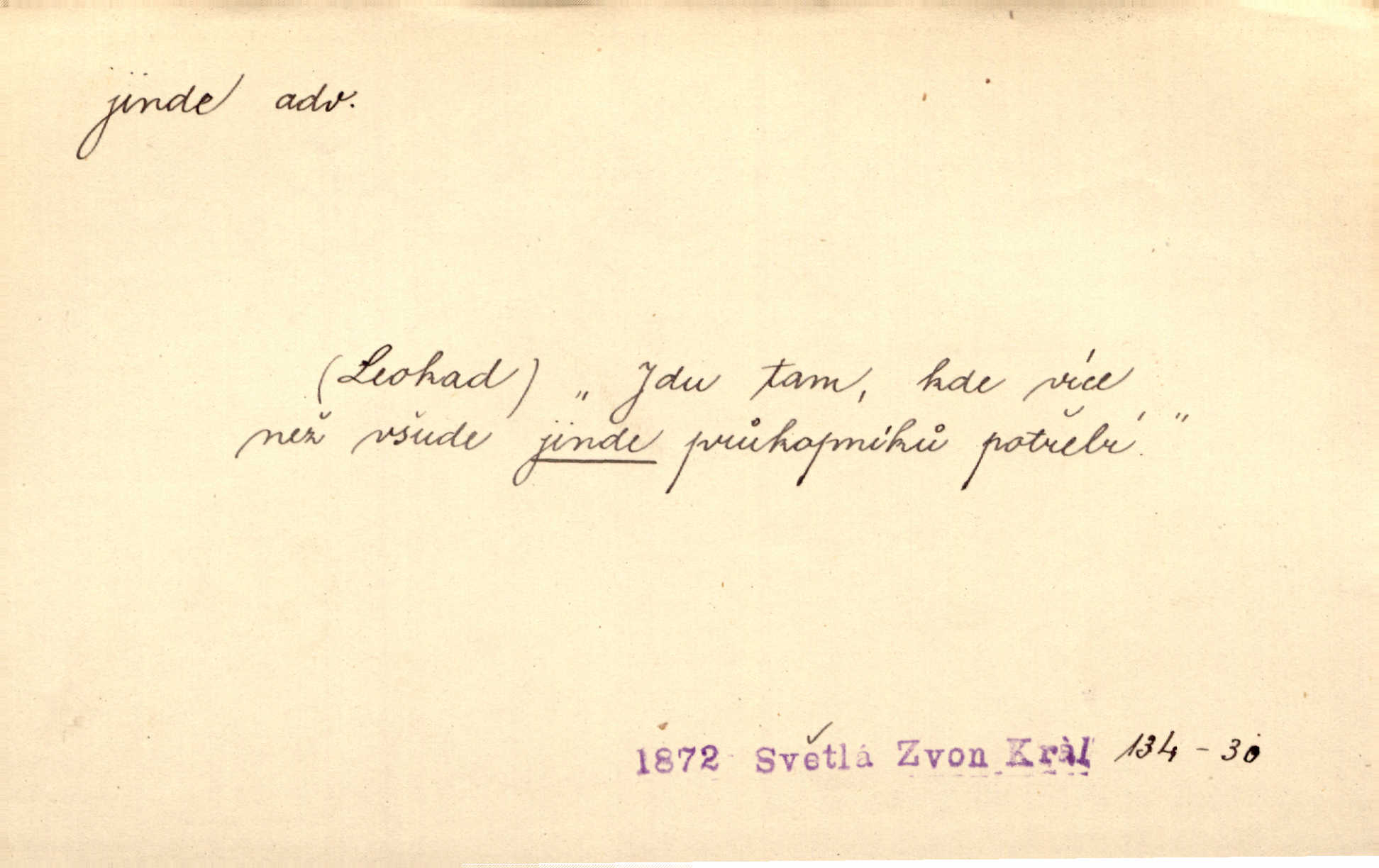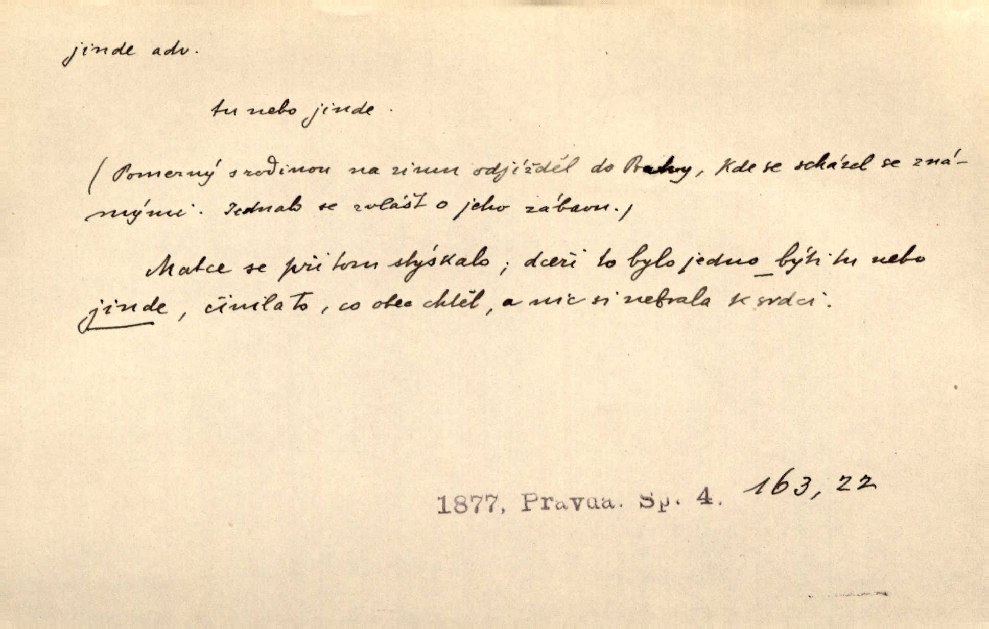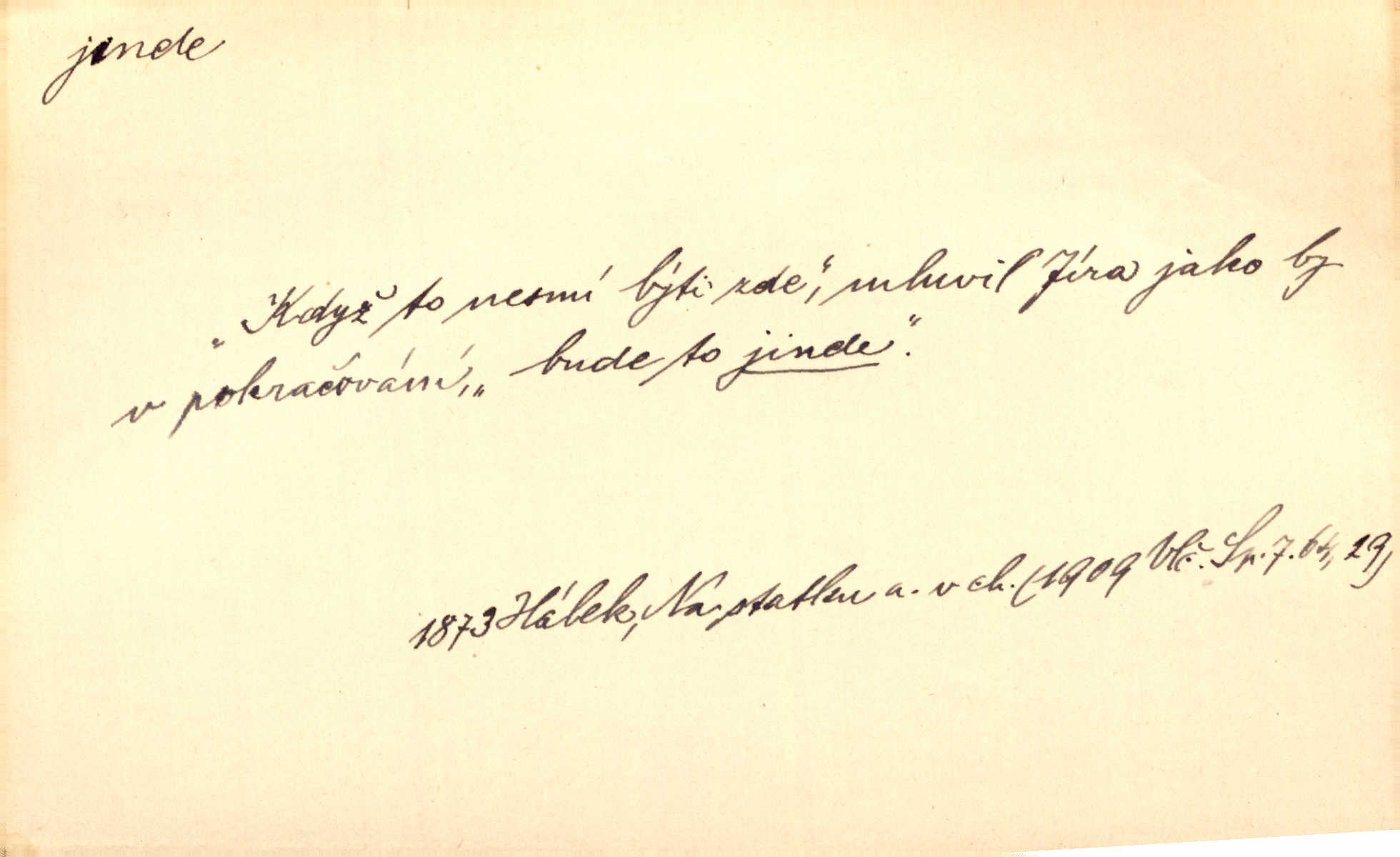 - jinde adv. na jiném místě. Taky byste mohla vyklepávat ty koberce jinde! Čech. Kde jinde, jestli ne ve Španělích, měli bychom dobrodružství hledati? Zey. D Dial. jinam. Kde bychom šli jinde jak k Balátovi? Herb. Nemůžeme spat! Půjdu jinde! Herb.