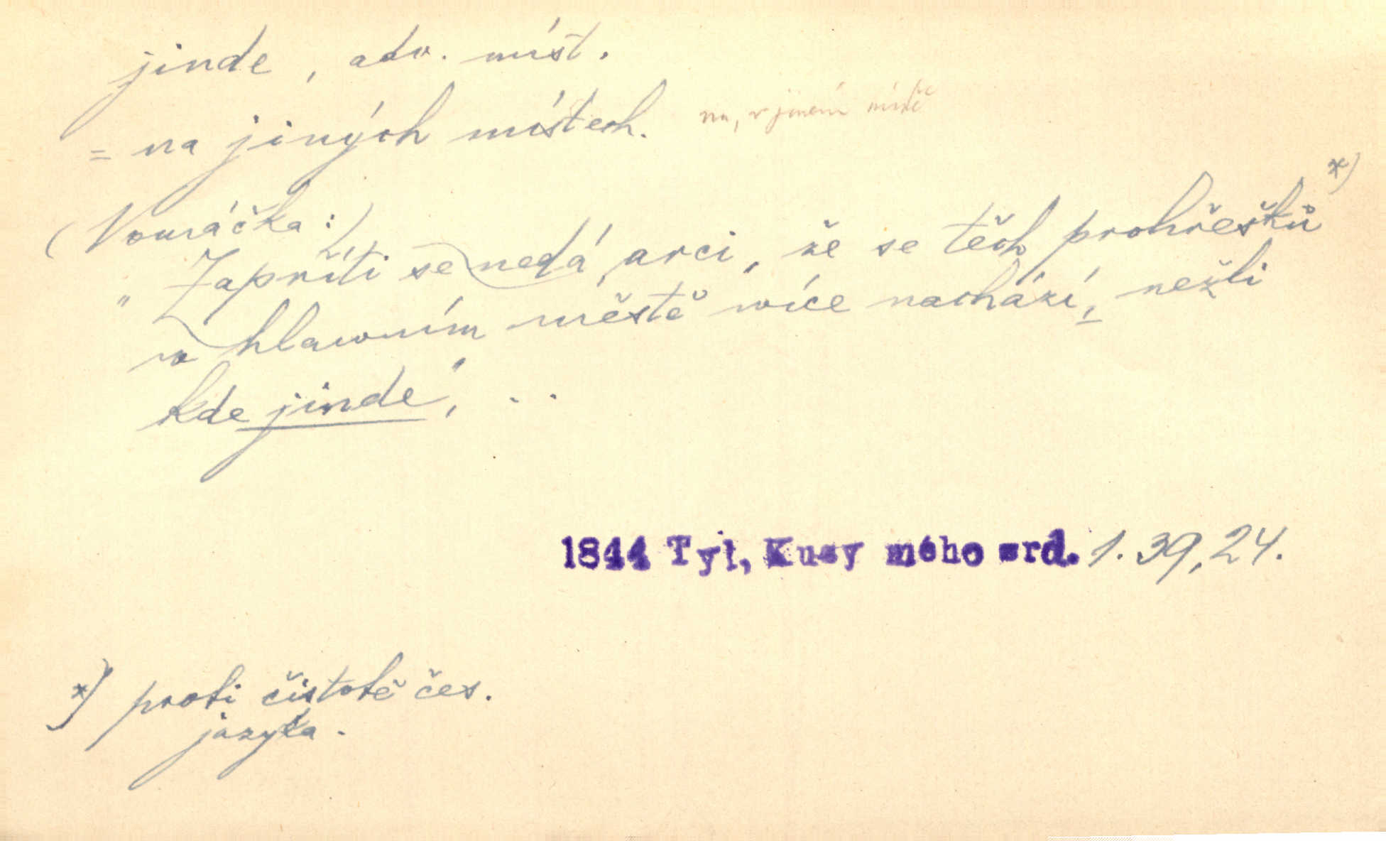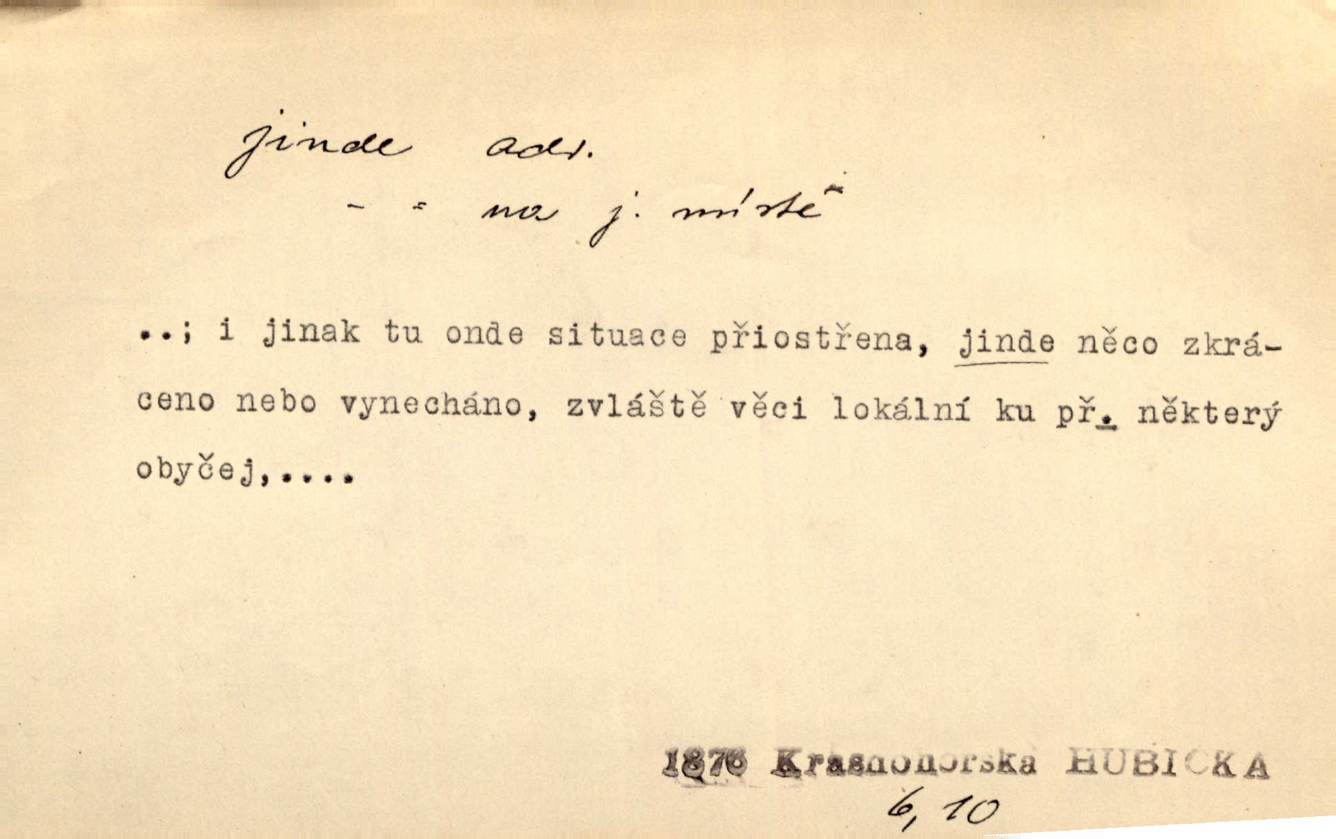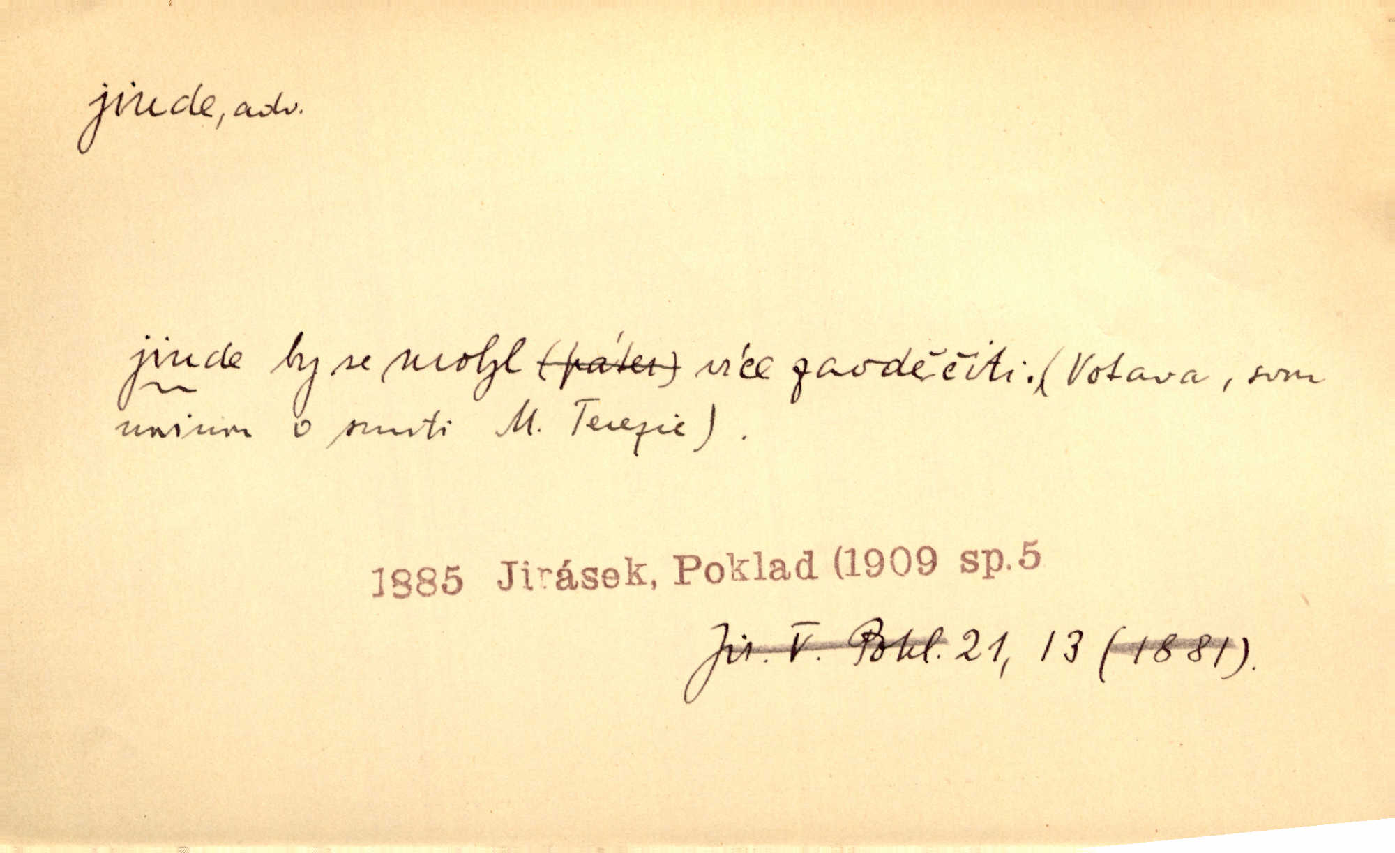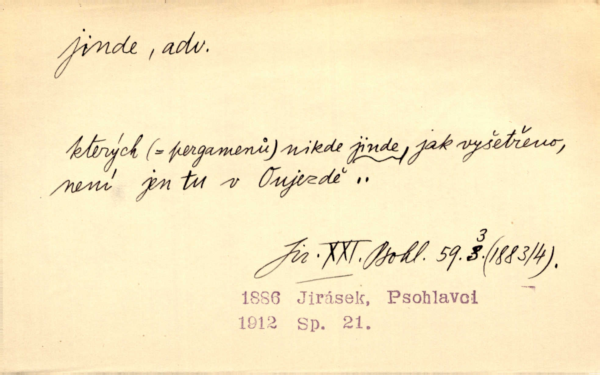 - jinde adv. na jiném místě. Taky byste mohla vyklepávat ty koberce jinde! Čech. Kde jinde, jestli ne ve Španělích, měli bychom dobrodružství hledati? Zey. D Dial. jinam. Kde bychom šli jinde jak k Balátovi? Herb. Nemůžeme spat! Půjdu jinde! Herb.