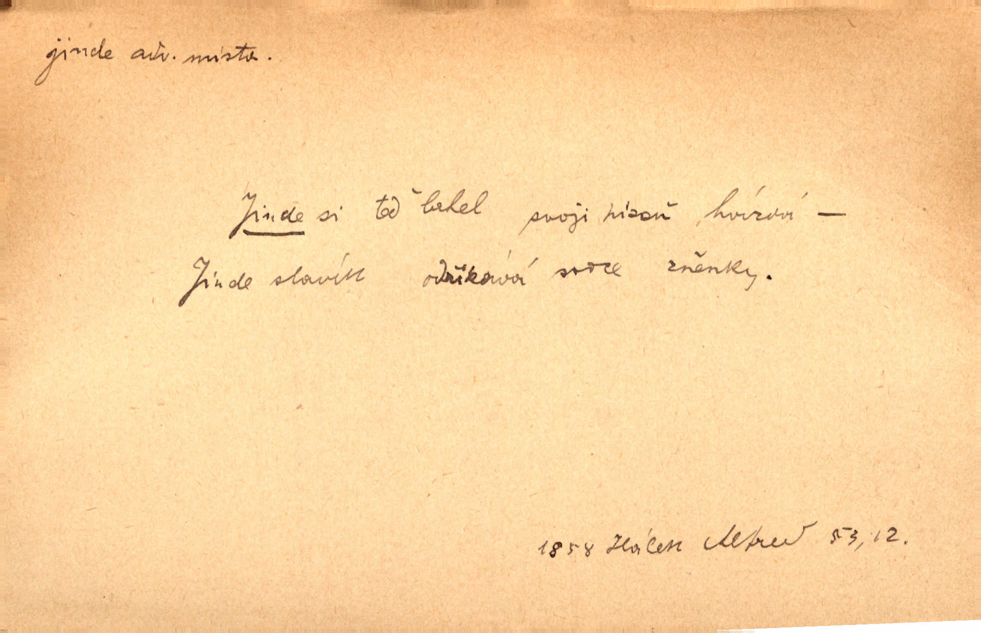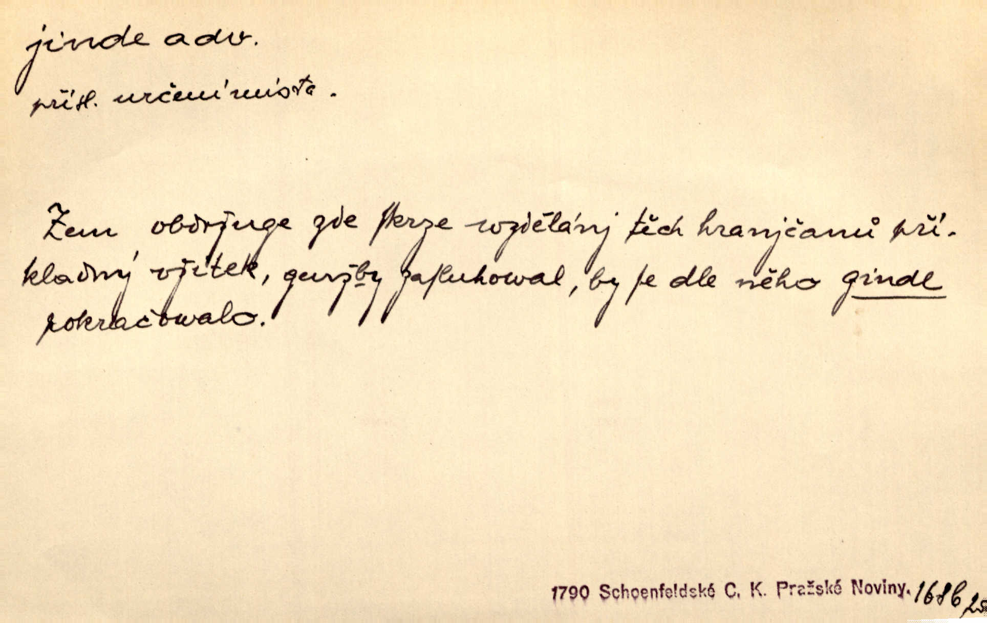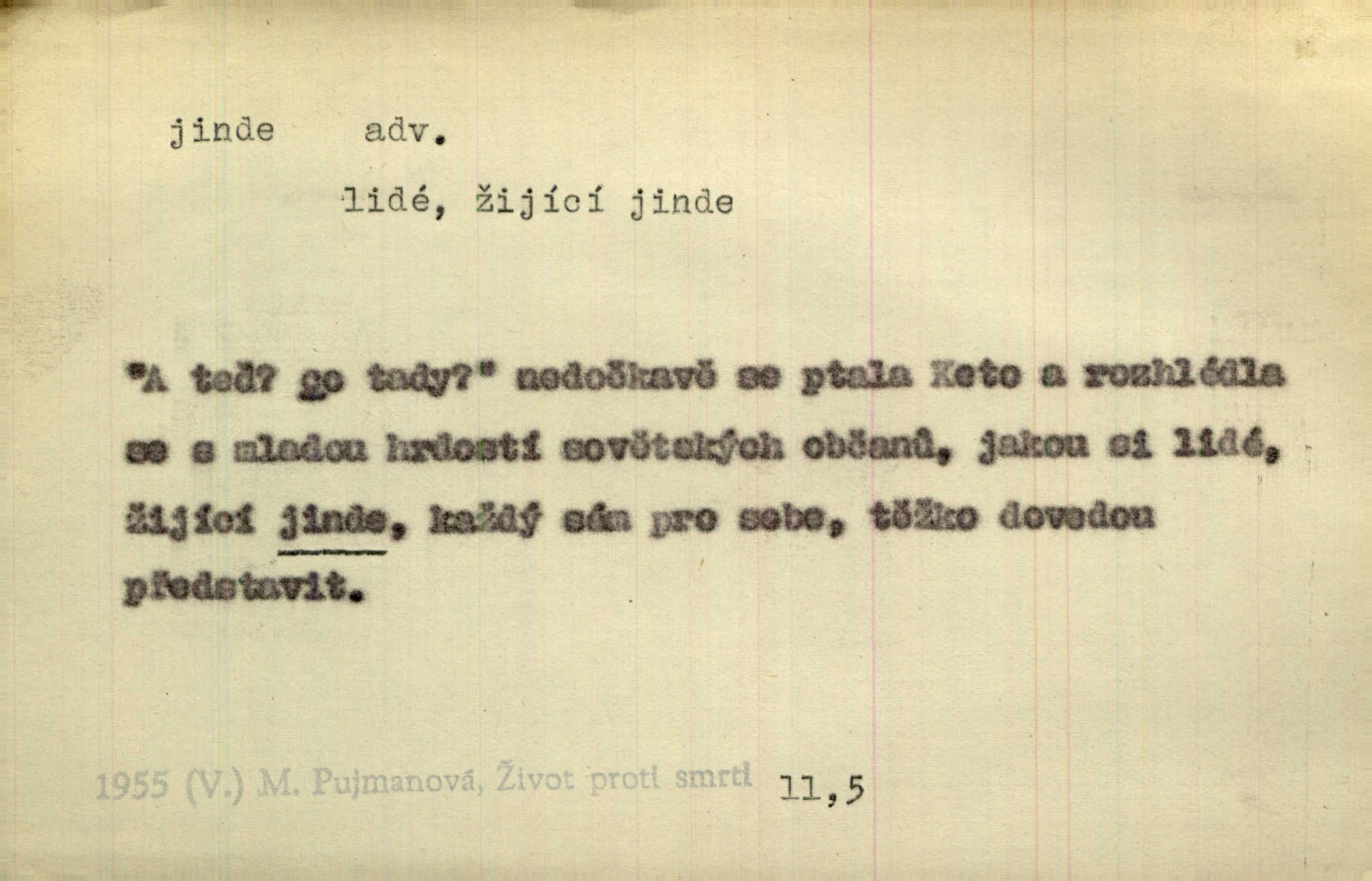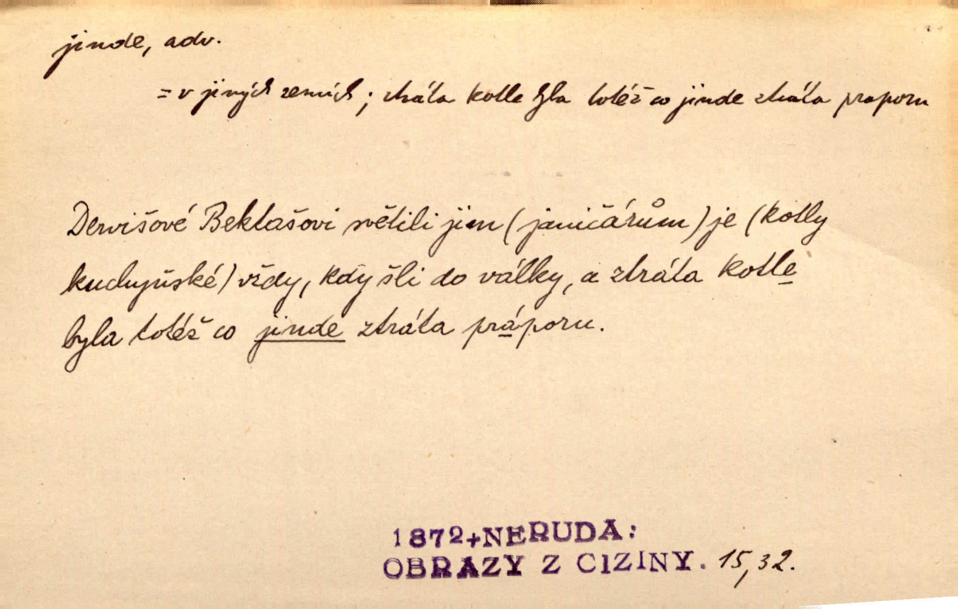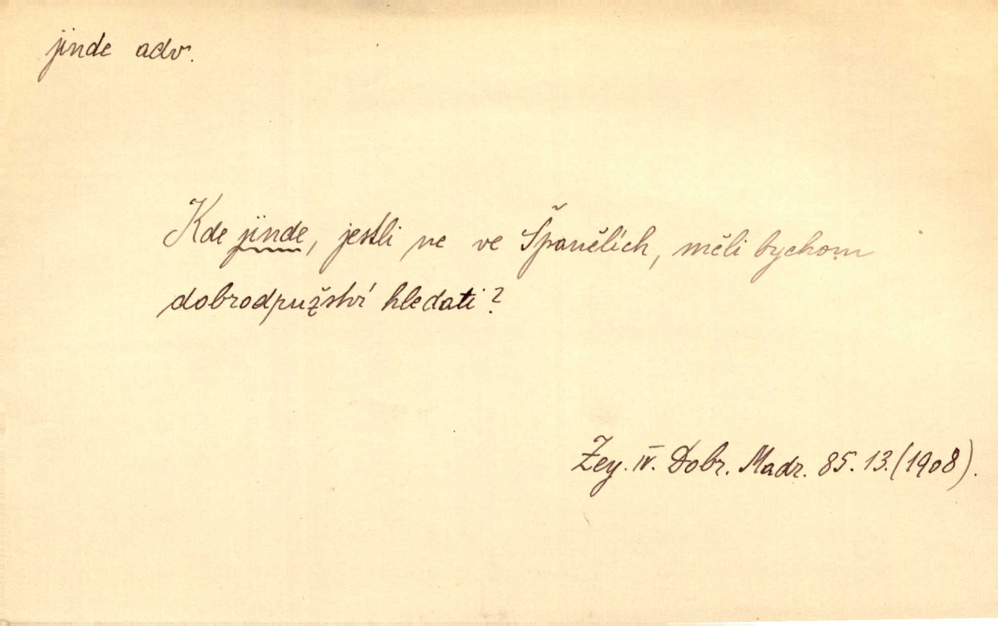 - jinde adv. na jiném místě. Taky byste mohla vyklepávat ty koberce jinde! Čech. Kde jinde, jestli ne ve Španělích, měli bychom dobrodružství hledati? Zey. D Dial. jinam. Kde bychom šli jinde jak k Balátovi? Herb. Nemůžeme spat! Půjdu jinde! Herb.