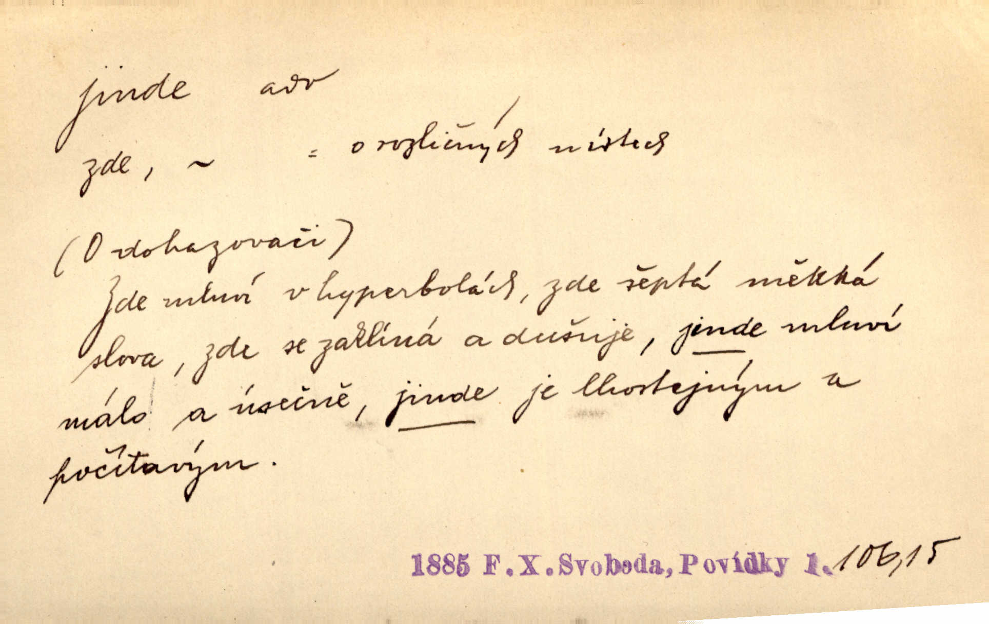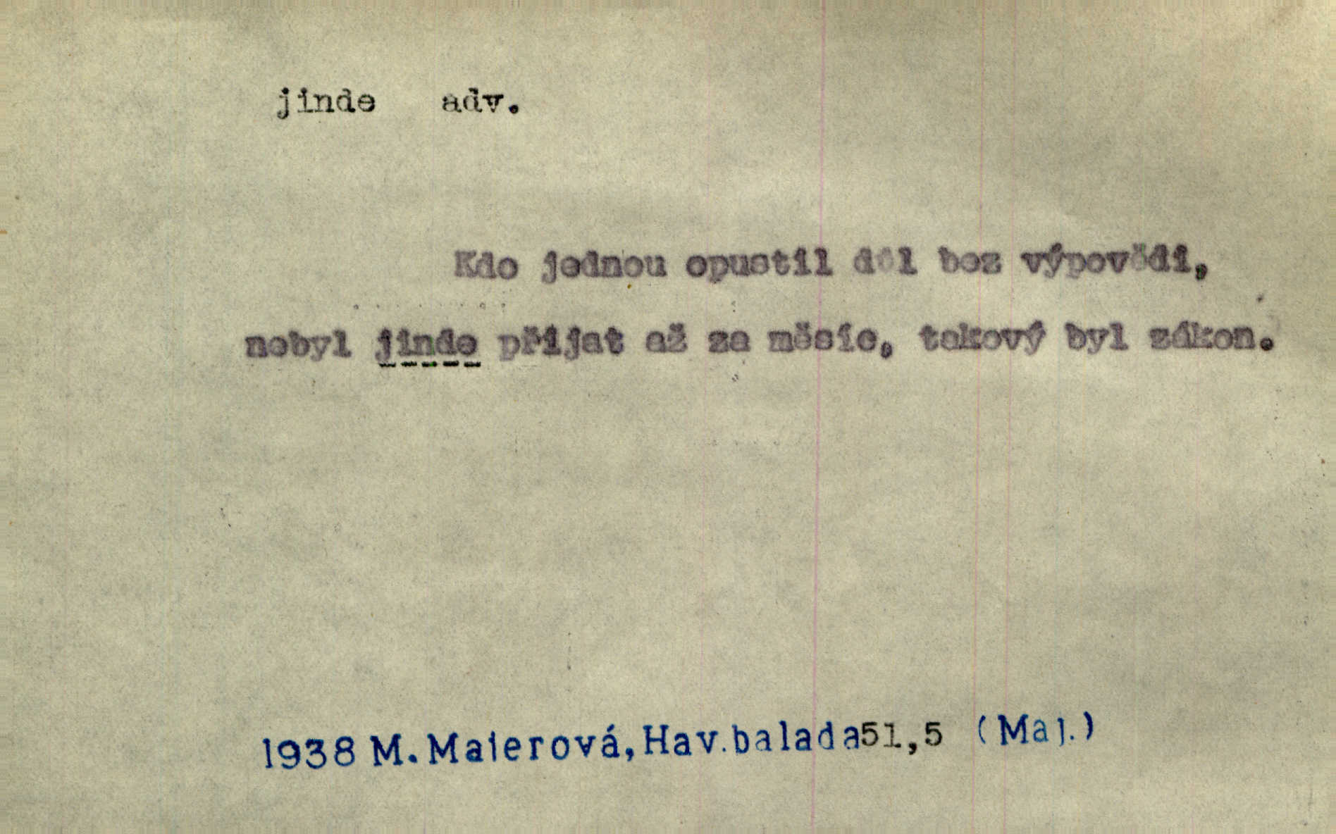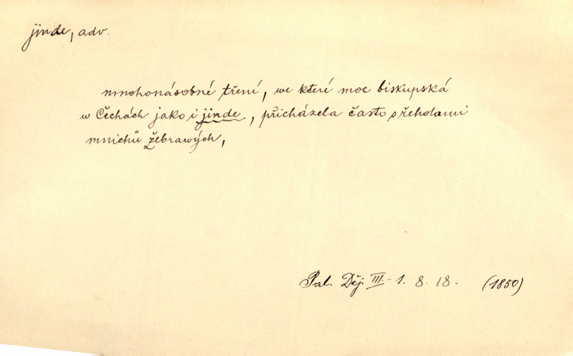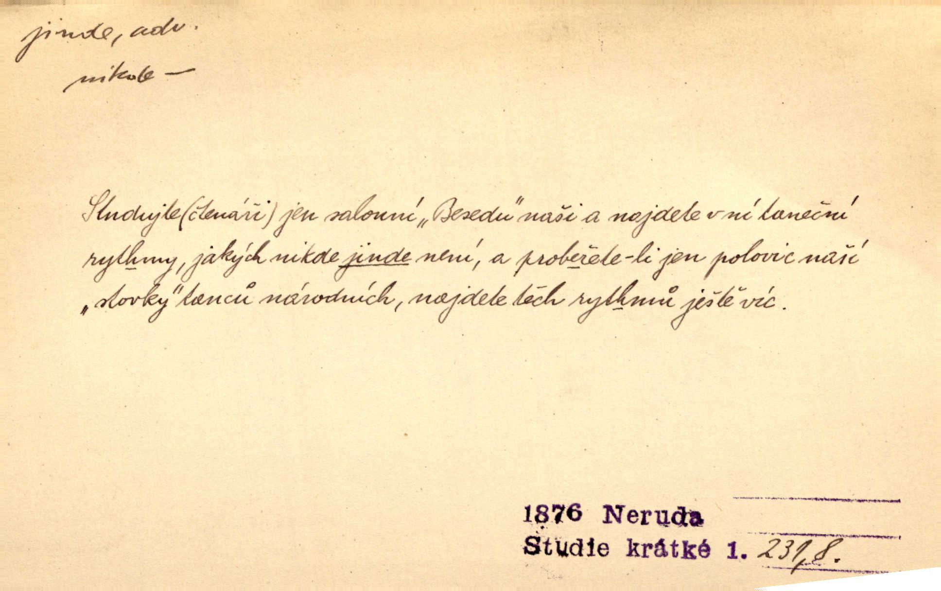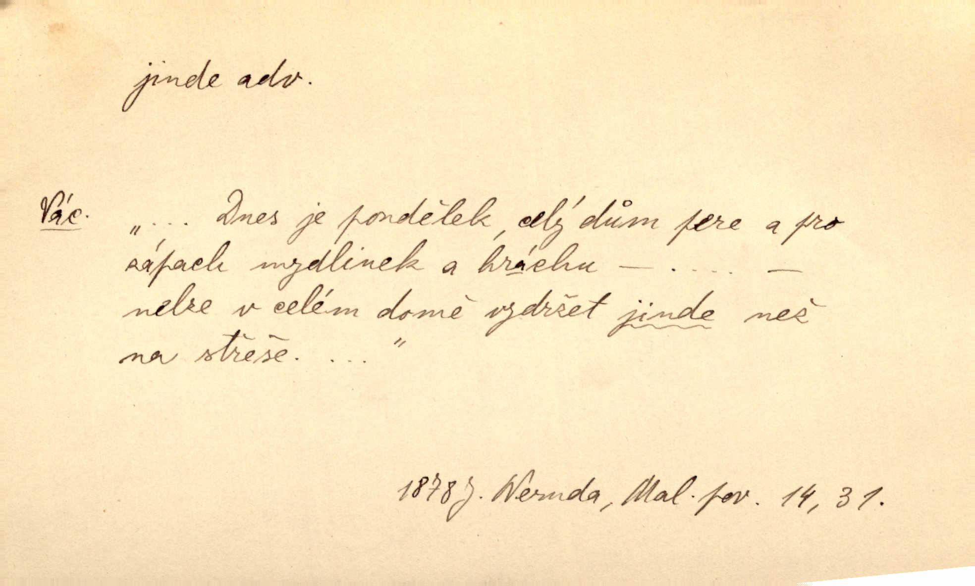 - jinde adv. na jiném místě. Taky byste mohla vyklepávat ty koberce jinde! Čech. Kde jinde, jestli ne ve Španělích, měli bychom dobrodružství hledati? Zey. D Dial. jinam. Kde bychom šli jinde jak k Balátovi? Herb. Nemůžeme spat! Půjdu jinde! Herb.