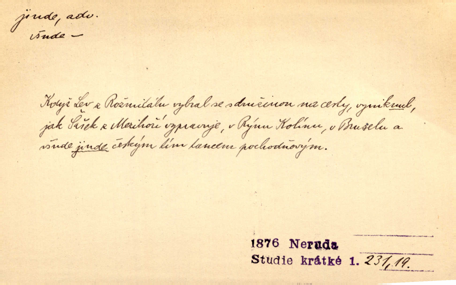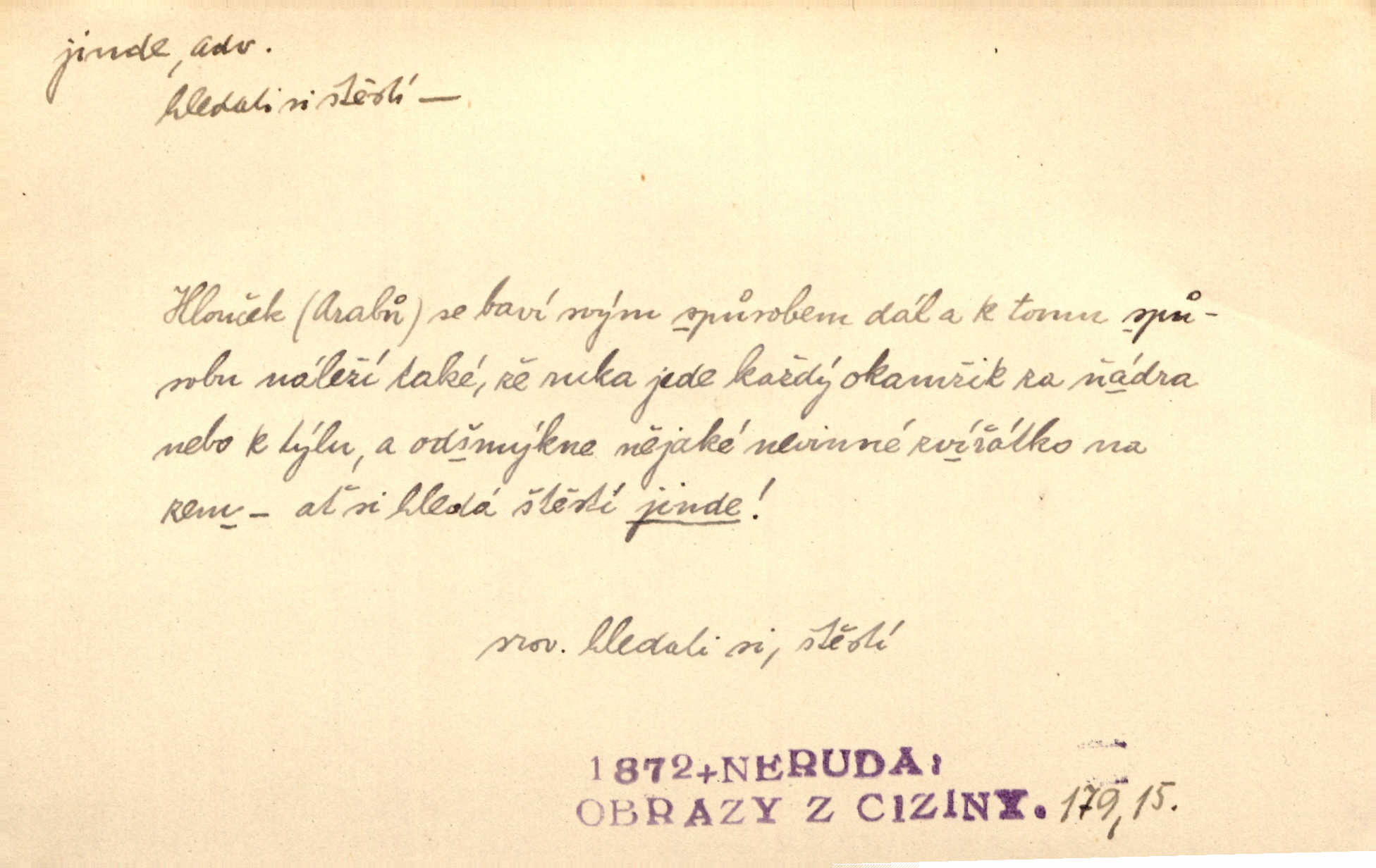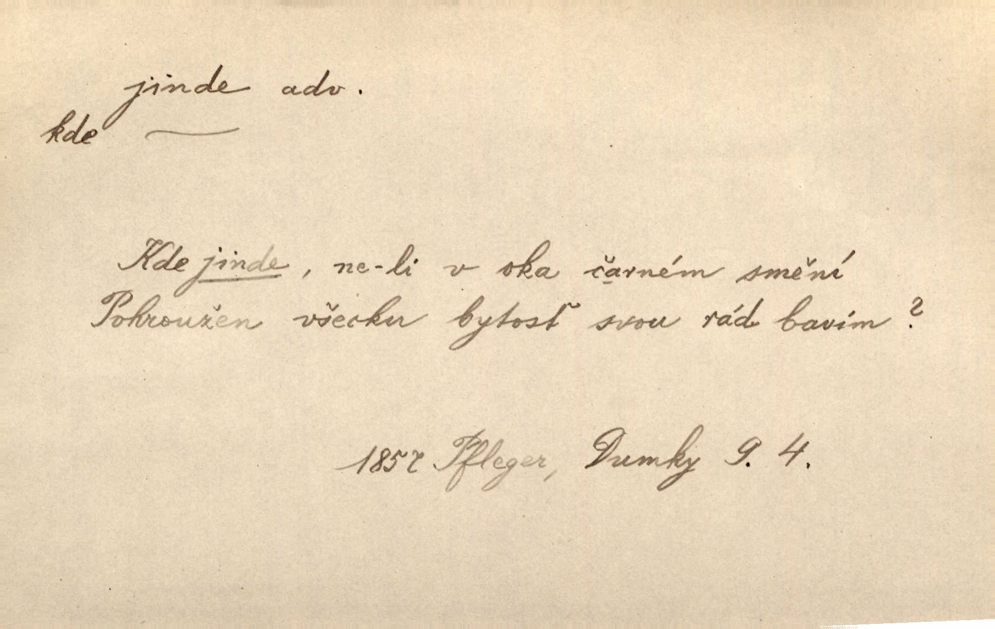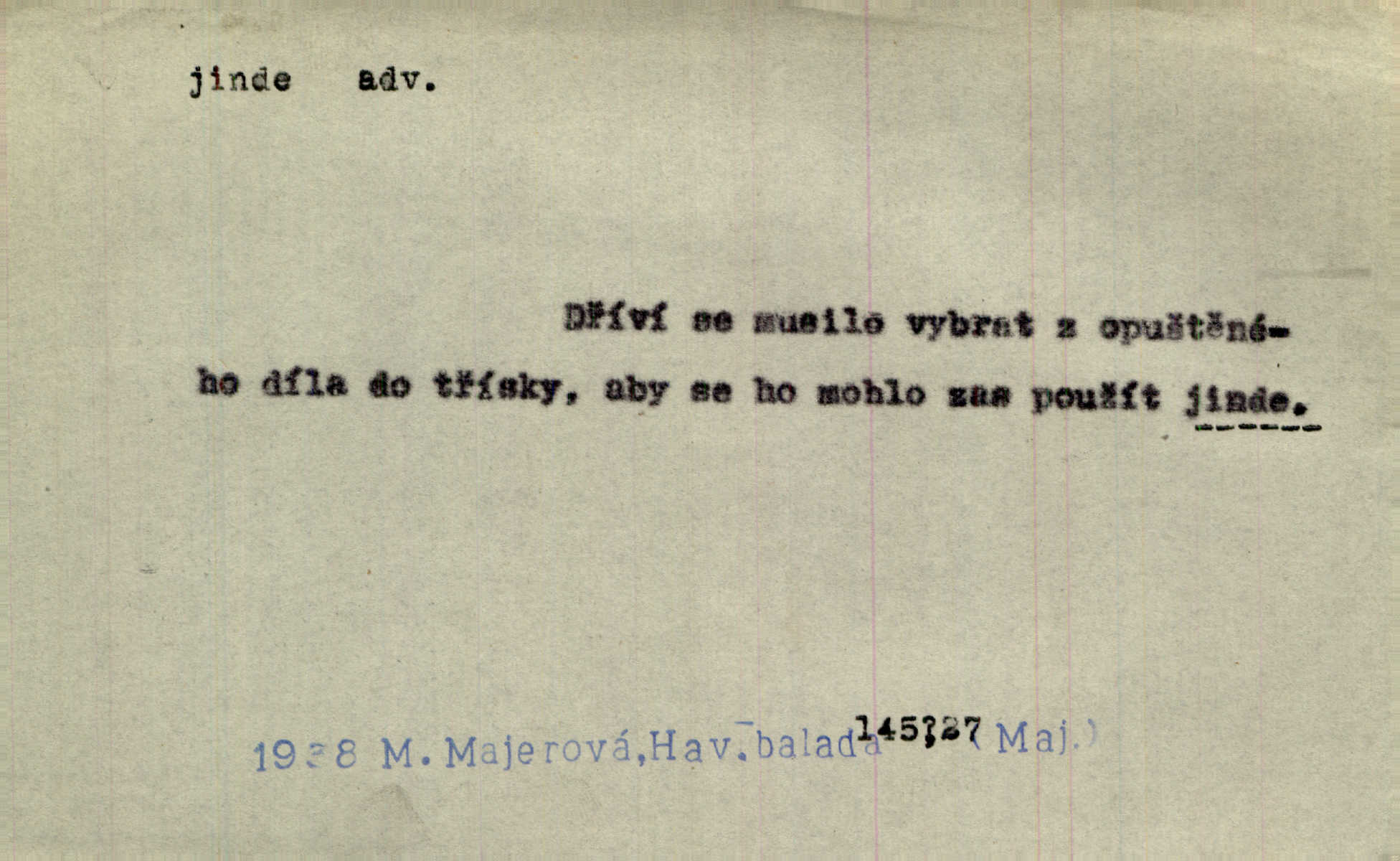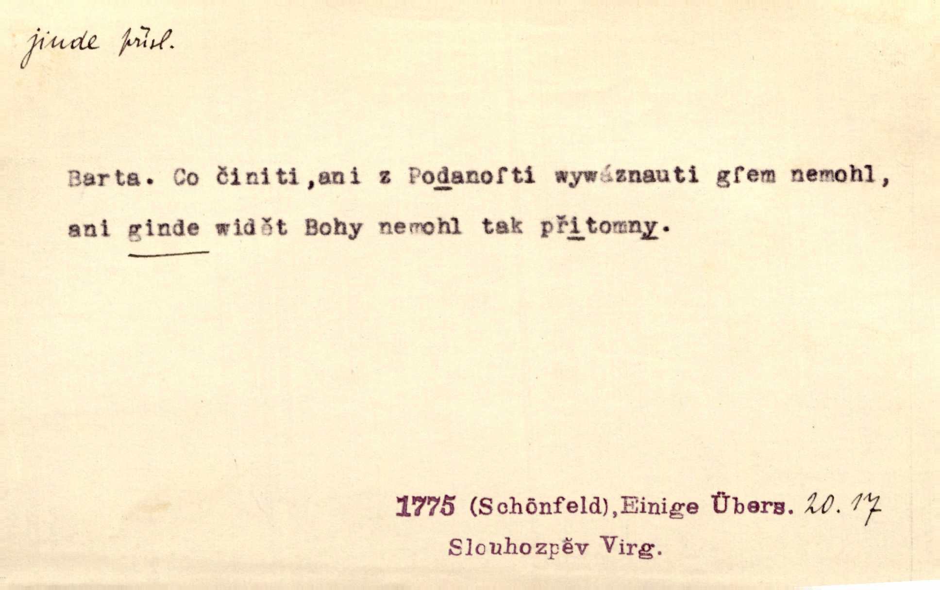 - jinde adv. na jiném místě. Taky byste mohla vyklepávat ty koberce jinde! Čech. Kde jinde, jestli ne ve Španělích, měli bychom dobrodružství hledati? Zey. D Dial. jinam. Kde bychom šli jinde jak k Balátovi? Herb. Nemůžeme spat! Půjdu jinde! Herb.