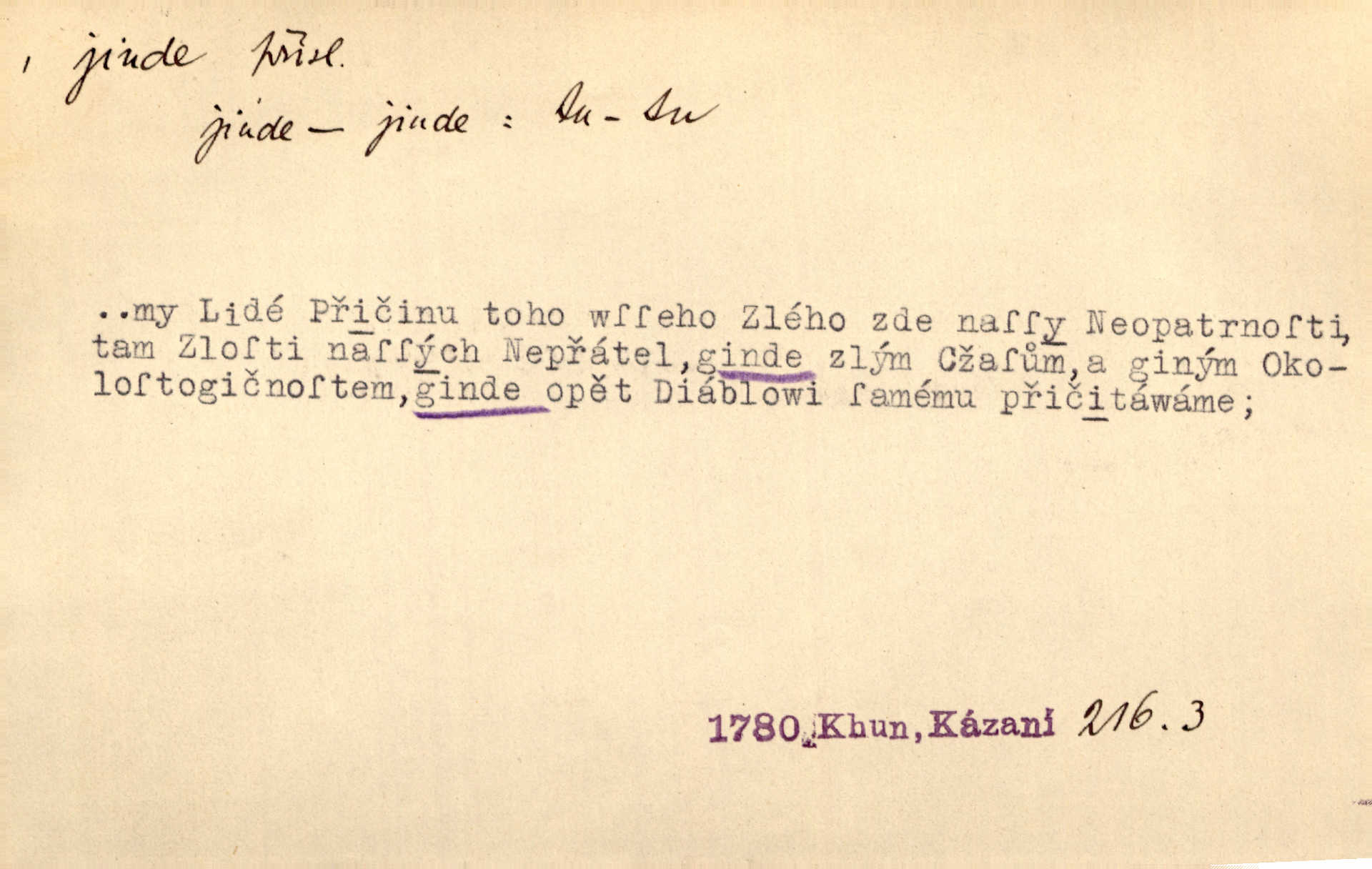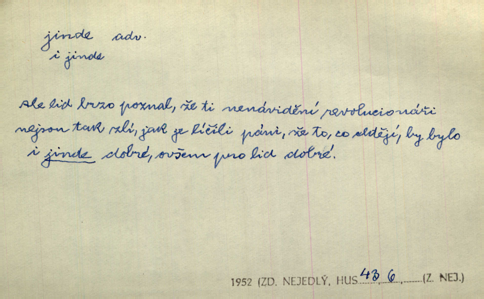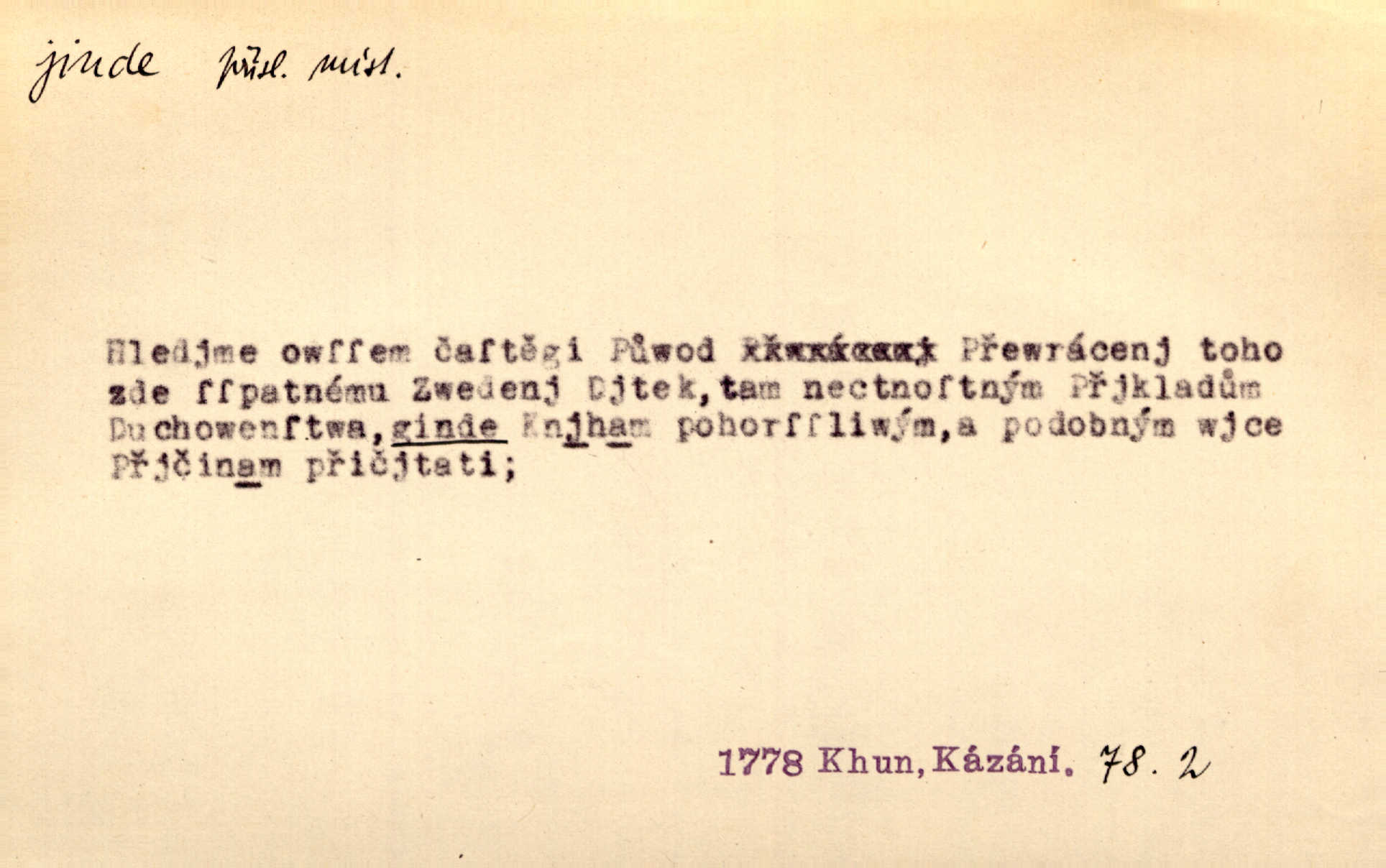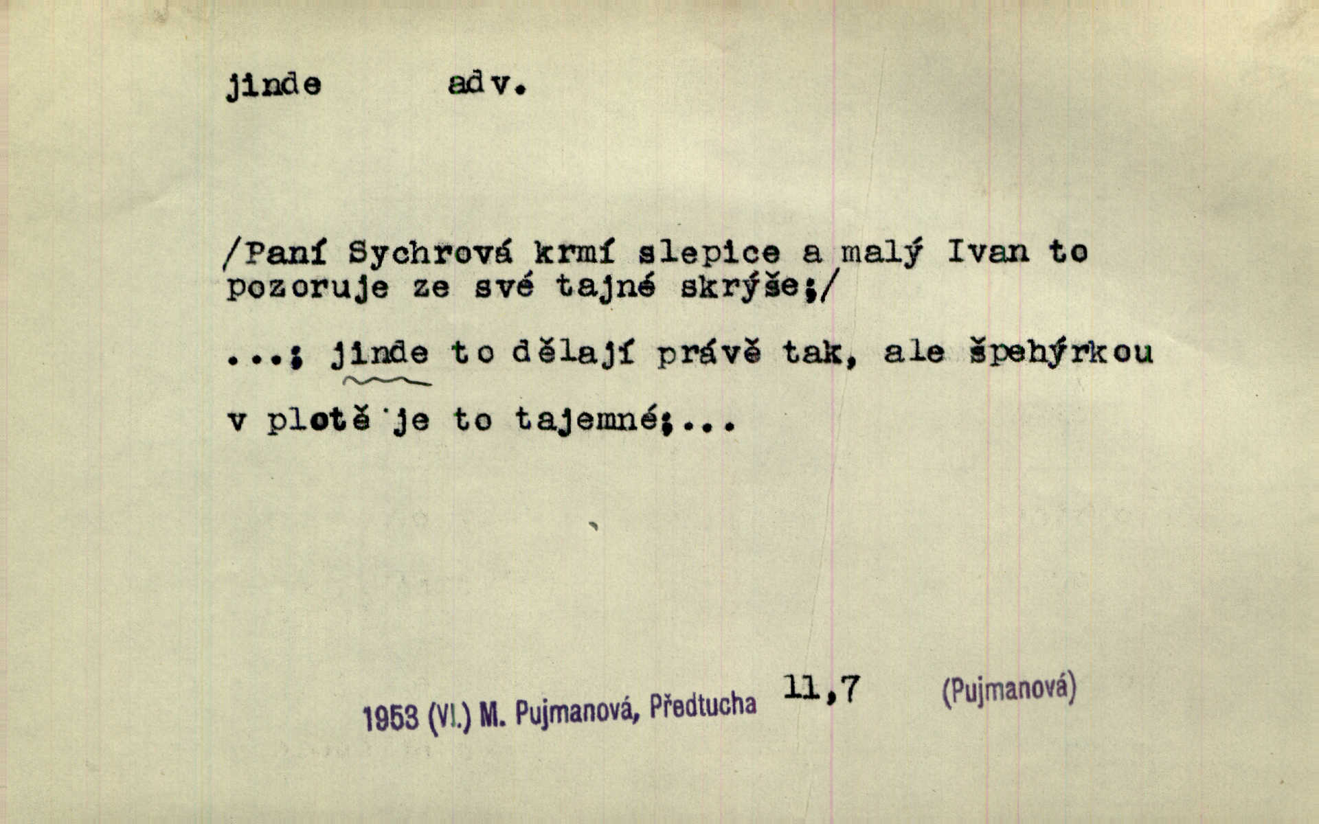 - jinde adv. na jiném místě. Taky byste mohla vyklepávat ty koberce jinde! Čech. Kde jinde, jestli ne ve Španělích, měli bychom dobrodružství hledati? Zey. D Dial. jinam. Kde bychom šli jinde jak k Balátovi? Herb. Nemůžeme spat! Půjdu jinde! Herb.