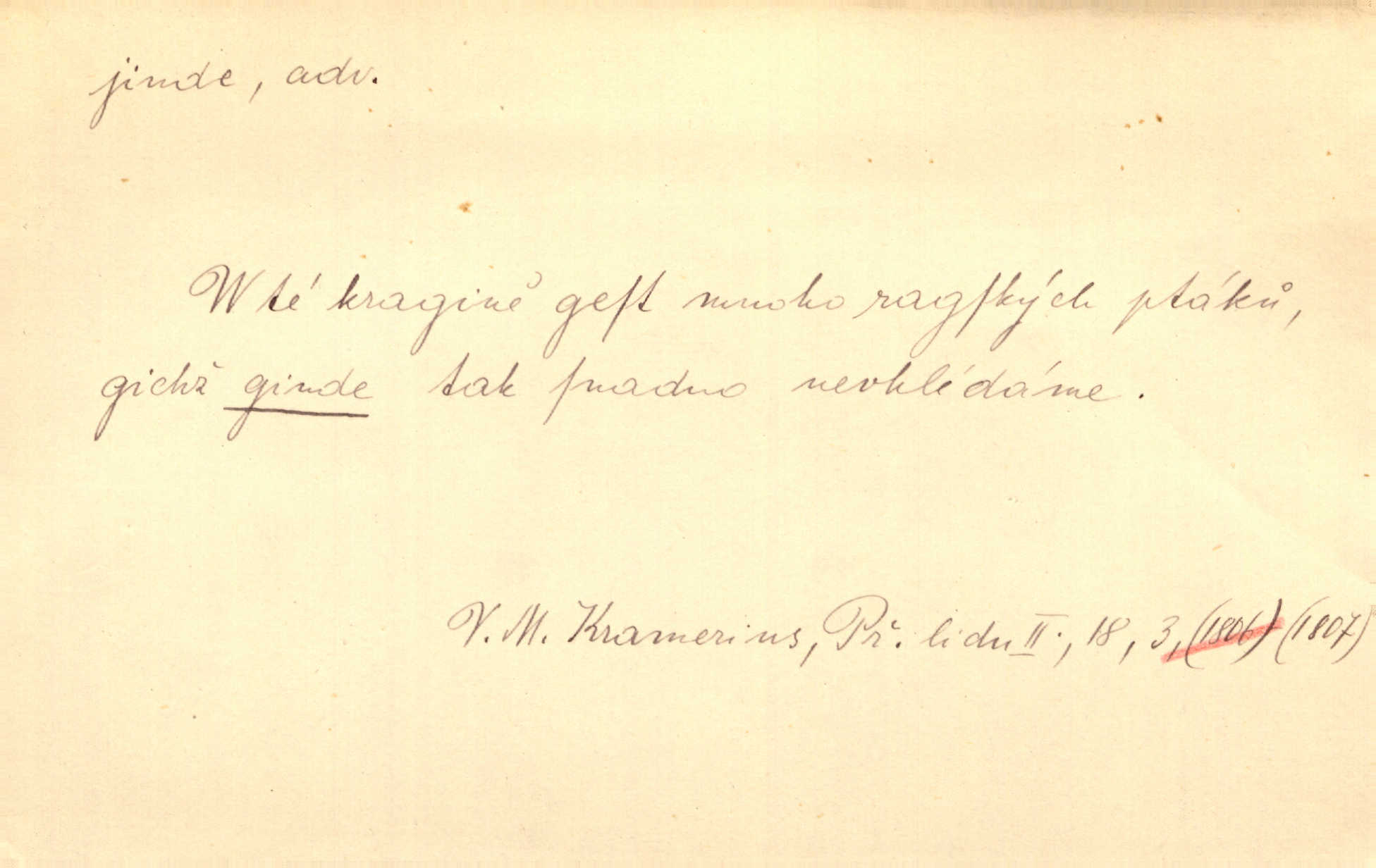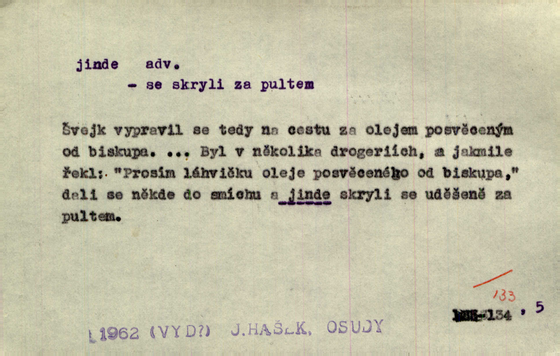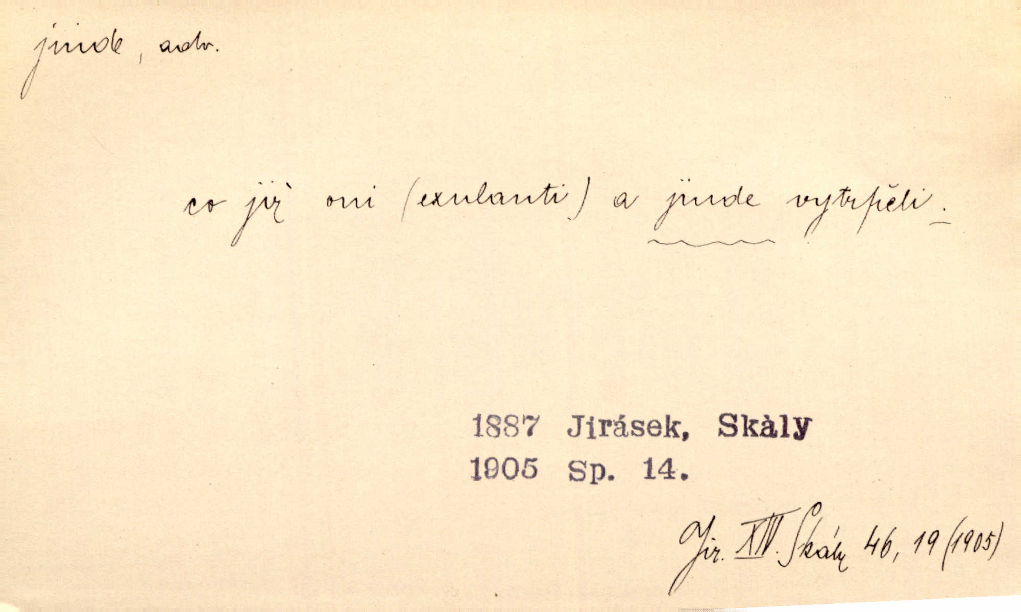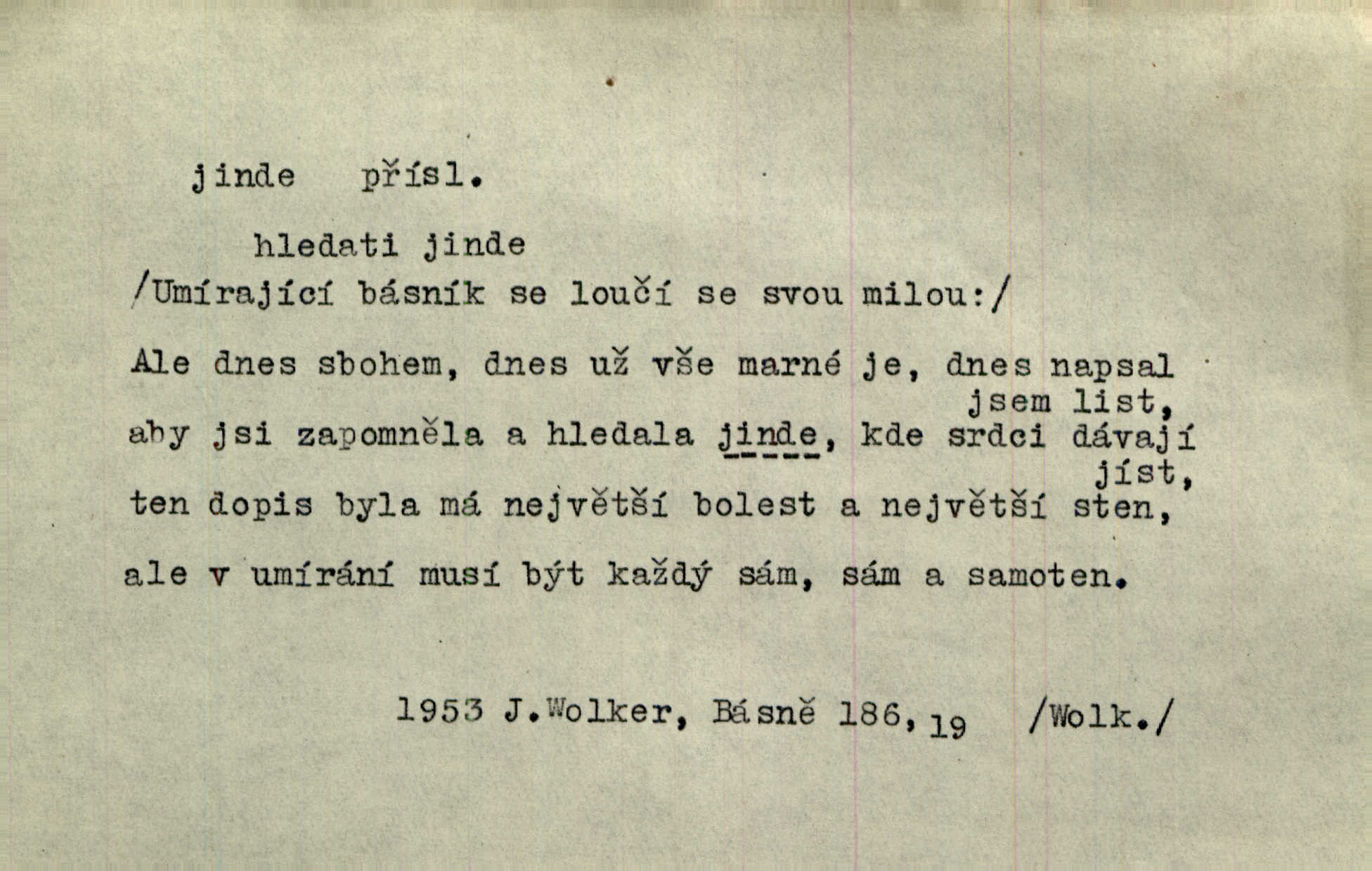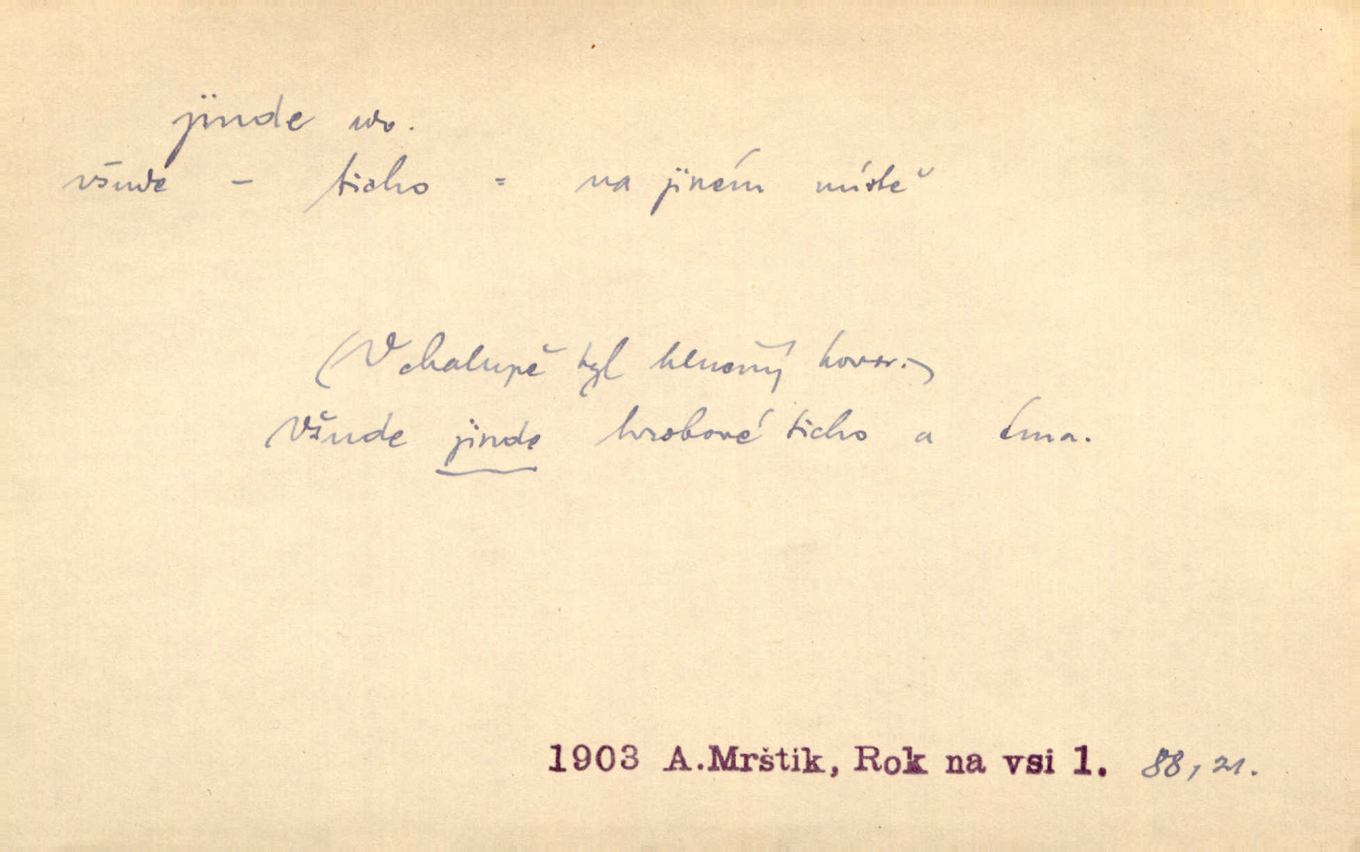 - jinde adv. na jiném místě. Taky byste mohla vyklepávat ty koberce jinde! Čech. Kde jinde, jestli ne ve Španělích, měli bychom dobrodružství hledati? Zey. D Dial. jinam. Kde bychom šli jinde jak k Balátovi? Herb. Nemůžeme spat! Půjdu jinde! Herb.